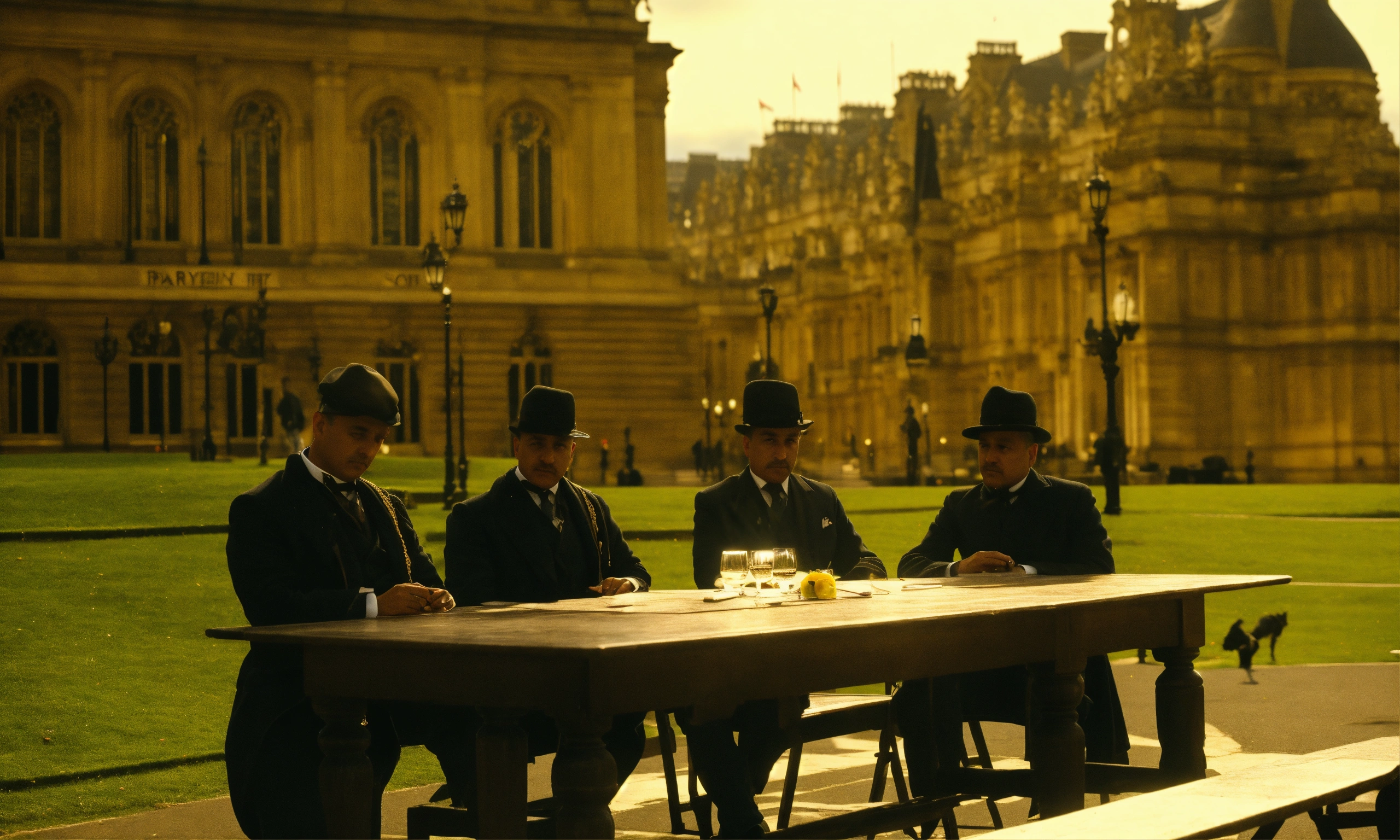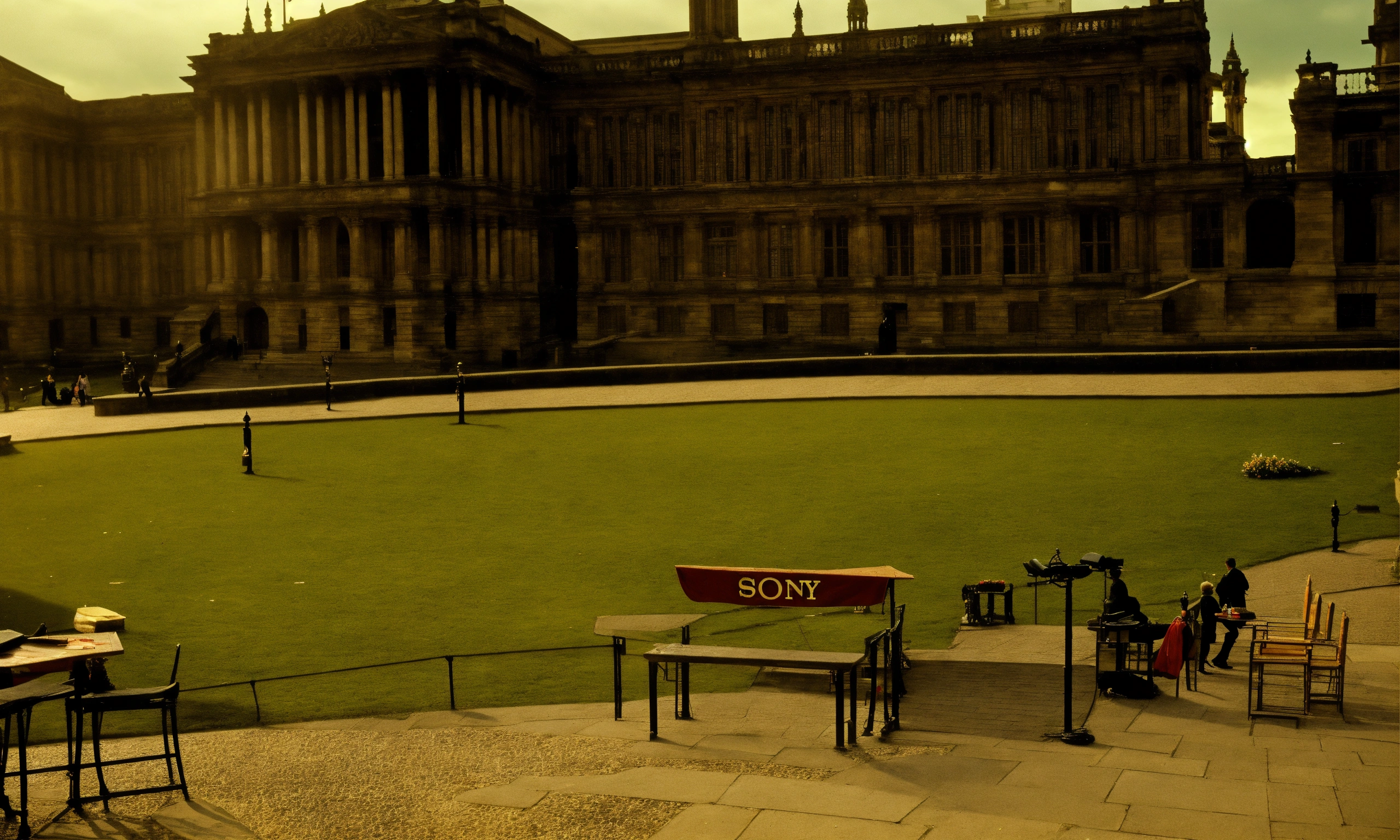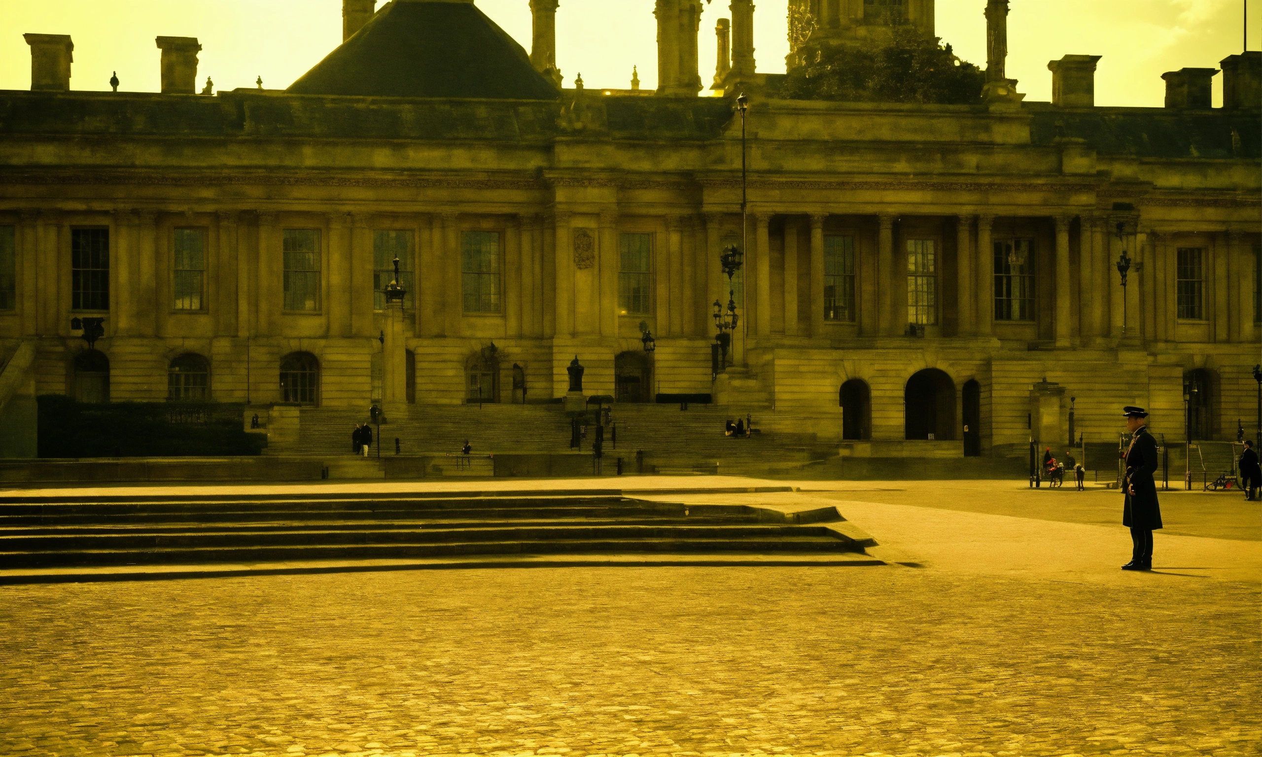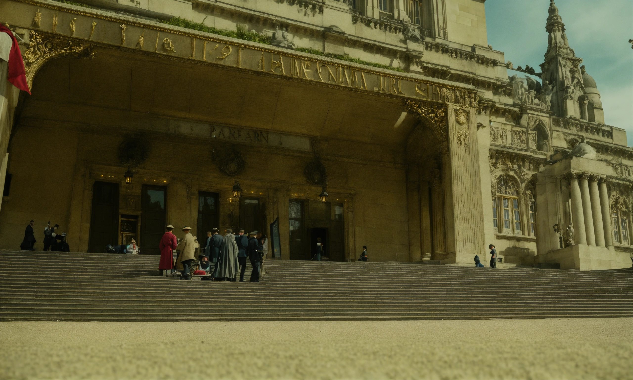 Year 1917, outdoors in front of parliment building at steps in britain, a table faces the camera. there is one chair in the middle of the table behind it pushed back 4 feet from the table. ornate decorations from the 1917's at floor level. 8k. cinema quality. photo quality. there are no people present. office is vacant. sharp image and crisp lines to image. sony a74 iv quality. raw image quality. no people are present. no vehicles are present. lecturn is set up in front of steps. there are no people.