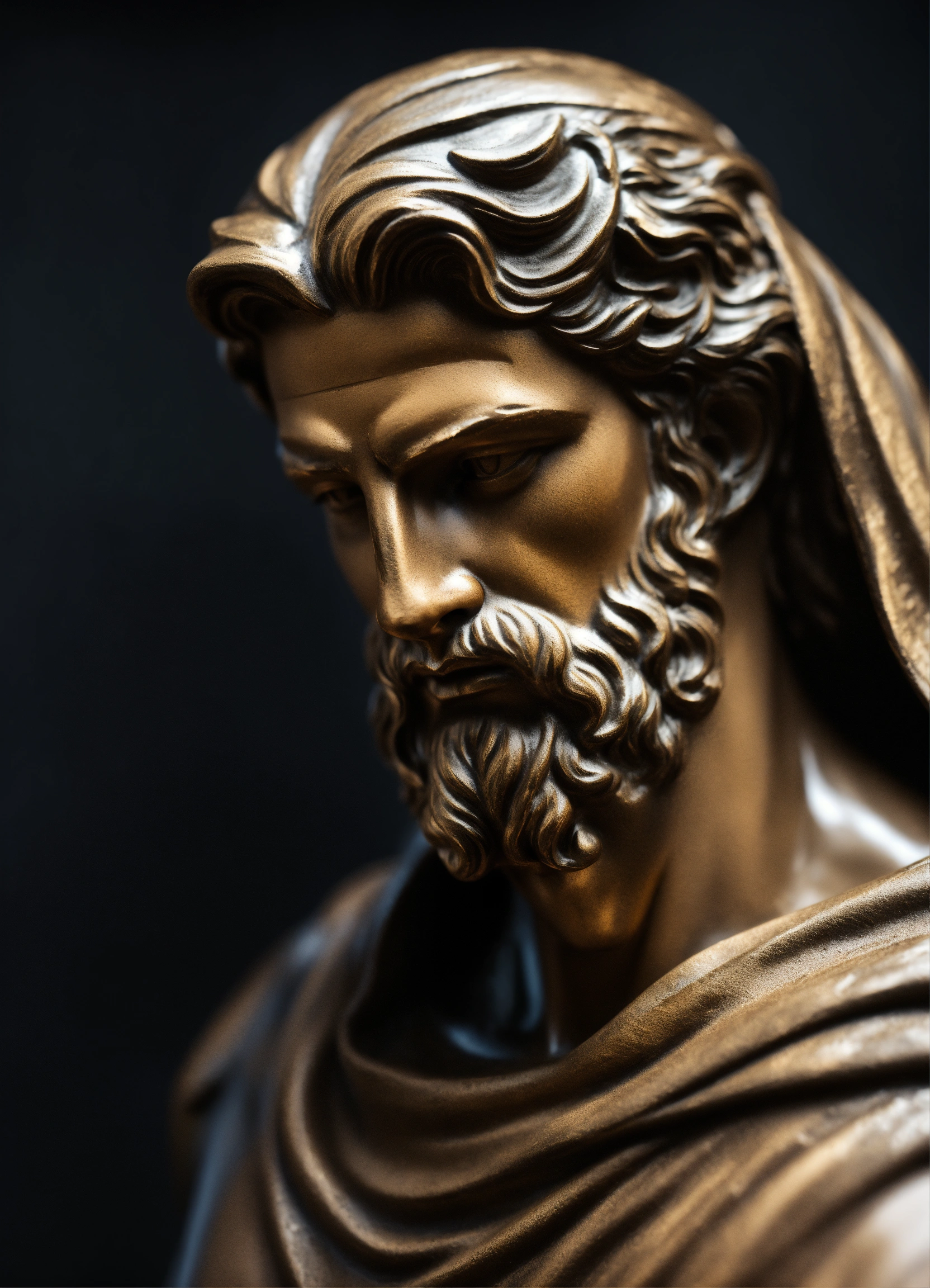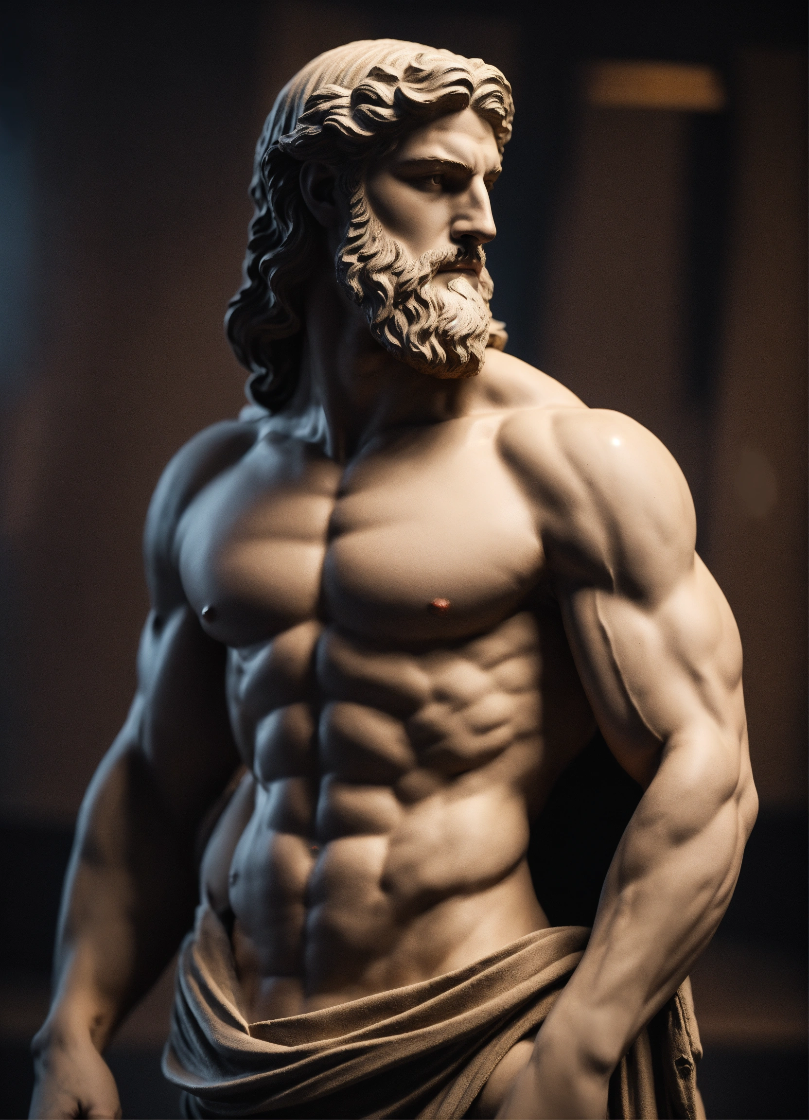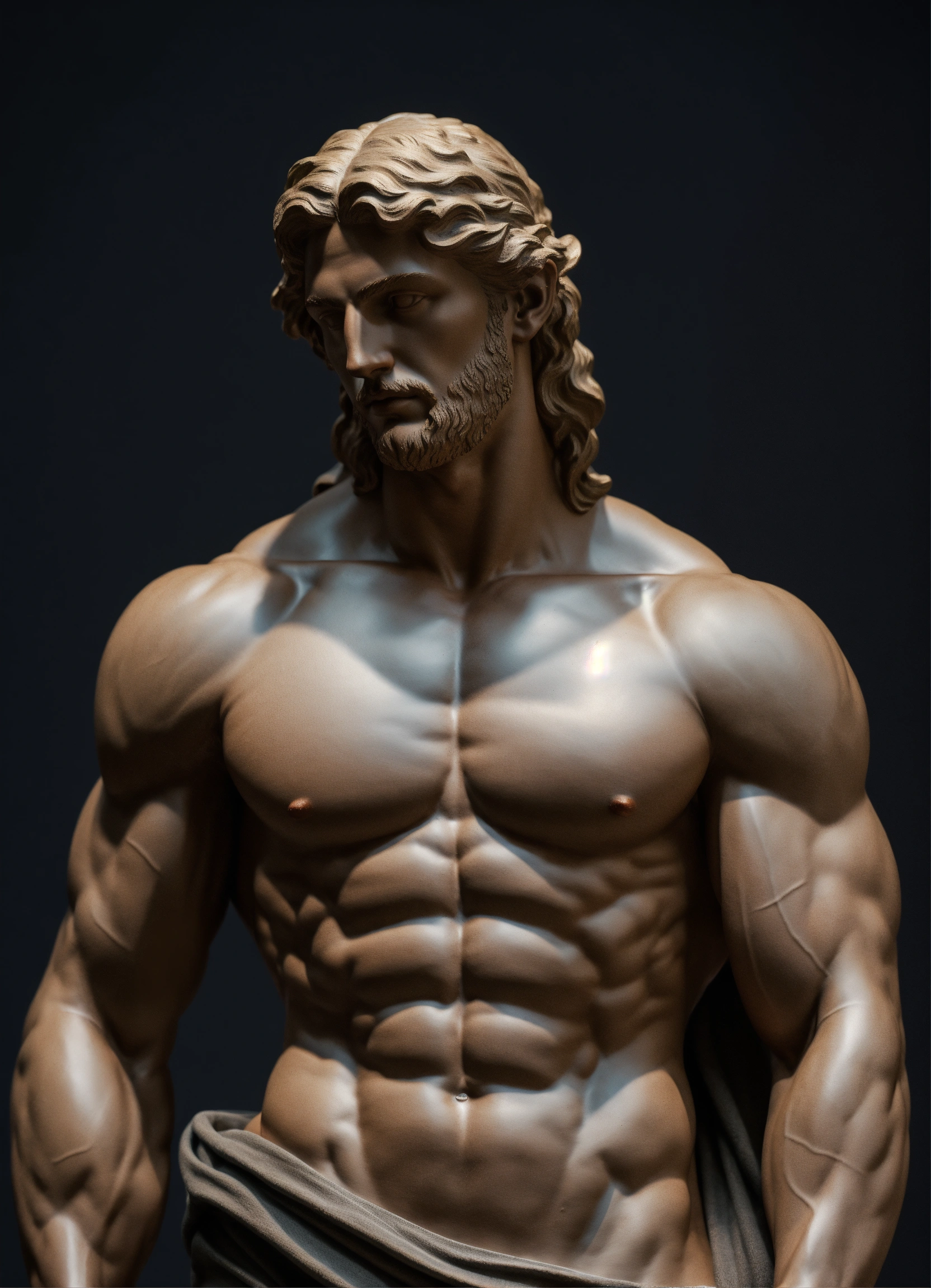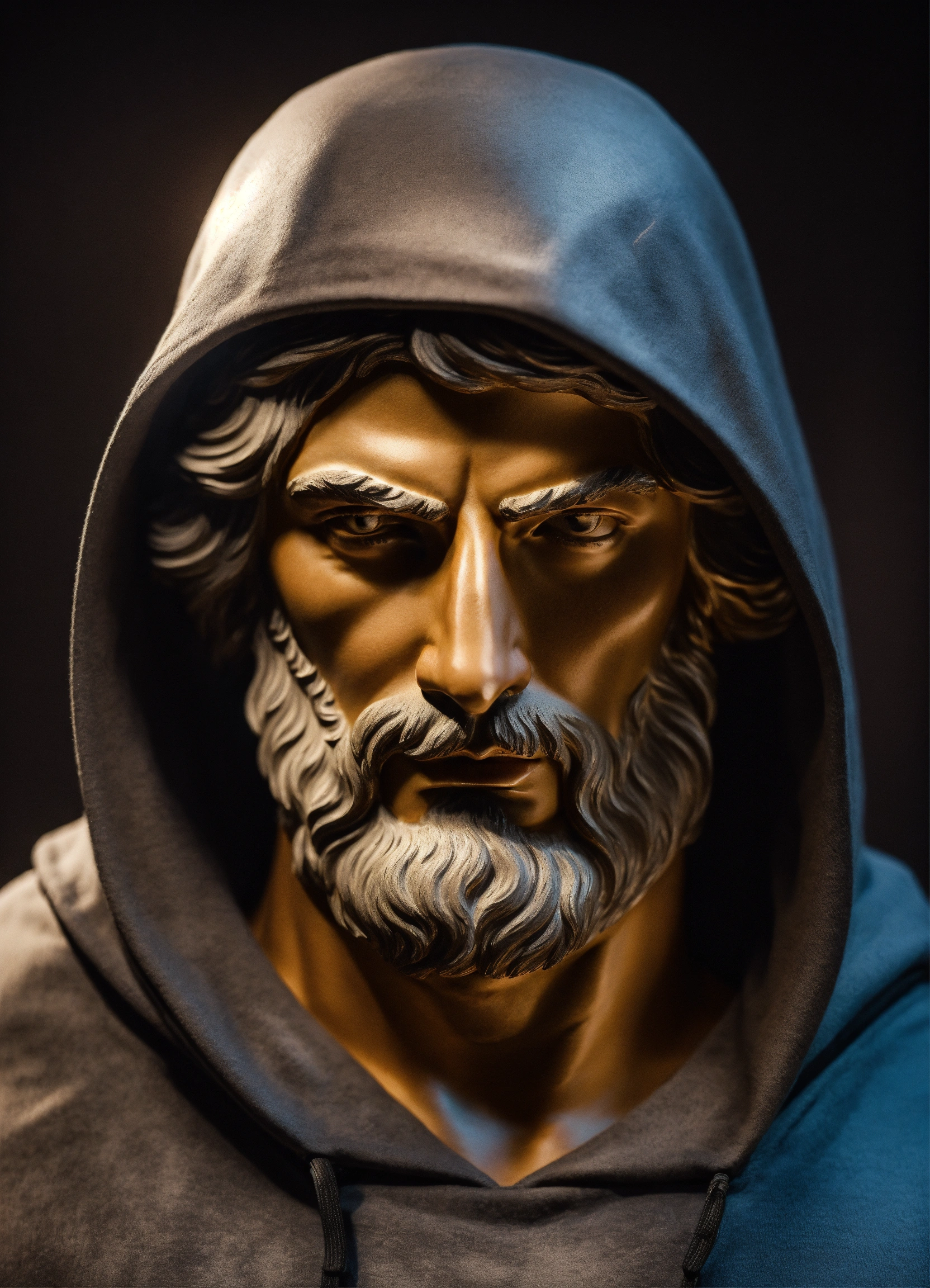 Simple muscular greek god statue with middelparting hair with white boddy with dark backround 8k wearing a hoodie thinking position
