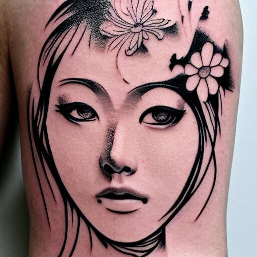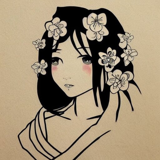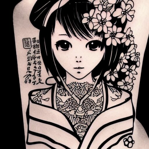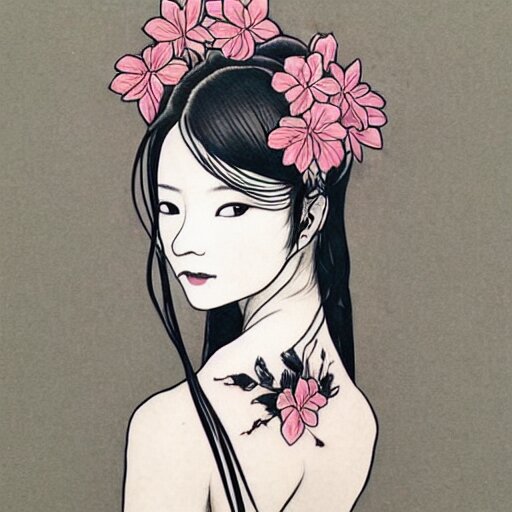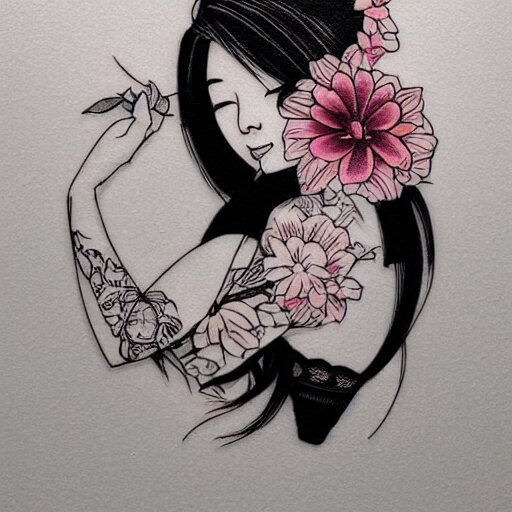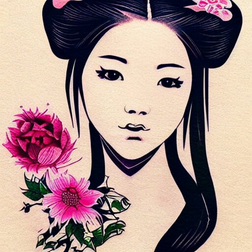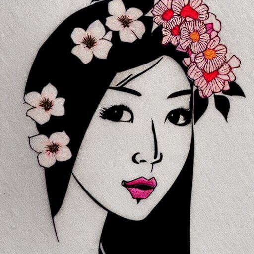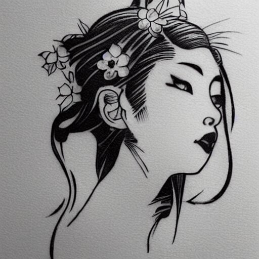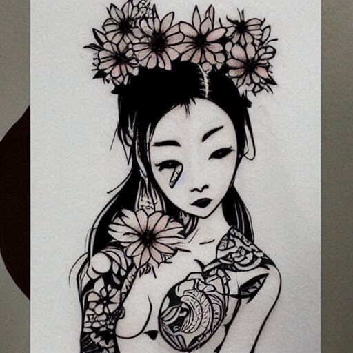 Tattoo design, stencil, stencil on paper, tattoo stencil, traditional, beautiful portrait of a traditional japanese girl with flowers in her hair, upper body, by artgerm, artgerm, artgerm, digital art, cat girl, anime eyes, anime, sexy, super model-s 100