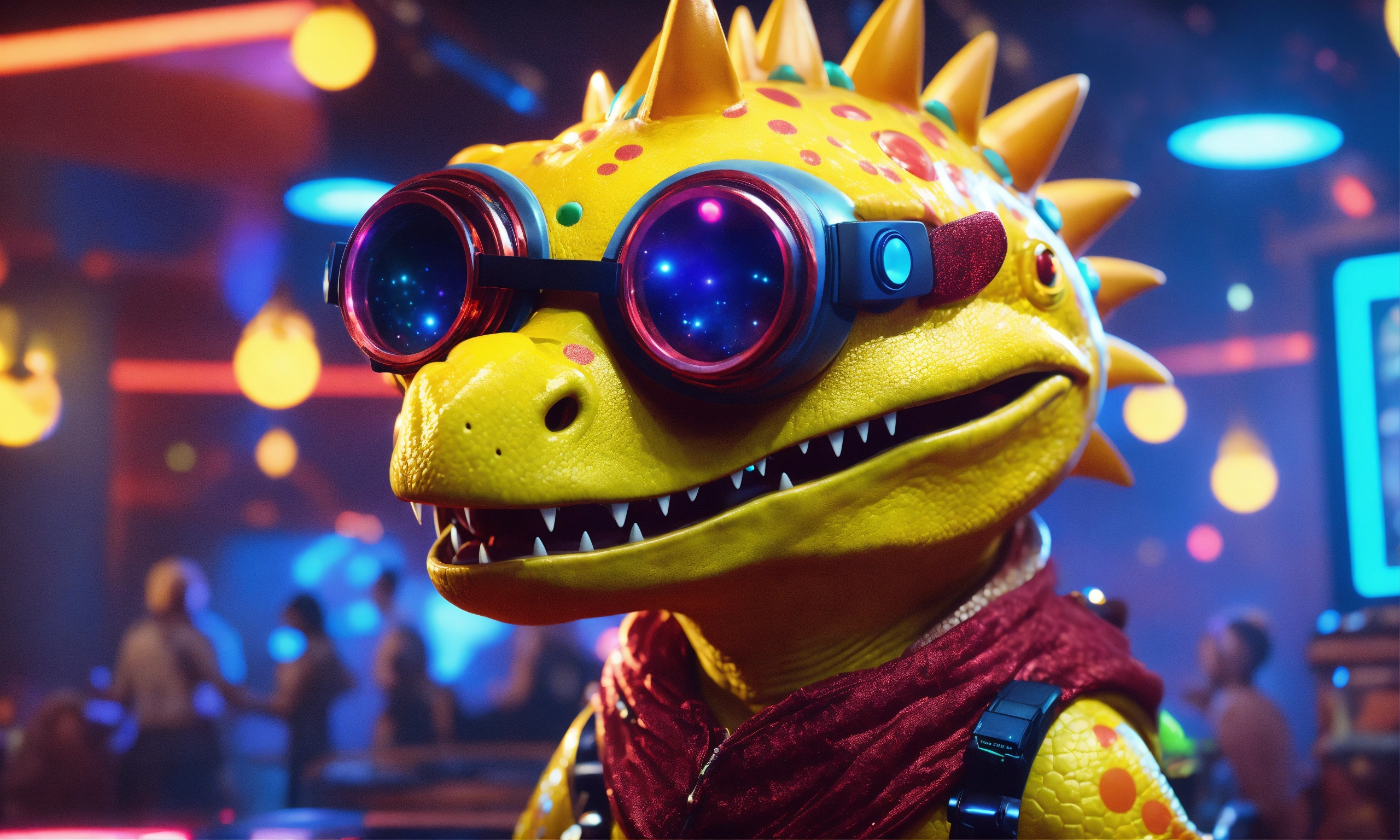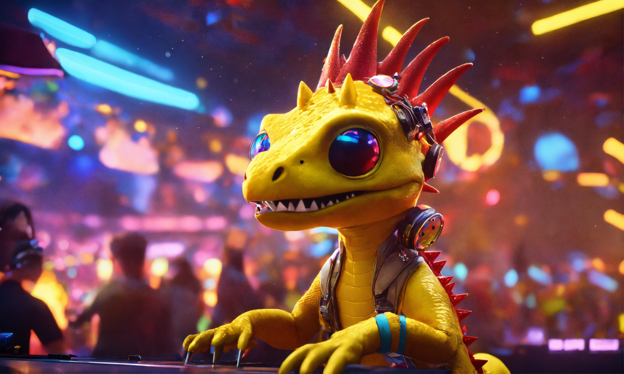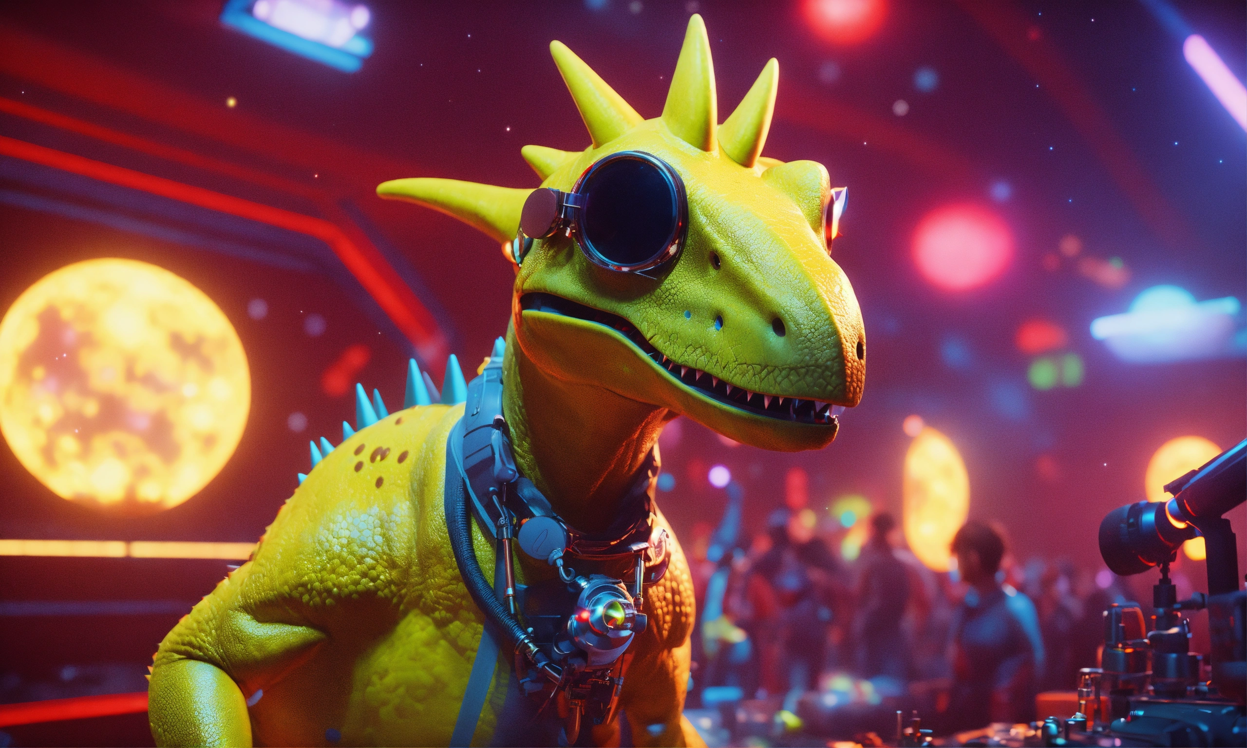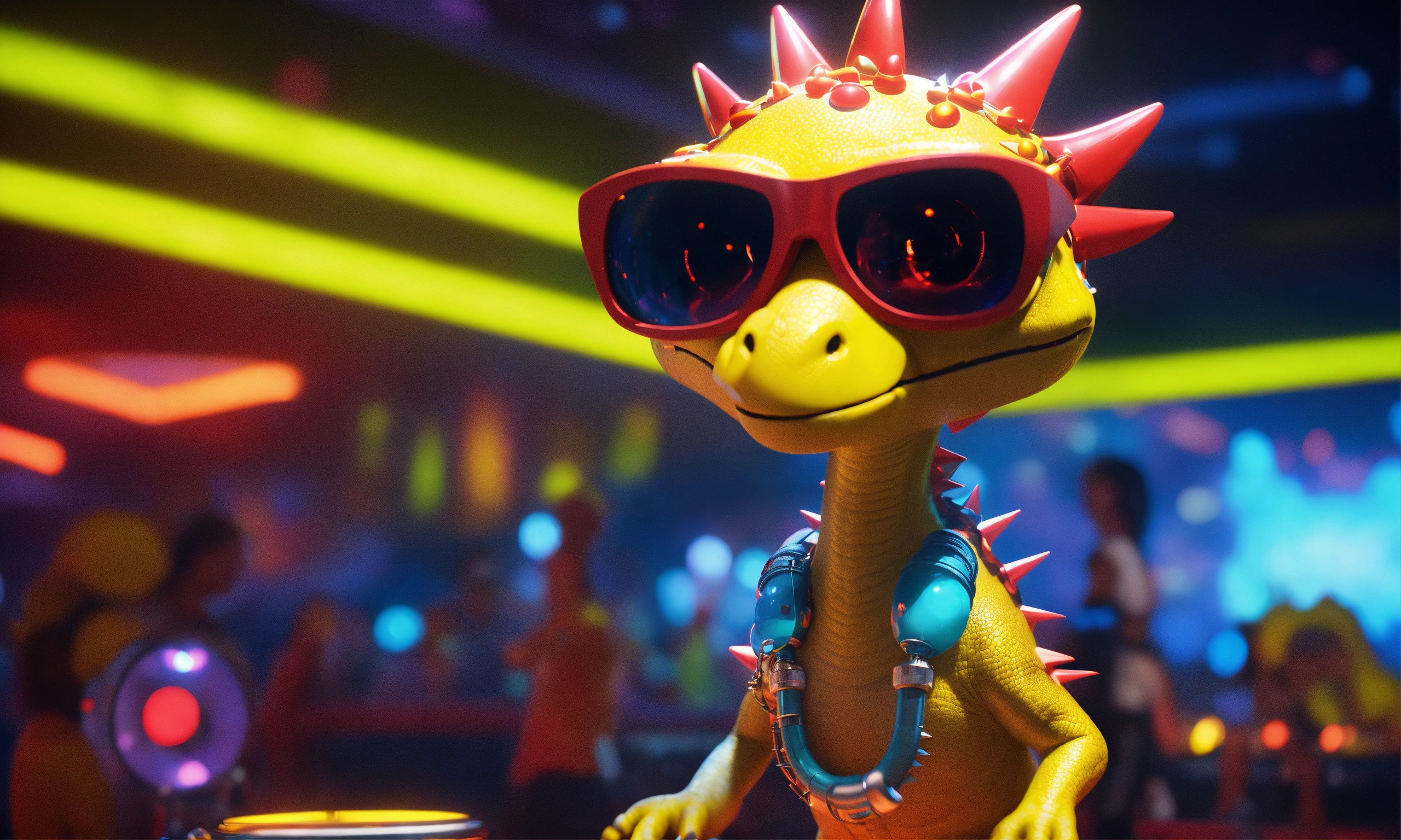Close up on huge adorable stylish yellow alien cartoon dinosaur with red spots and spikes, and wearing hi-tech jewelry and cool space glasses, playing a long frequency blaster with his band in a cosmic nightclub on mercury, people from different galaxies dancing and enjoying the beats, pixar, unreal engine, 8k.