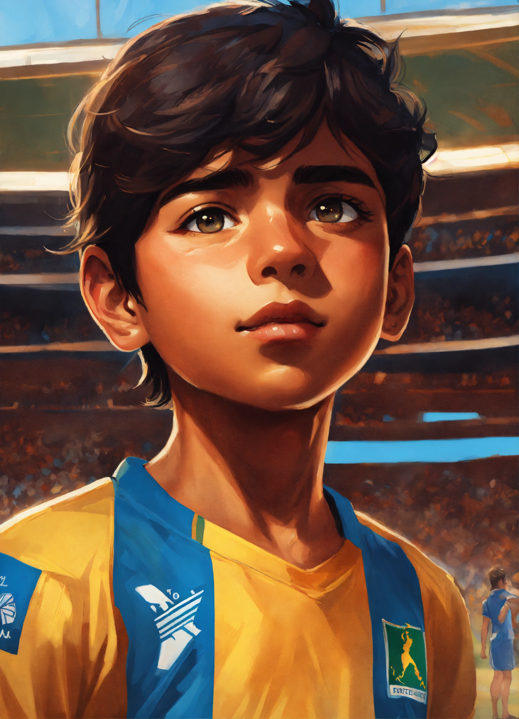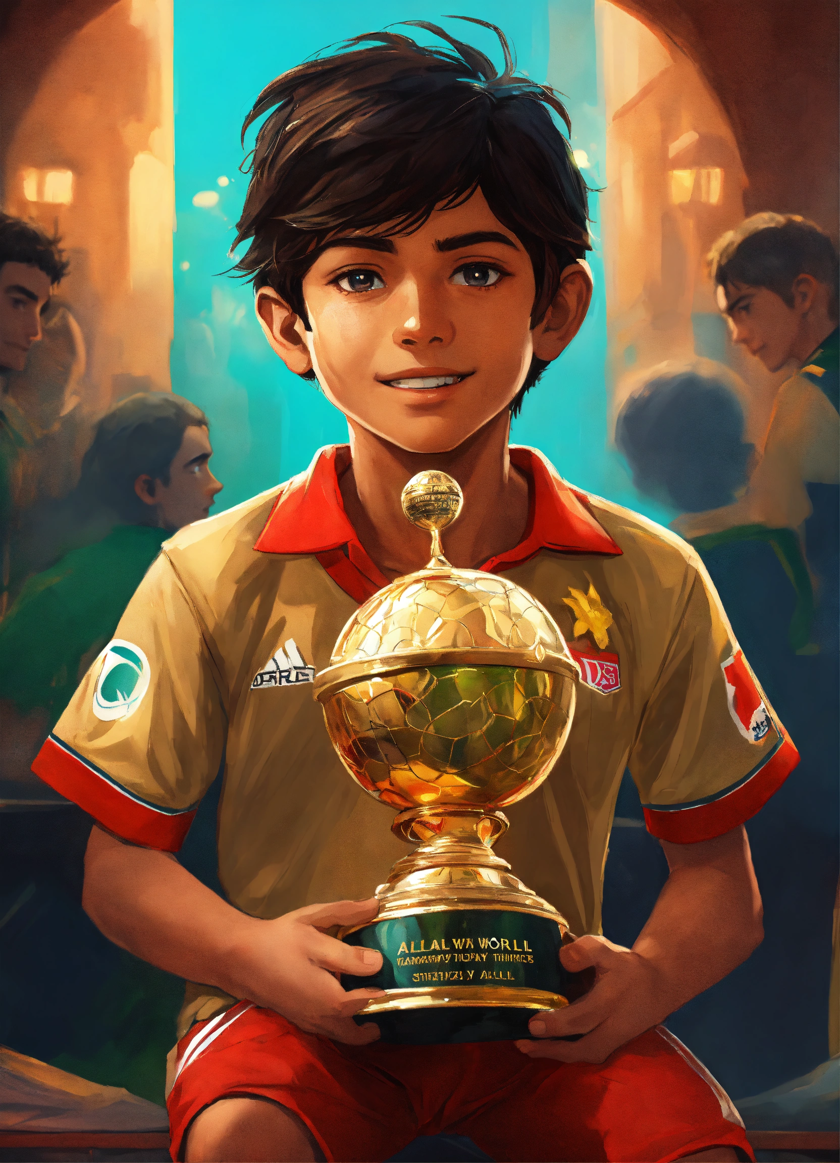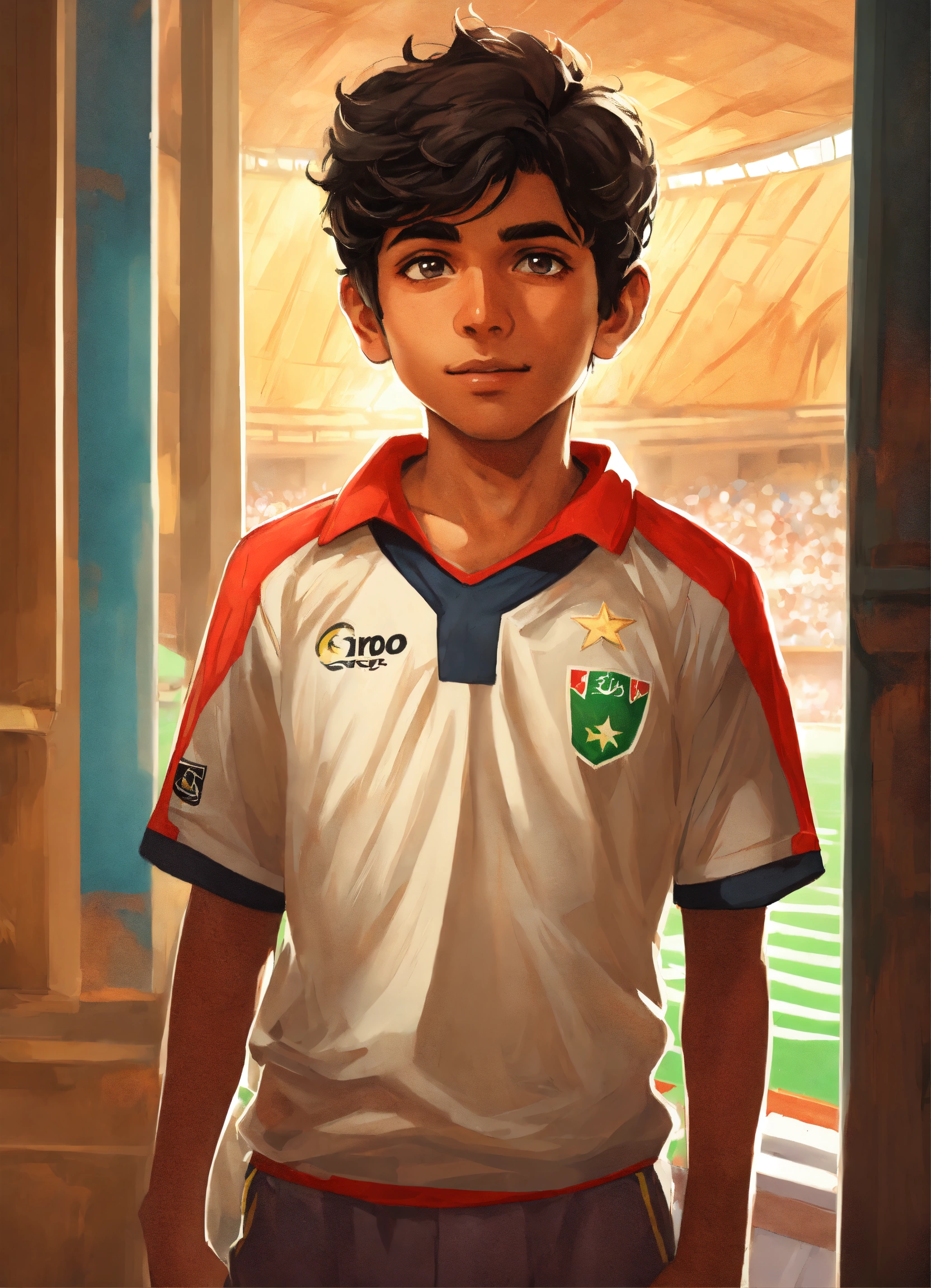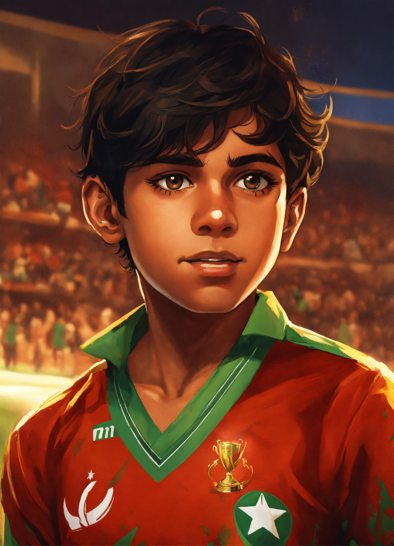 A fantasy comic book style portrait painting of a young boy, very expressive, light brown piercing eyes, mischievous, smirk, round face, black medium hair, wearing a pakistani cricket team kit, dramatic action pose, character design by disney, unreal 5, dynamic lighting, intricate detail, cinematic. hold the cricket world cup trophy in the stadium. shirt name ali big siza