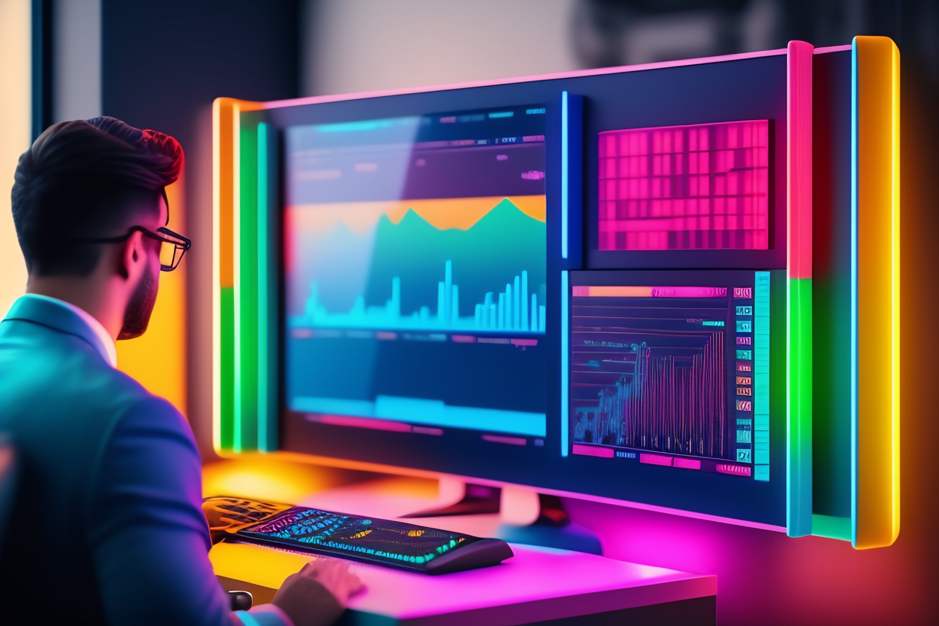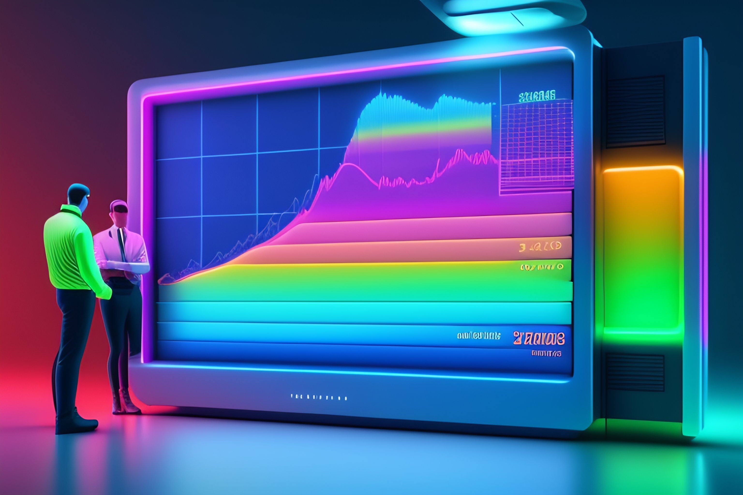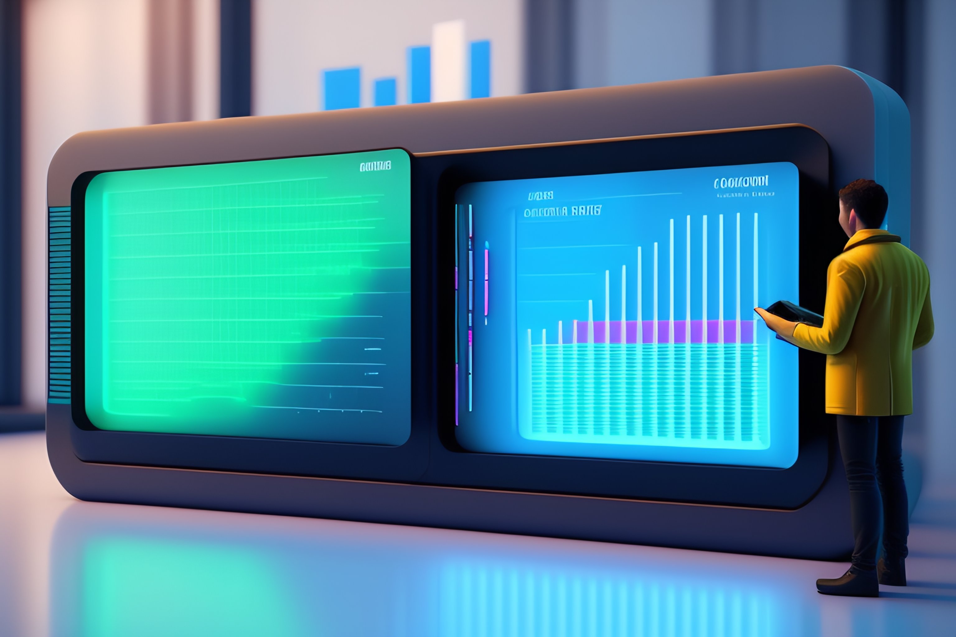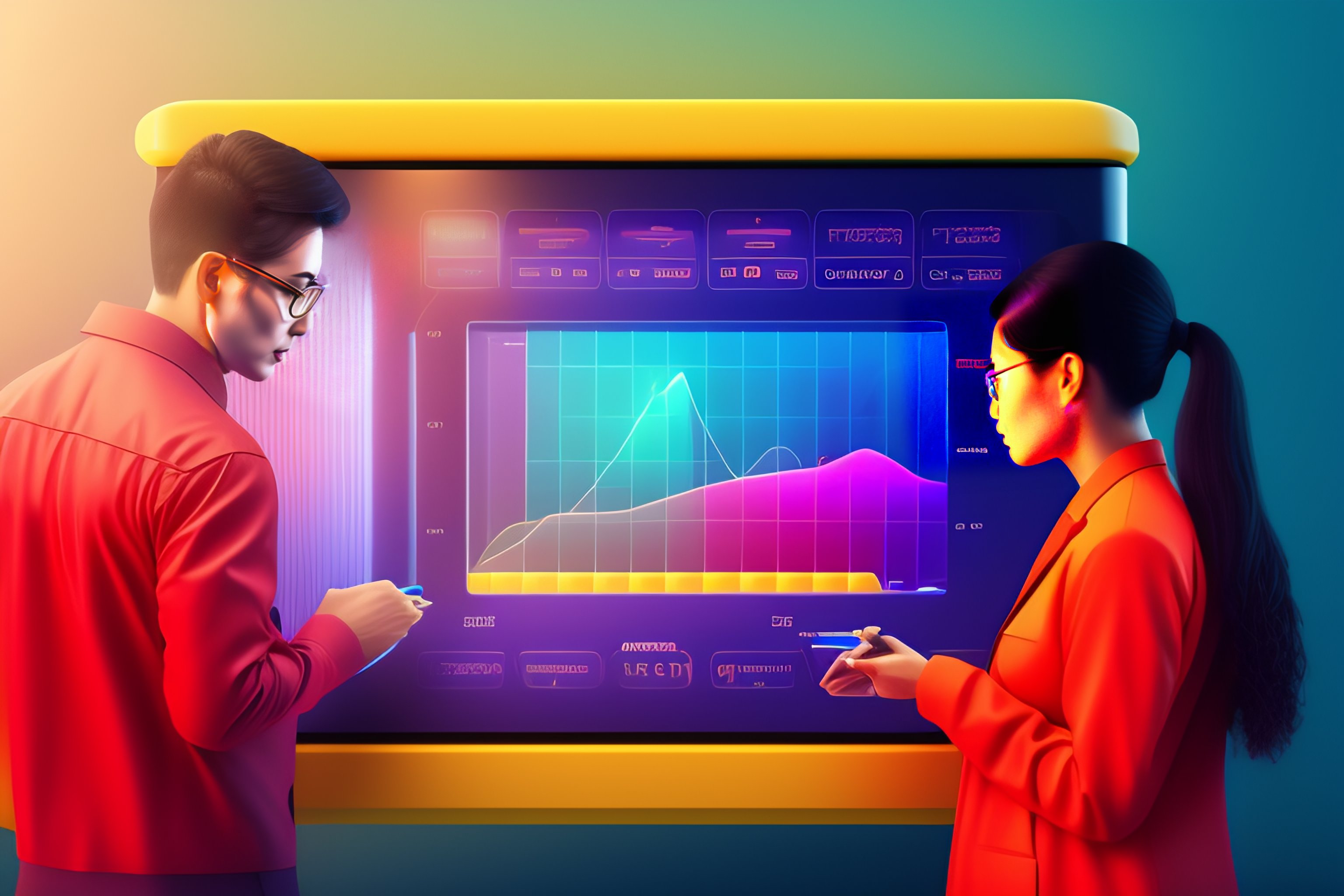 Two scientist trying to figure out a data console panel with bright colours, 3d illustration in the style of blender