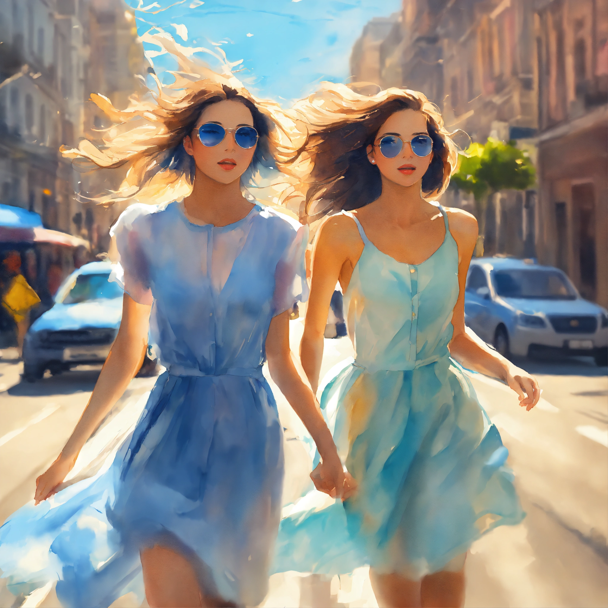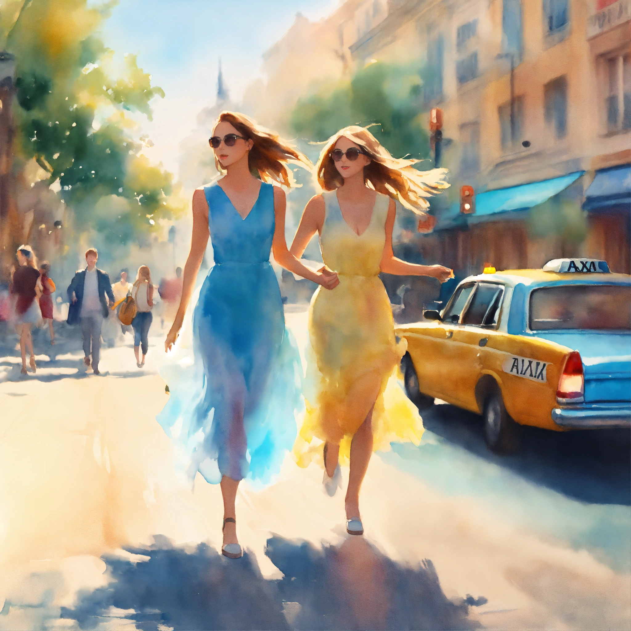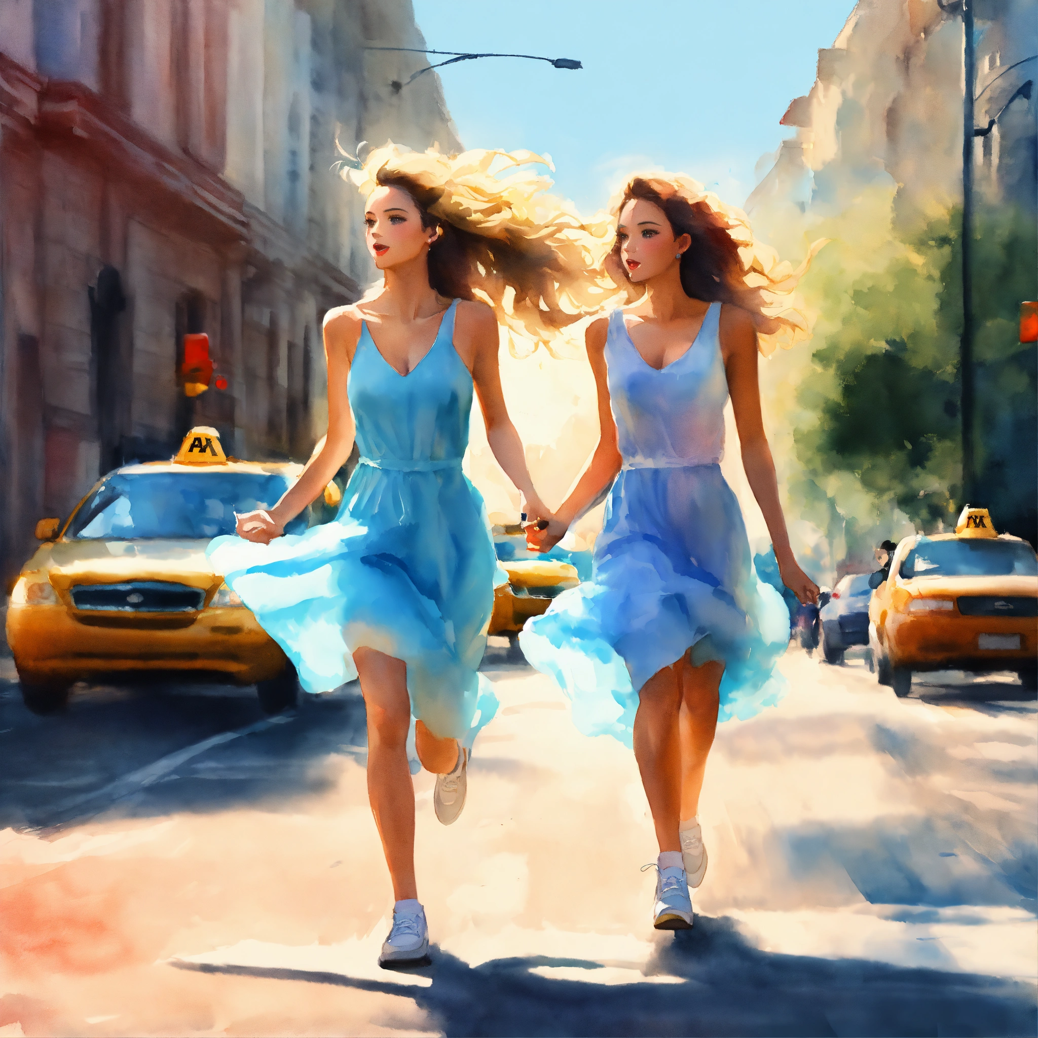 Two beautiful girl in a dress runs very fast down the street for a taxi, great lighting, pastel light blue shades, 8k rendering, award-winning art, watercolour style