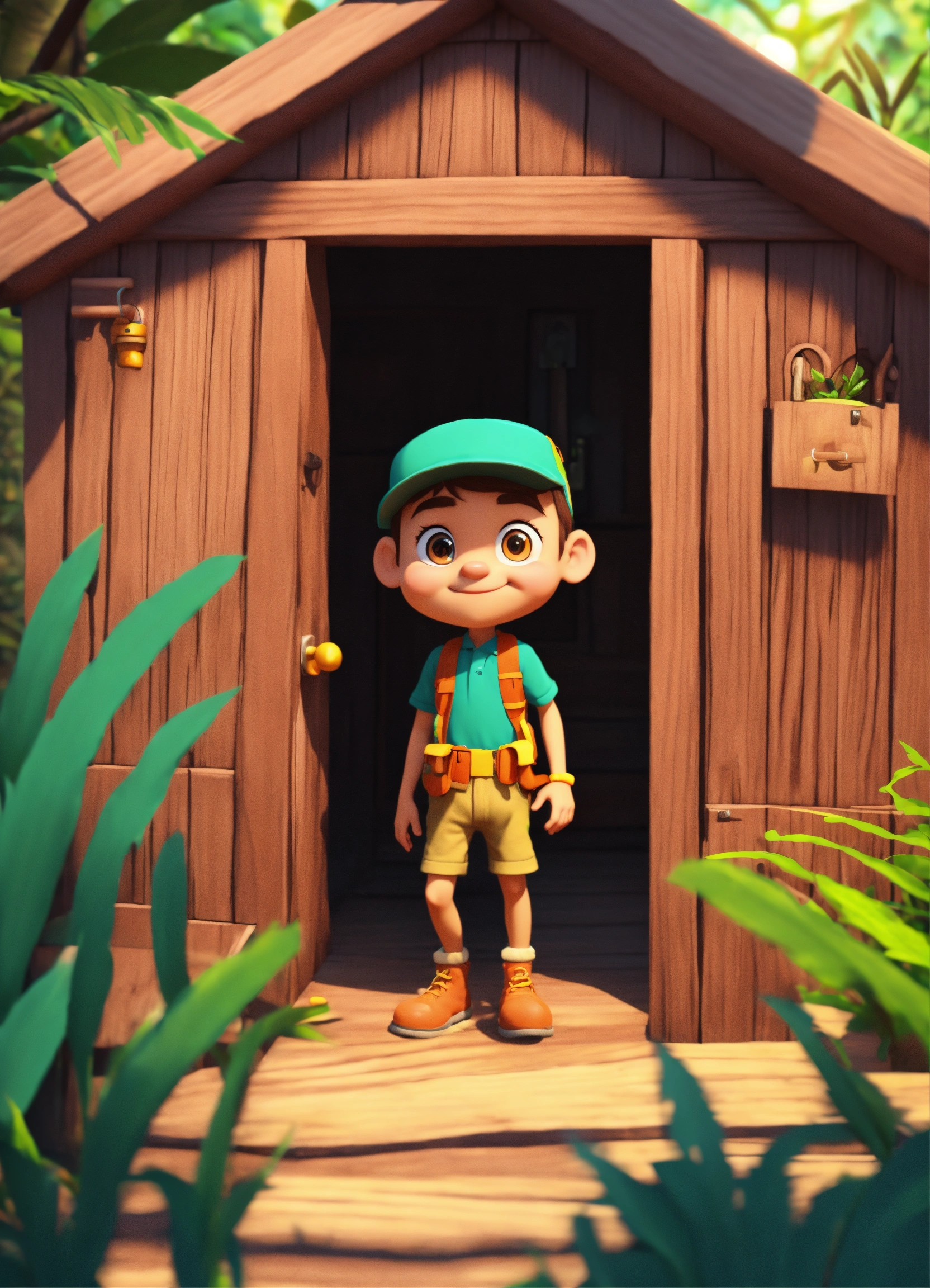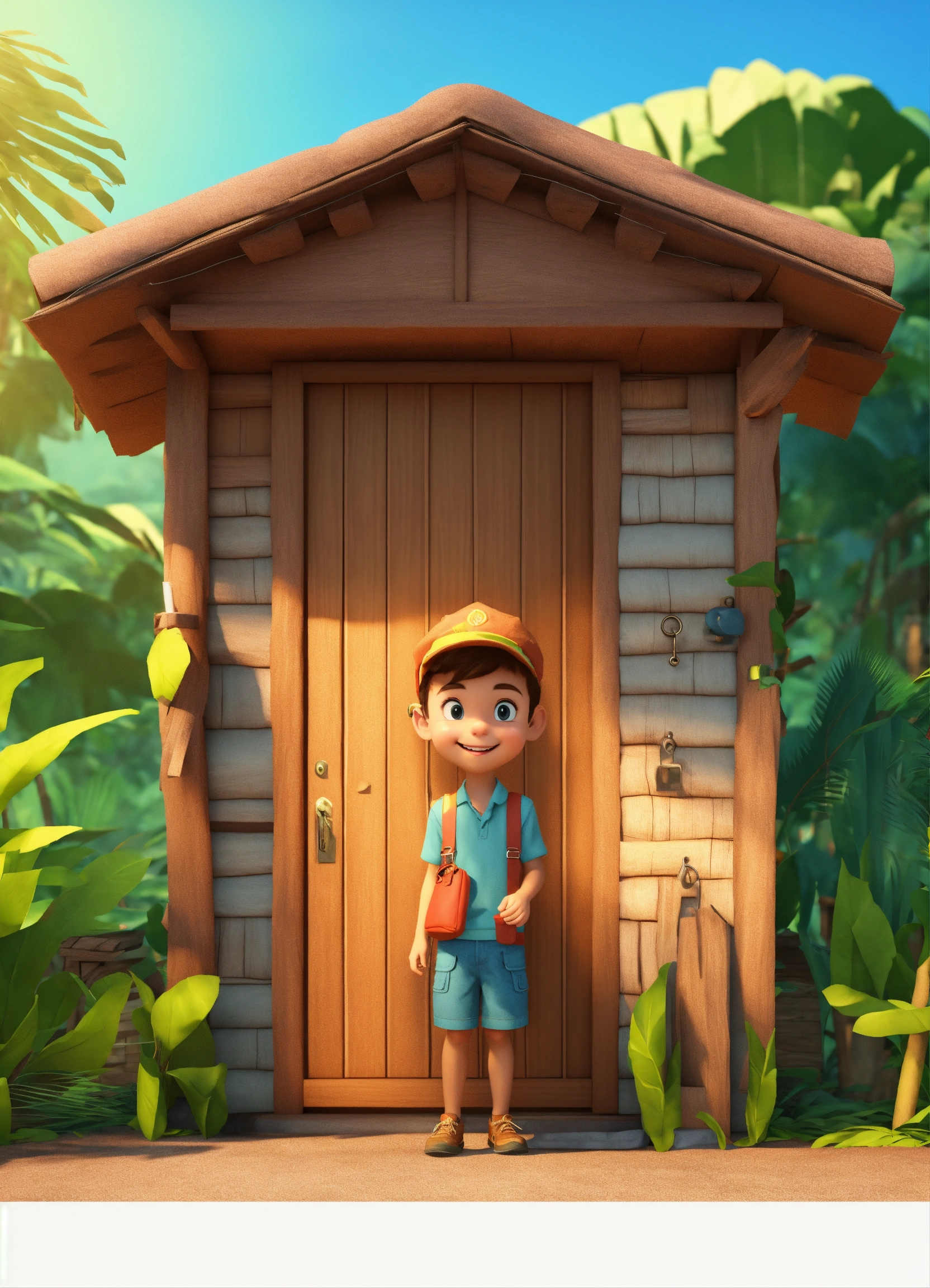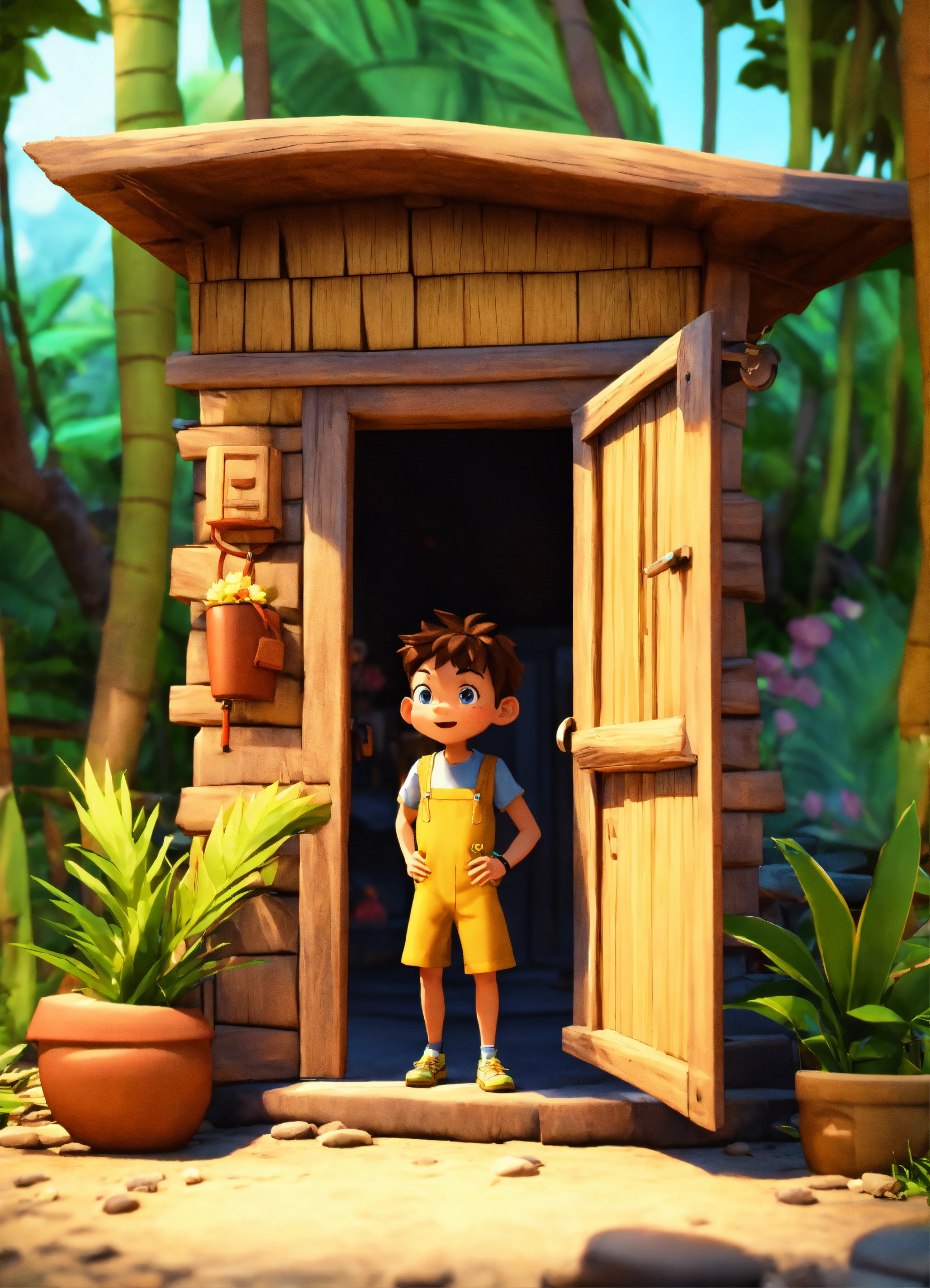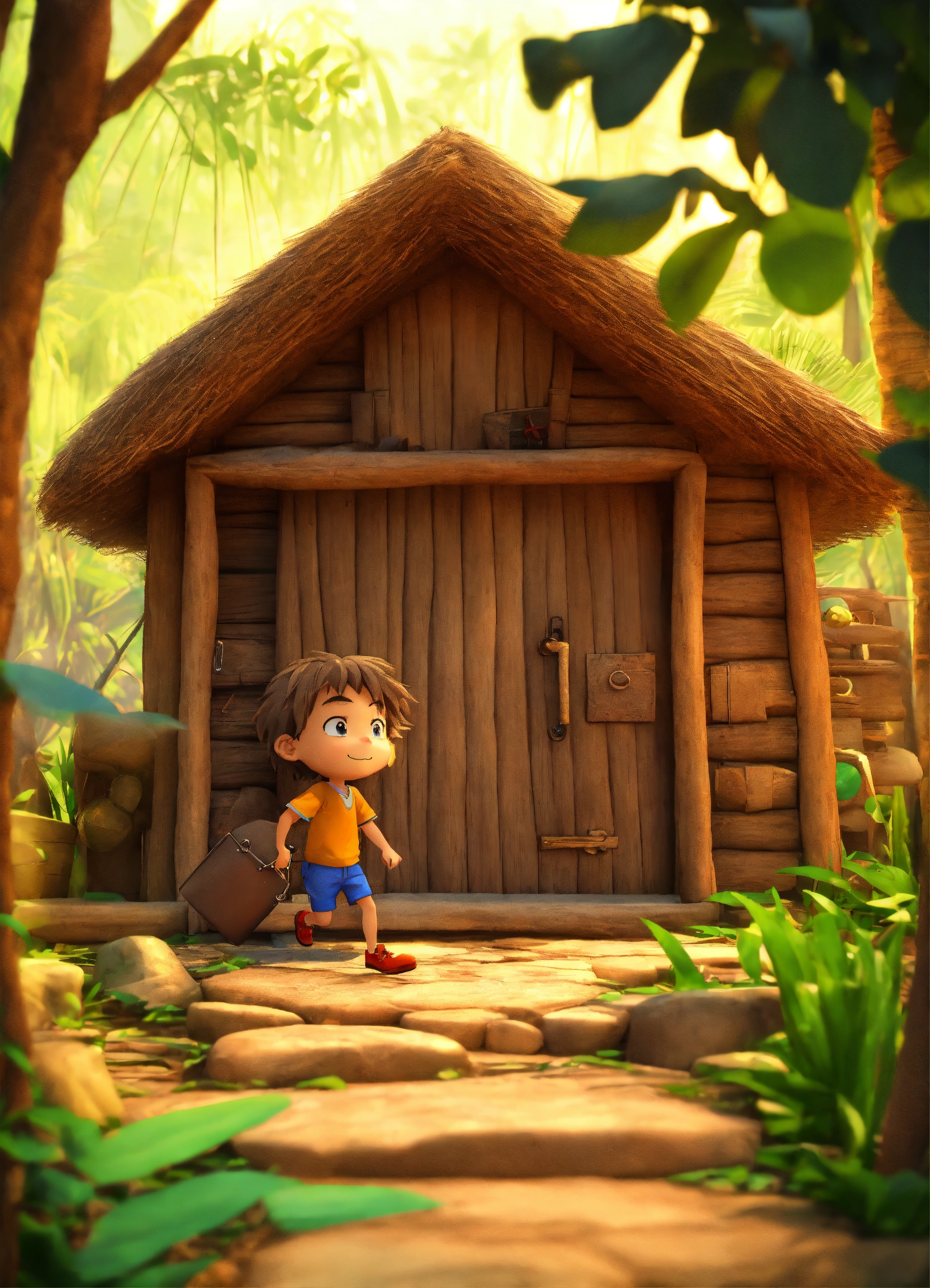 3d style animation cartoon cute boy knock at door of huts in jungle