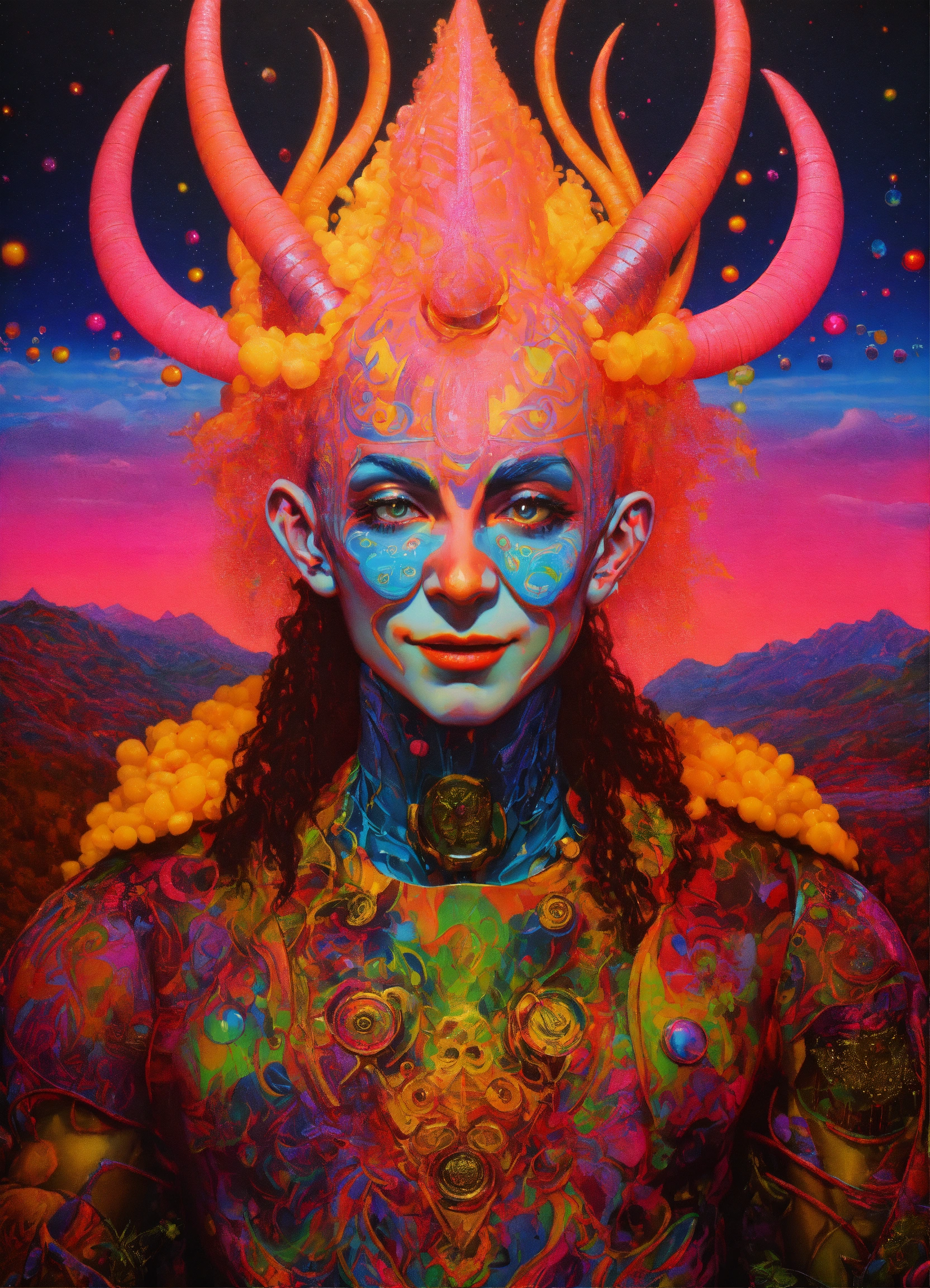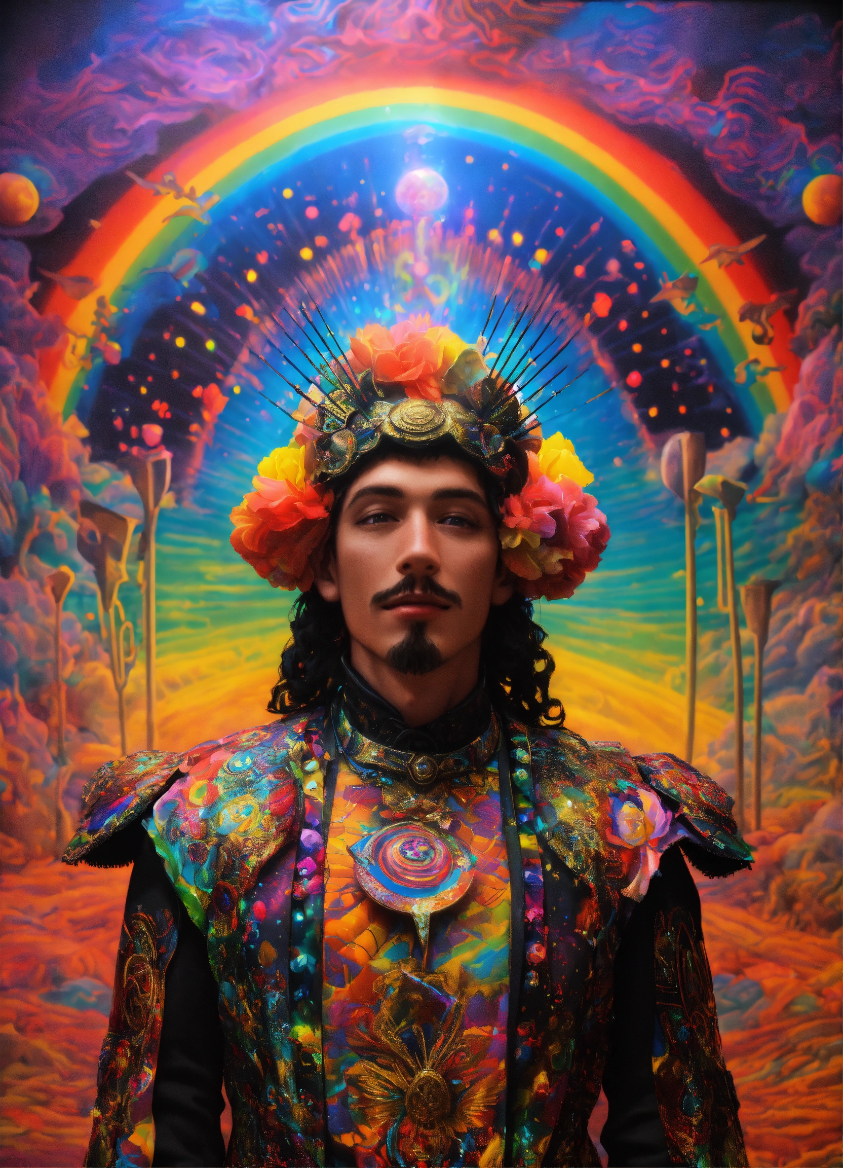 Photorealistic 3d 35 mm portrait of gothic male warrior man ai god dmt laughing psytrance grimes punk rock anime haute couture costume, baptized in a cosmic alex grey painting in a dmt black laser light neon black rainbow glitter holographic techno club art by salvador dali and holy mountain the movie.
