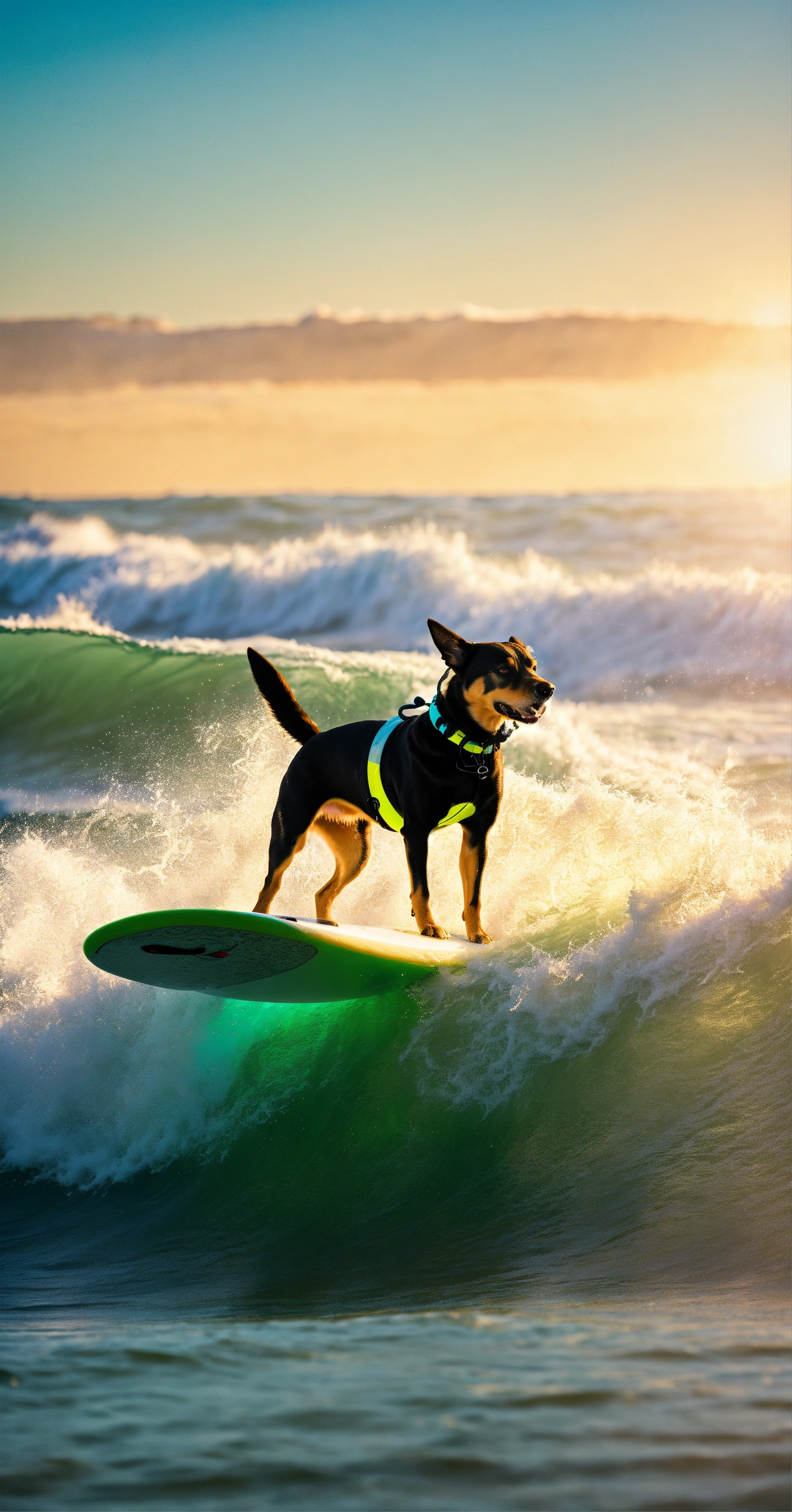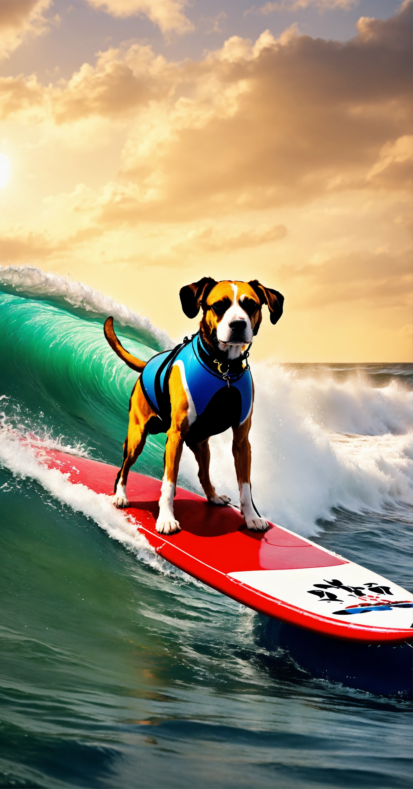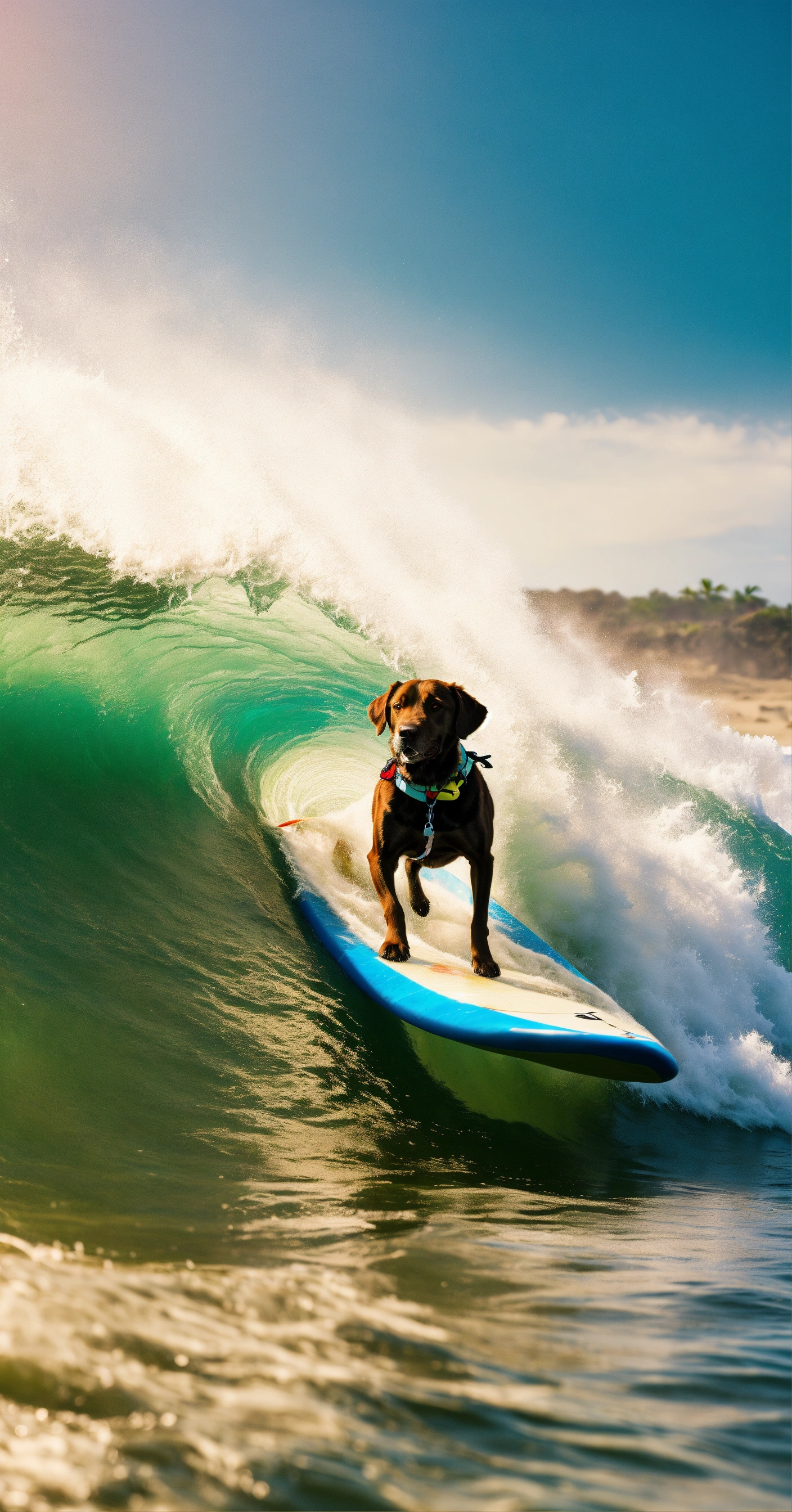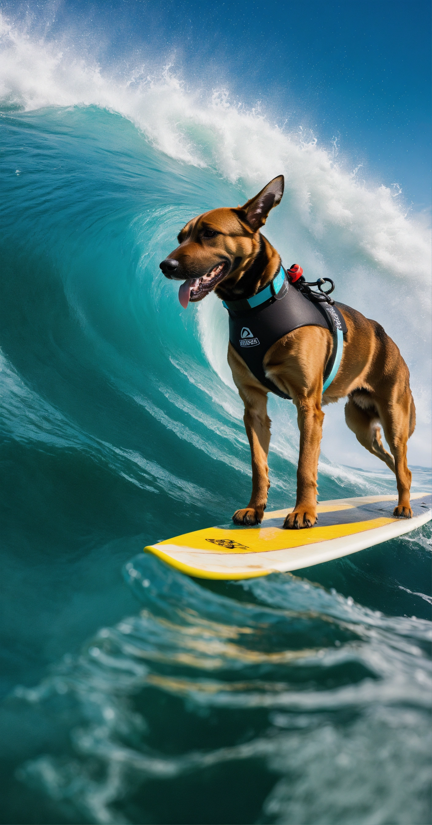 Generate an image of a dog riding a surfboard, riding a massive wave in the ocean with a surfer's wet suit and surfboard leash.