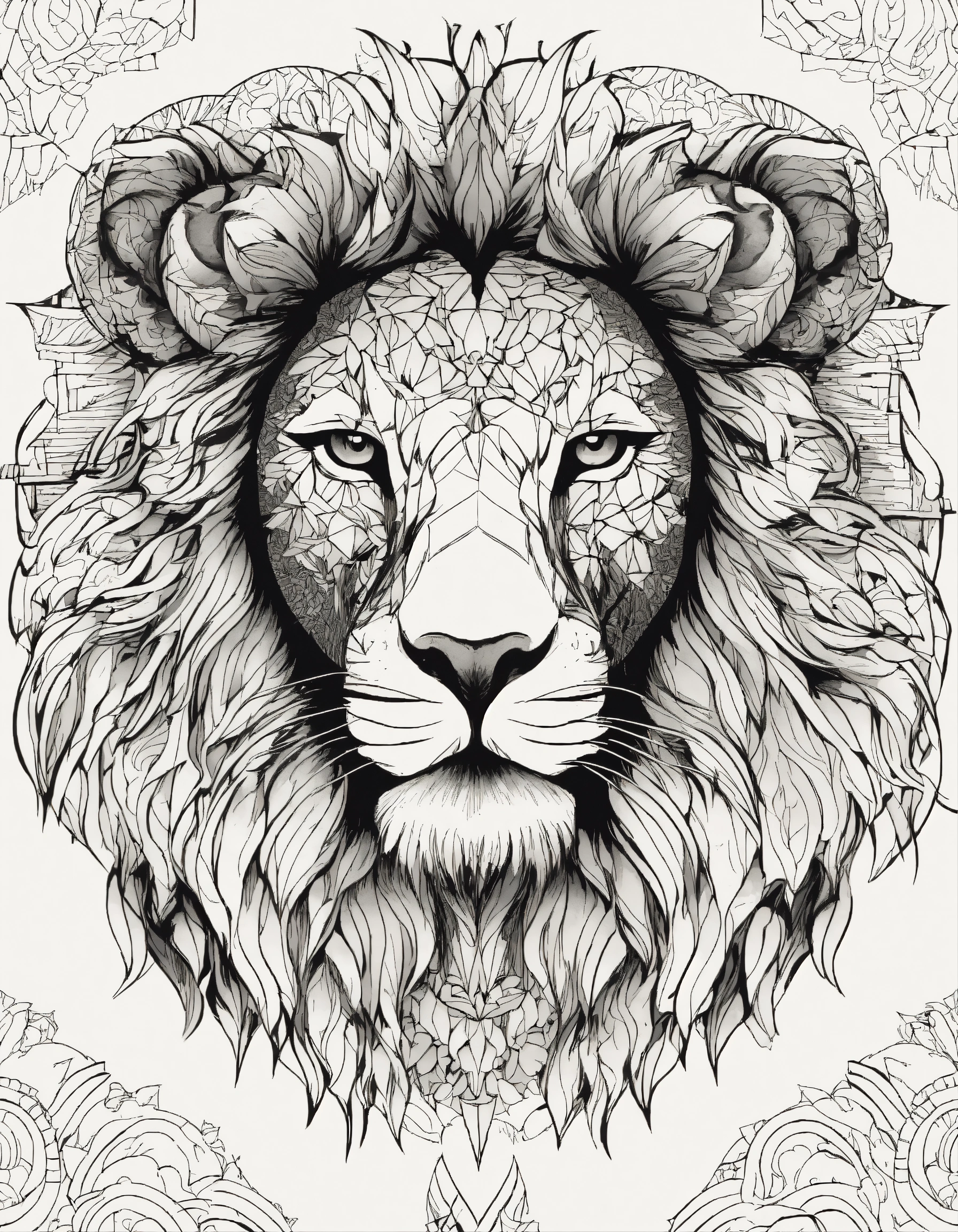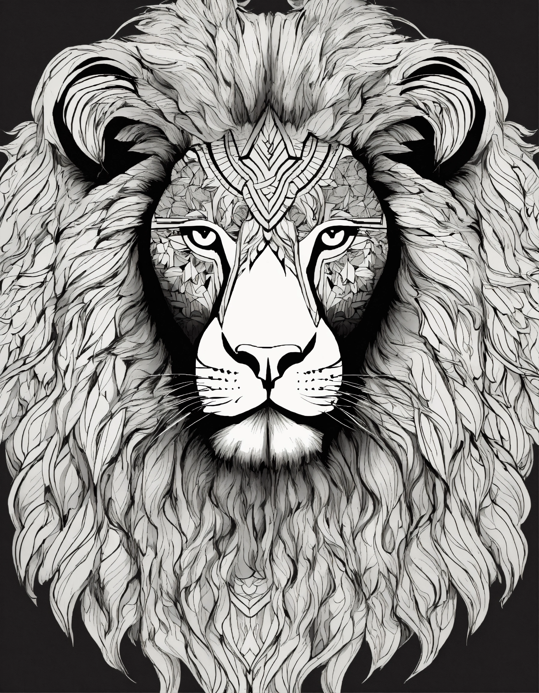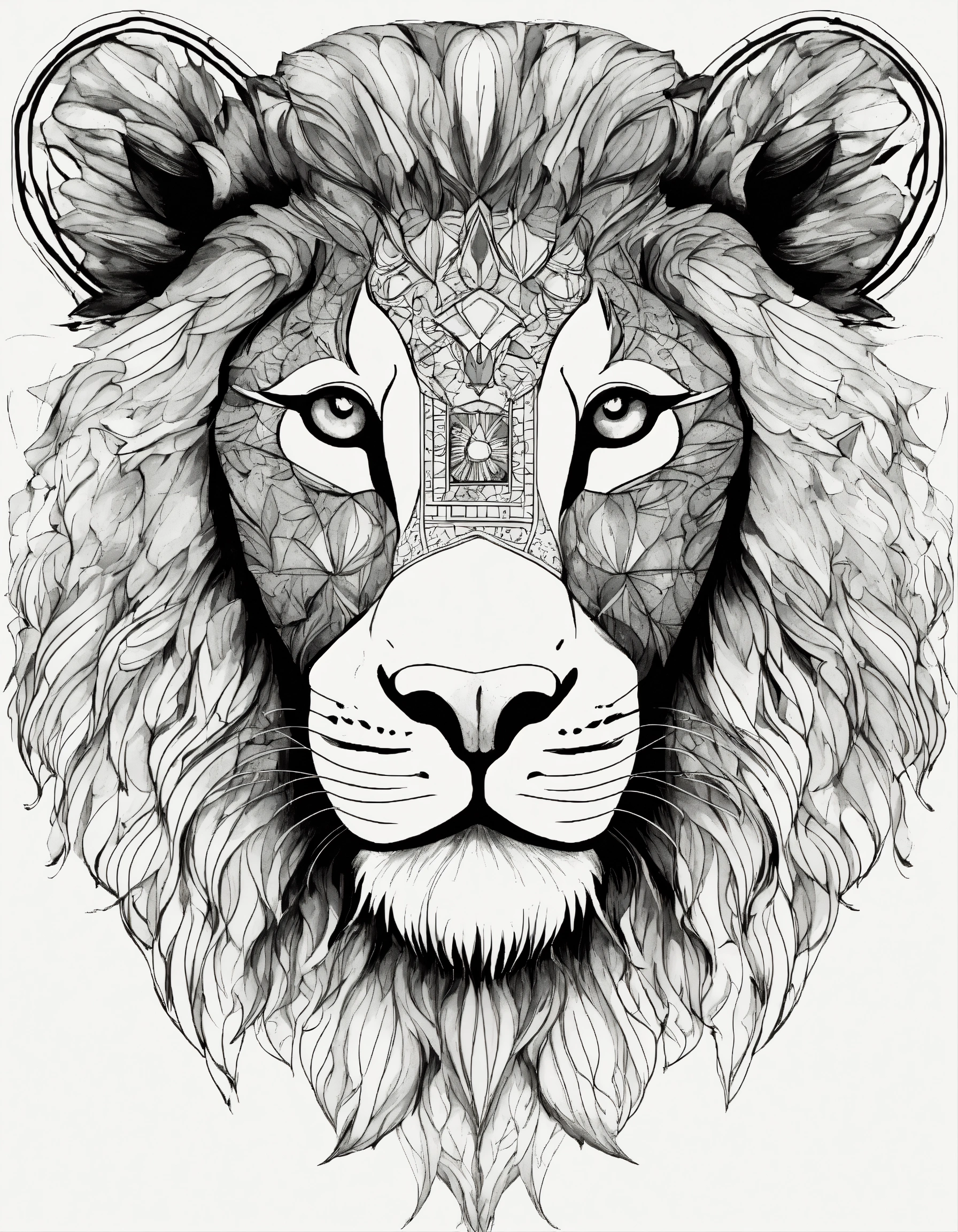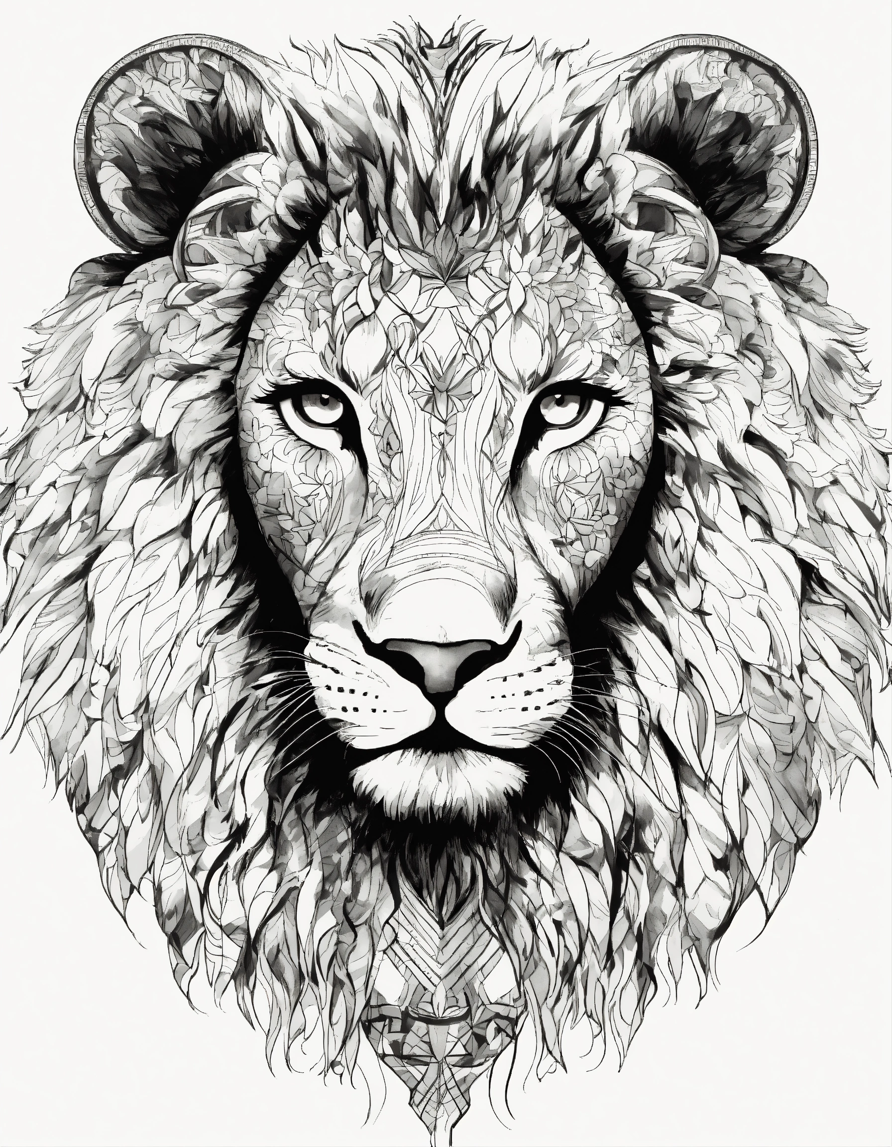 Symmetry, one lion head and only facing front, glare, black and white, white background, no background, ink fine line art stylized, vector, design for tattoo, african pattern mane, small cat ears
