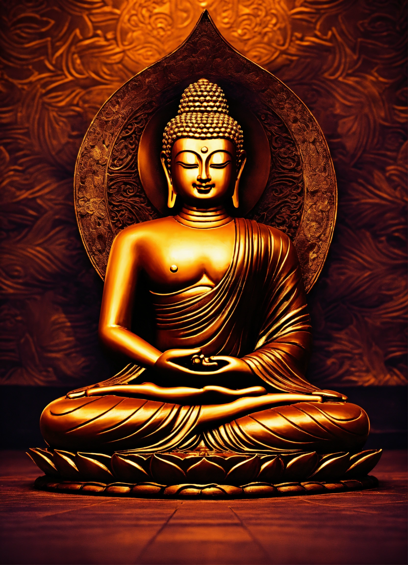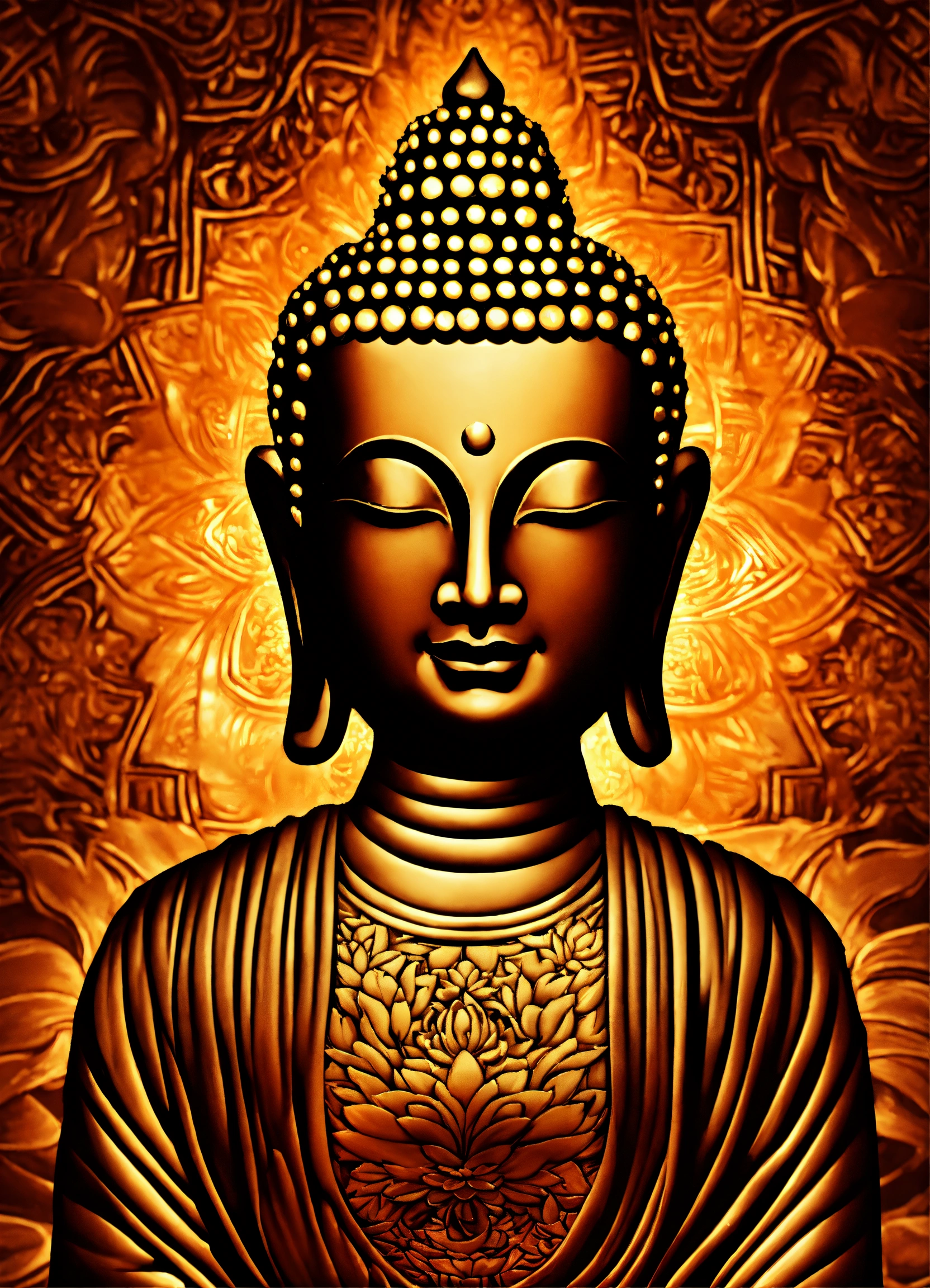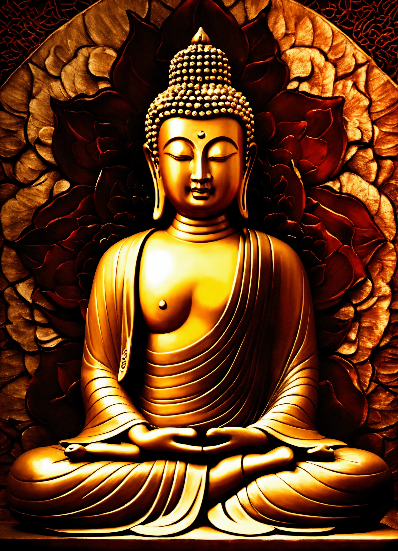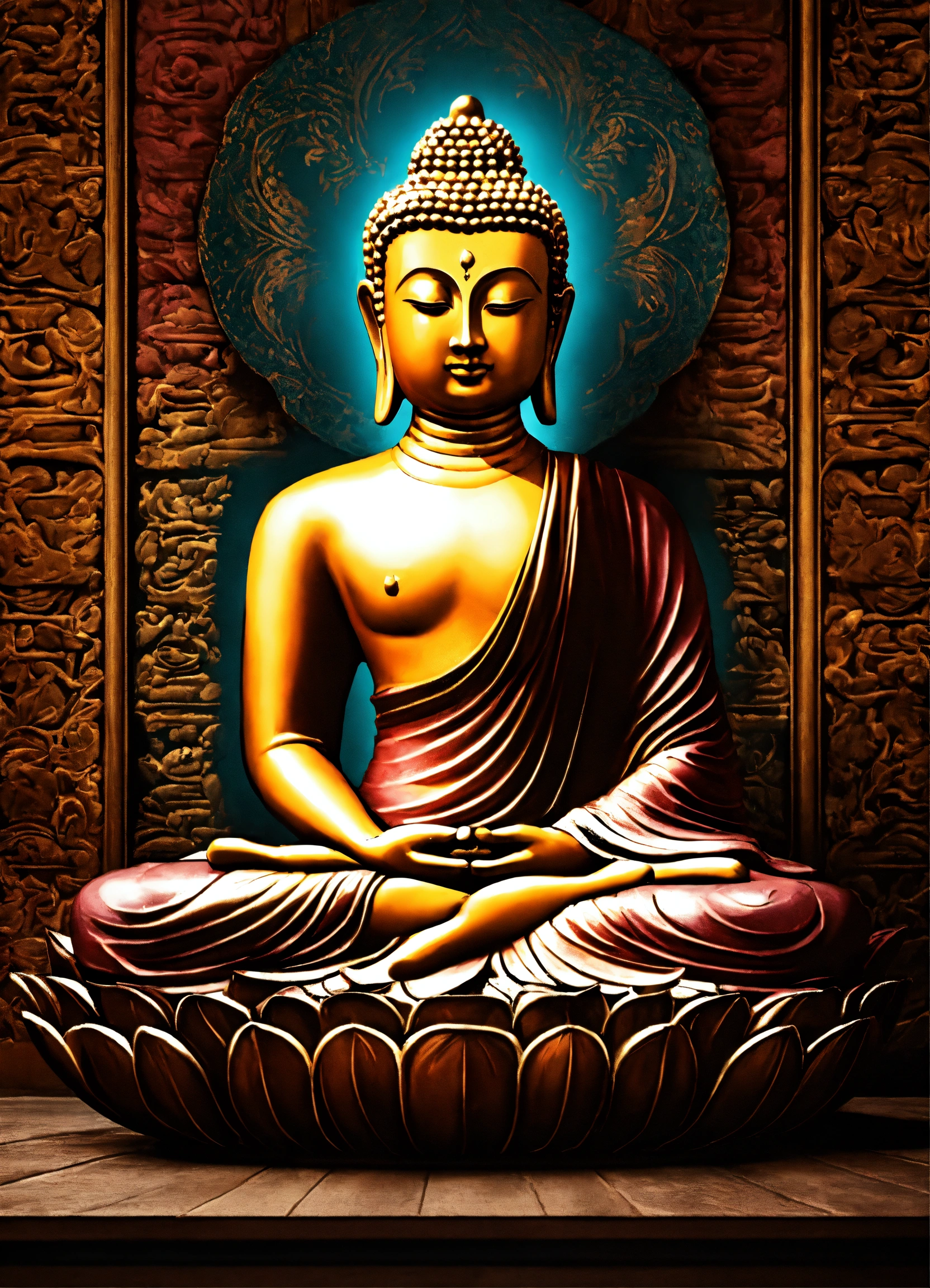 Buddha in a deep meditation, close-up face image calm and attractive posture, background wall with lotus design, dark colors