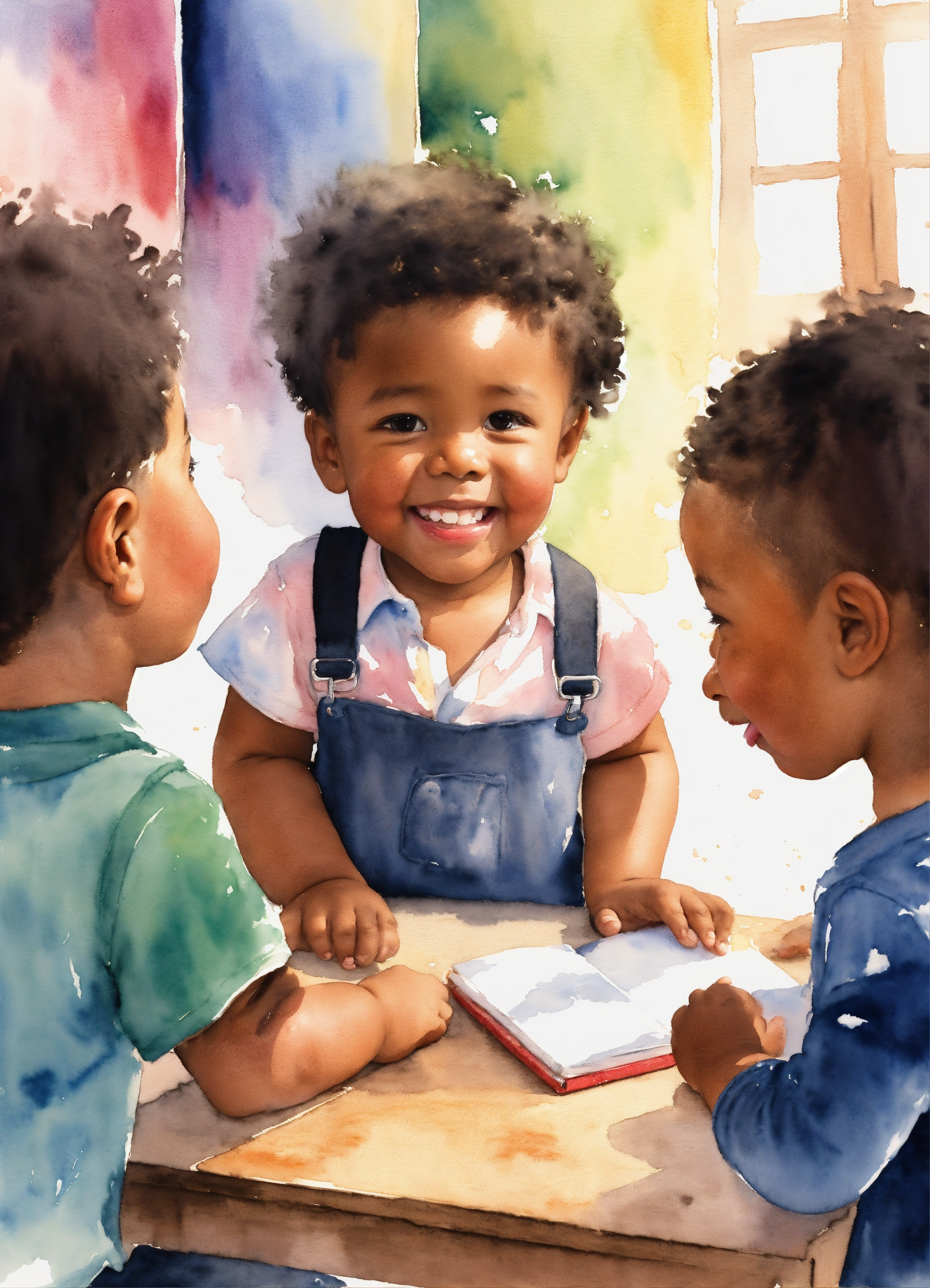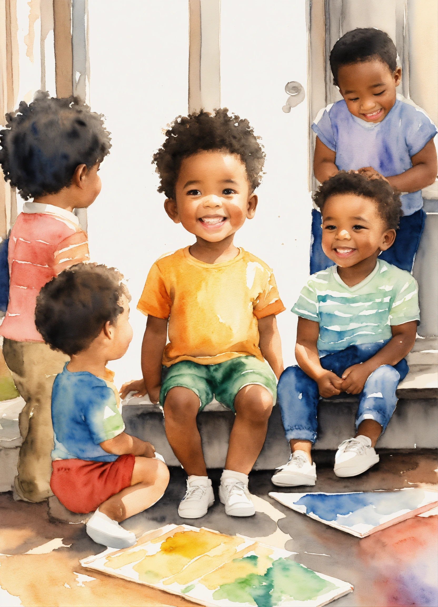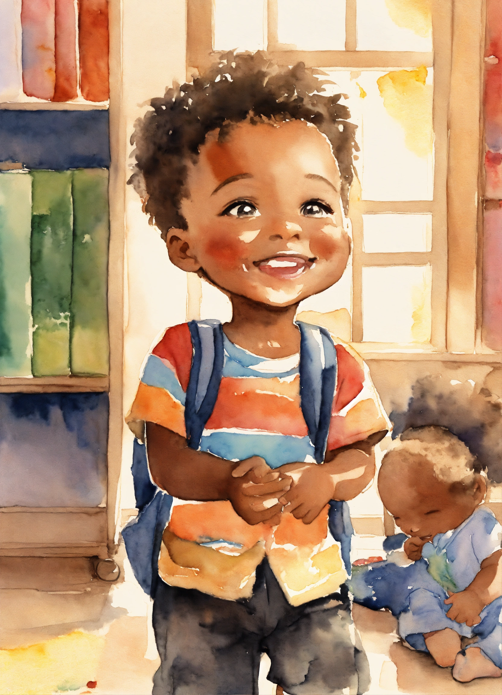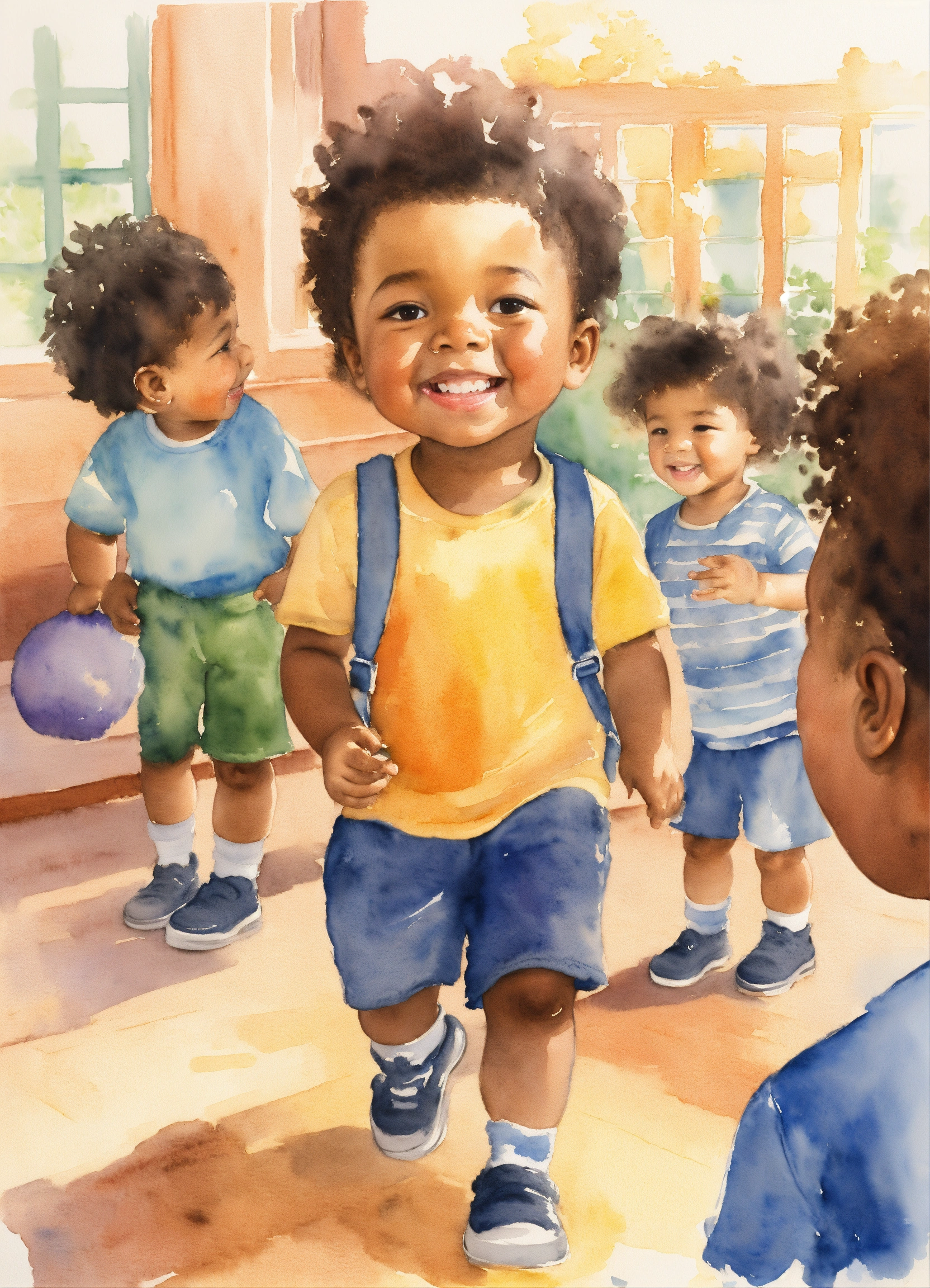 Watercolor, colorful, illustrate a black toddler boy playing with his friends at school. show his mom watching with a proud smile from a distance. highlight the joy on his face as he interacts with his peers.