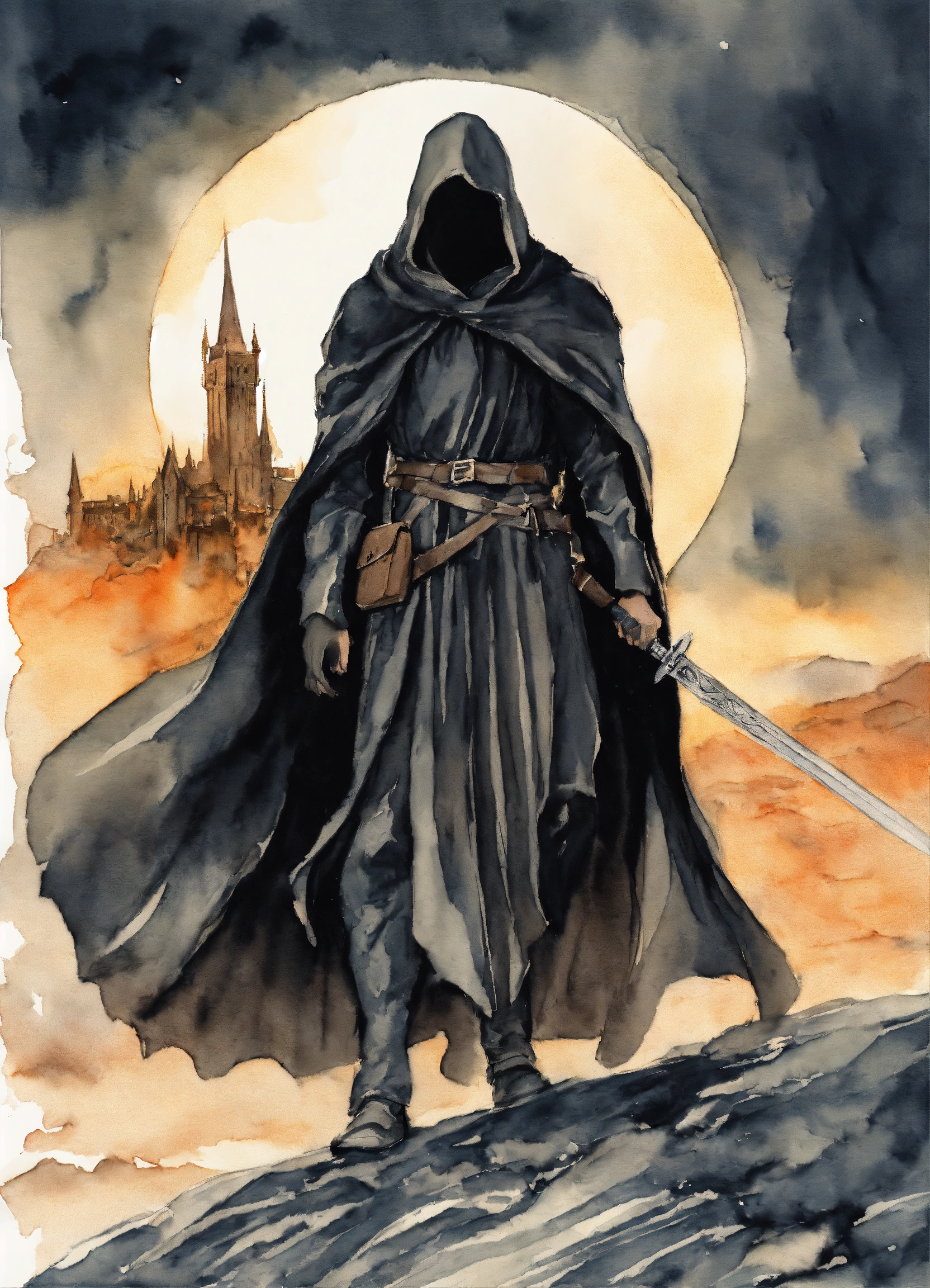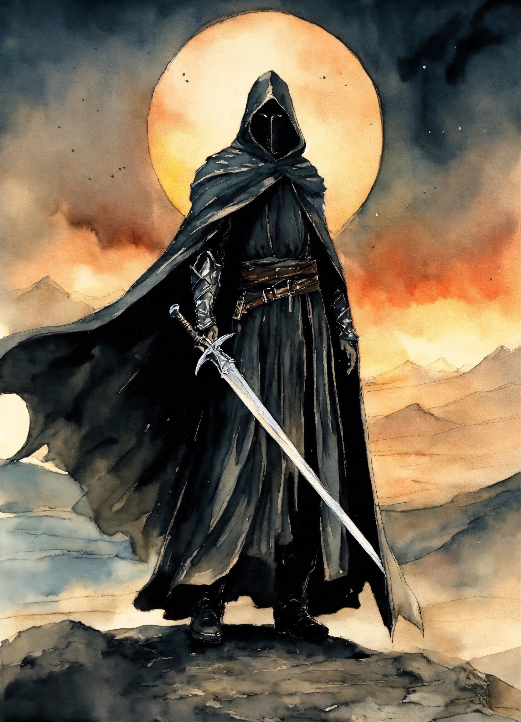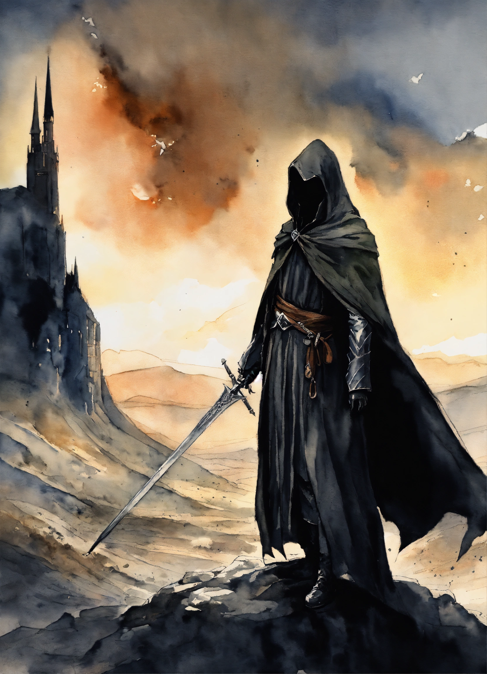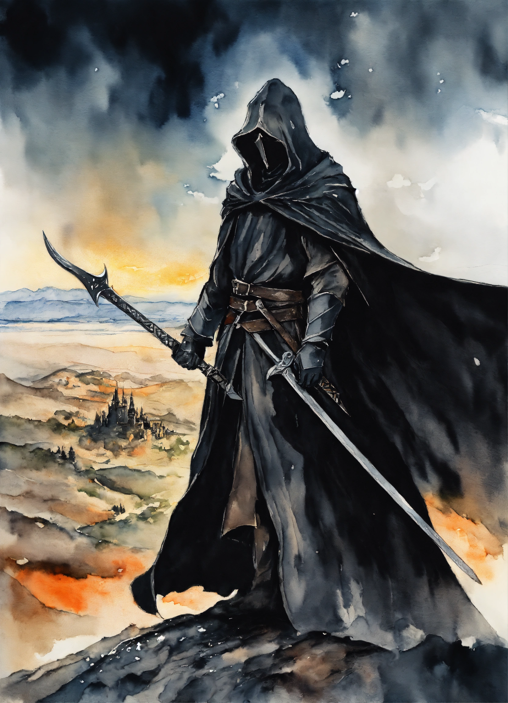 A nazgul from lotr with black cloak in vagabond manga drawing art style, watercolor, with mordor at the background