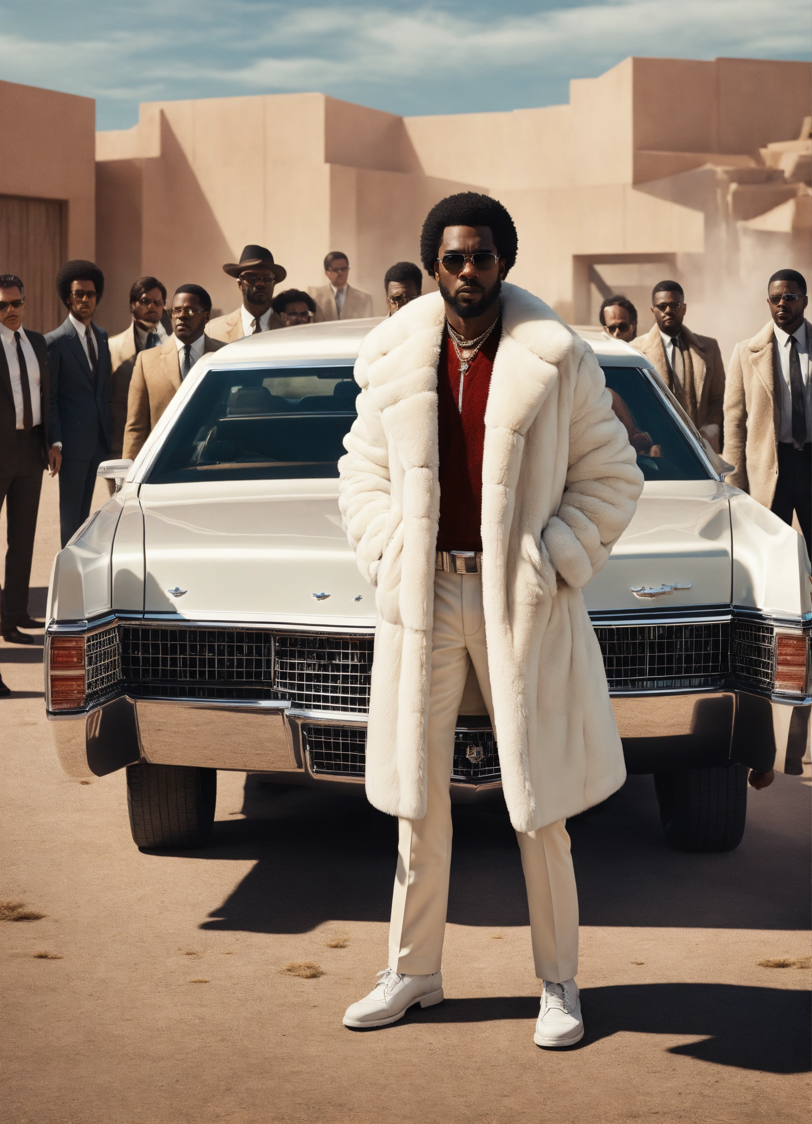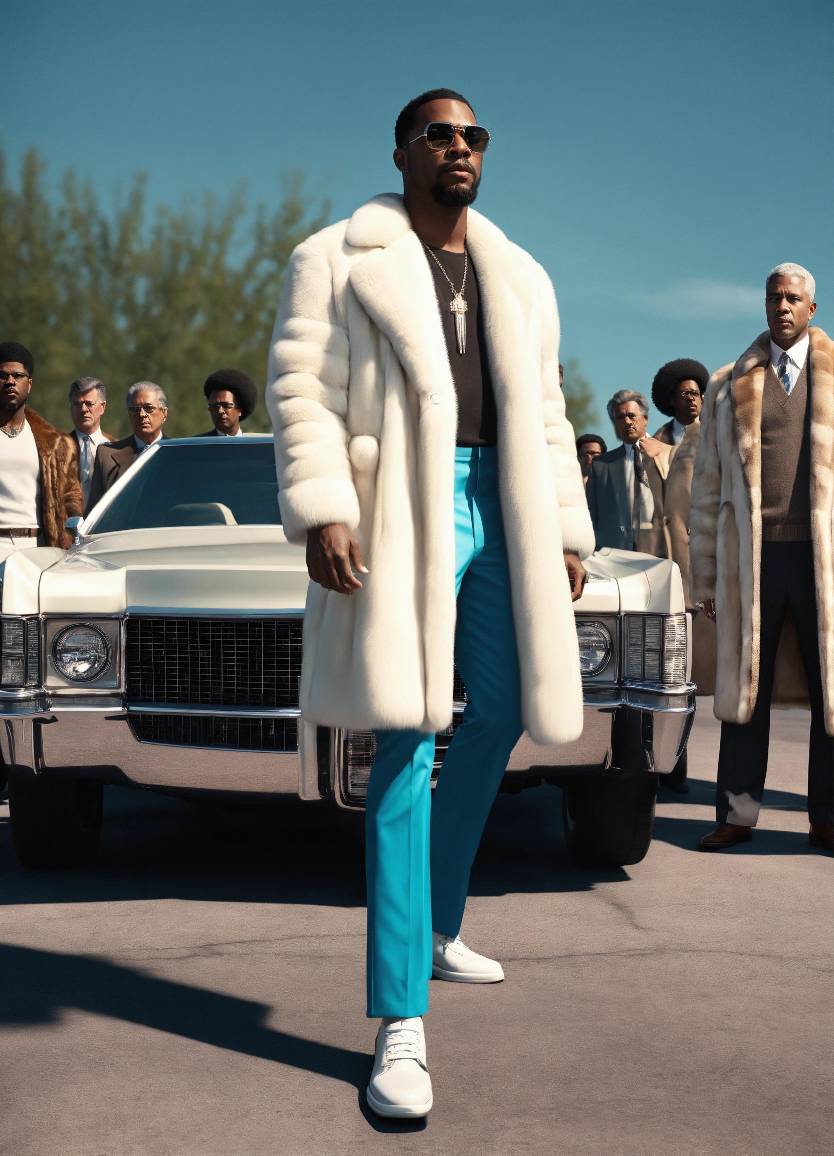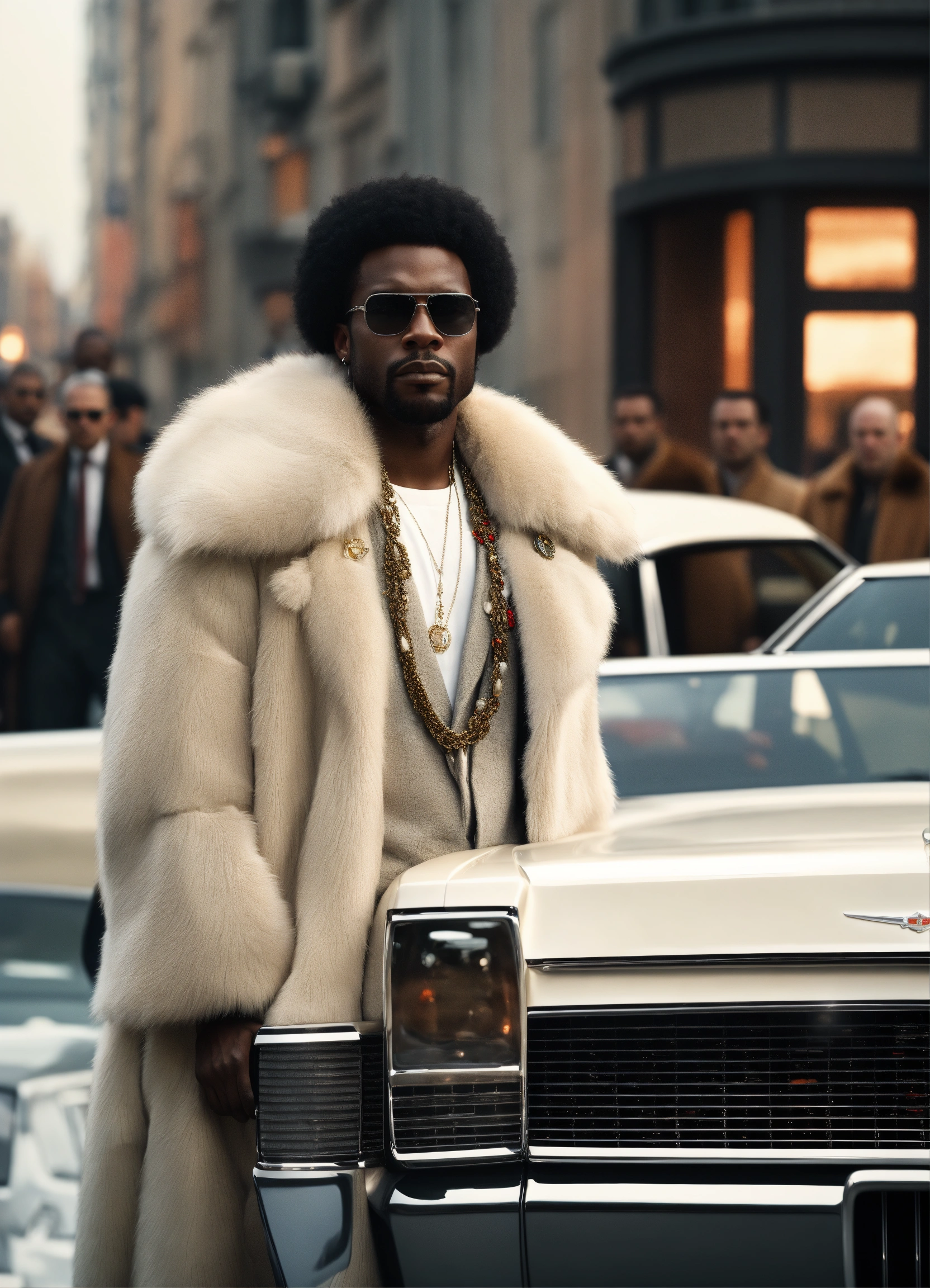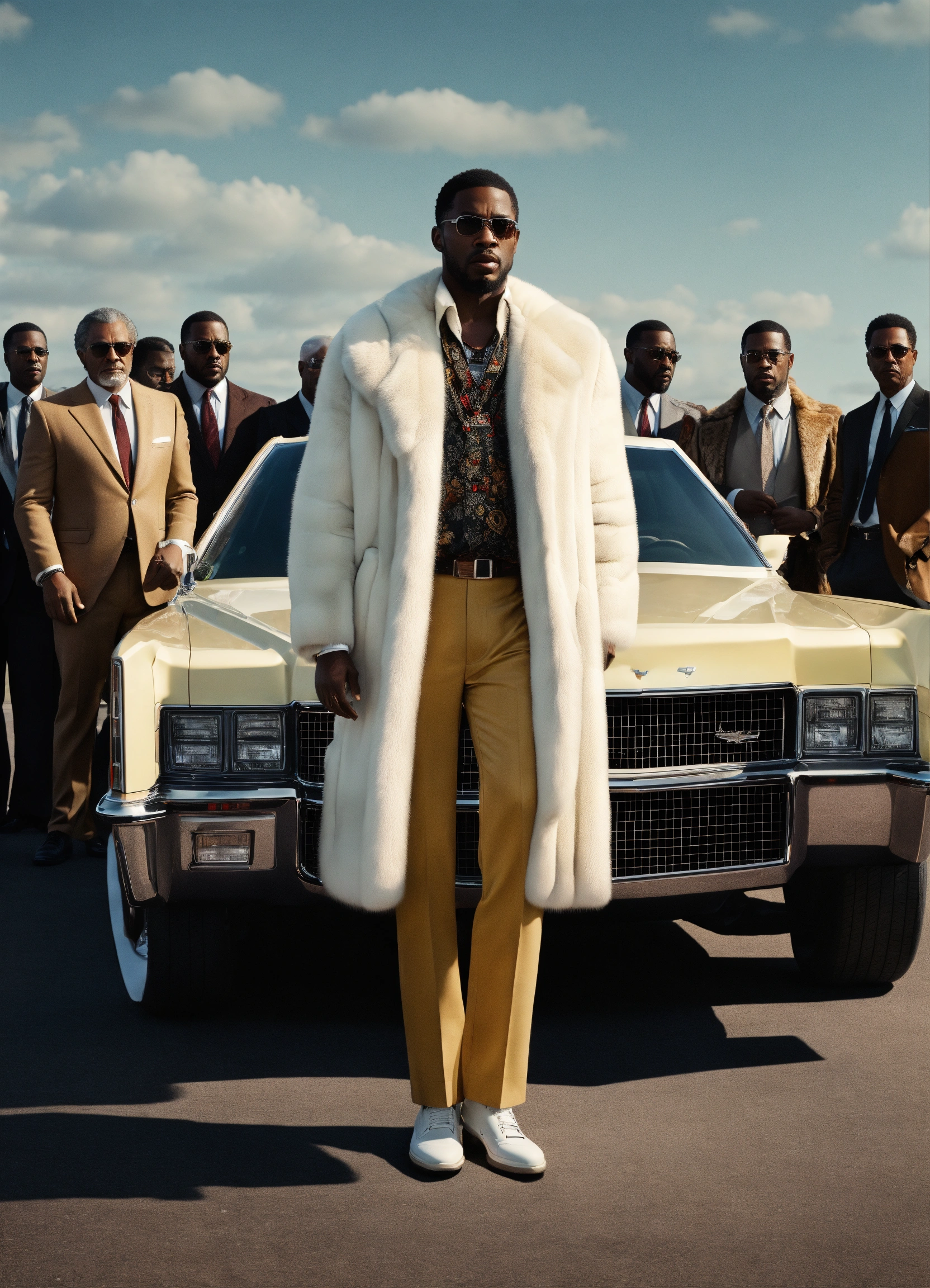 Black man standing next to a brand new white cadillac, wearing a fur coat, 1970s, surrounded by angry white men in the background starring in his direction, hyperrealistic, 4k render
