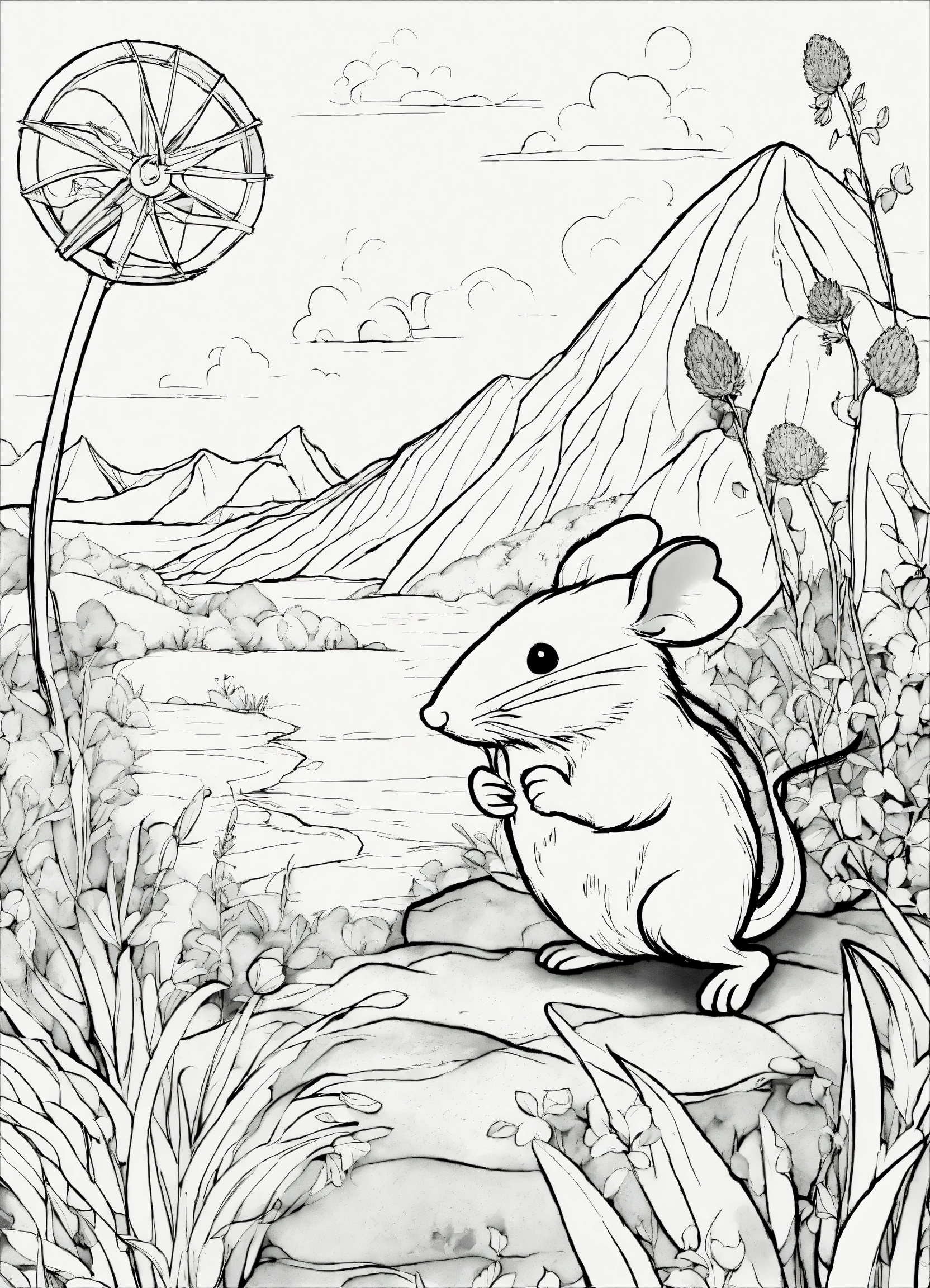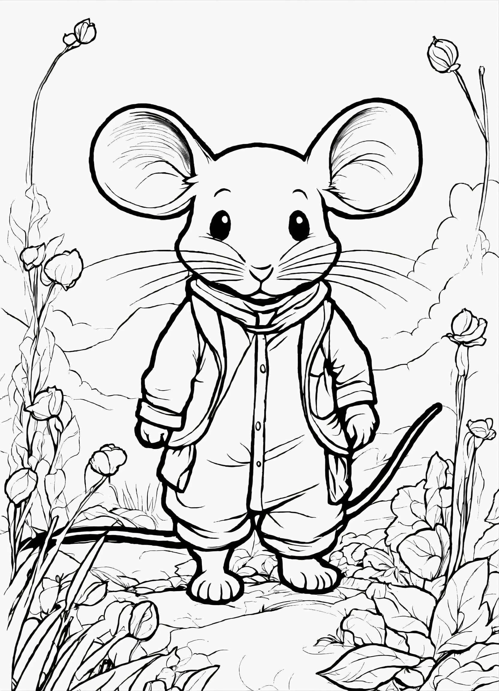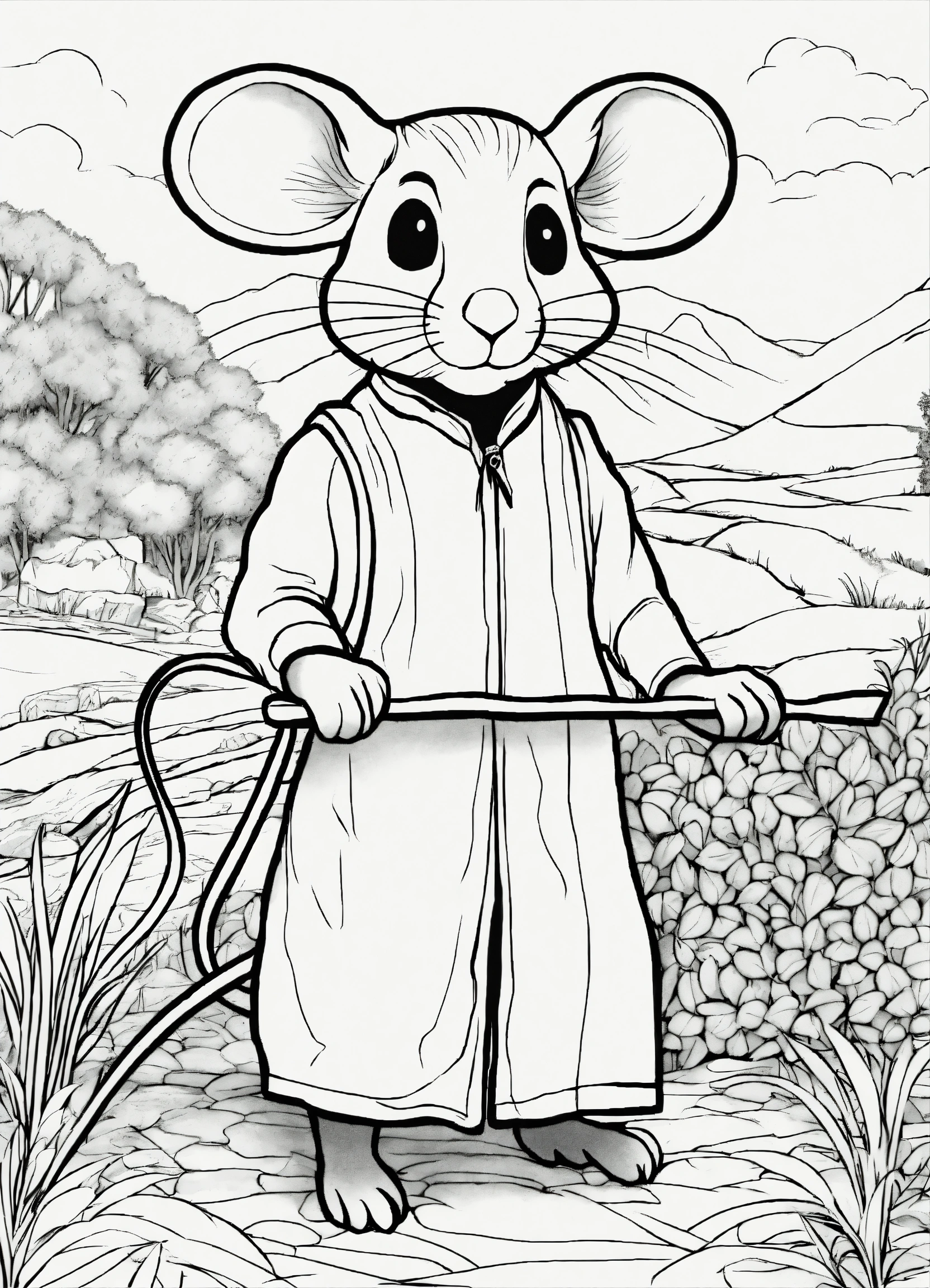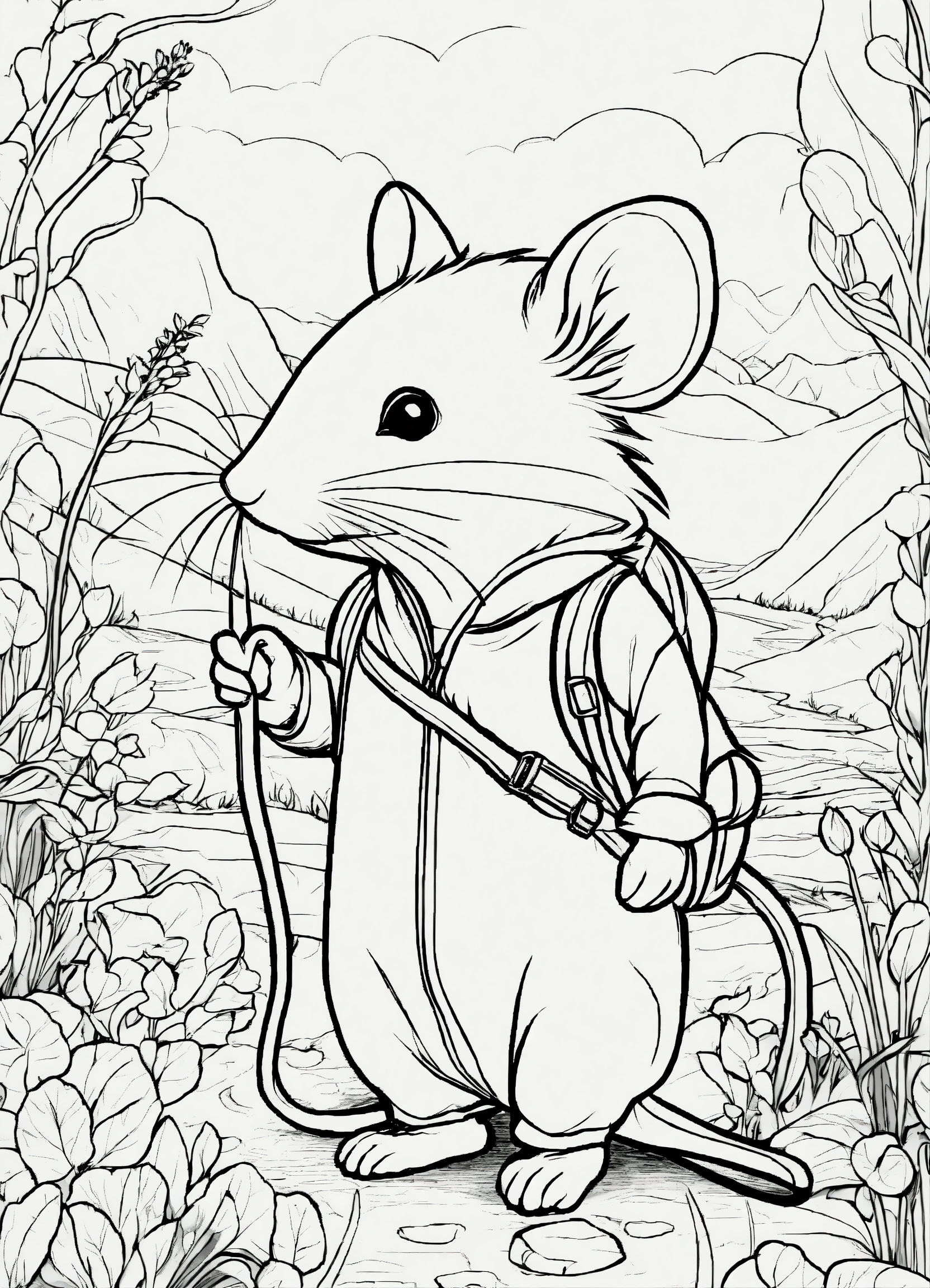 A wanderer mouse, line drawing, no color, coloring book for kids, white background, black distinct lines on a white background, seed 152772096