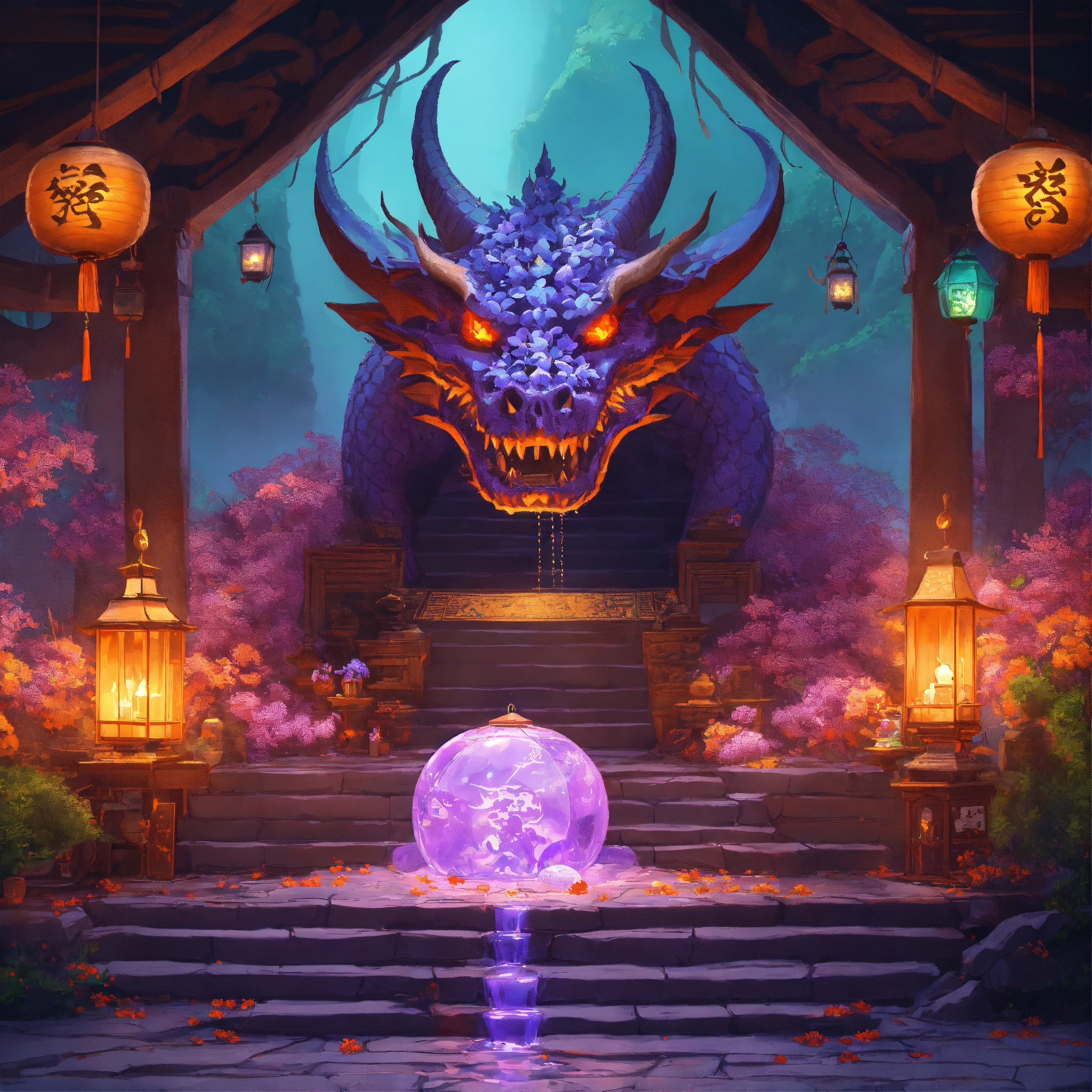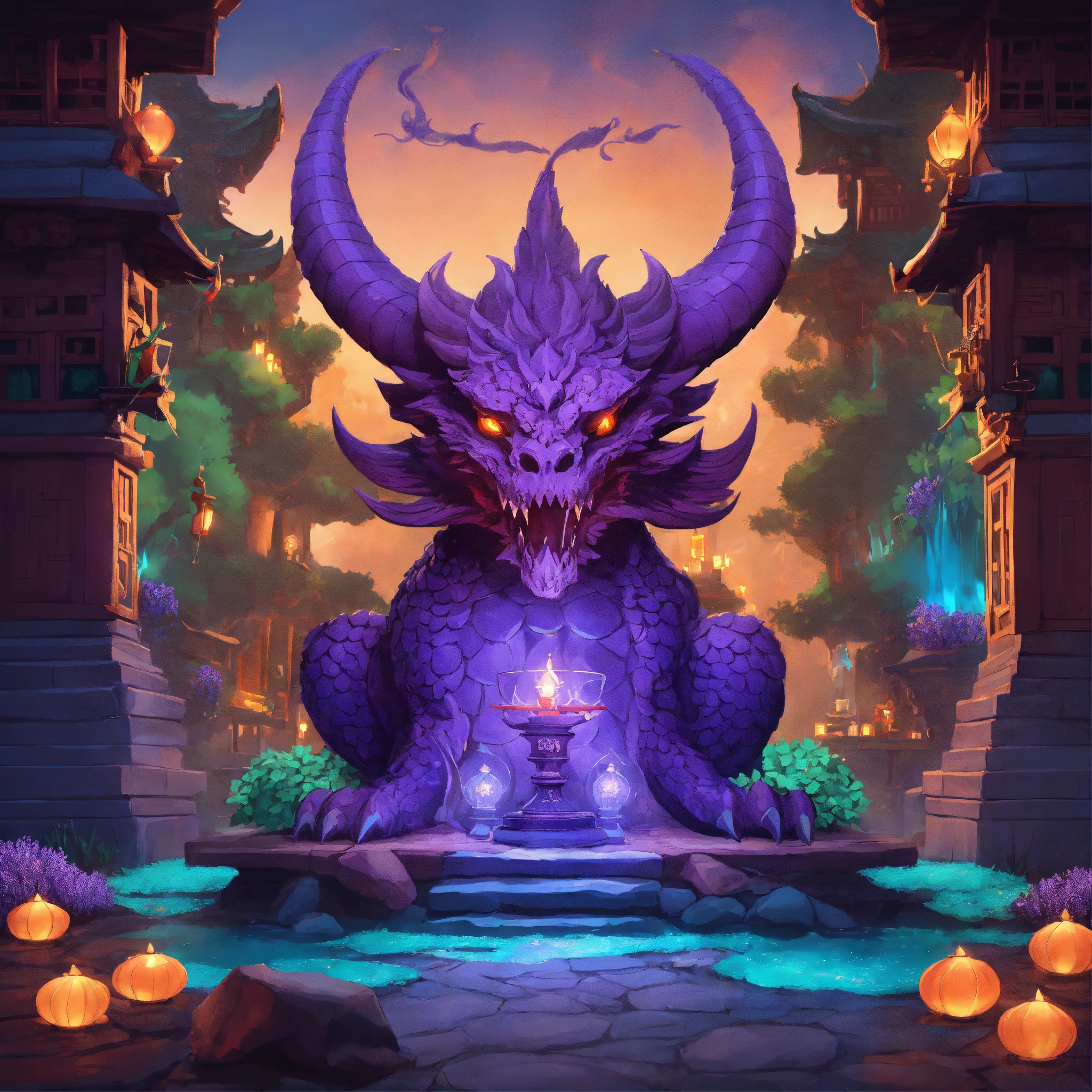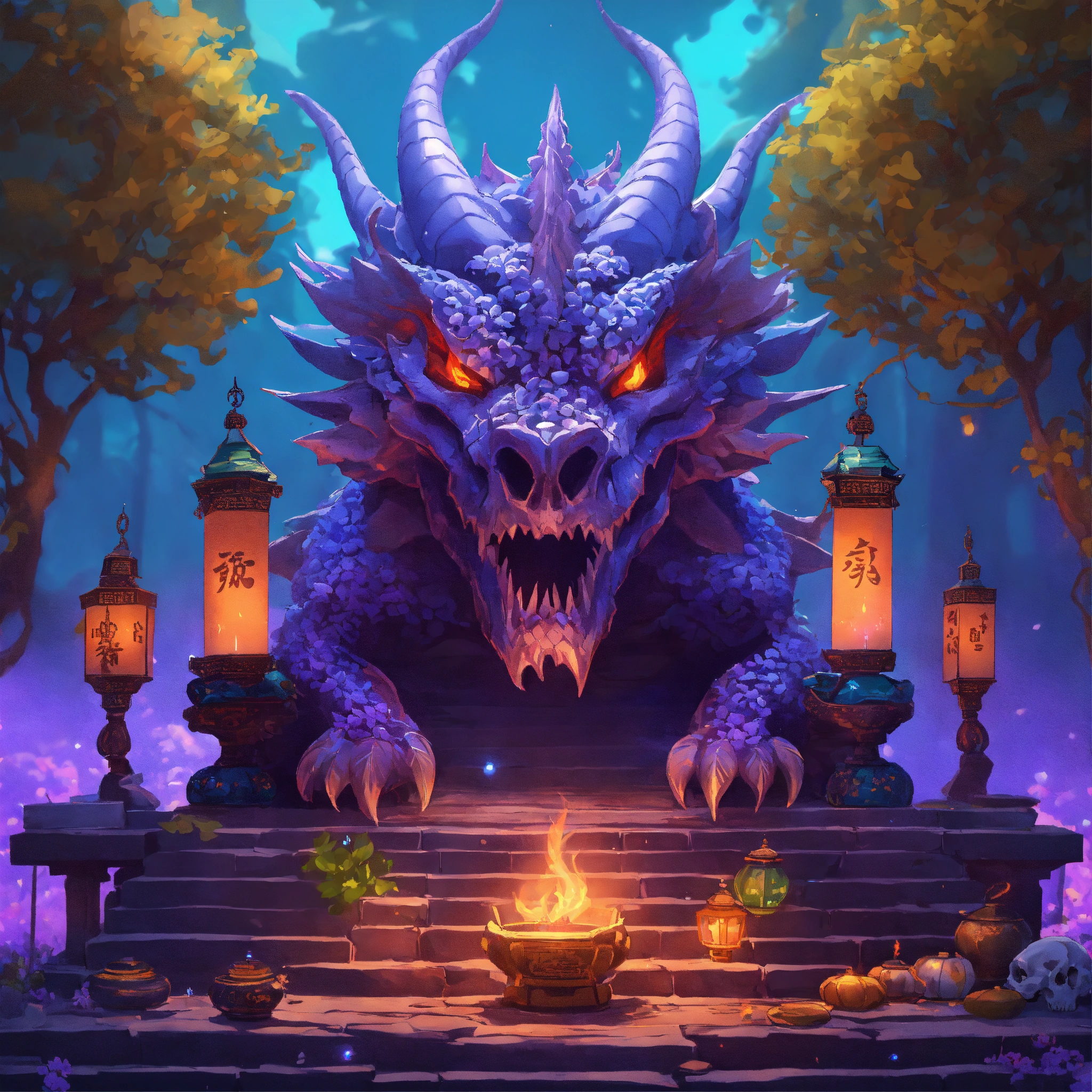 A shrine worshipping a giant dragon skull, shrine placed on the center of the image, you can see various round shaped jewels on the left front of dragon's skull, there's a glass cup with purple liquid emitting blue-ish purple smoke on the right front of dragon's skull, around the shrine you can see asian candle lanterns shining in green fire hanging and the lanterns have mythical floral shape designed on them, purple and orange colored lavender field, the road to the shrine is visible a little bit and it is of clear white tile with aether green and orange sparkling star art here and there, beside the road there are gentle stream of sky blue colored water, dragon skull must be within the shrine, dusk, realistic
