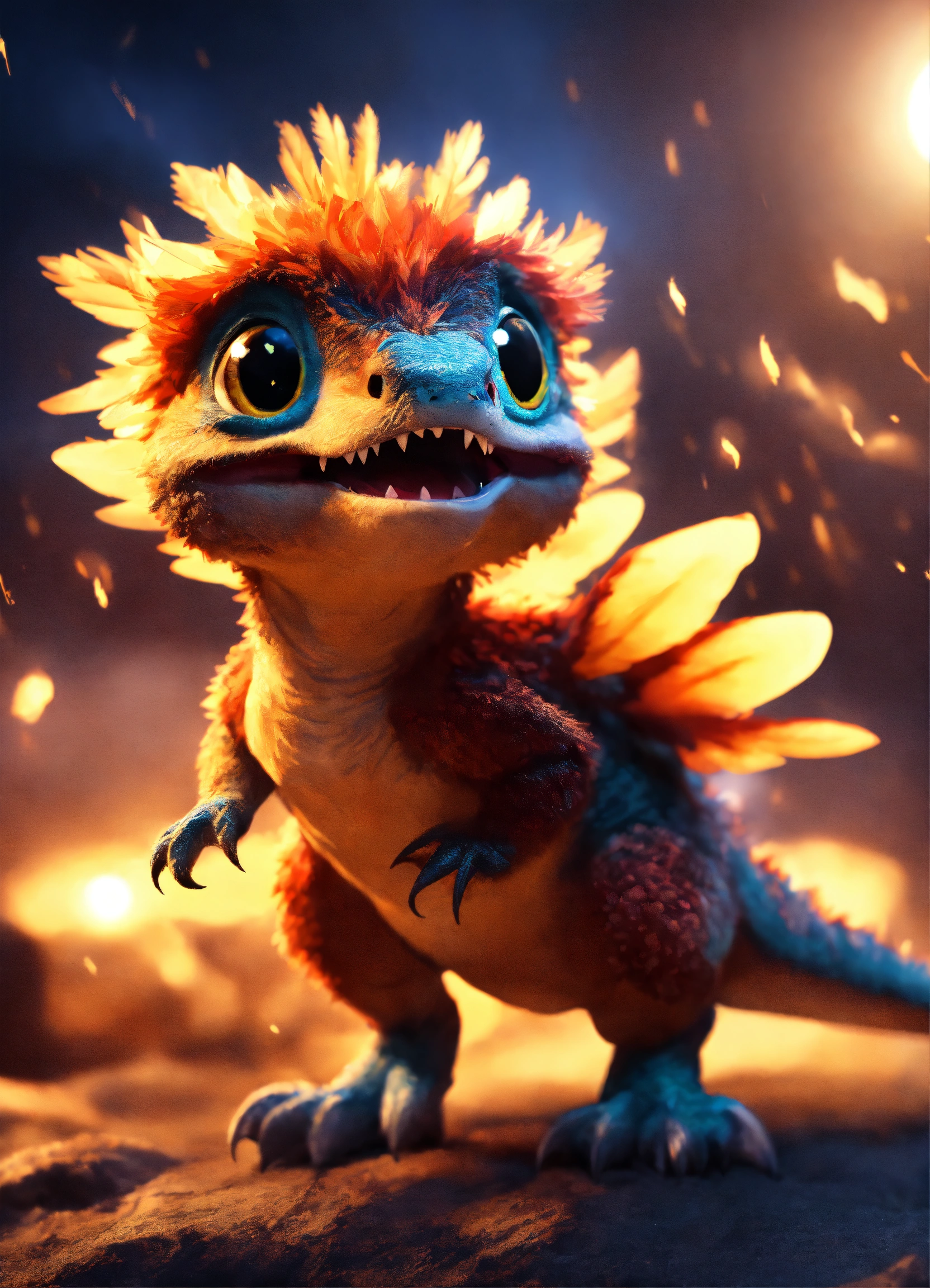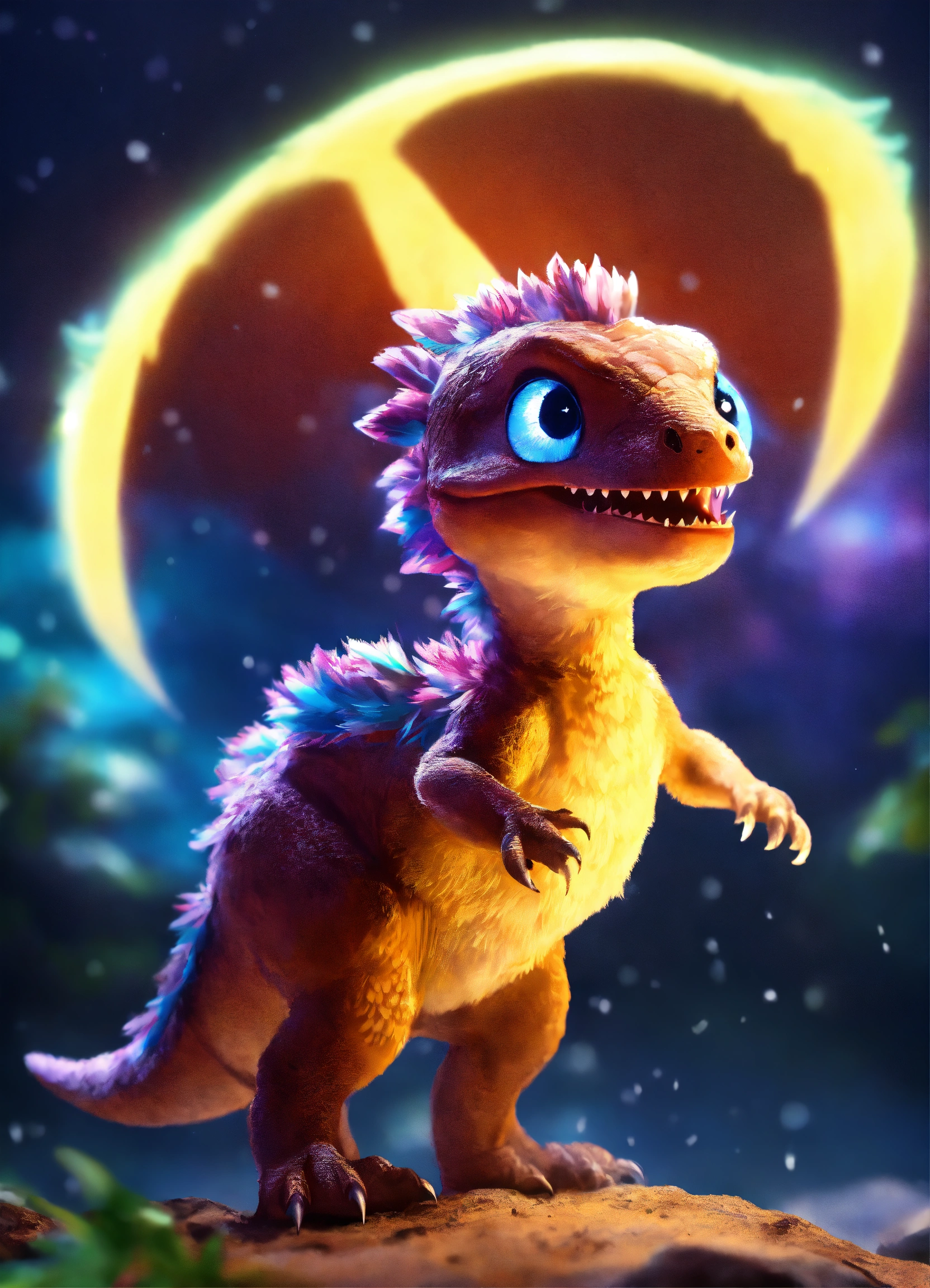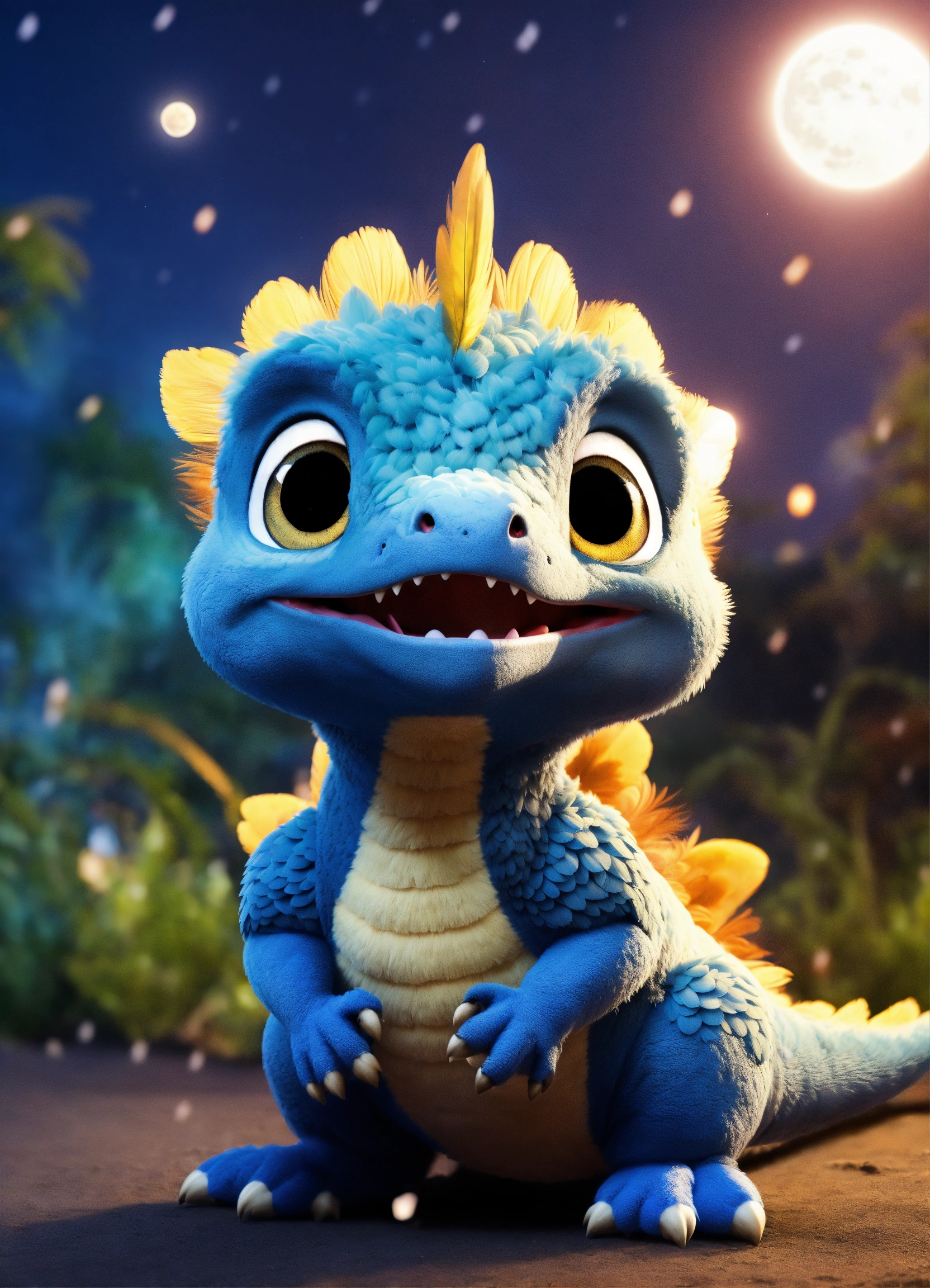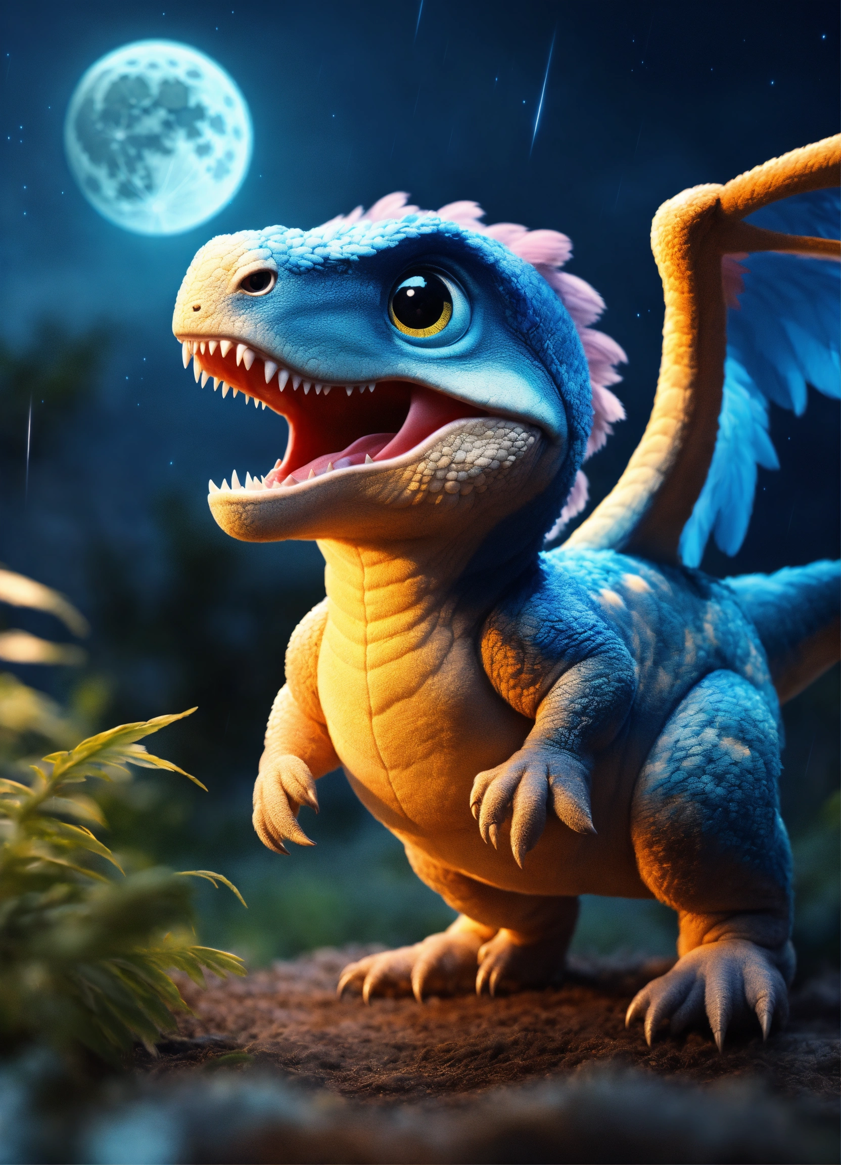 An adorable and fluffy baby dinosaur with big color eyes, roaring, with soft feathers and wings flying, by night, thunder lightning, full moon background, with blur background, high quality, 8k