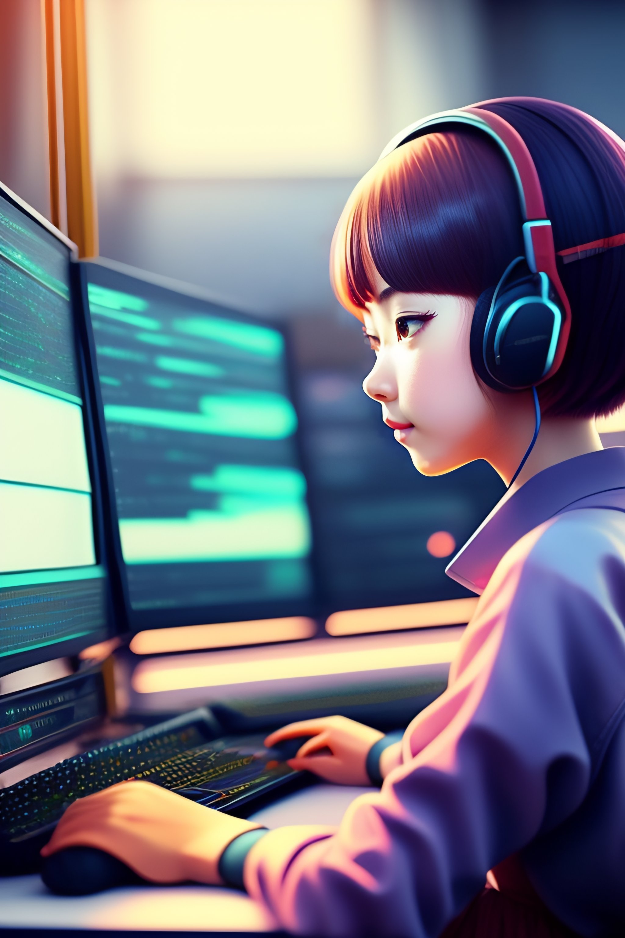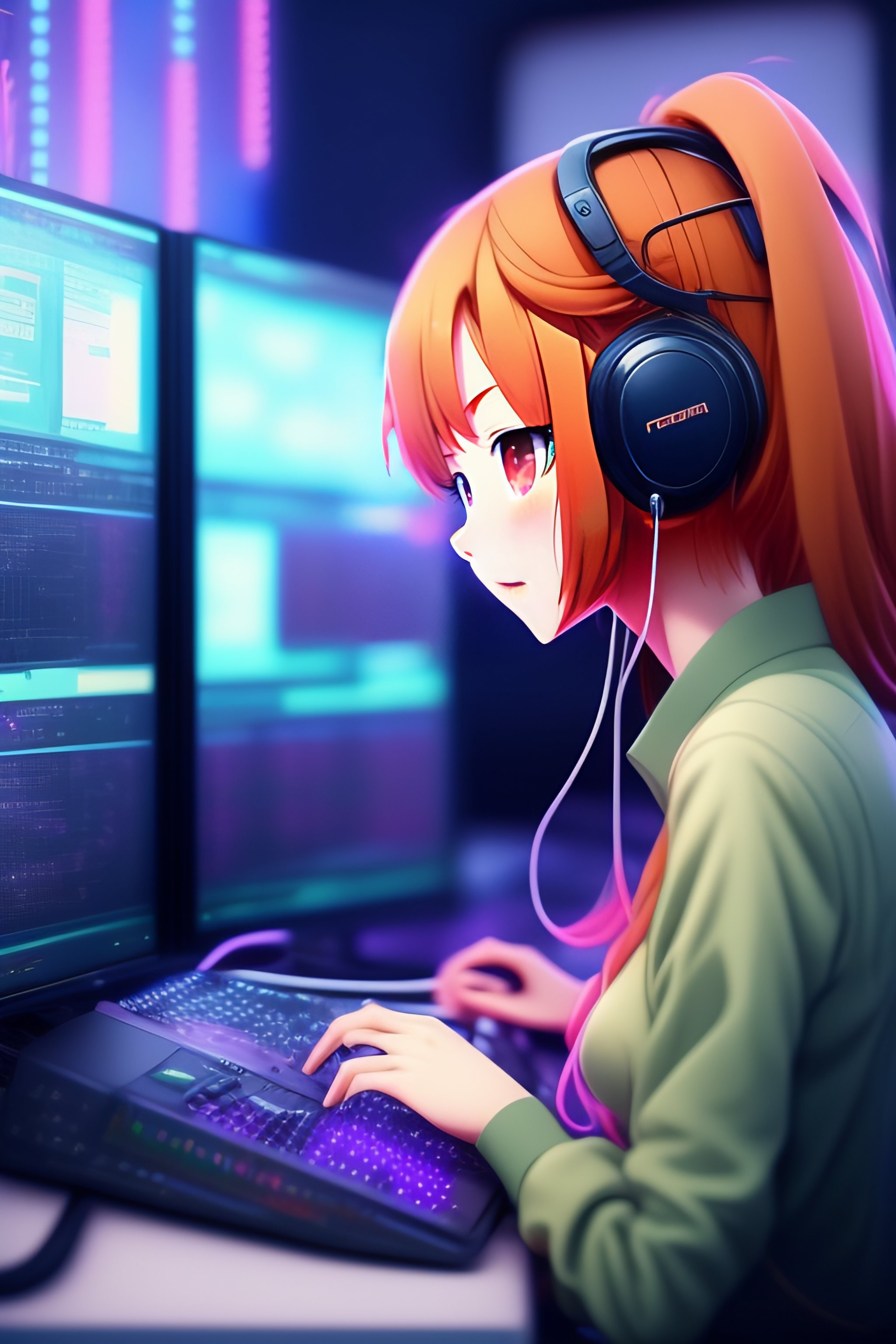 Cute anime girl programming at a computer lofi