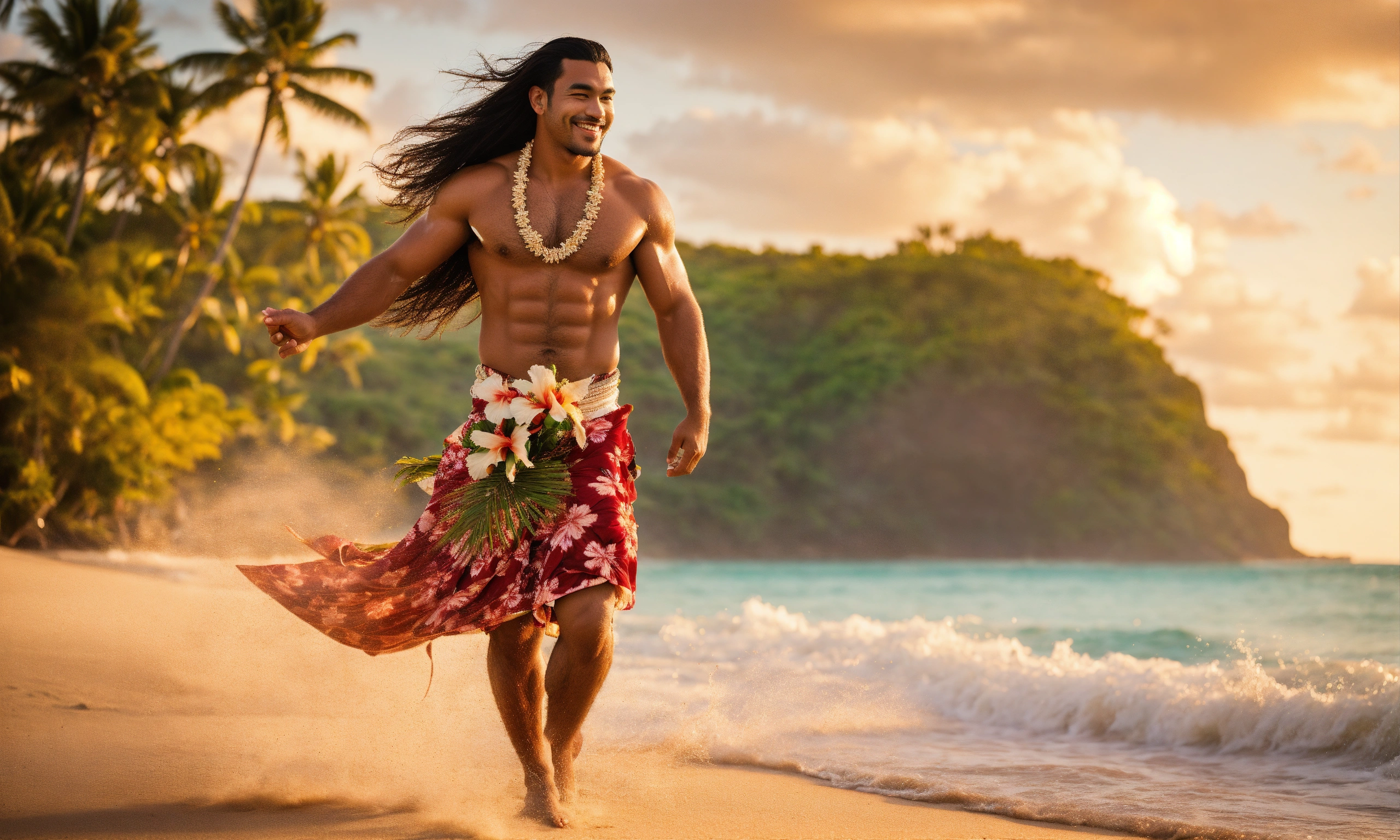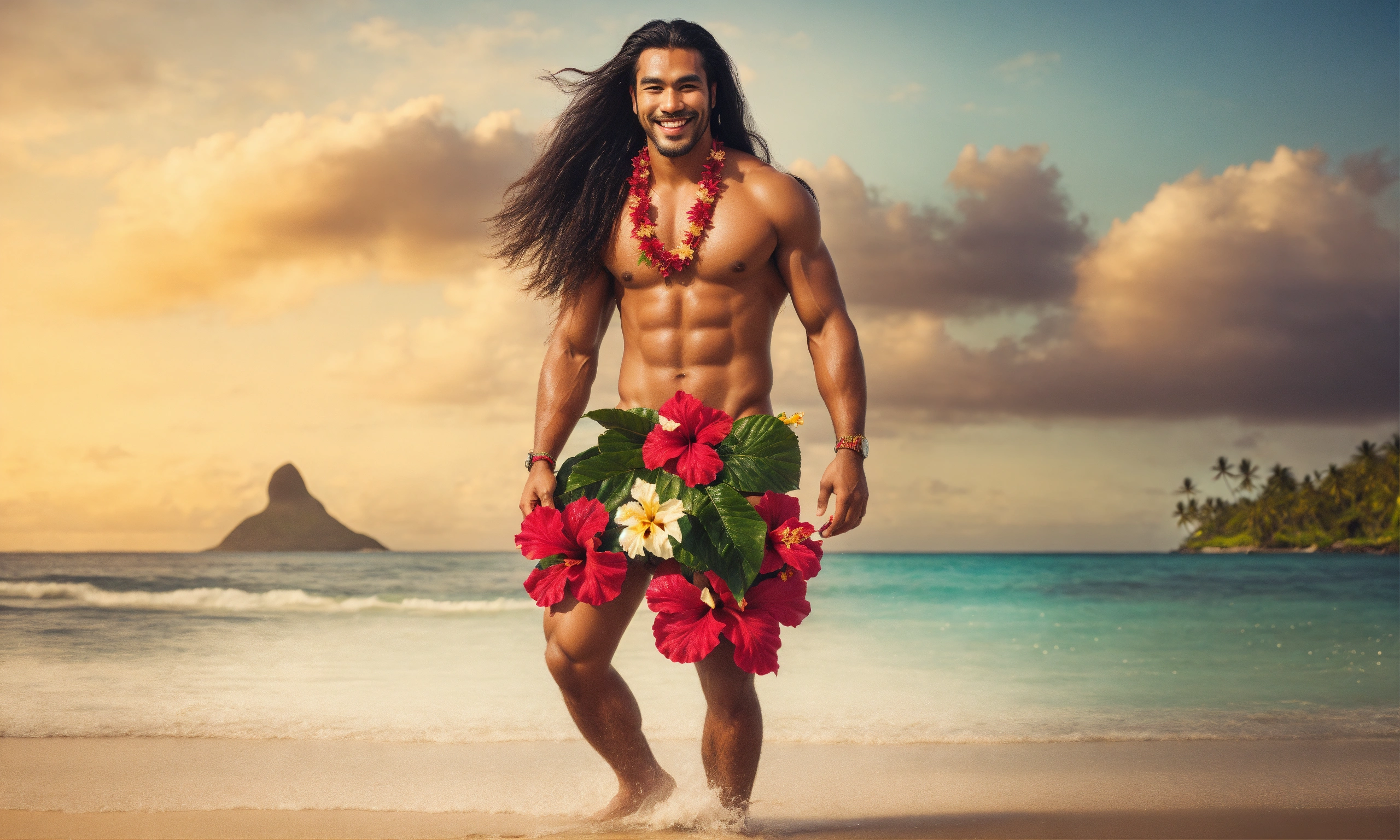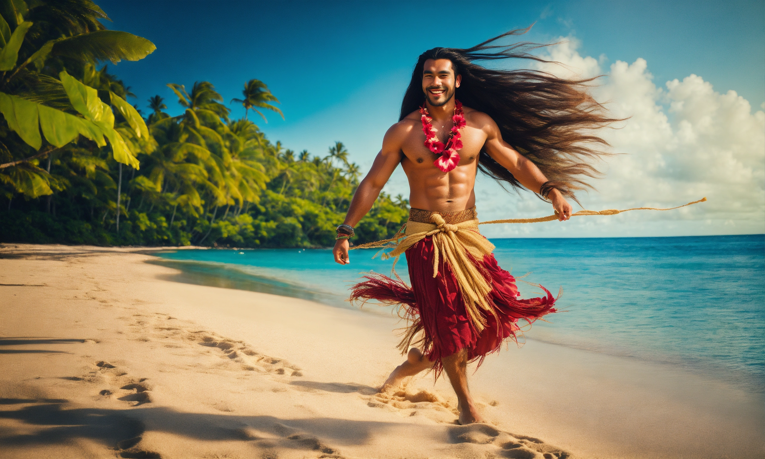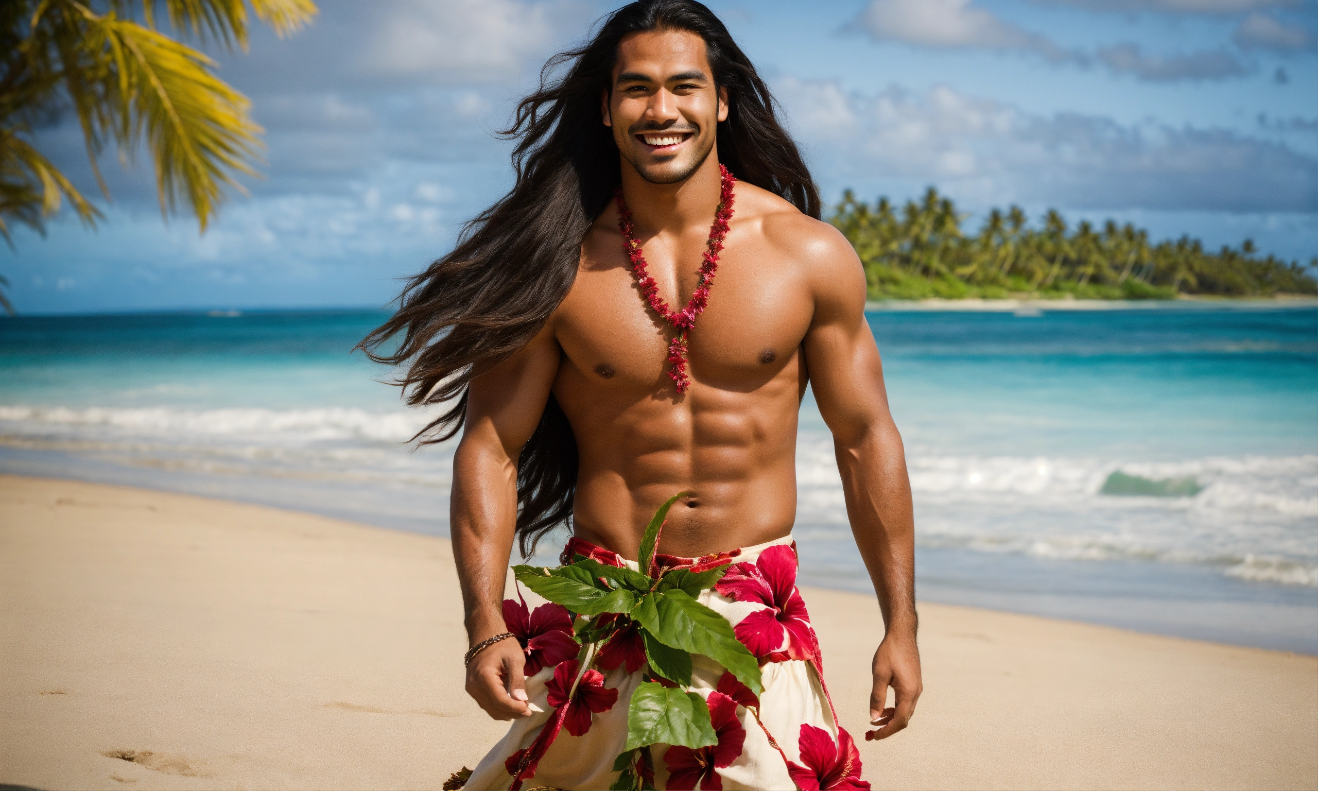 Beautiful full body polynesian men smiling with long straight hair dancing on a beach and hibiscus in the polynesian sea