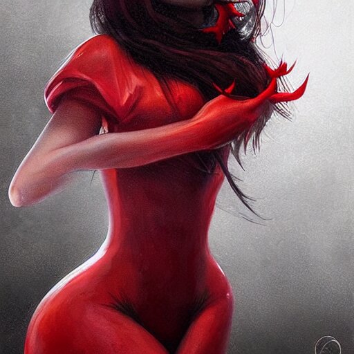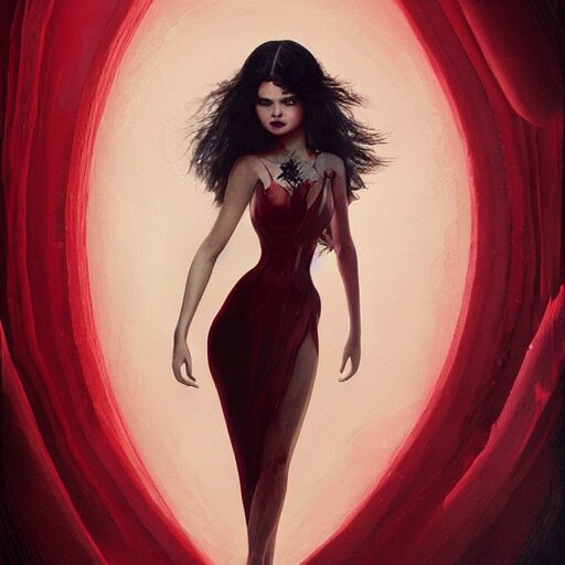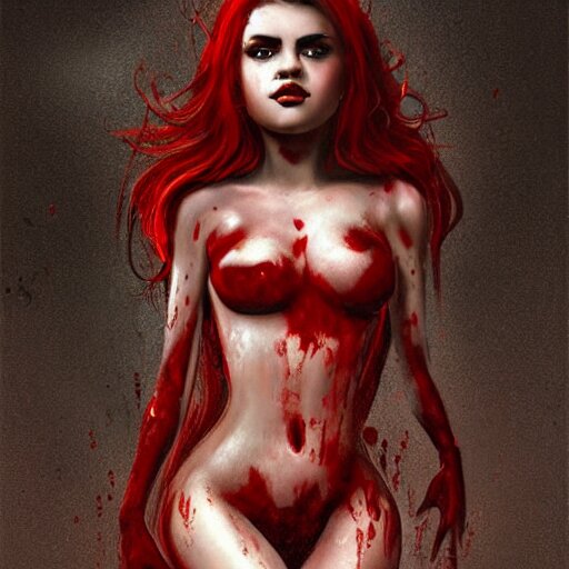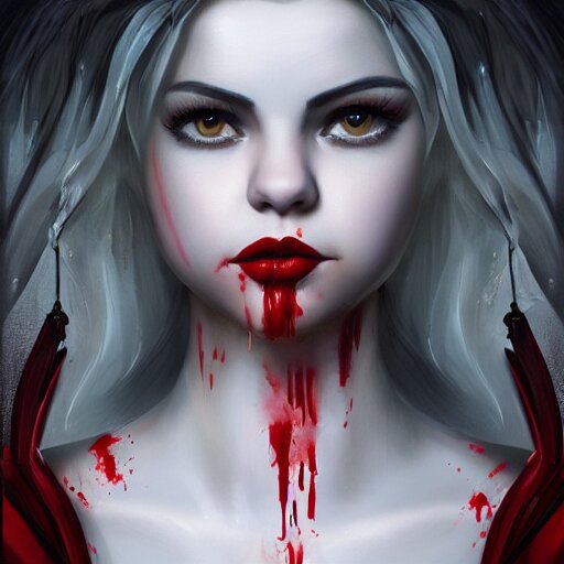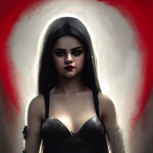 Portrait of musuclar selena gomez latex dress, blood red eyes, vampire fangs, fantasy, intricate, elegant, highly detailed, digital painting, artstation, concept art, matte, sharp focus, illustration, octane render, unreal engine, art by aenaluck and roberto ferri and greg rutkowski, epic fantasy, digital painting