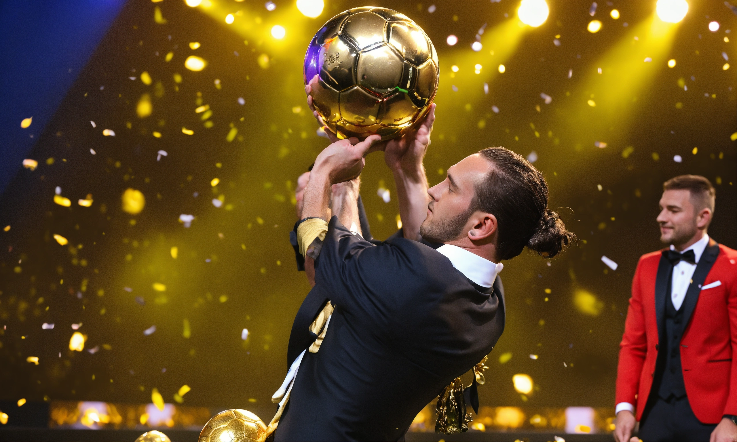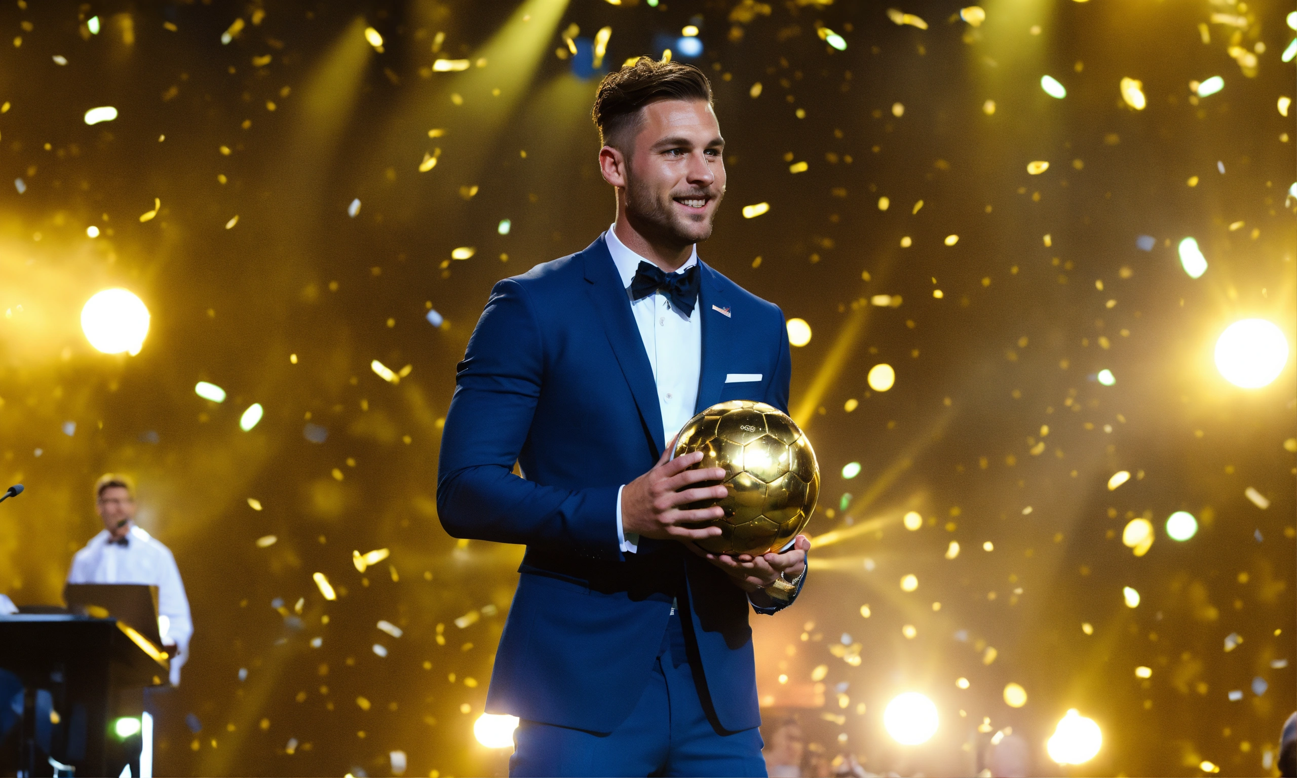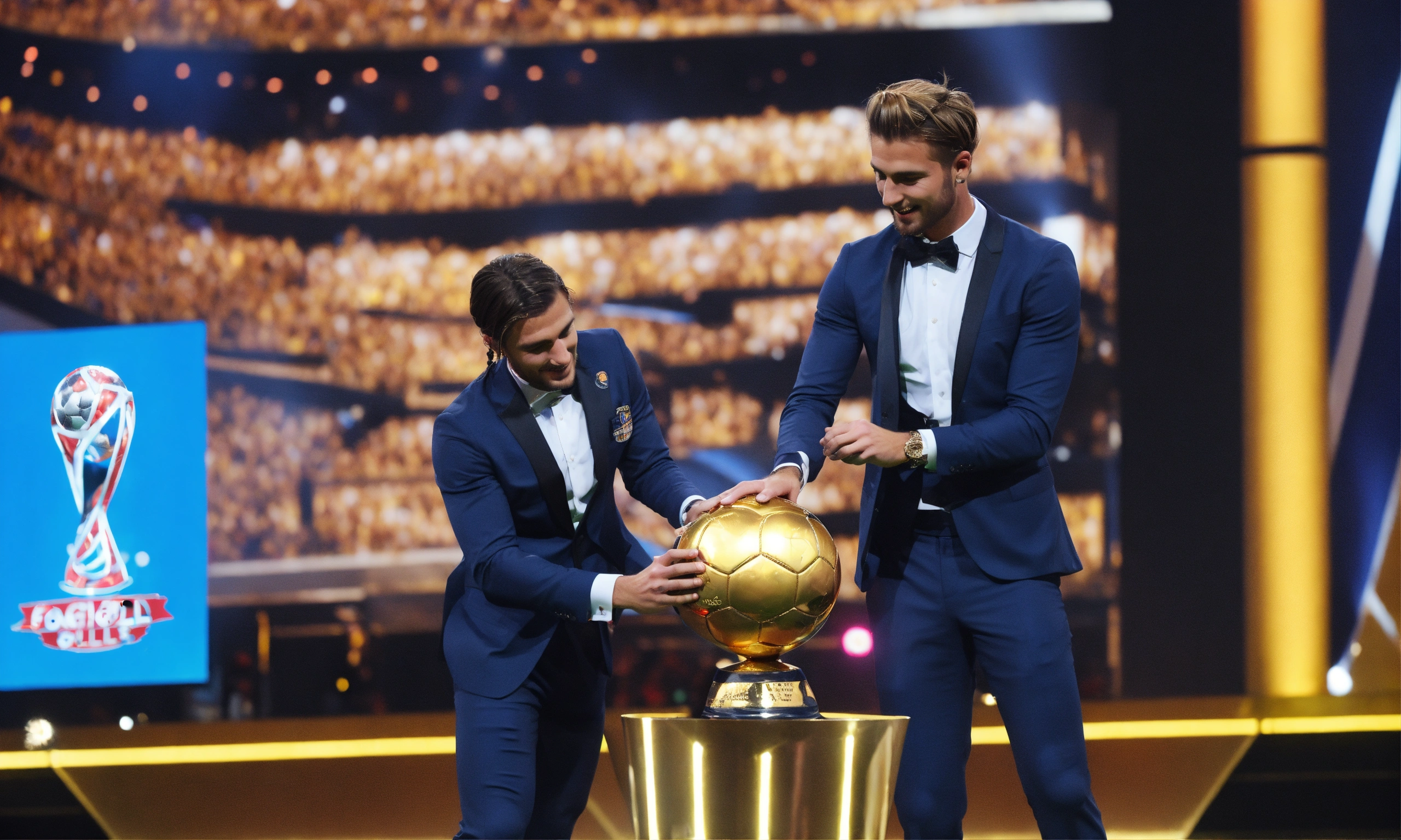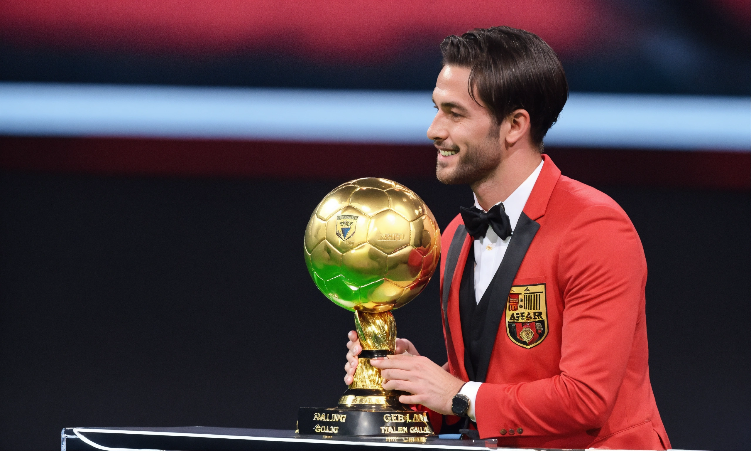 Awarding the golden ball to the best football player, on stage, half of the body is visible, a cute man in a suit, ling hair tied in a pigtail, german man
