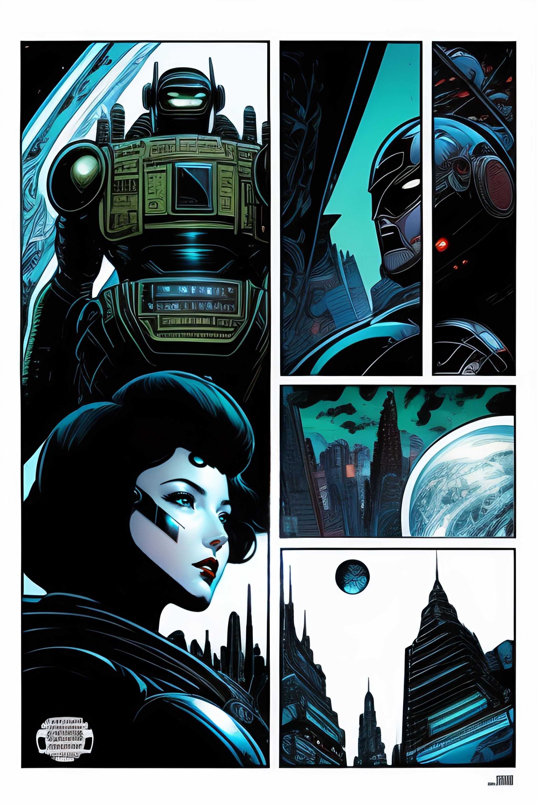 A comic book panel about robots taking over the world, detailed comic art. comic book cover art. photorealistic ink art. techno sci fi. maximalist