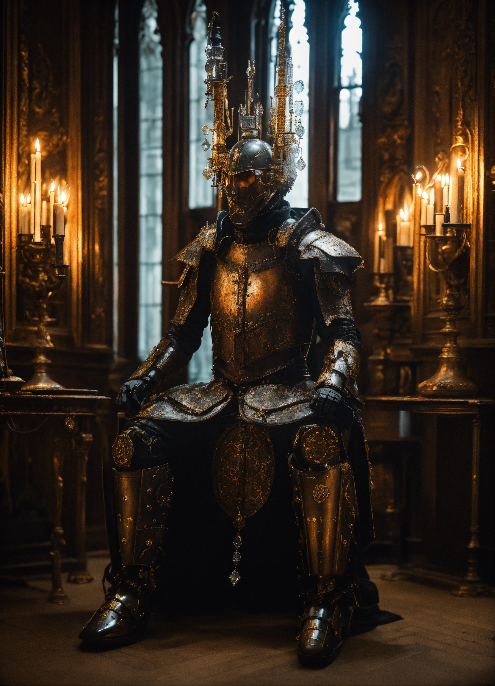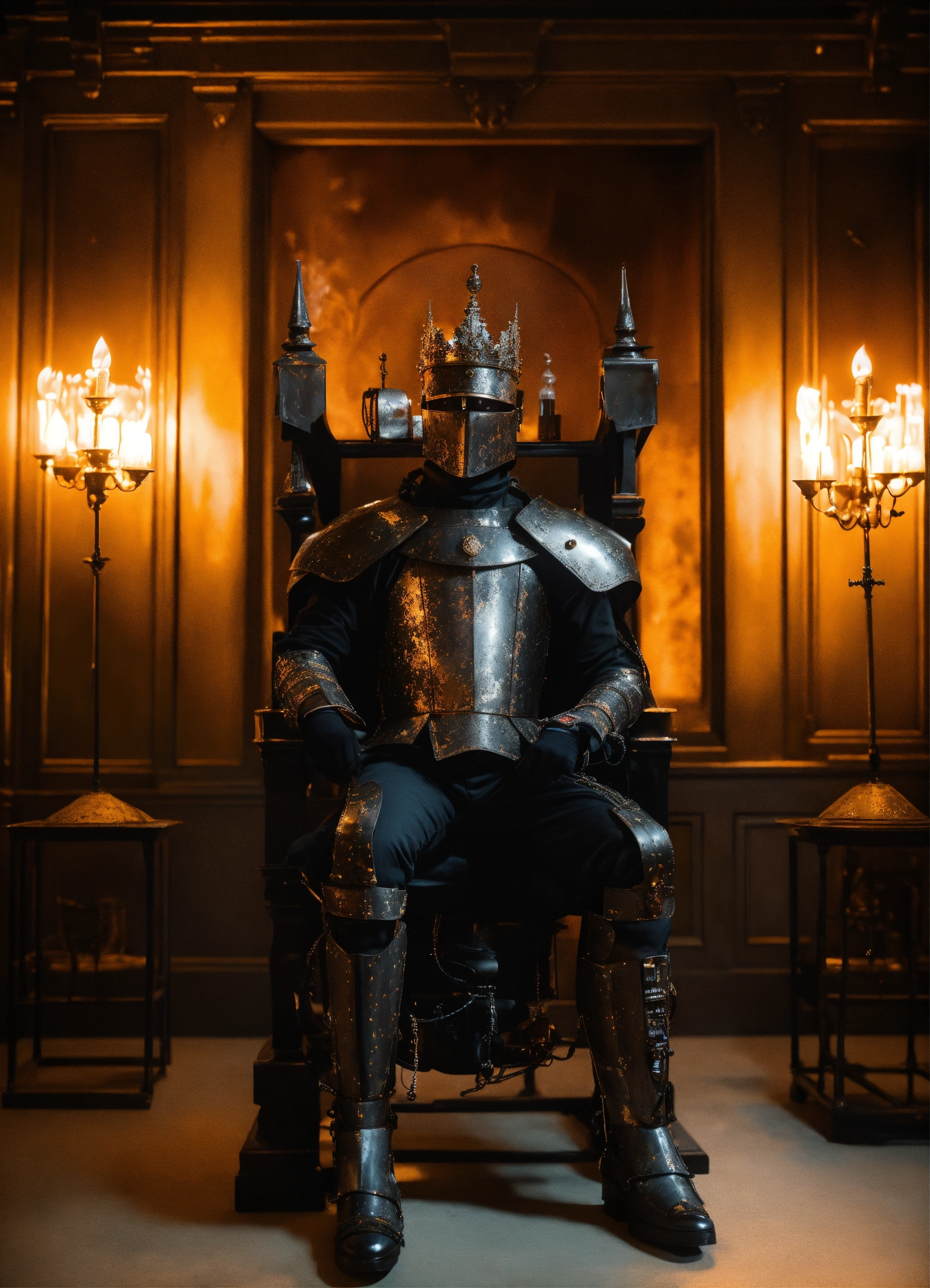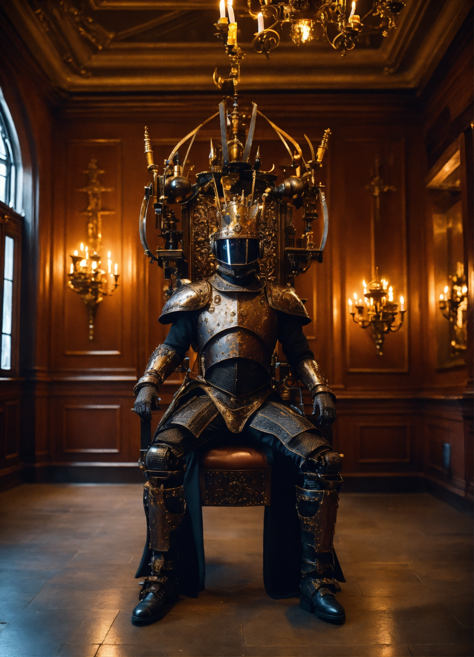 An ultrarrealistic photograph of a futuristic full body medieval king style power suit, made of black mate rusted metal and polymer, full crystal hull, for a man, visible wires, sitting in a throne, a fireplace, two robot dogs, imposing, modern minimalism, elegant, dystopia, mysterious, godlike, scary, in a victorian era large room whit candle lights, 8k
