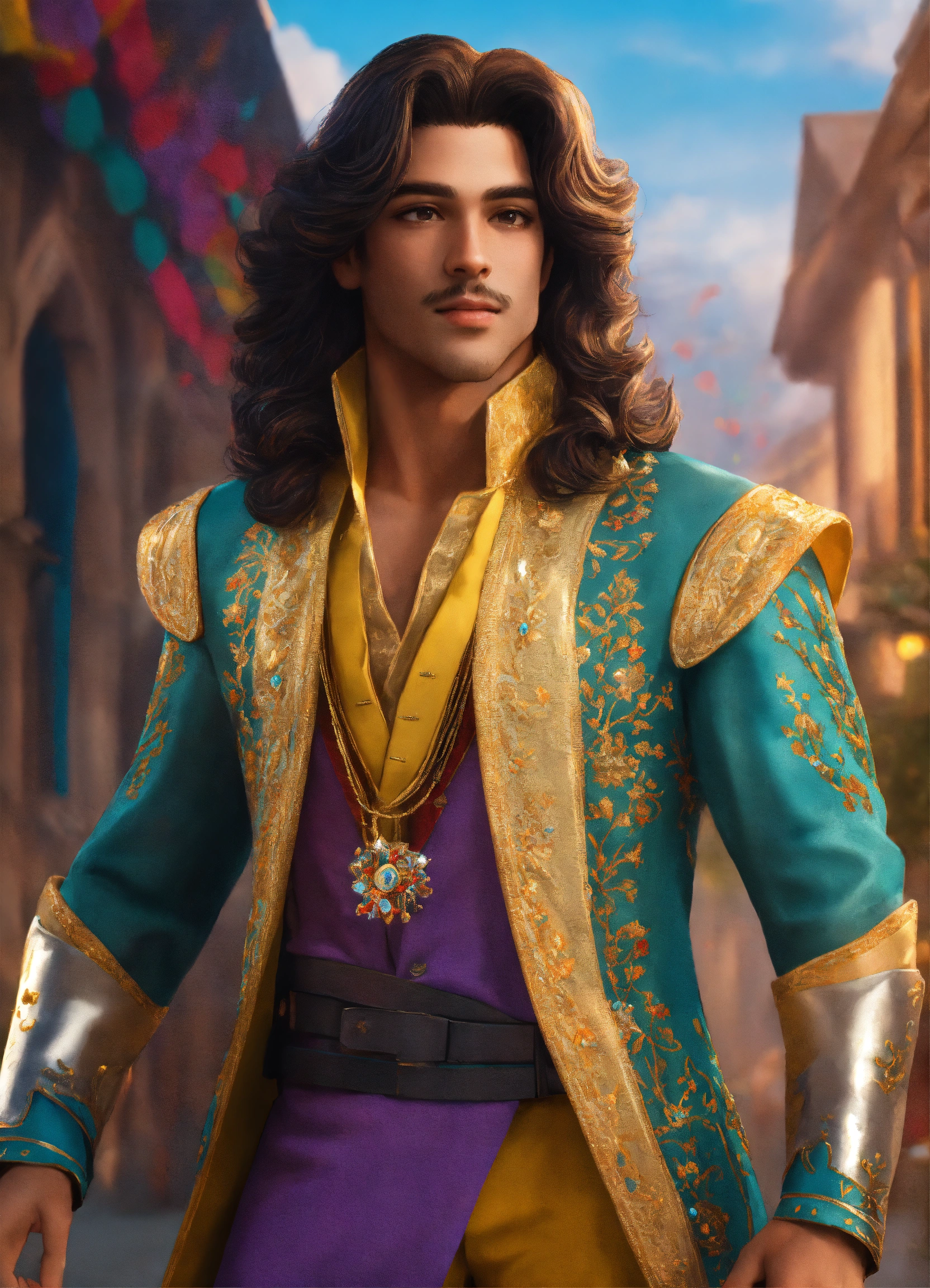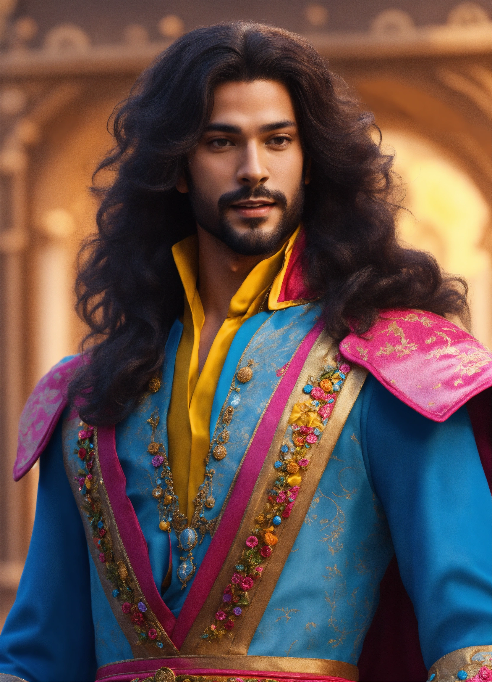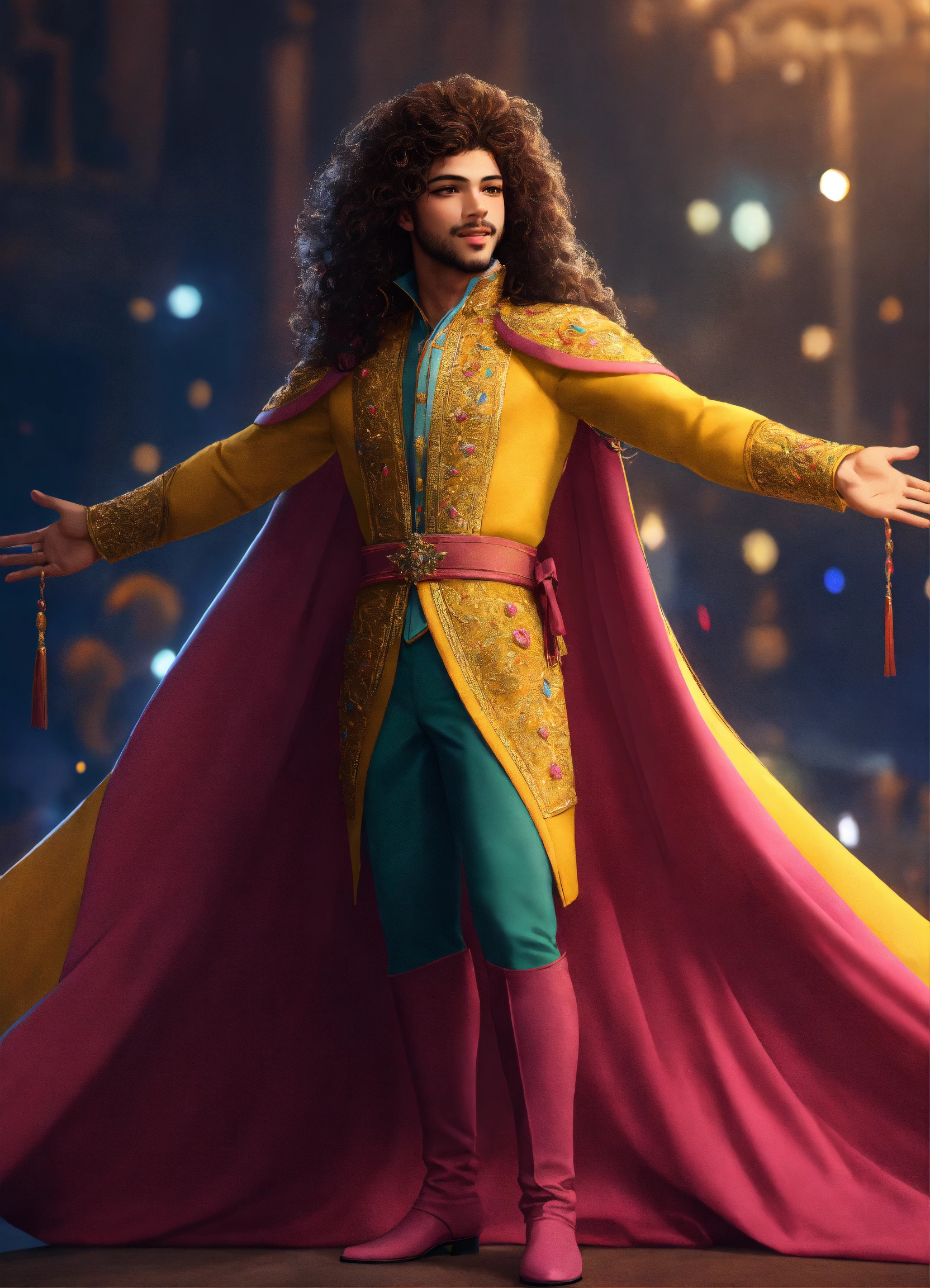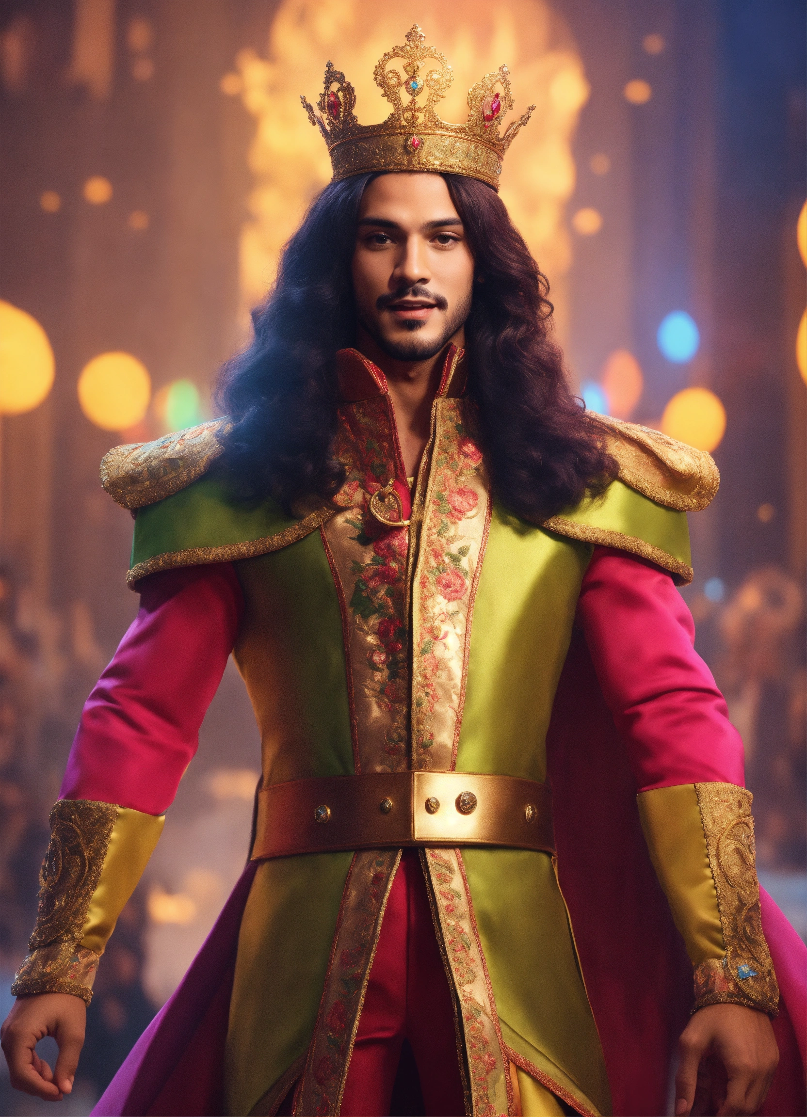 Modern prince with arms raised cheerful colors full dress and full body very realistic all over all very realistic long hair 8k