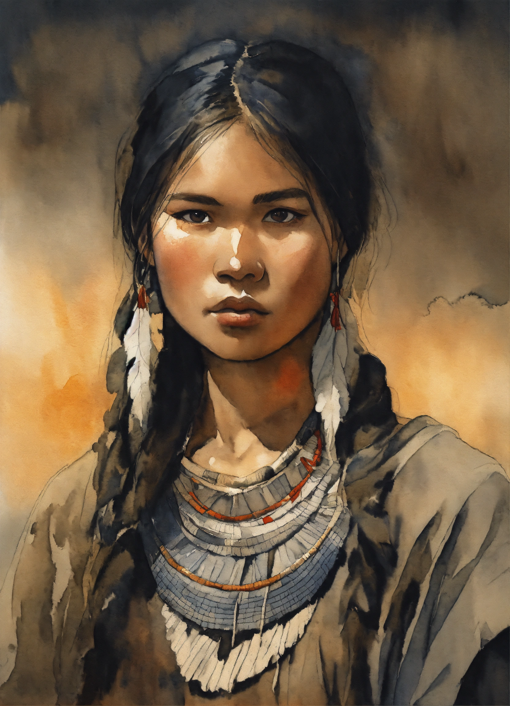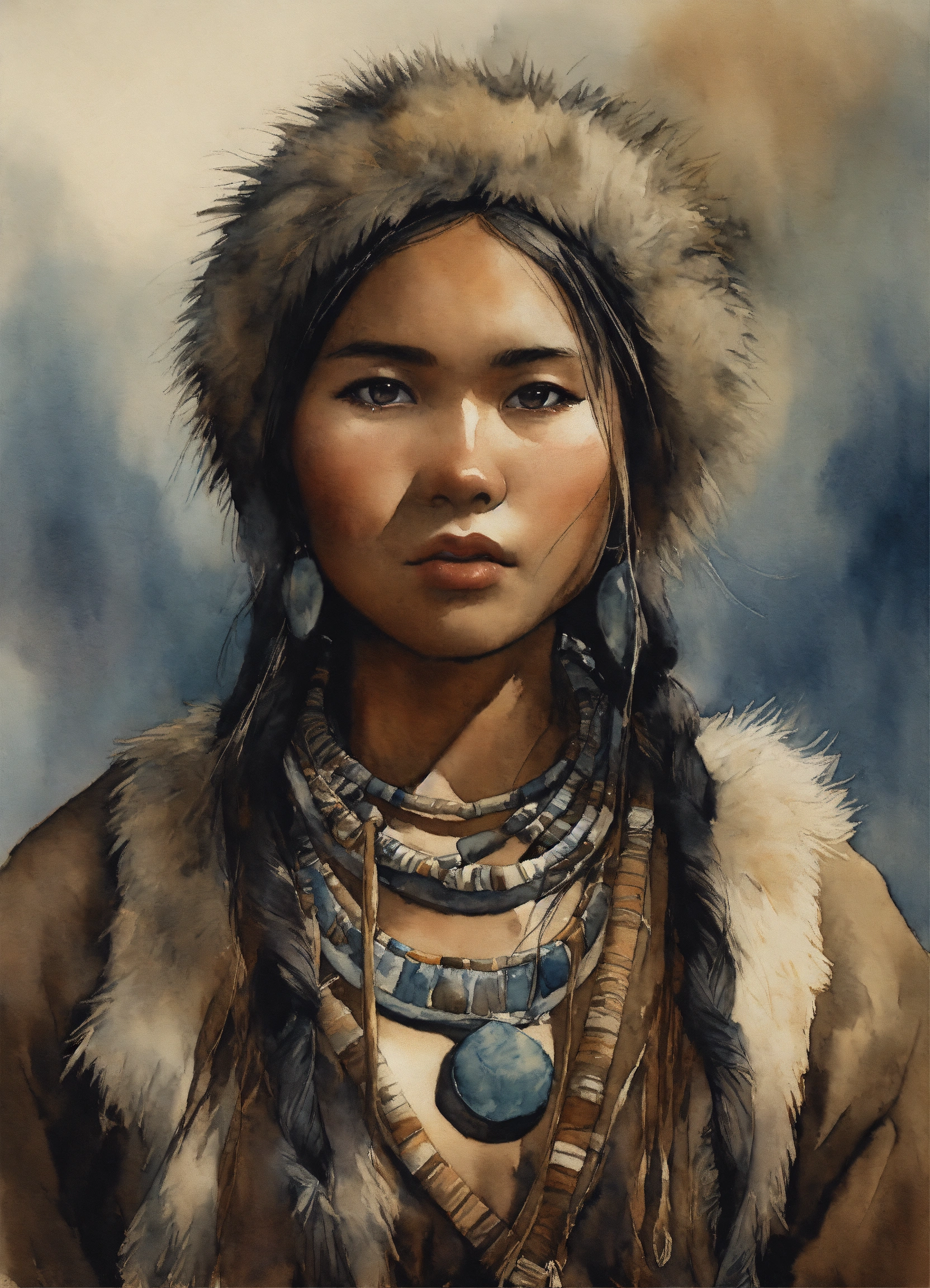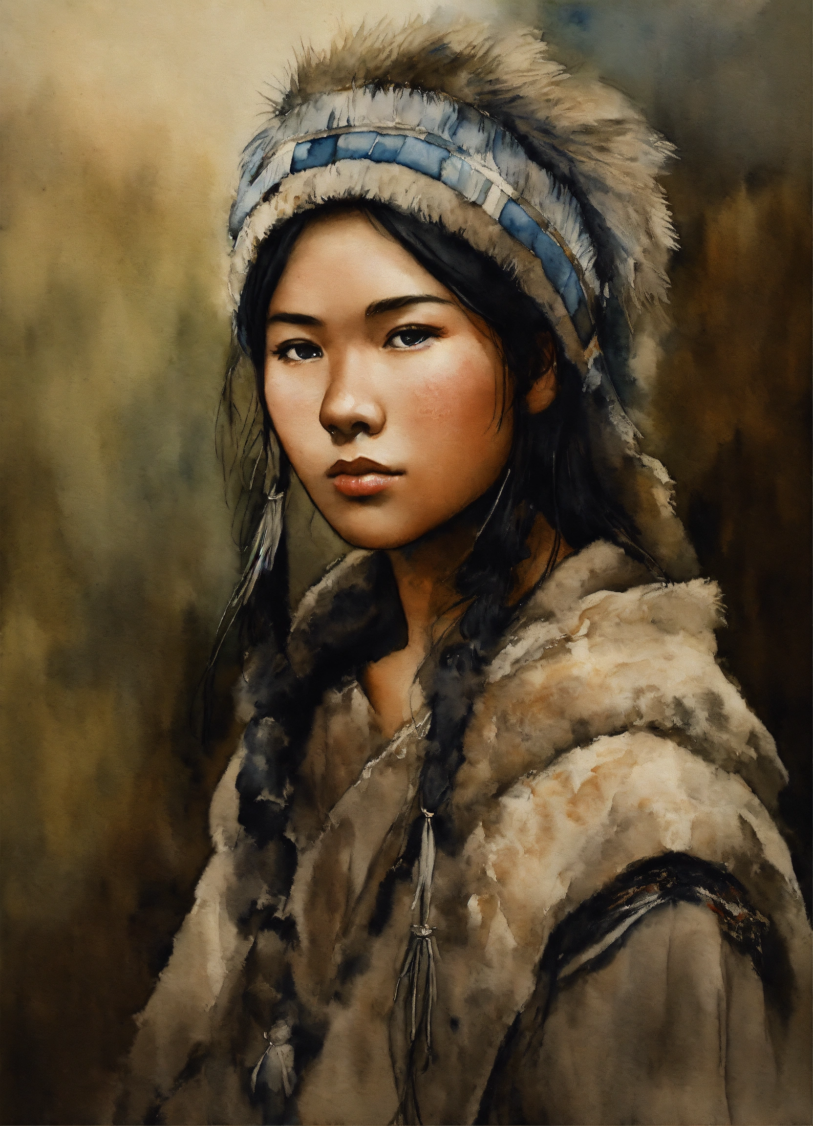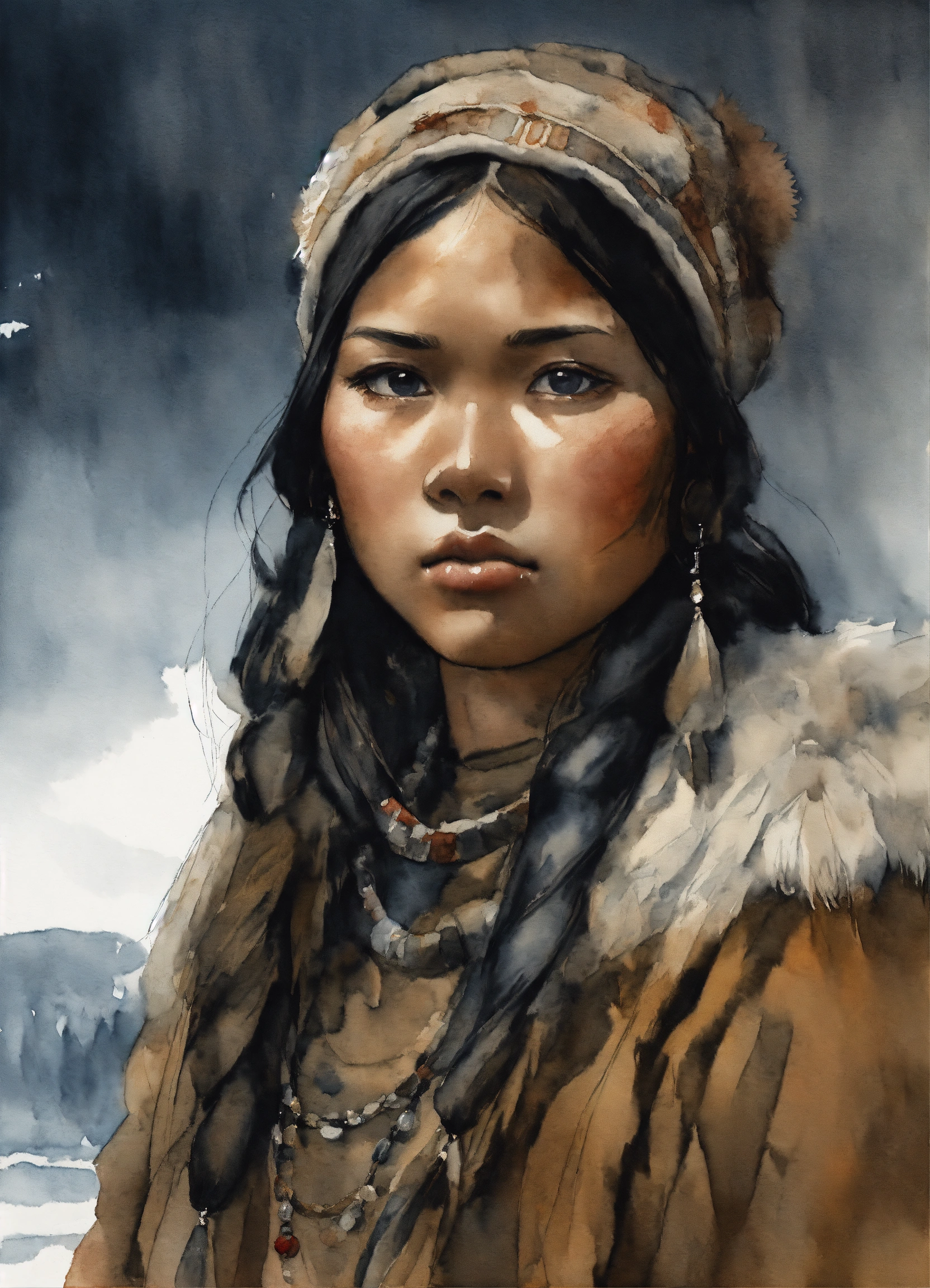 Illustration by tom björklund of a siberian "aboriginal" young woman wearing arctic paleolithic clothing. she has asian phenotype. watercolor painting by tom björklund, dark hues, gloomy and depressing, masterpiece.