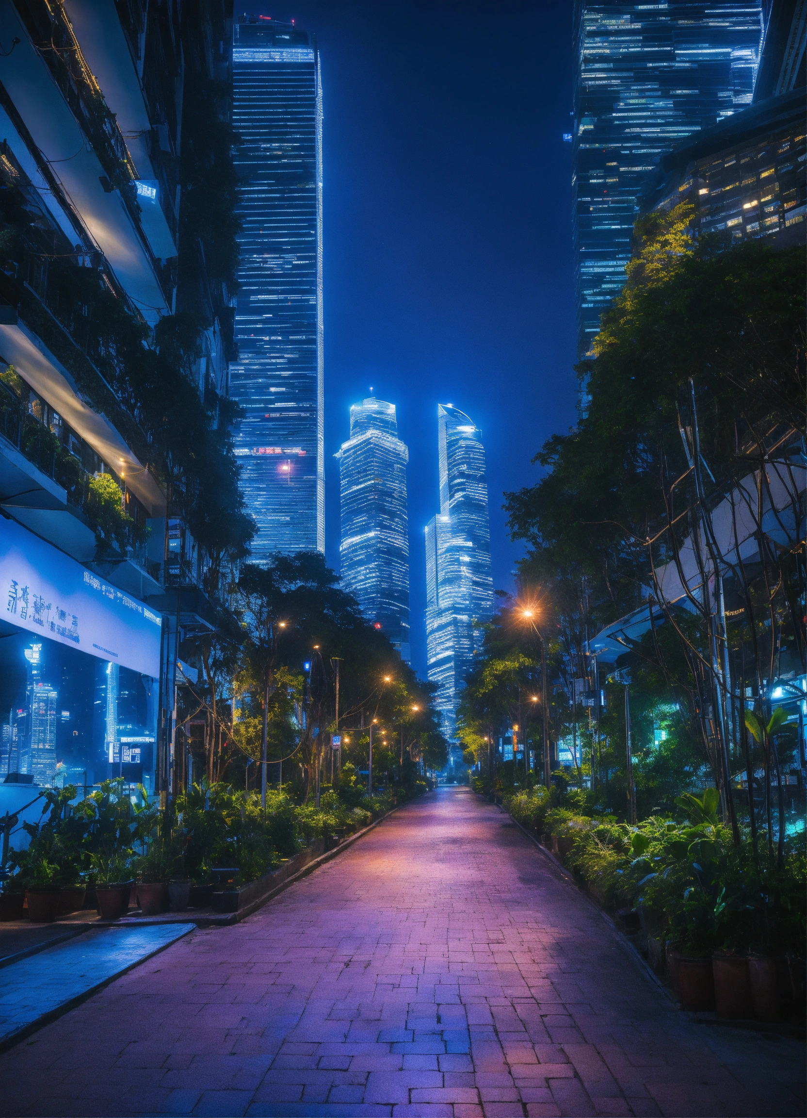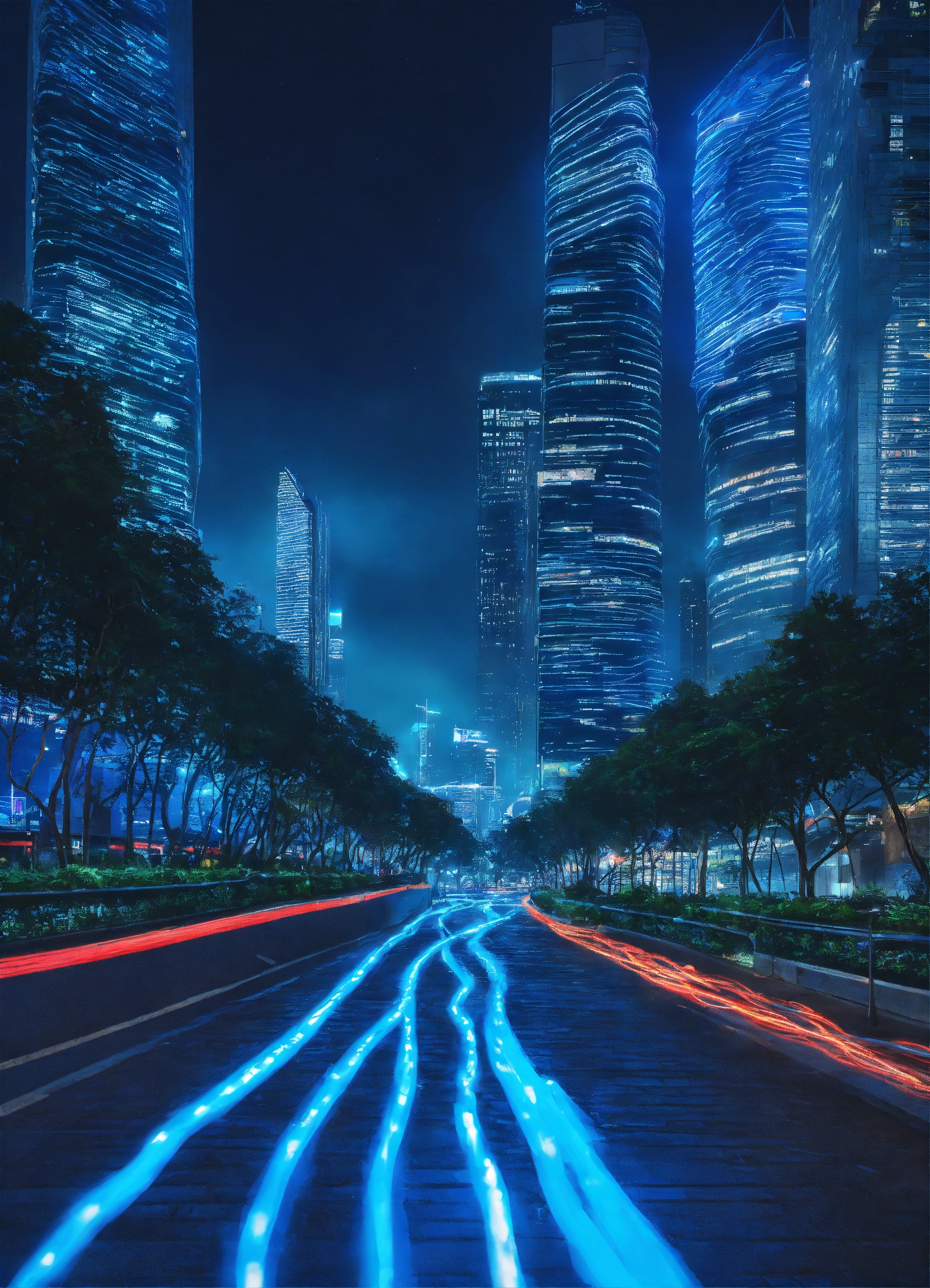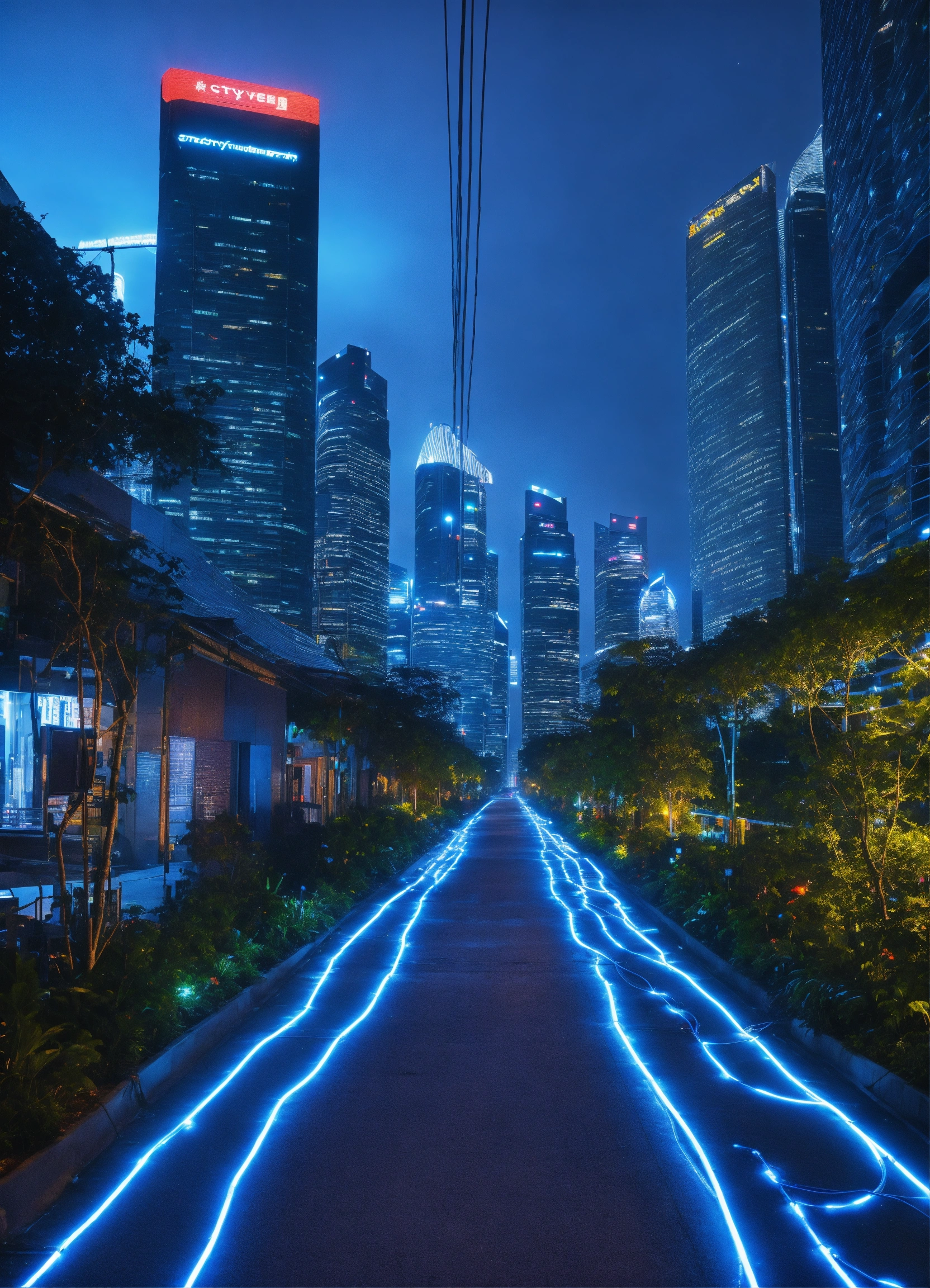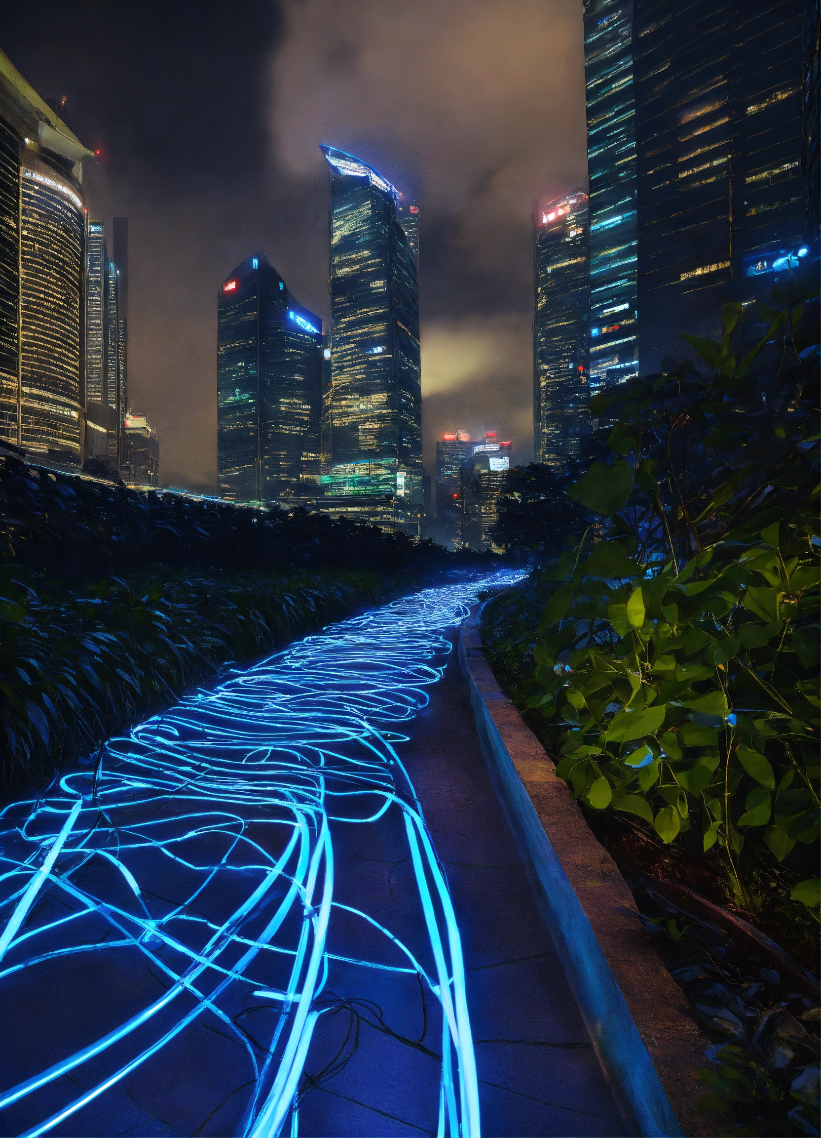 City path in dark futurist eco singapour street surrounded by skycrapper, blue light wire glowing in the night floating in the air, multiple angle