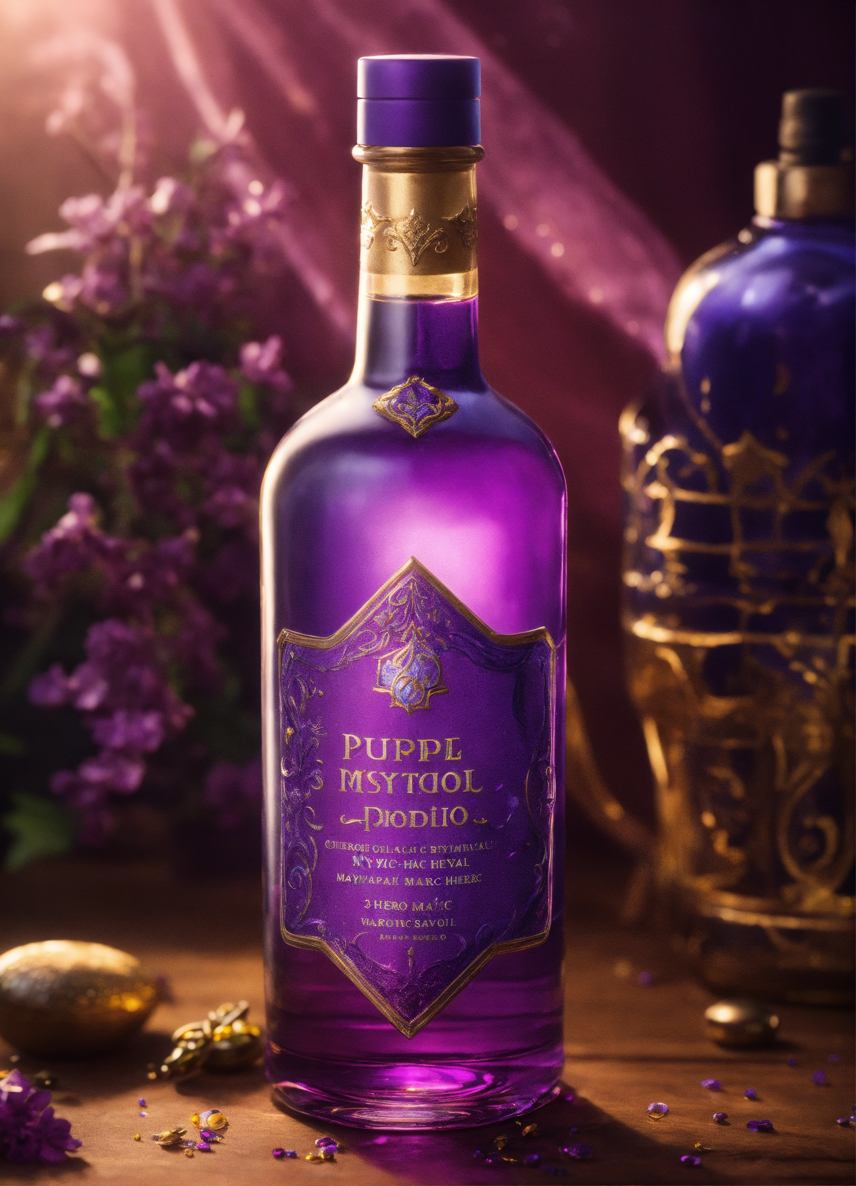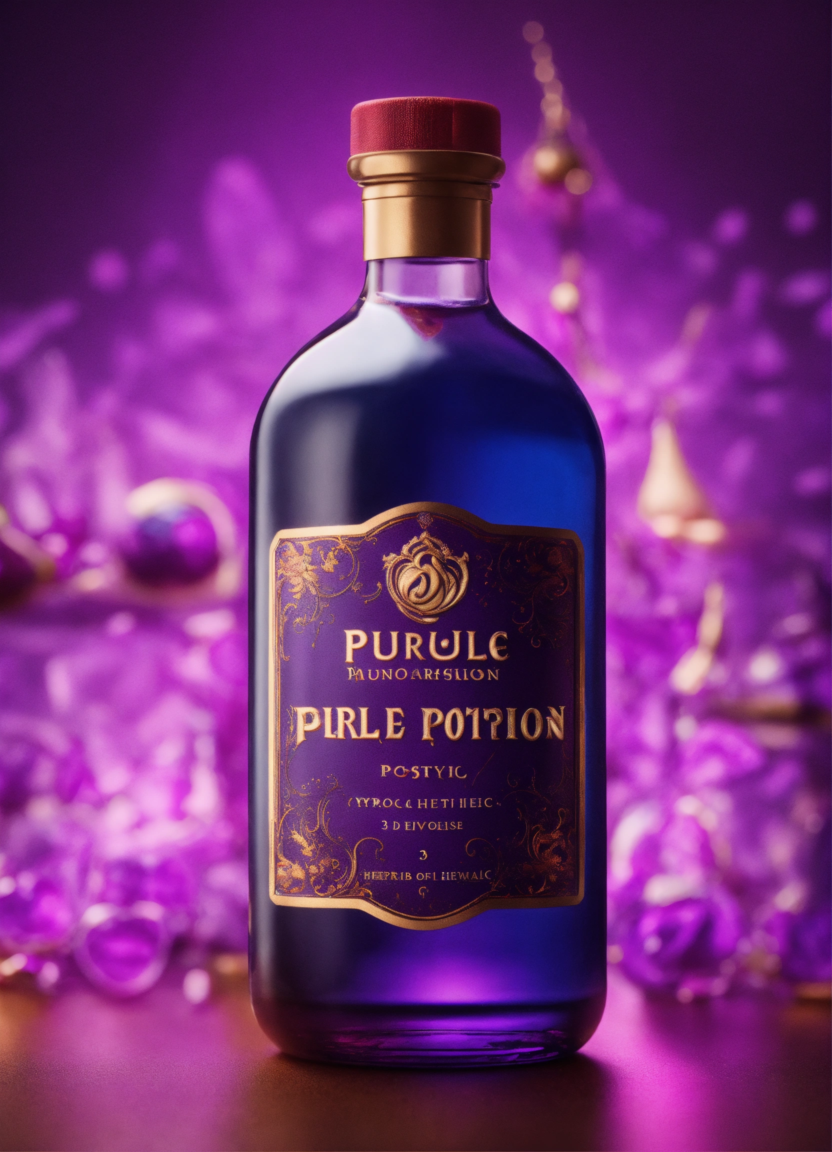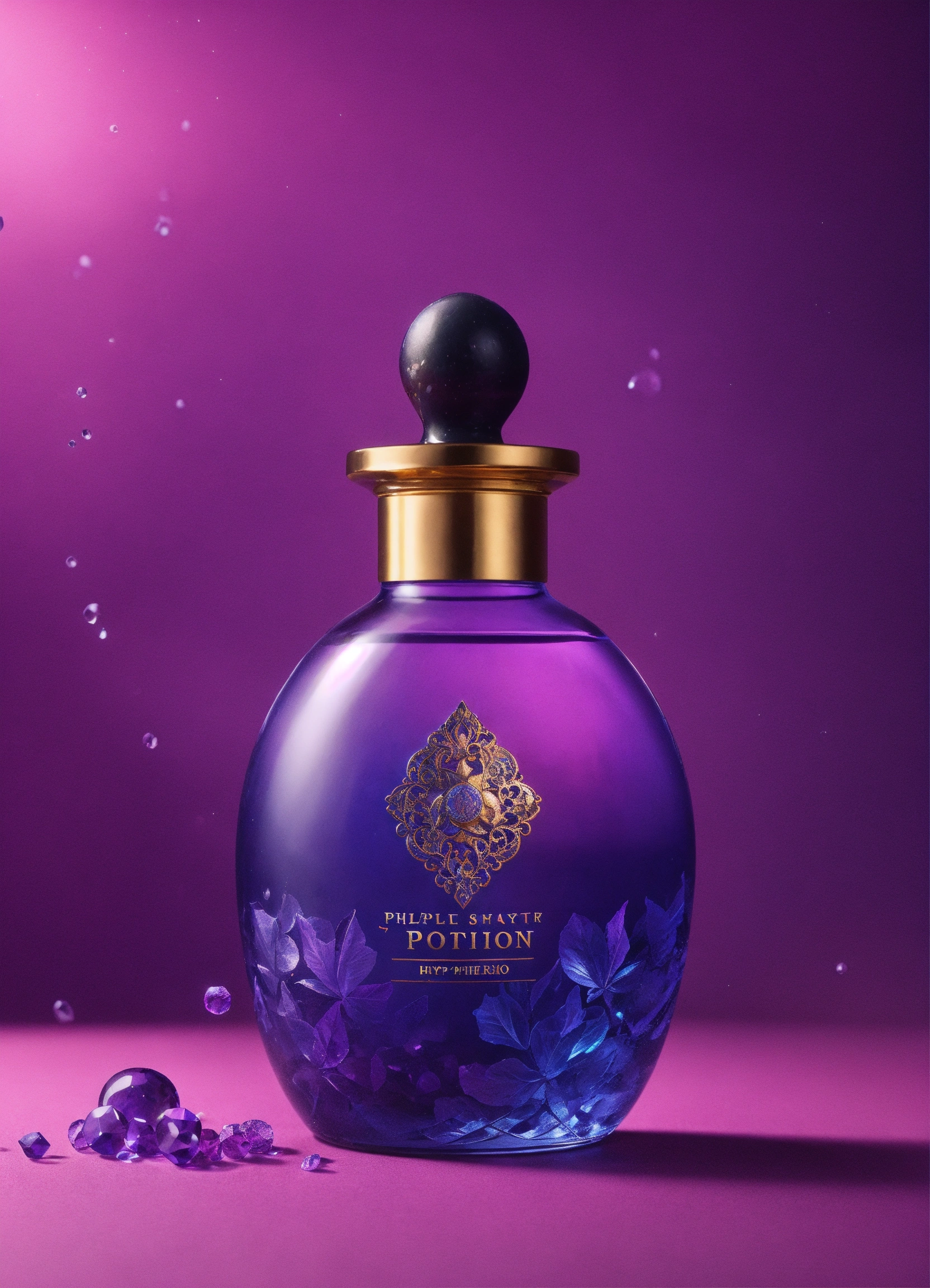 Hyper-realistic 3d image of a purple mystic potion in a product hero shot
