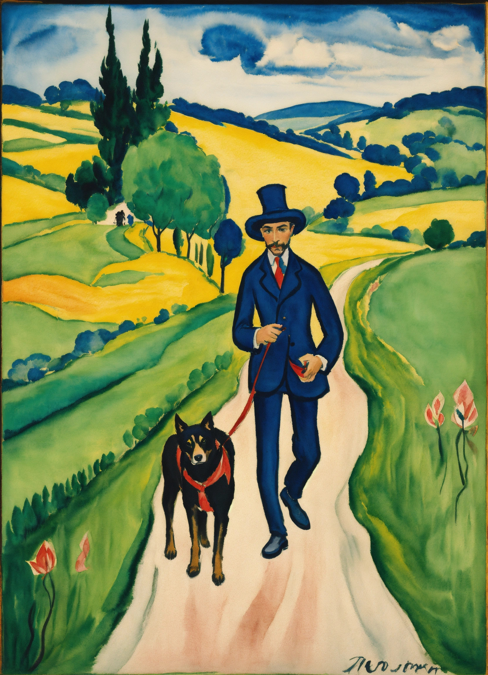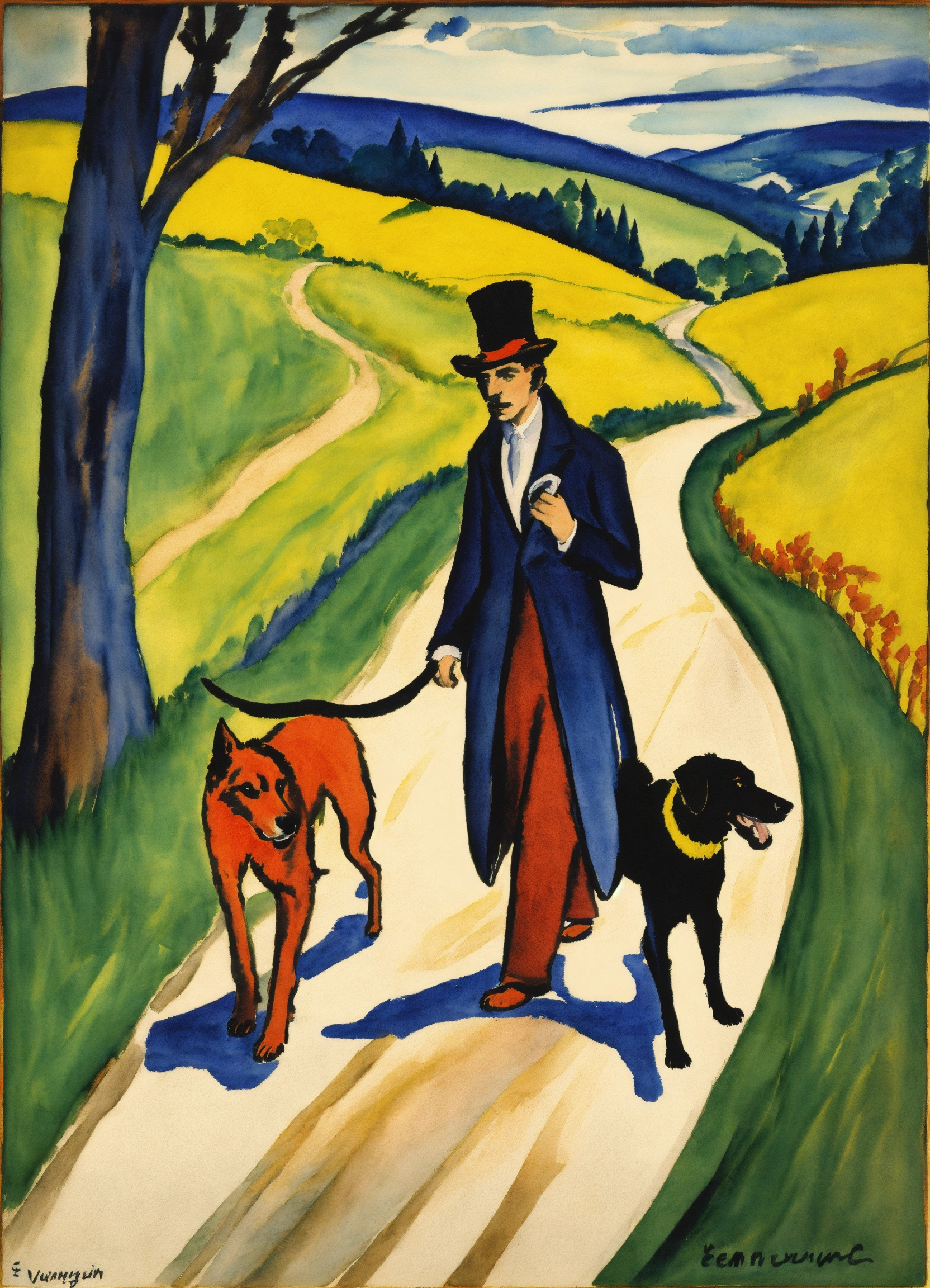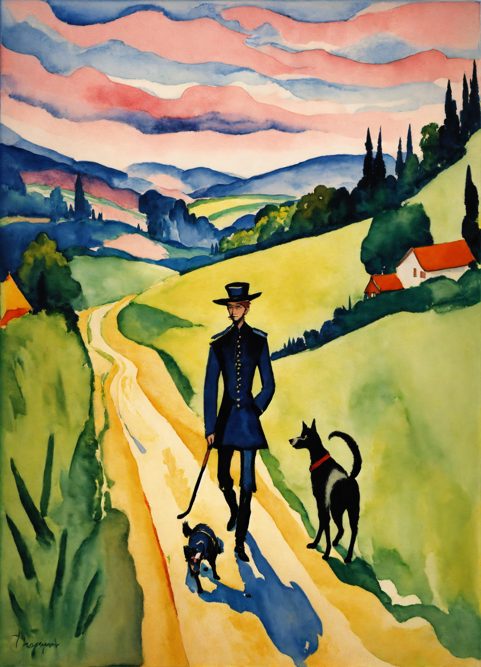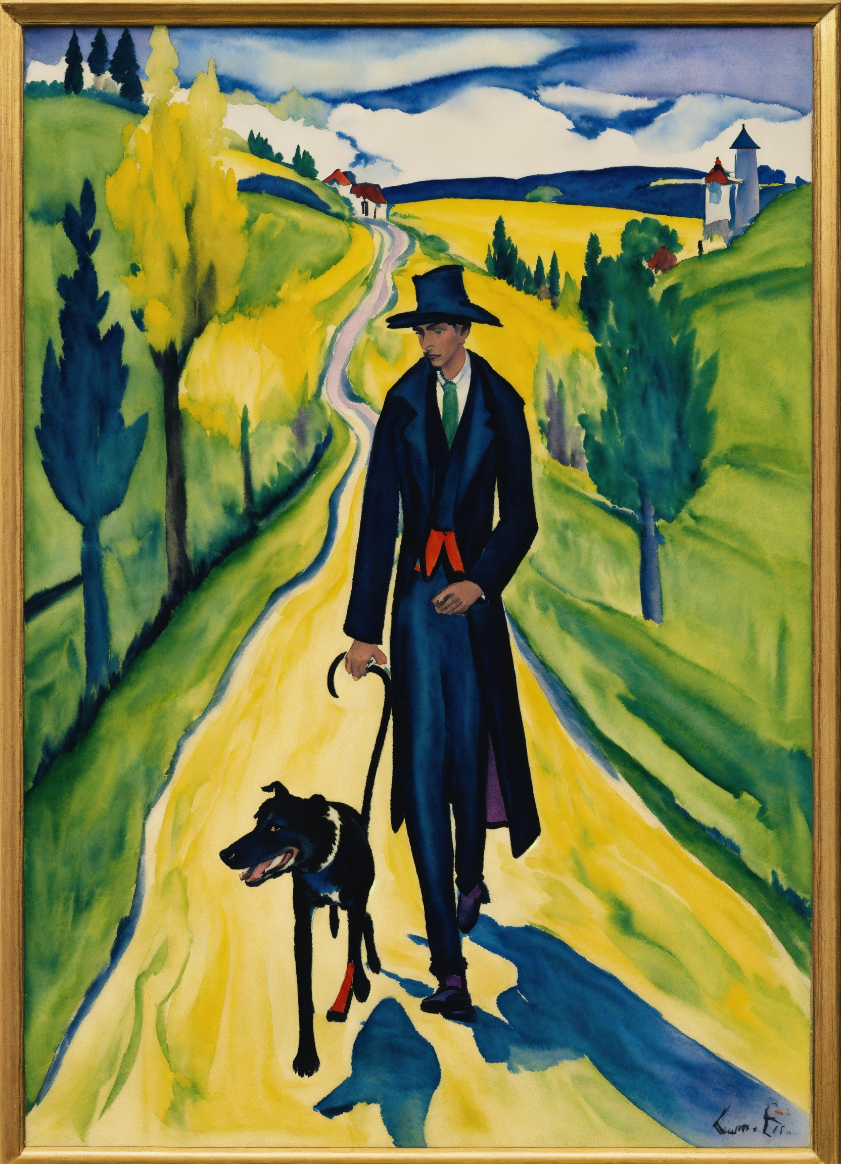 Ernst ludwig kirchner peinture, aquarelle, a vagabon walking with his dog on a country road representation of the fool card, in the tarot.