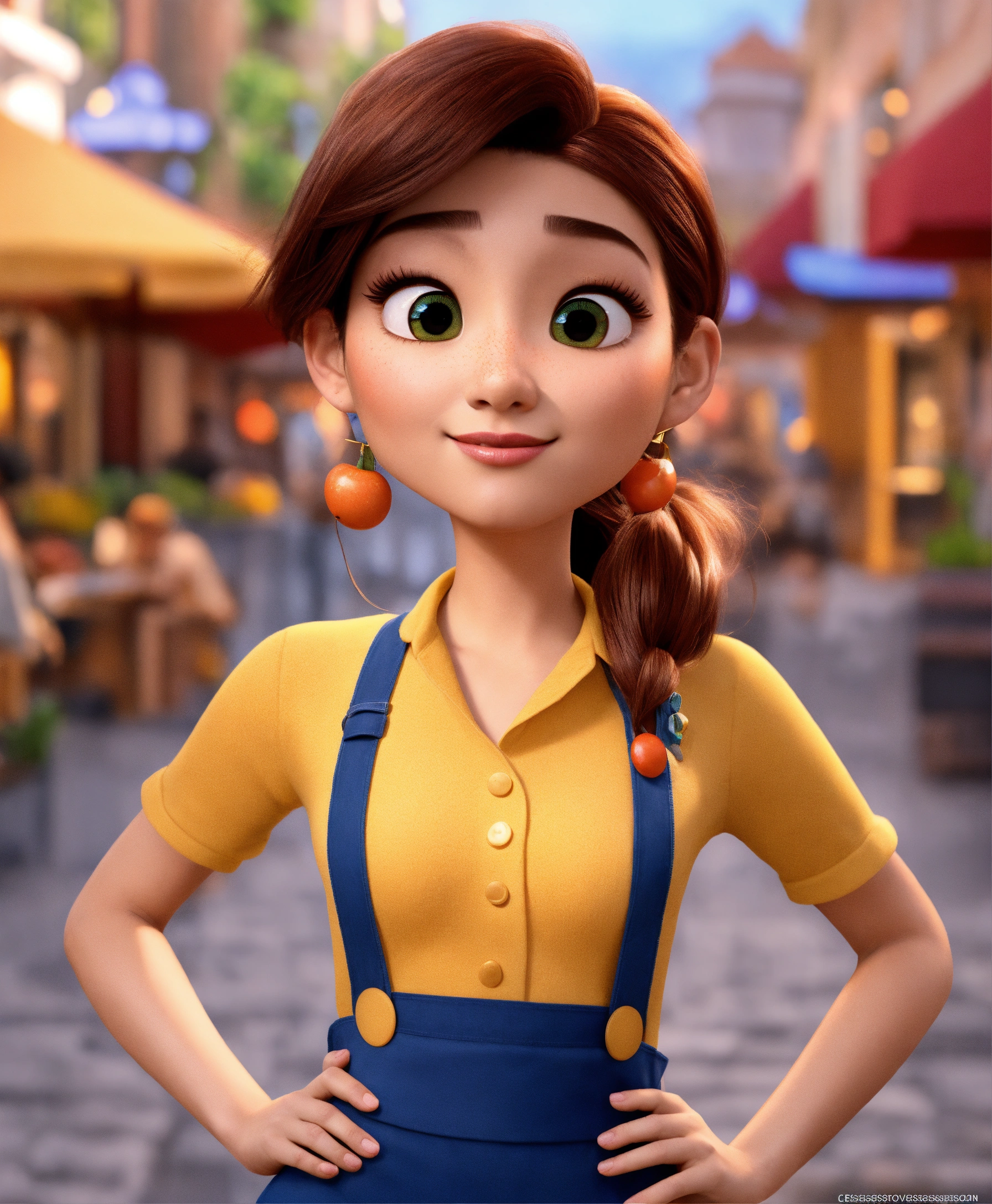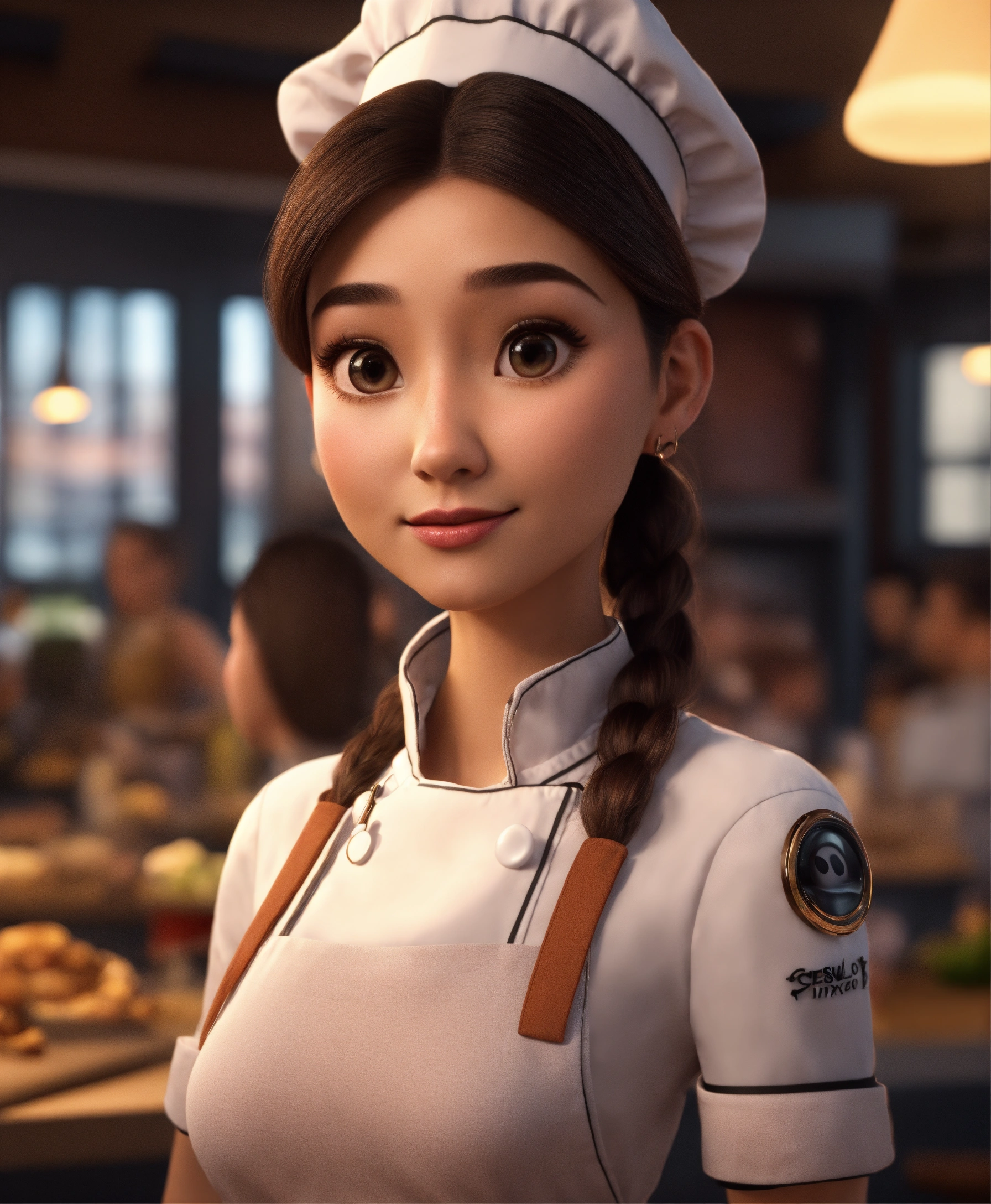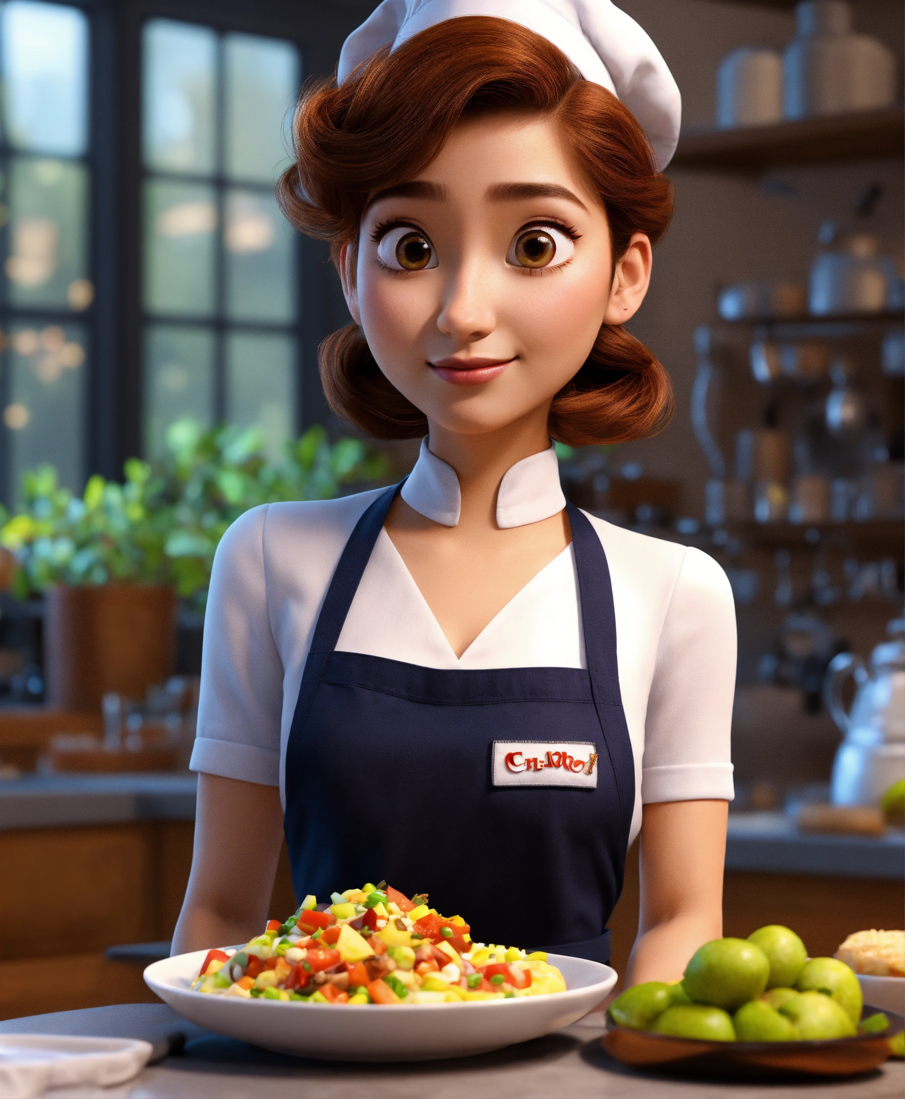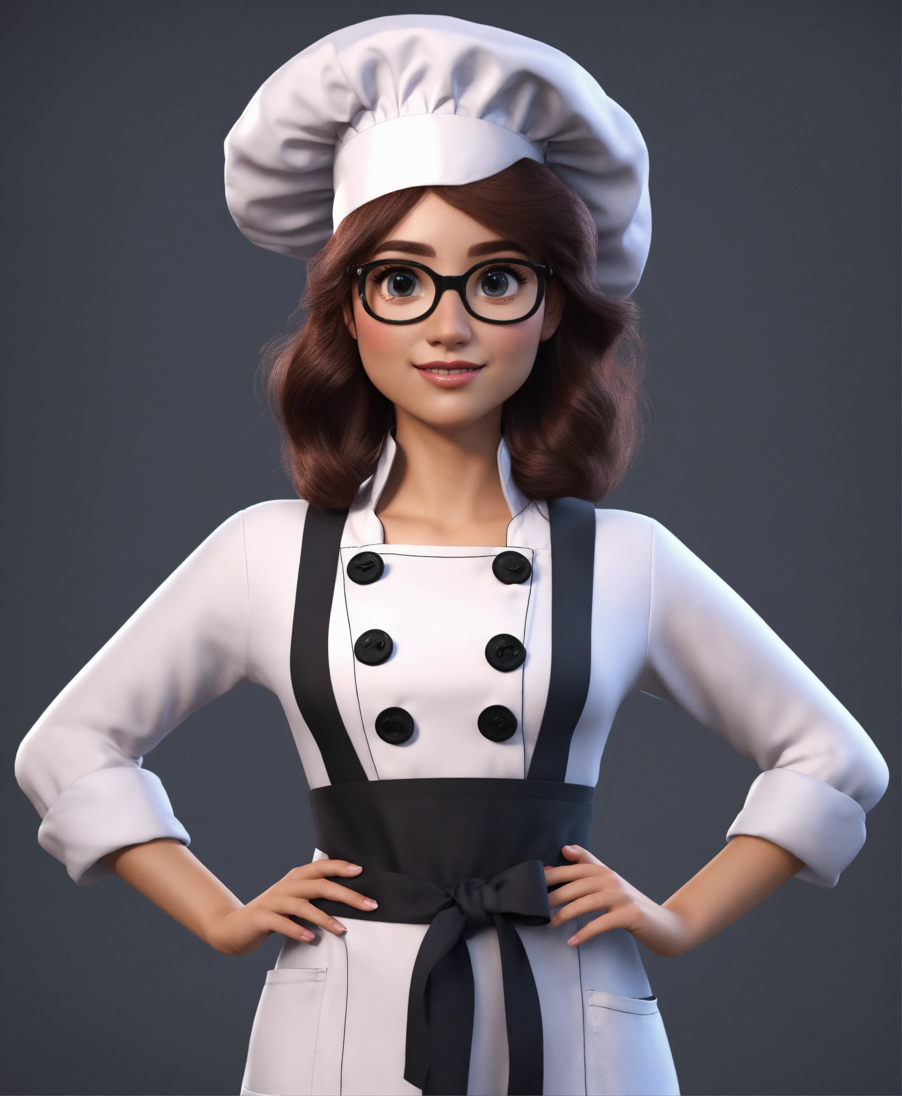 Linda chica, estilo pixar, estilo 3d, estilo disney, 8k, hermosa, vestimenta chef, cuerpo completo, vestimenta blanca y negra, cuerpo de frente