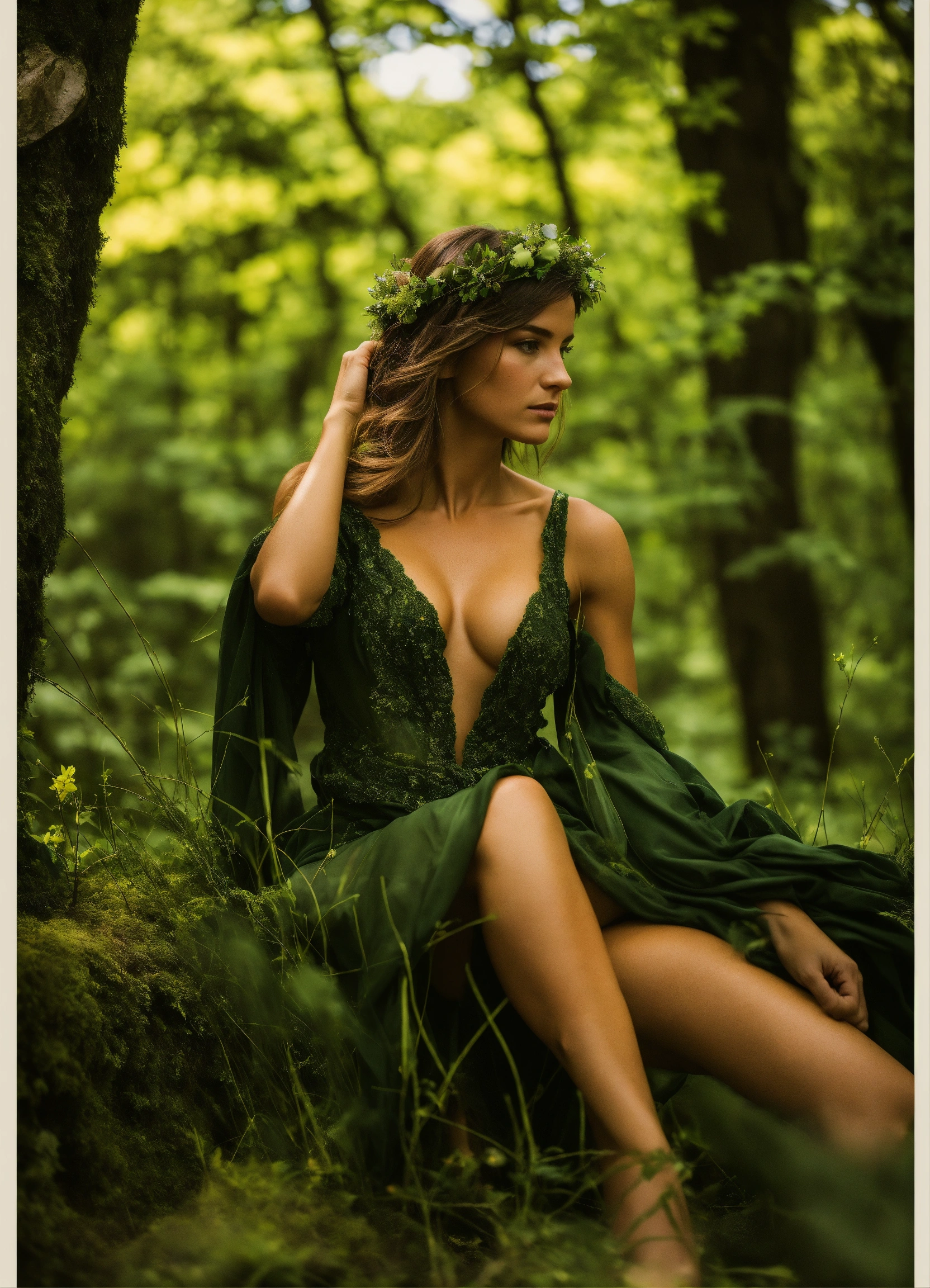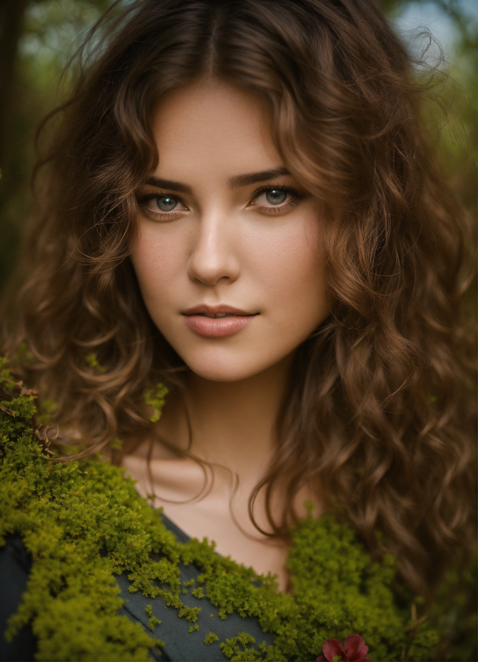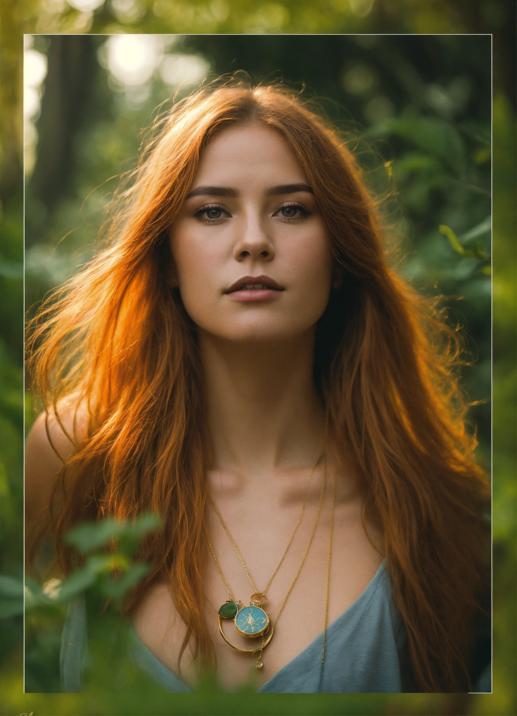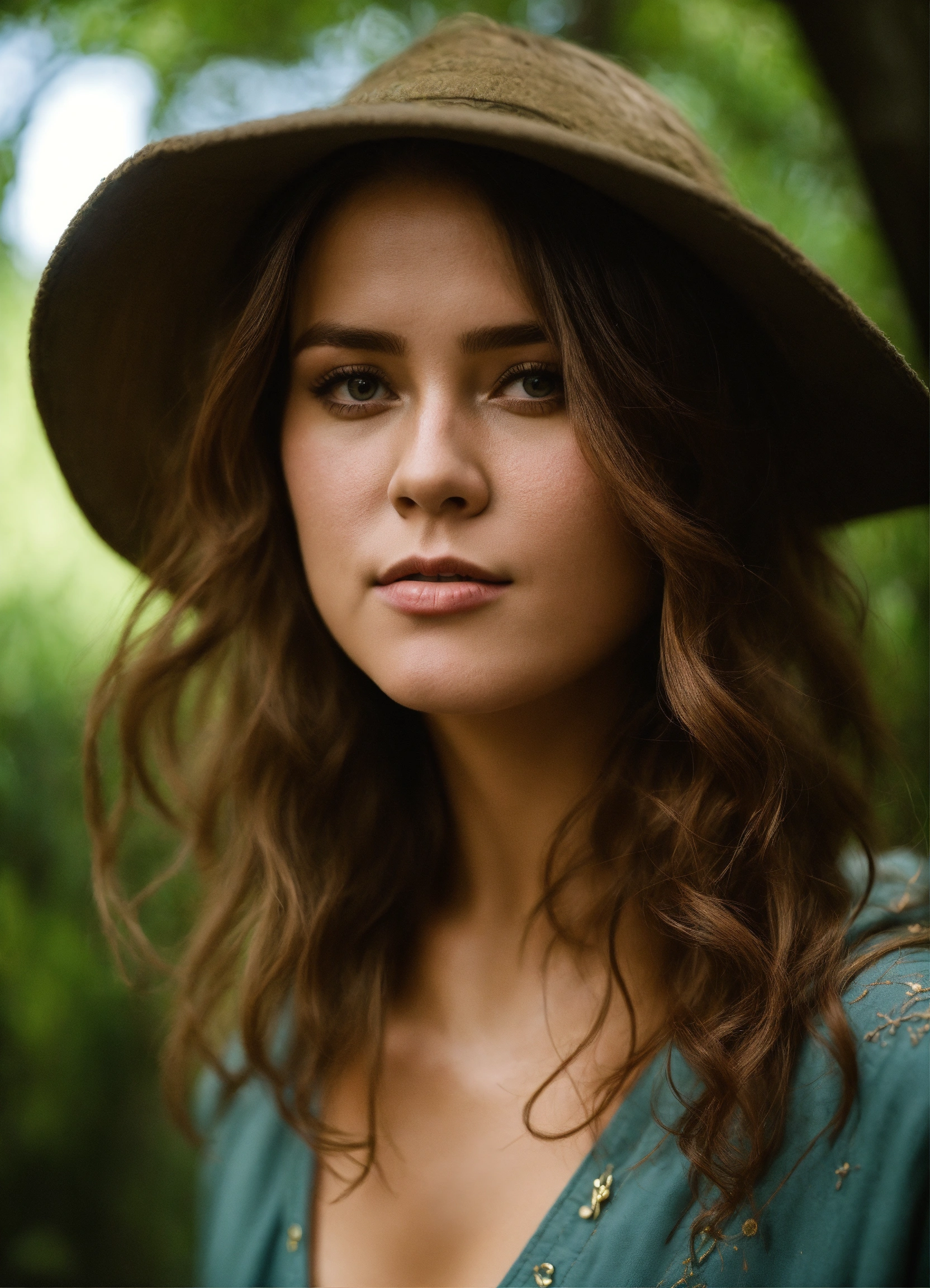 Portrait ultra réaliste d'une exploratrice passionné d'astronomie se tenant face a nous incarnés d'un film d'explorateur photographié au plan moyen, elle se sert d'un astrolabe, elle est debout au millieu d'une clairière dans la forêt entourée de beaucoup de végétations, c'est une très belle jeune femme avec un corps muscles et une très belle silhouette, elle est est vêtue d'une tenue d'exploratrice verte kaki au décolleté plongeant et ses cheveux sont châtain foncée et un peu ondulée, elle regarde le photographe avec un regard déterminés