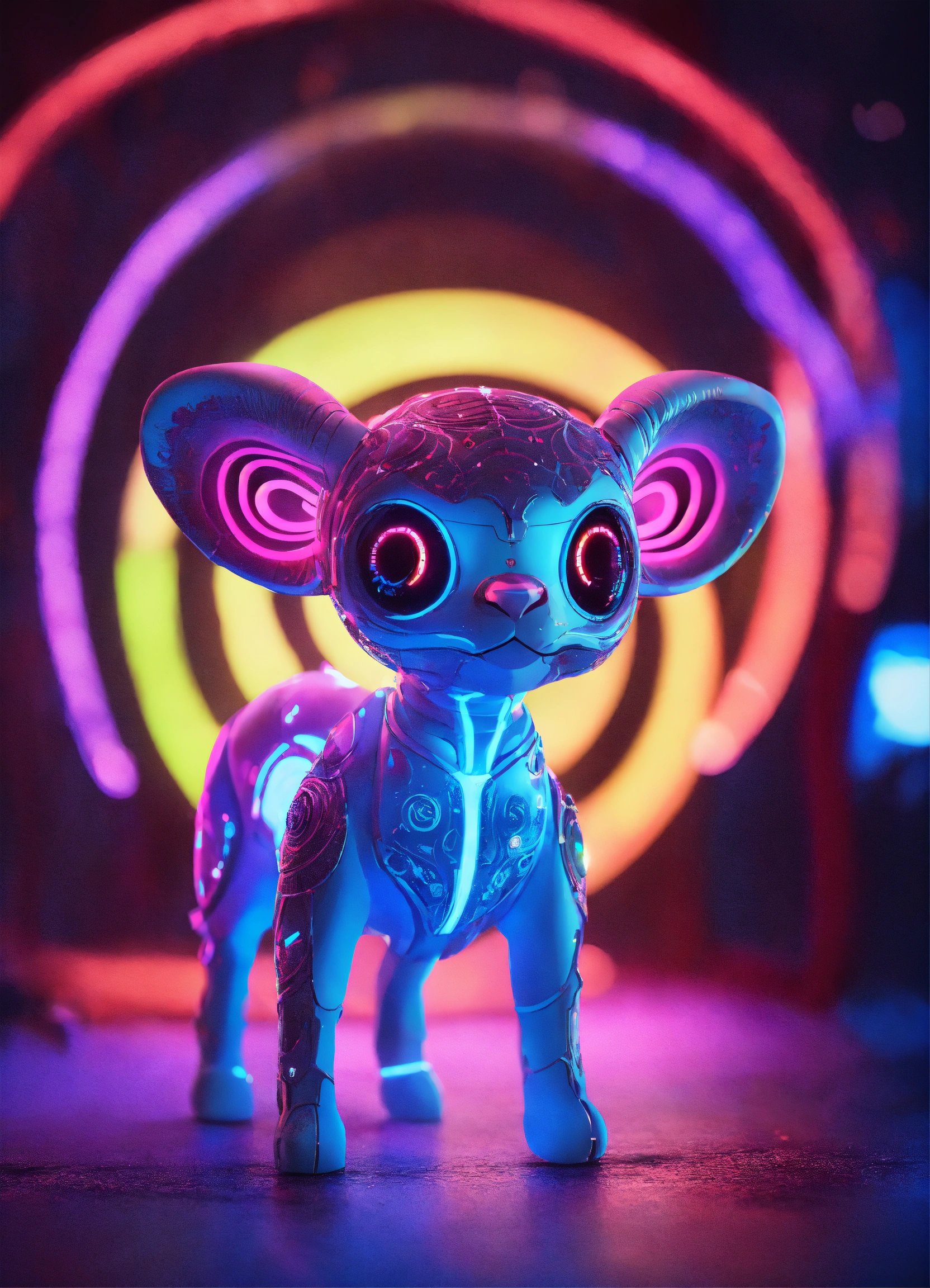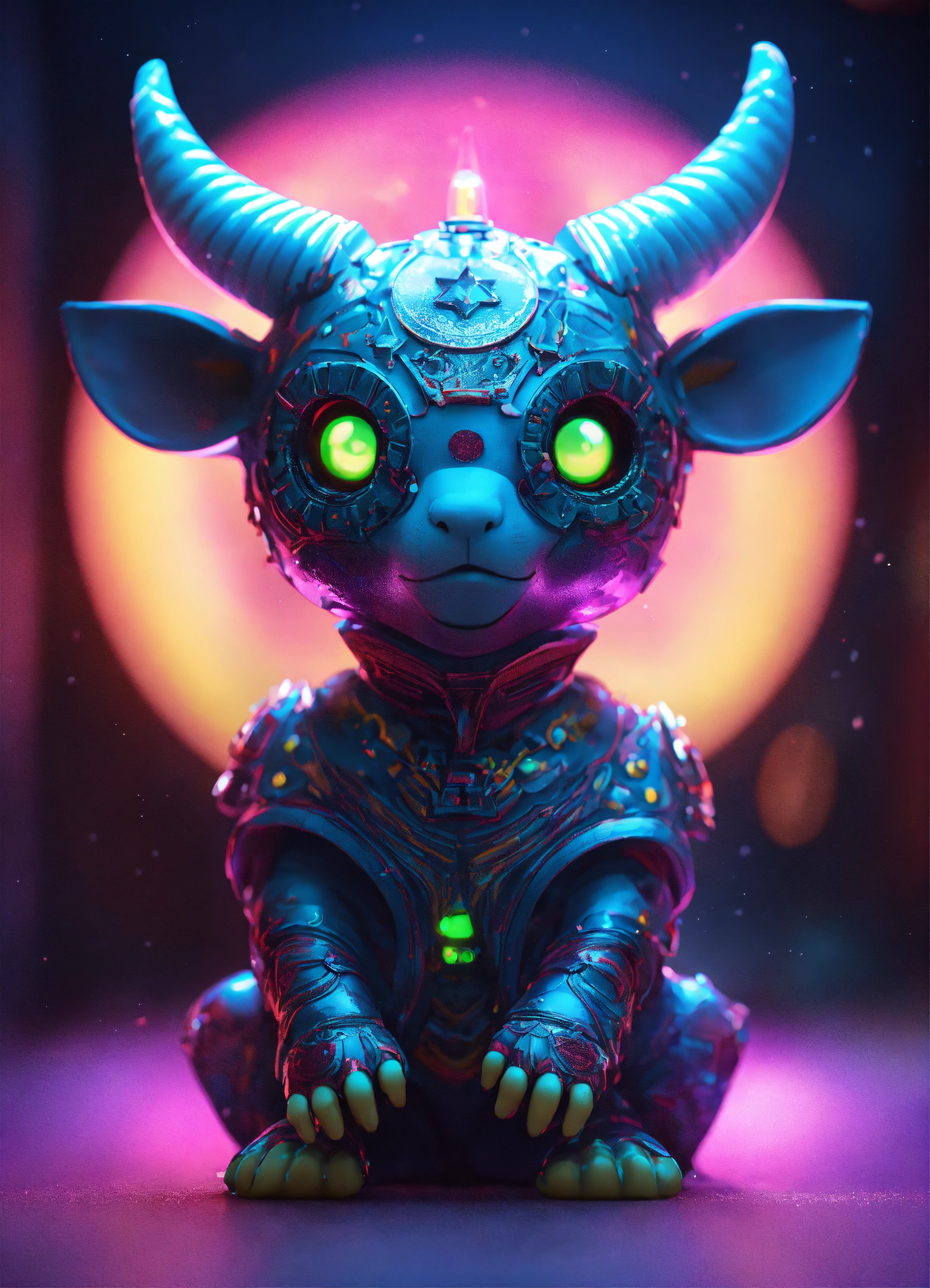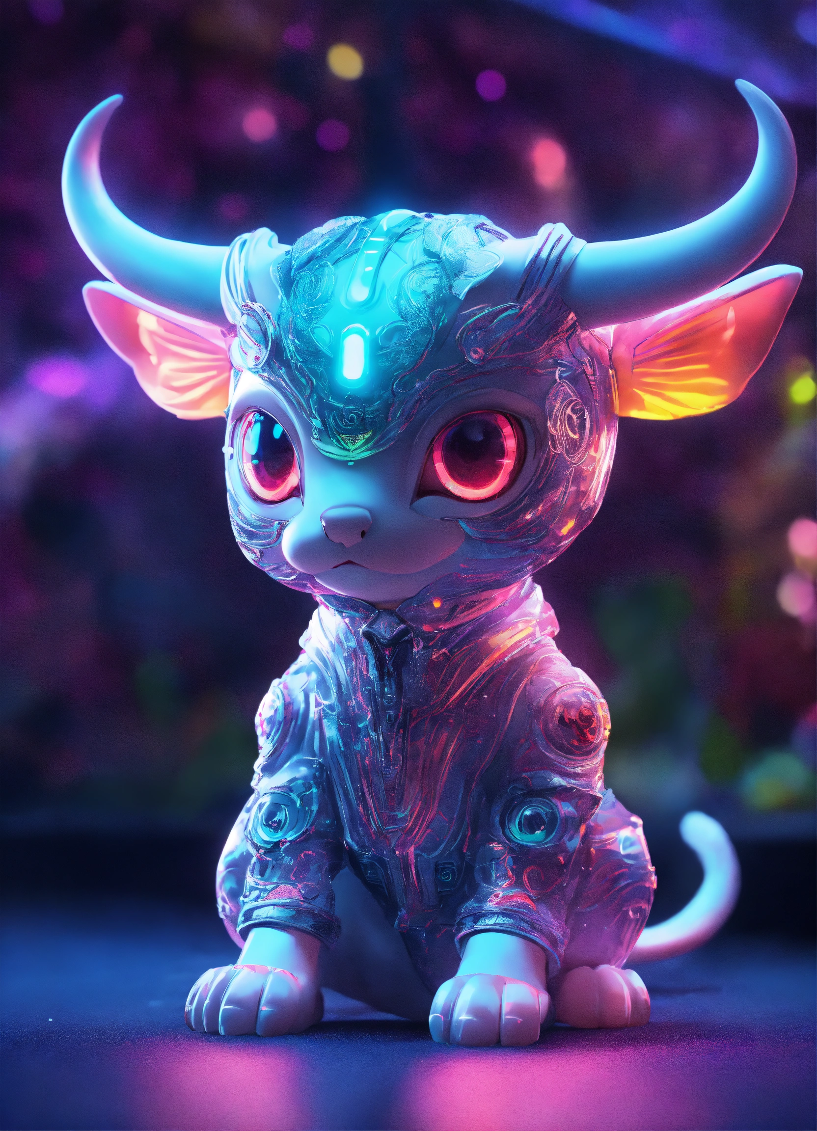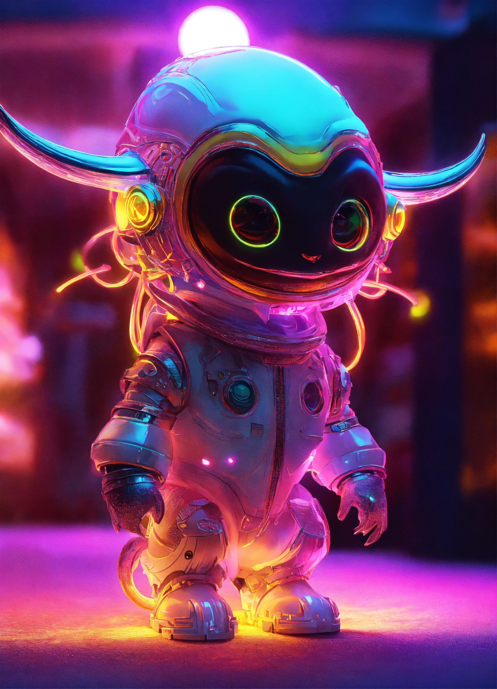 Gelly cute adorable alien bull with moon, full-body, neon glow colours, highly intricate details, 3d, cgi, realistic light, trending on cgsociety, glowing eyes, facing camera, neon details, ultra realistic details, portrait, sci fi atmosphere, global illumination, shadows, octane render, 8 k, ultra sharp, cat attributes, friendly, glass like, white, symmetric, kind, bring some beatiful colours