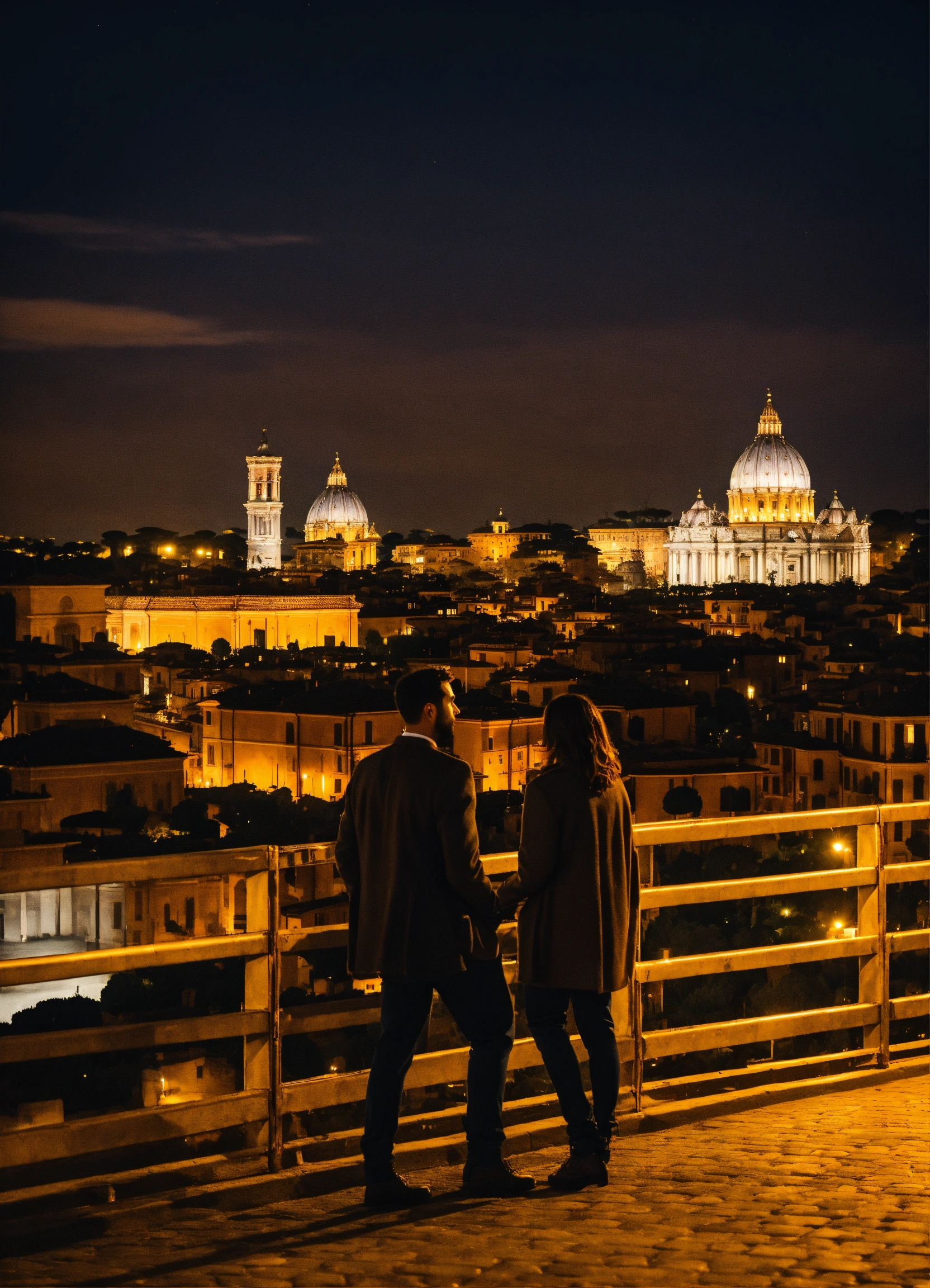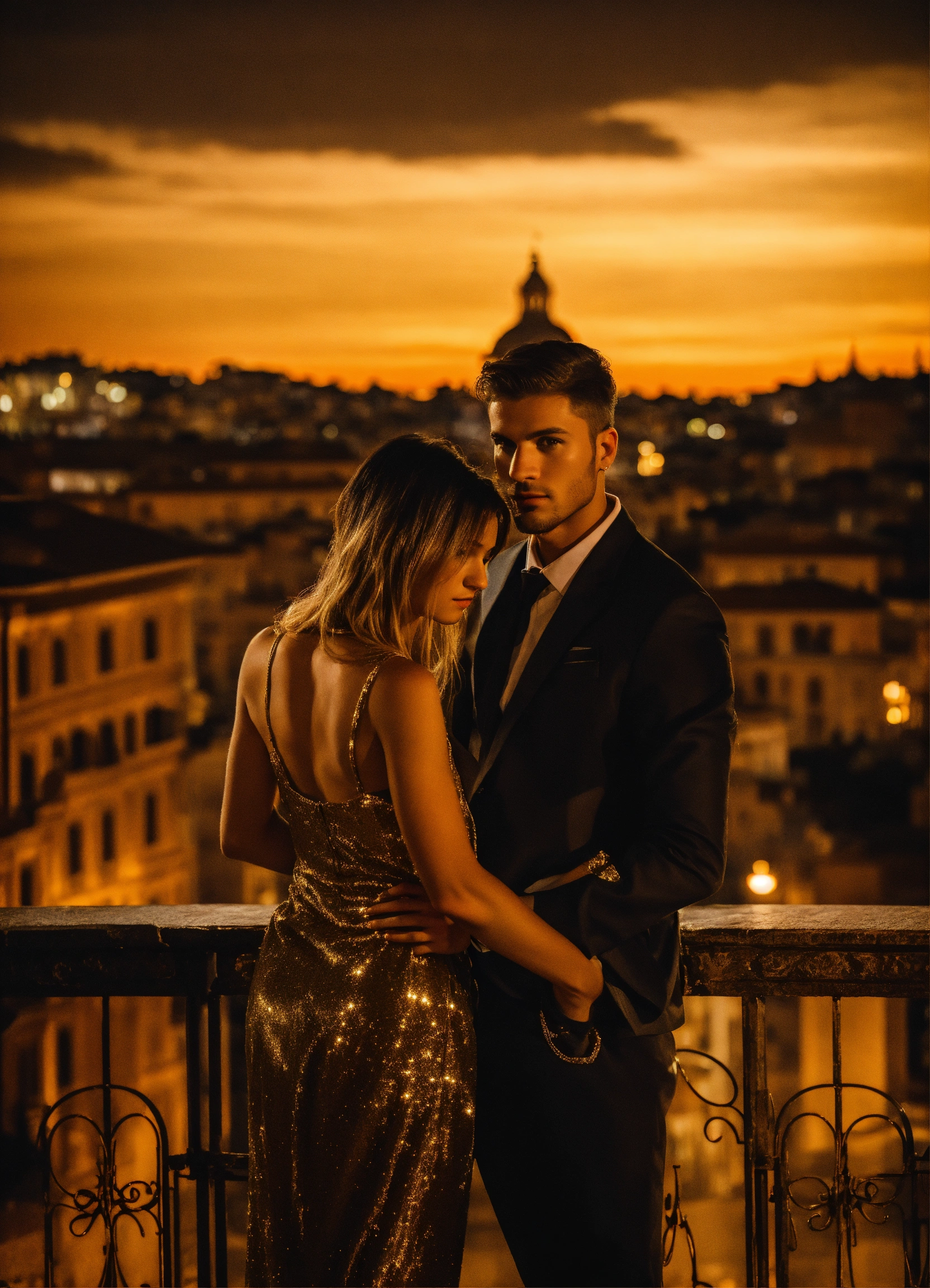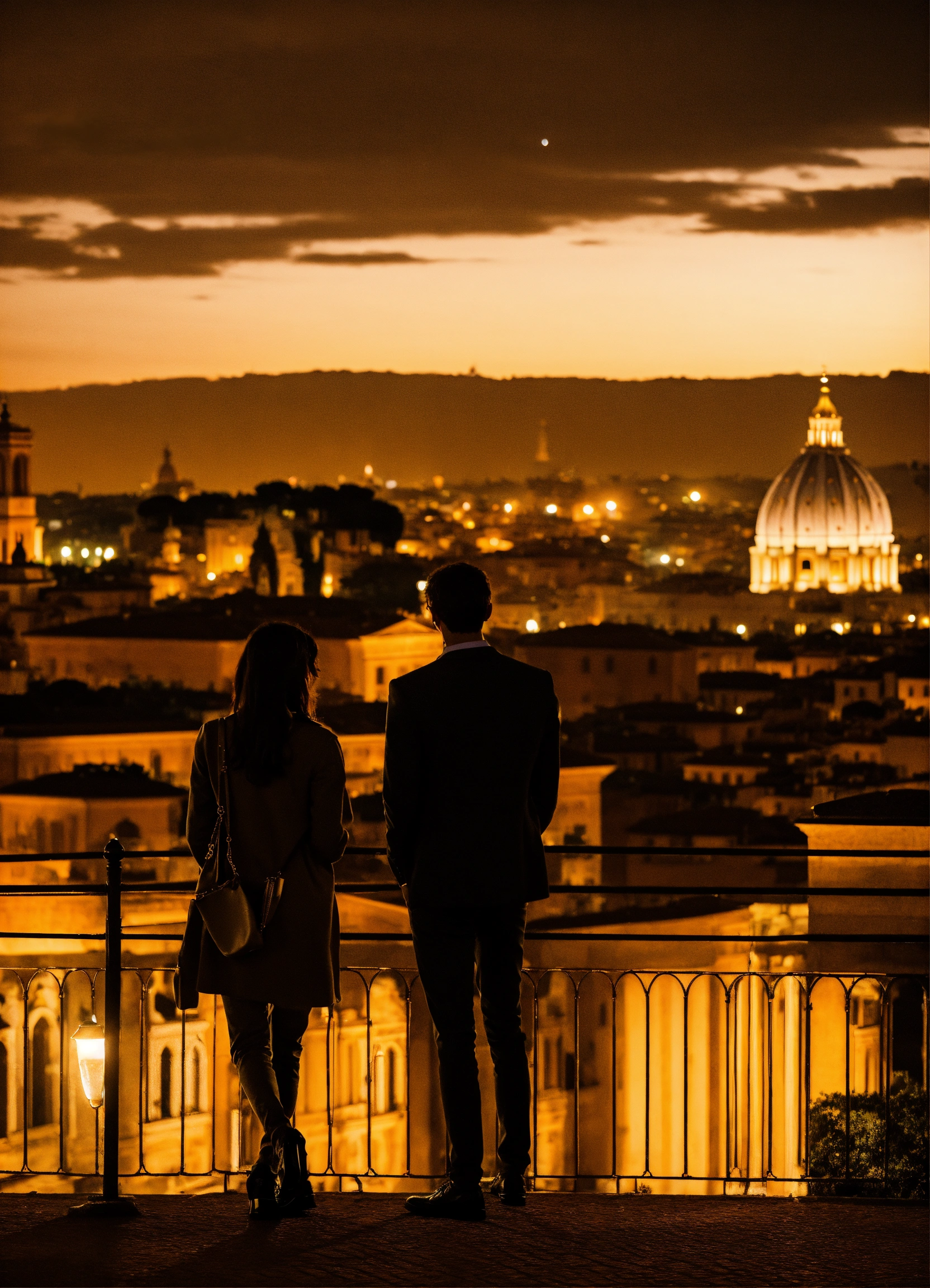 Photo of skyline of rome at night in gold color with a female and male model looking into the the camera;