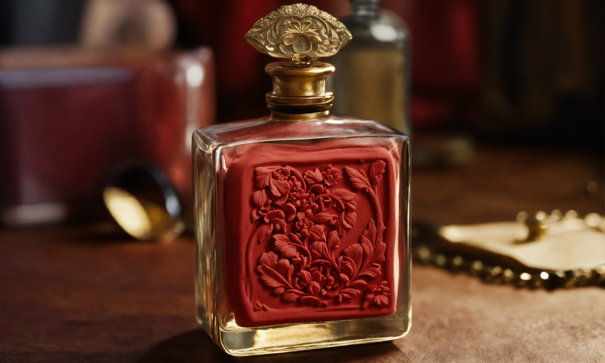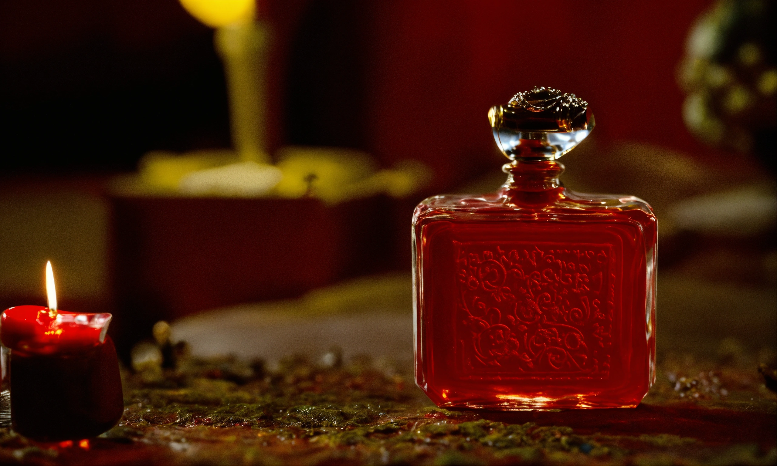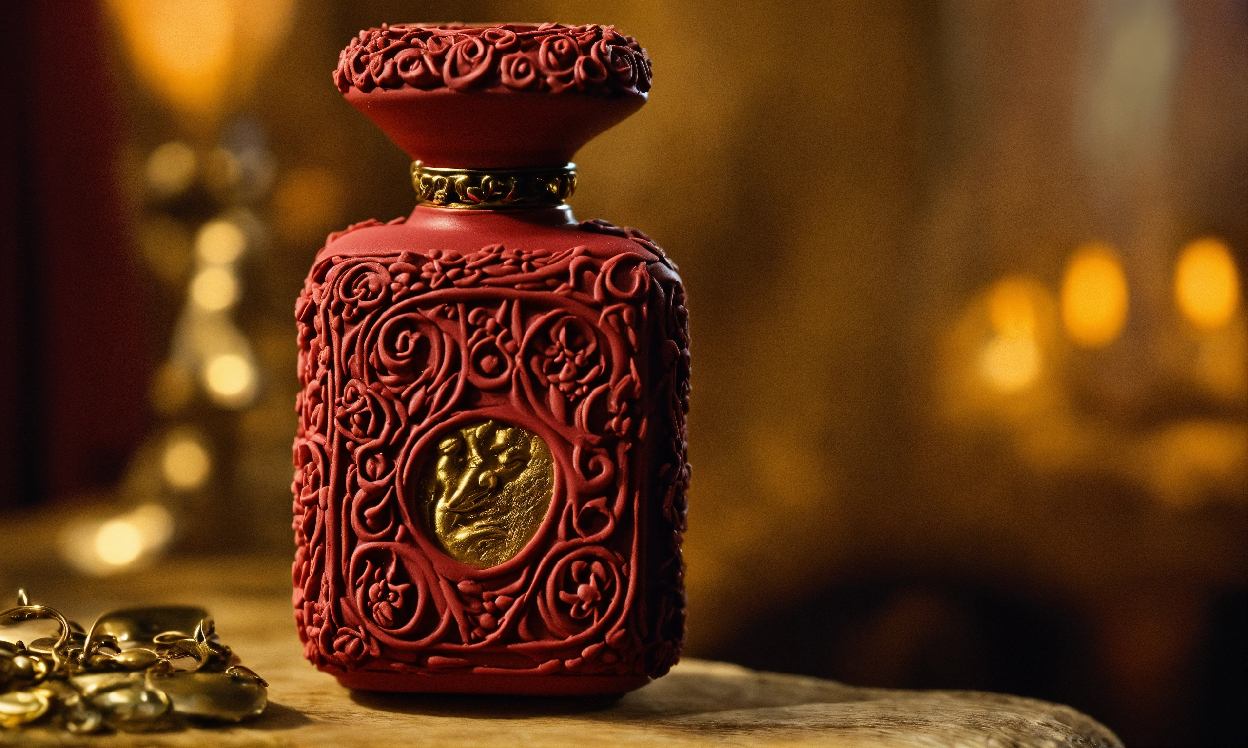 Hand-made modeling clay, romantism, immortality, fear, close-up view of perfume bottle, bram stoker inspiration