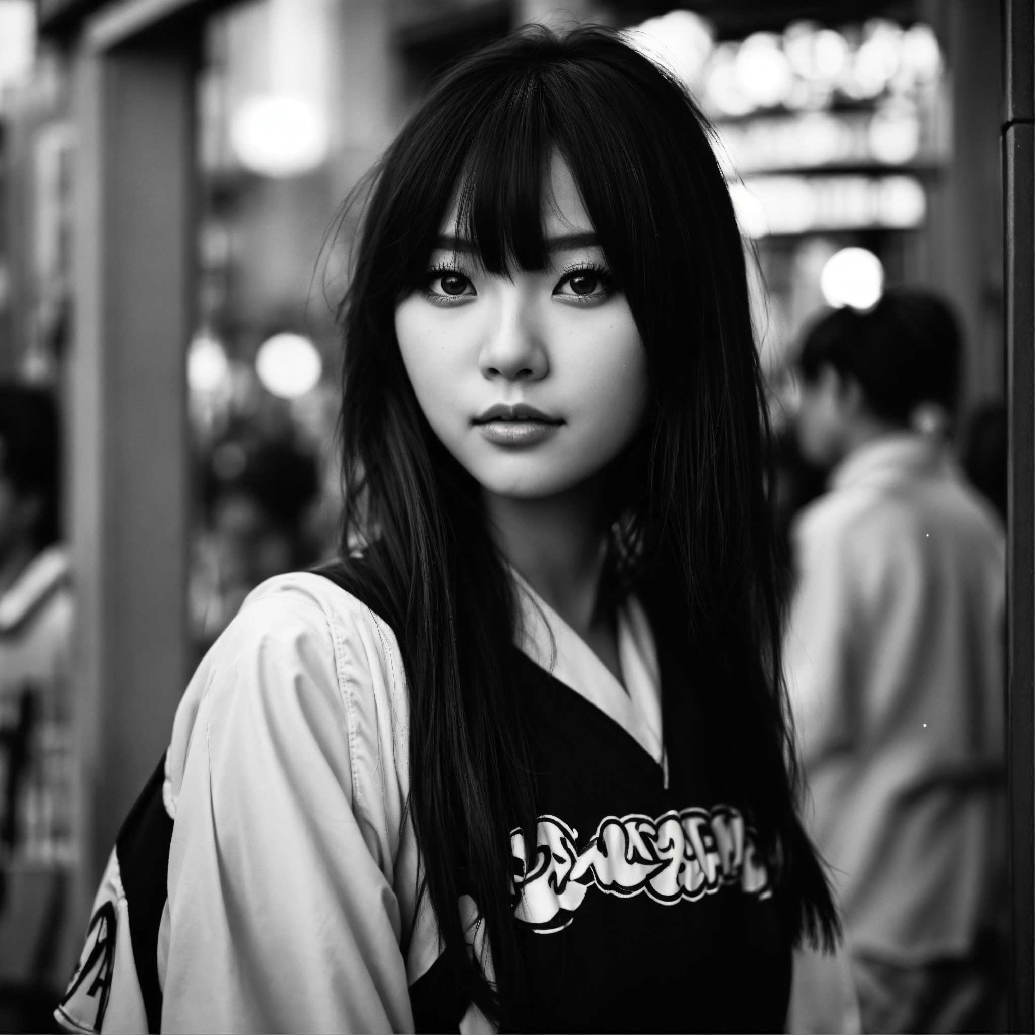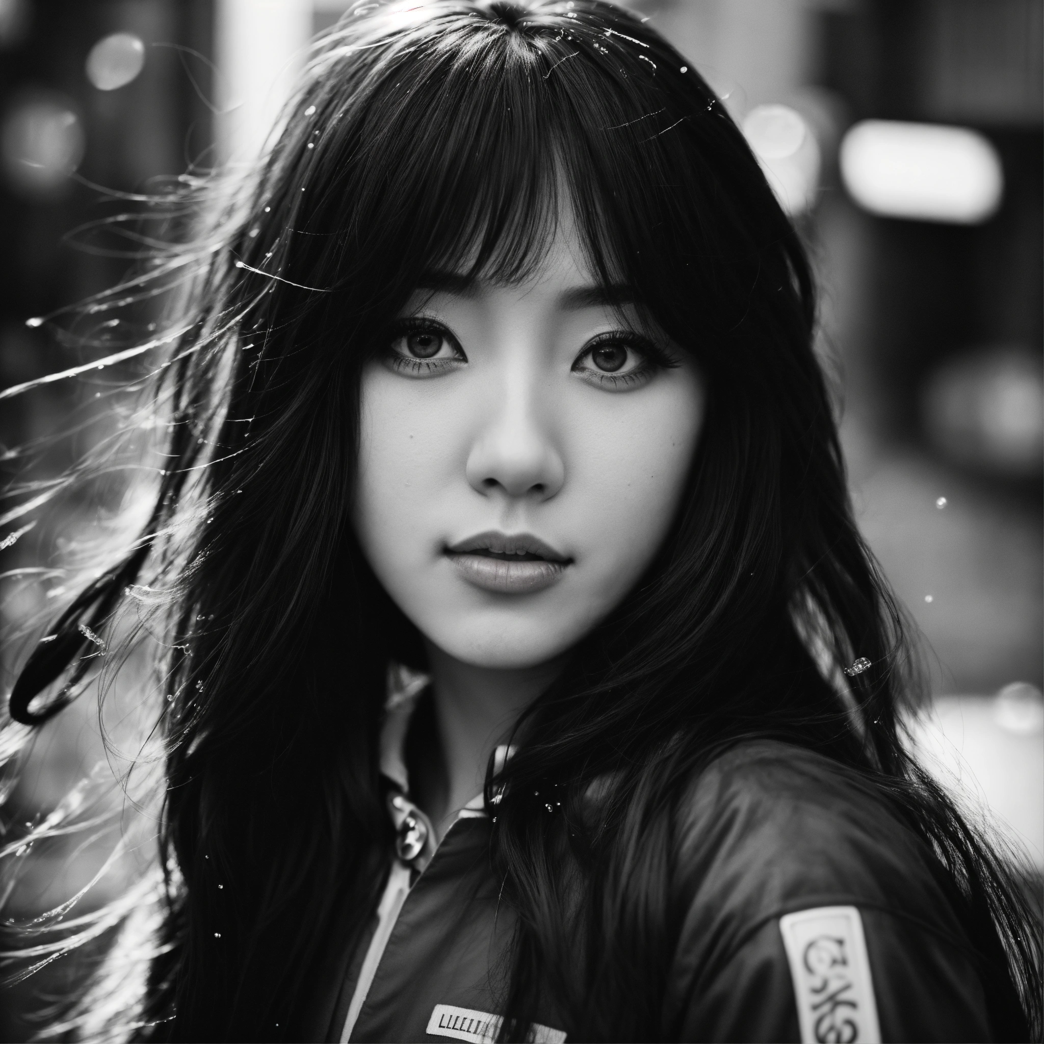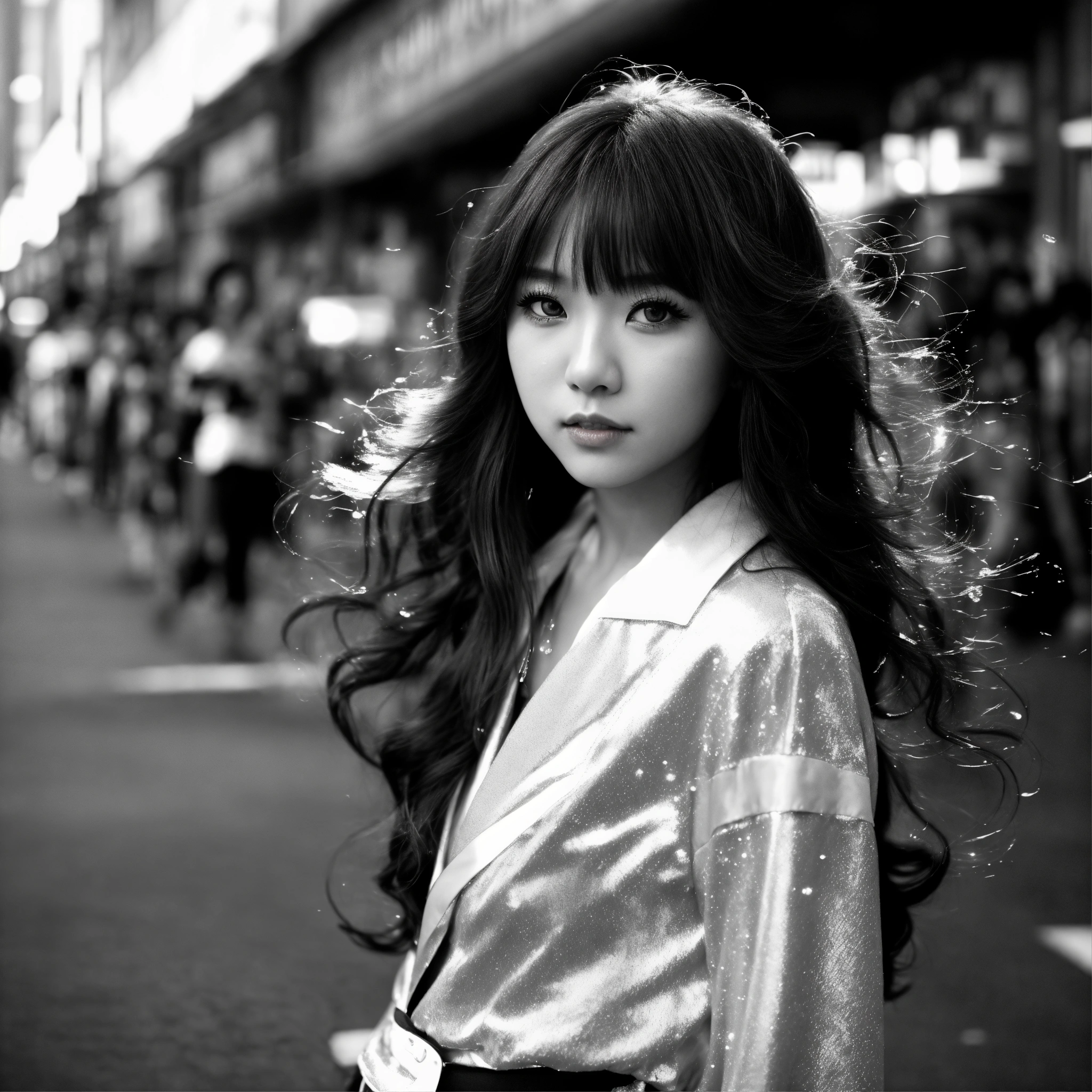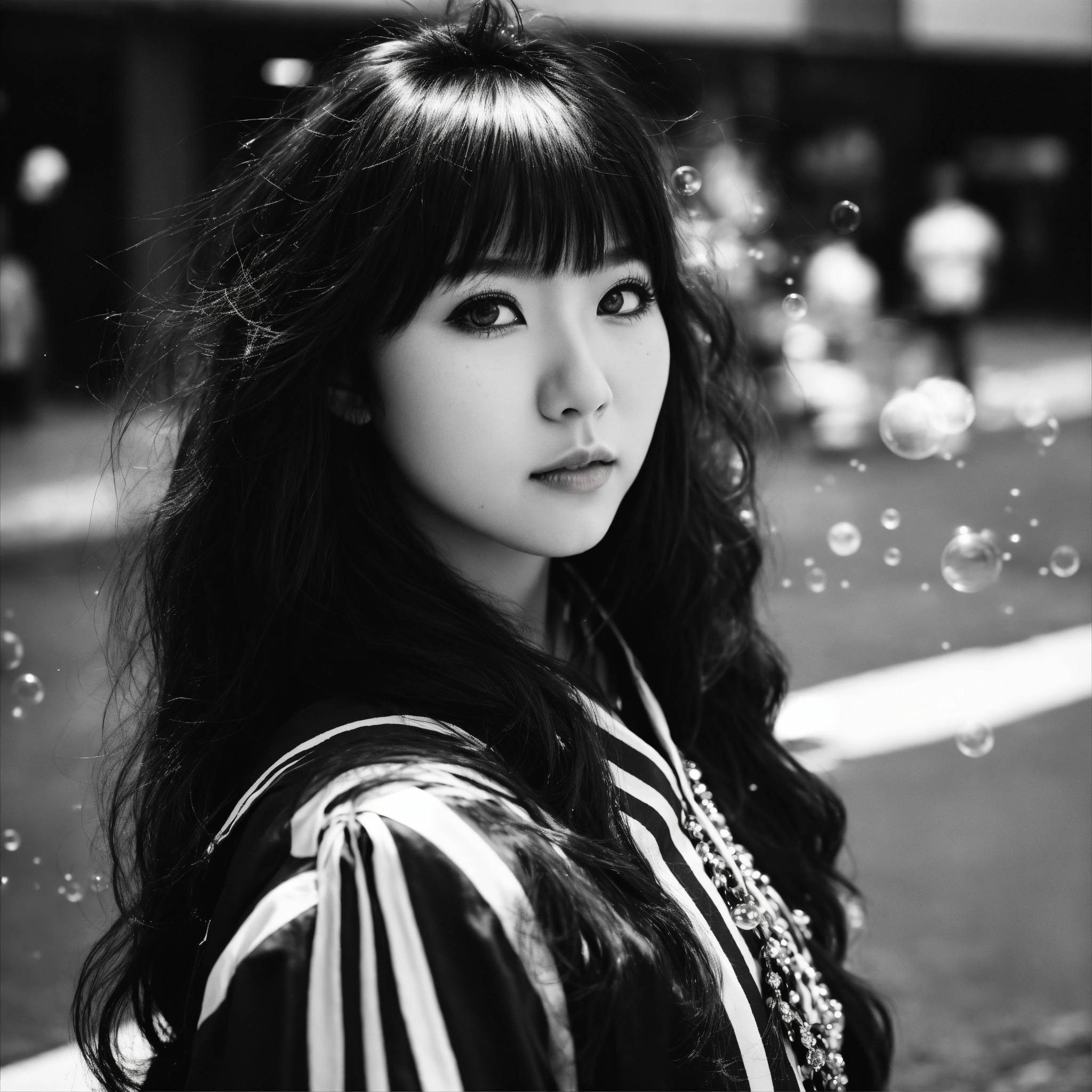 The portrait of japanese anime idol girl, eyes big, long and black and beautiful strait hair, standing still, dressed in a fashionable well designed cheerleader costume, staring into the camera with clear eyes, seen from street windows, bubbles in the air, extremely detailed photographic image, grained image, beautifully composed, monochrome image, extremely detailed street image, tokyo, fashionable magazine photography, perfectly arranged street portrait, leica summicron 35mm f2.0, kodak 400tx, flashy light, street photography filled with unknown crowded people, posing like a dancer
