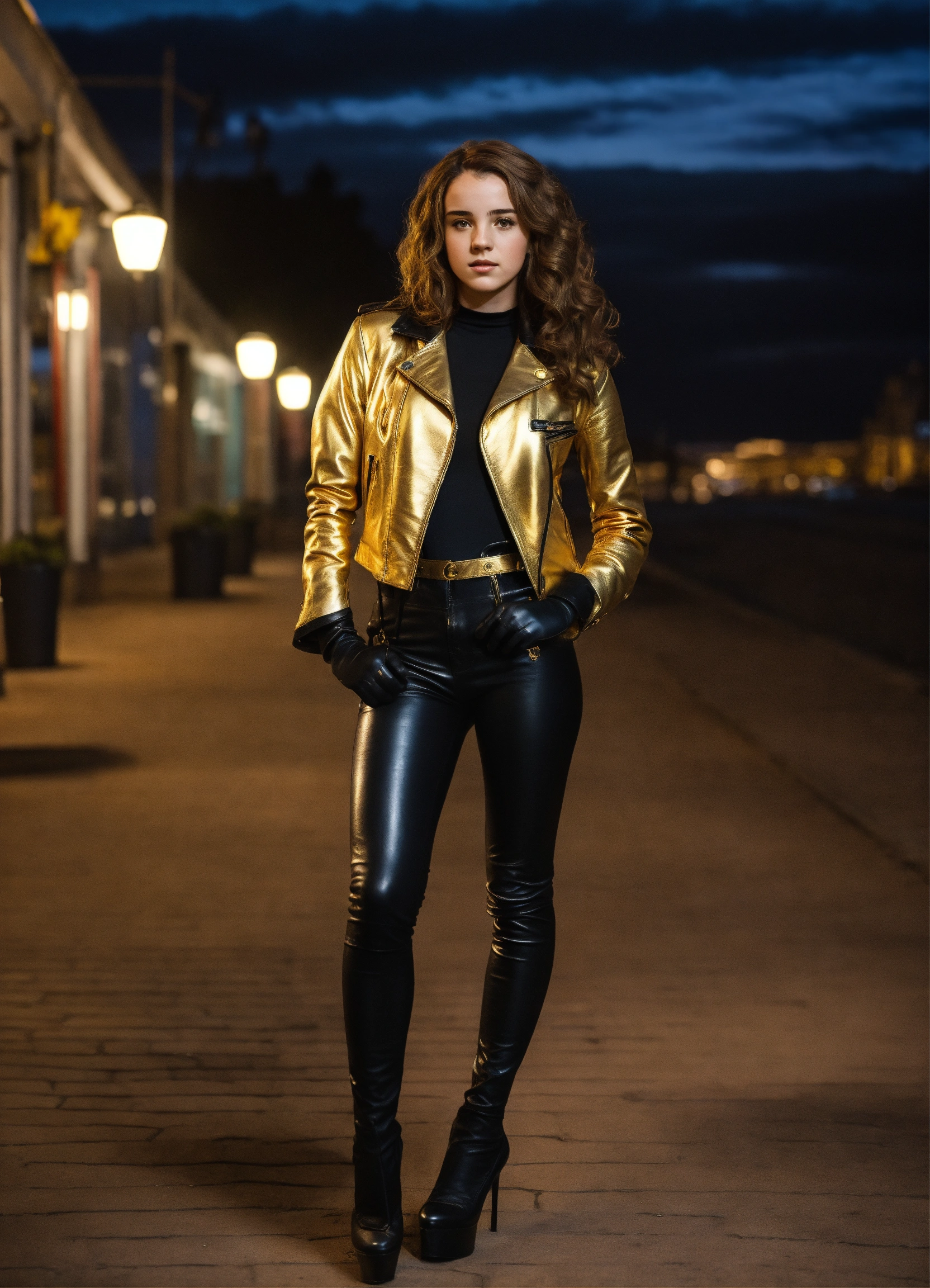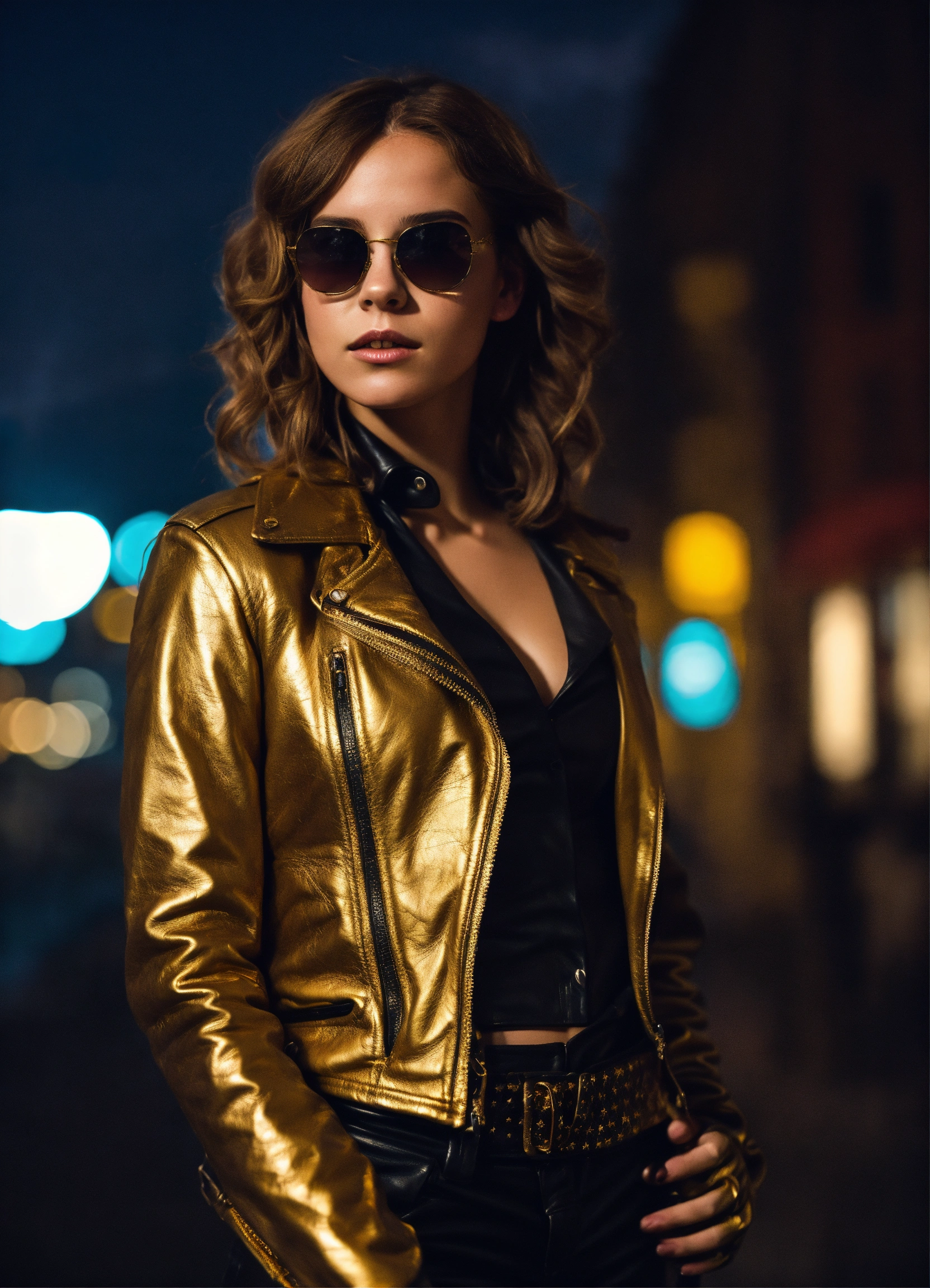 A real photo of a 25 year old woman with looking like a real version of hermione granger, wearing gold leather jacket and black leather pants corsets and gloves. urban background in the sky we see stars. full body at night. sunglasses
