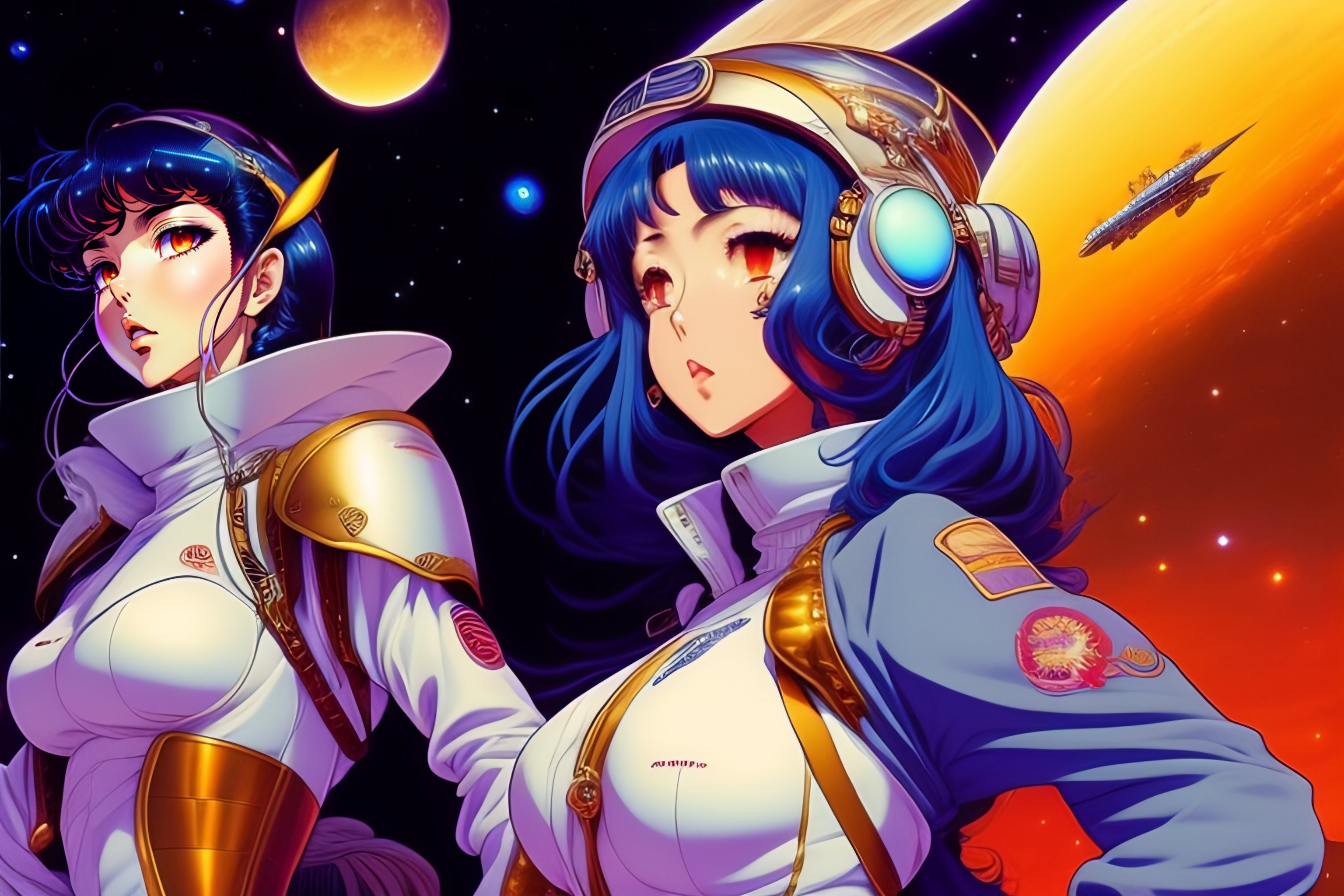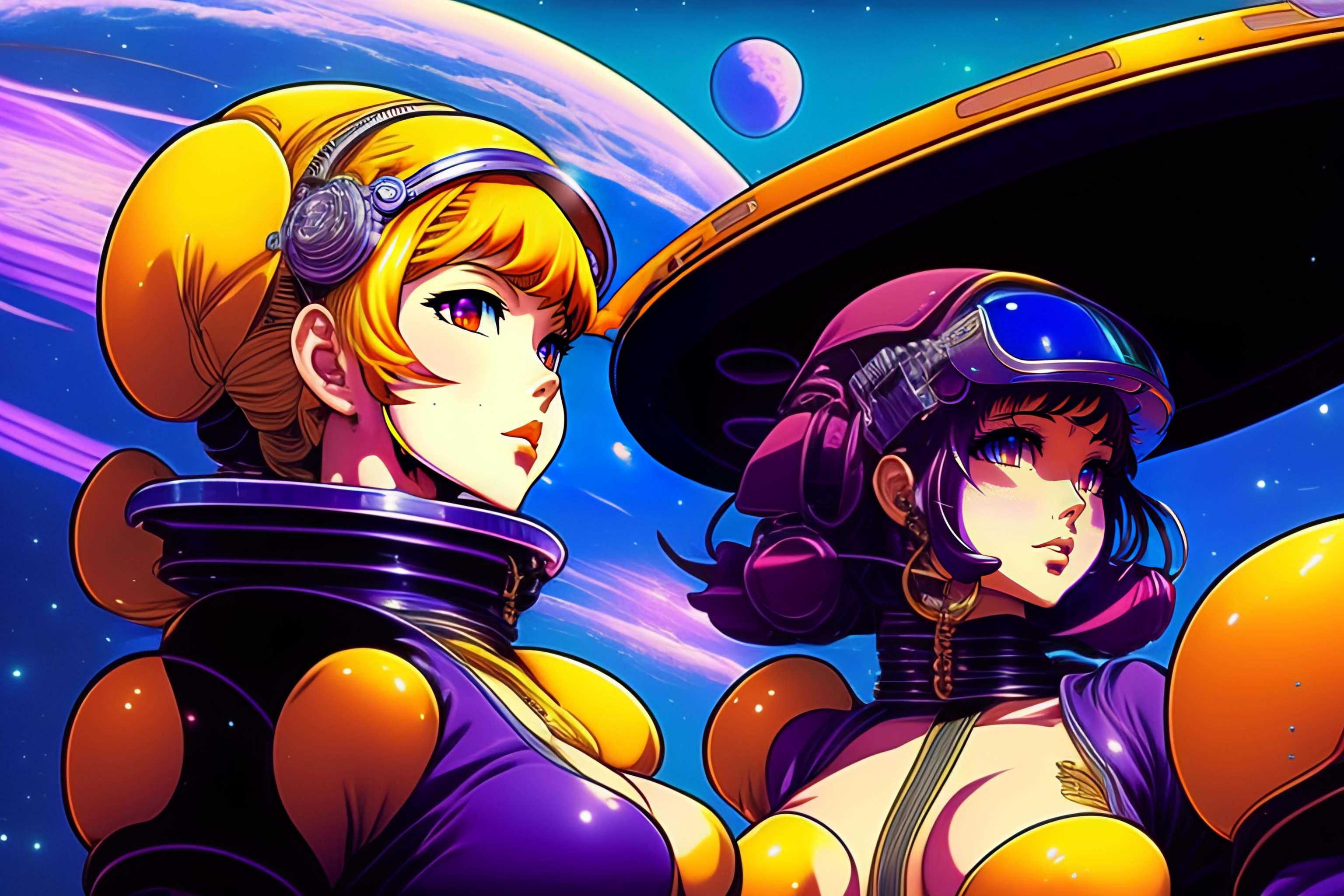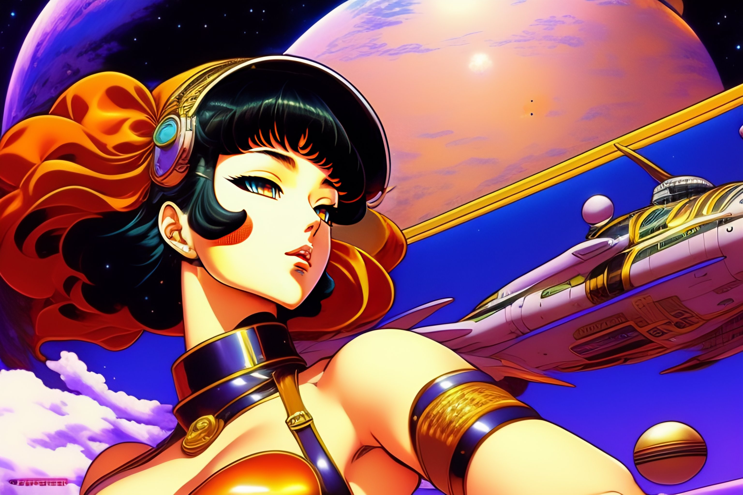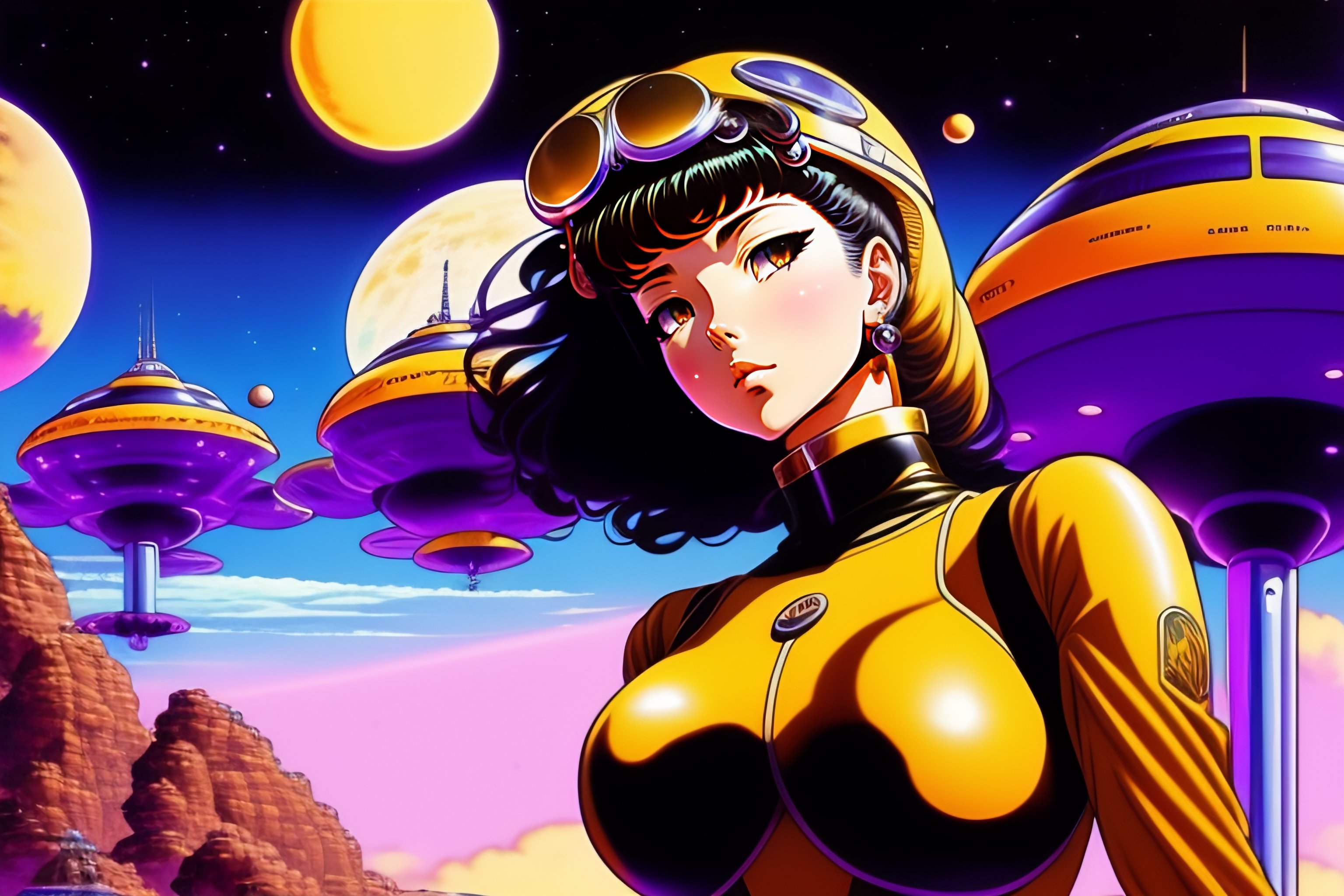 Vintage 90's anime style. quaint spaceport at the outskirts of civilization; by hajime sorayama, greg tocchini, virgil finlay, sci-fi, soft colors