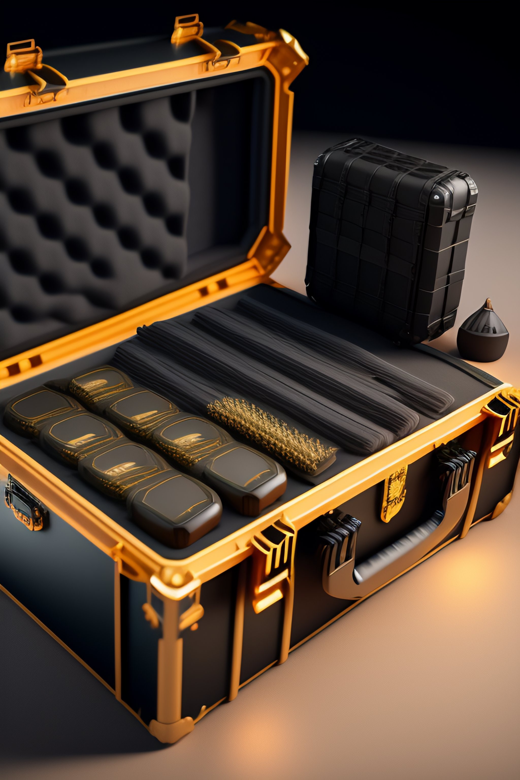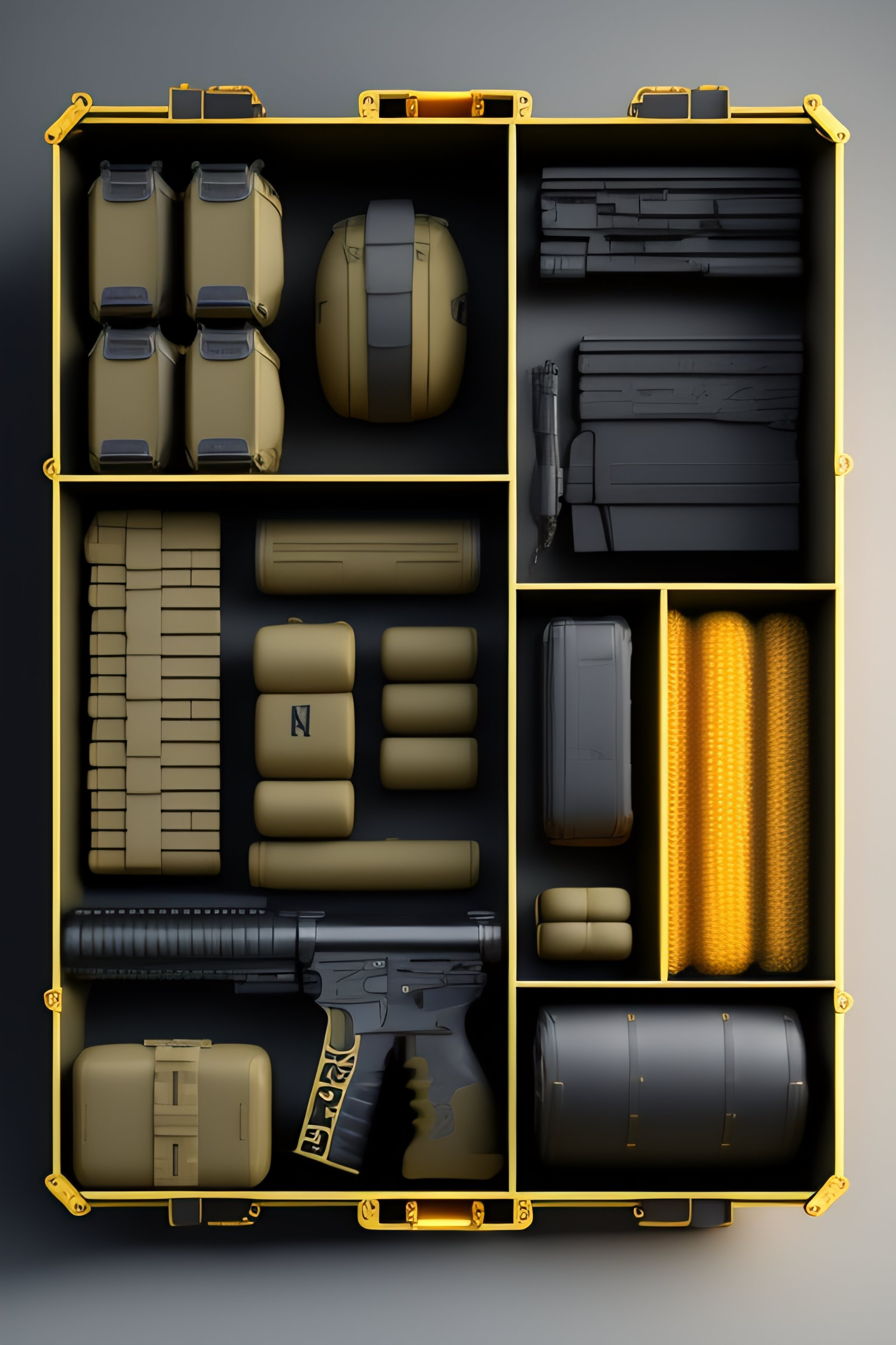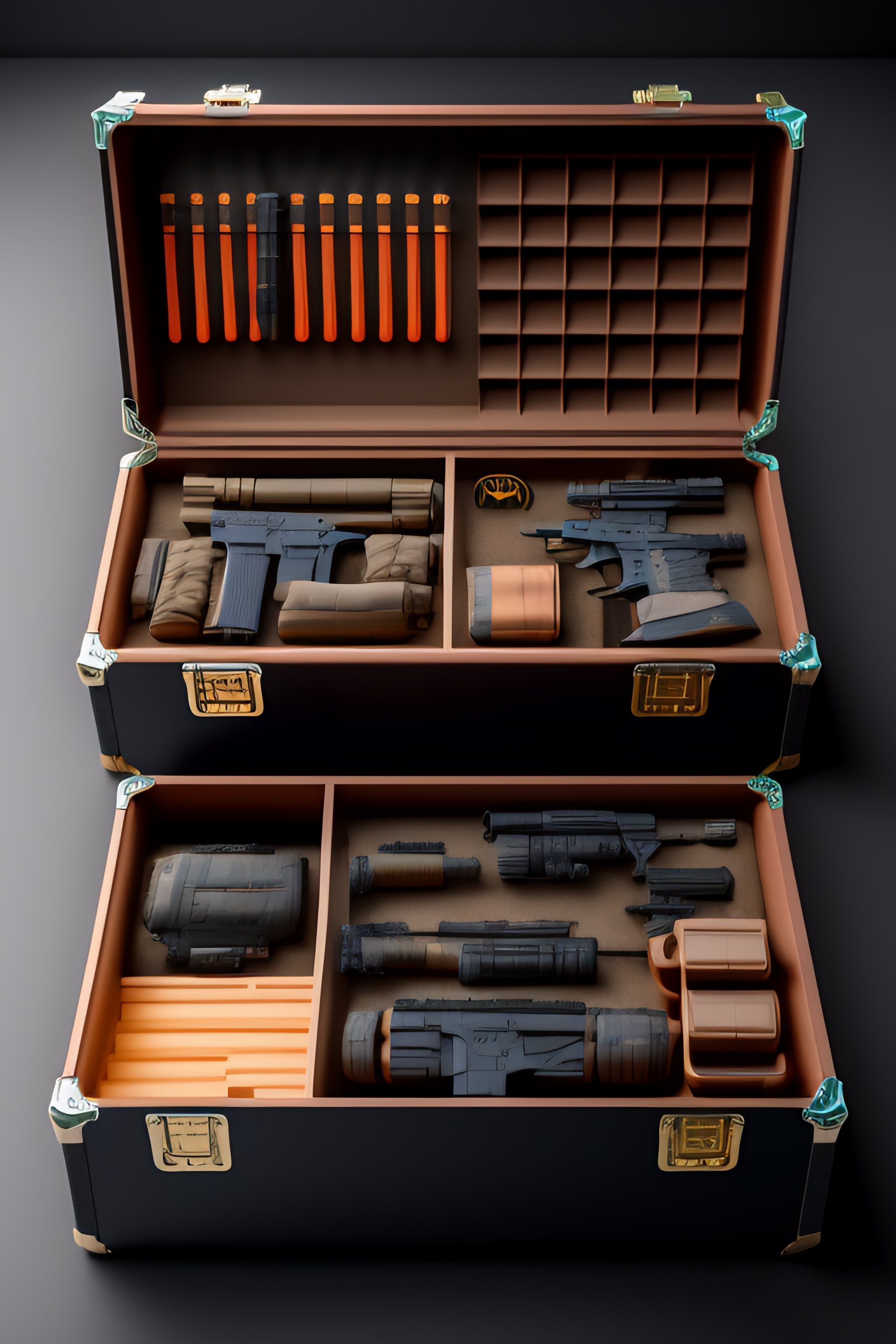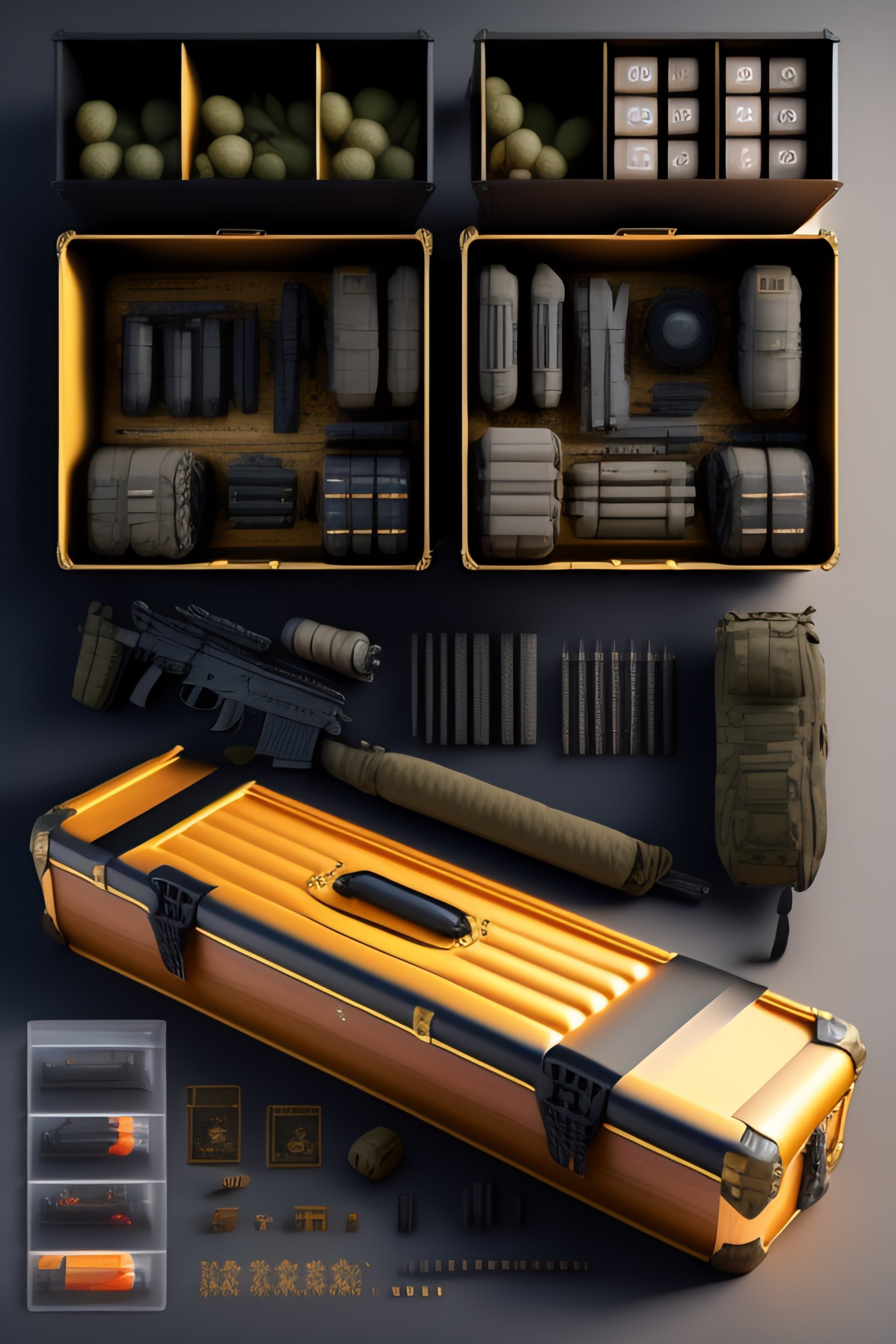 Cs-go box case, costumes and props, knolling, knolling layout, deconstruction, highly detailed, depth, many parts, lumen render, 8k