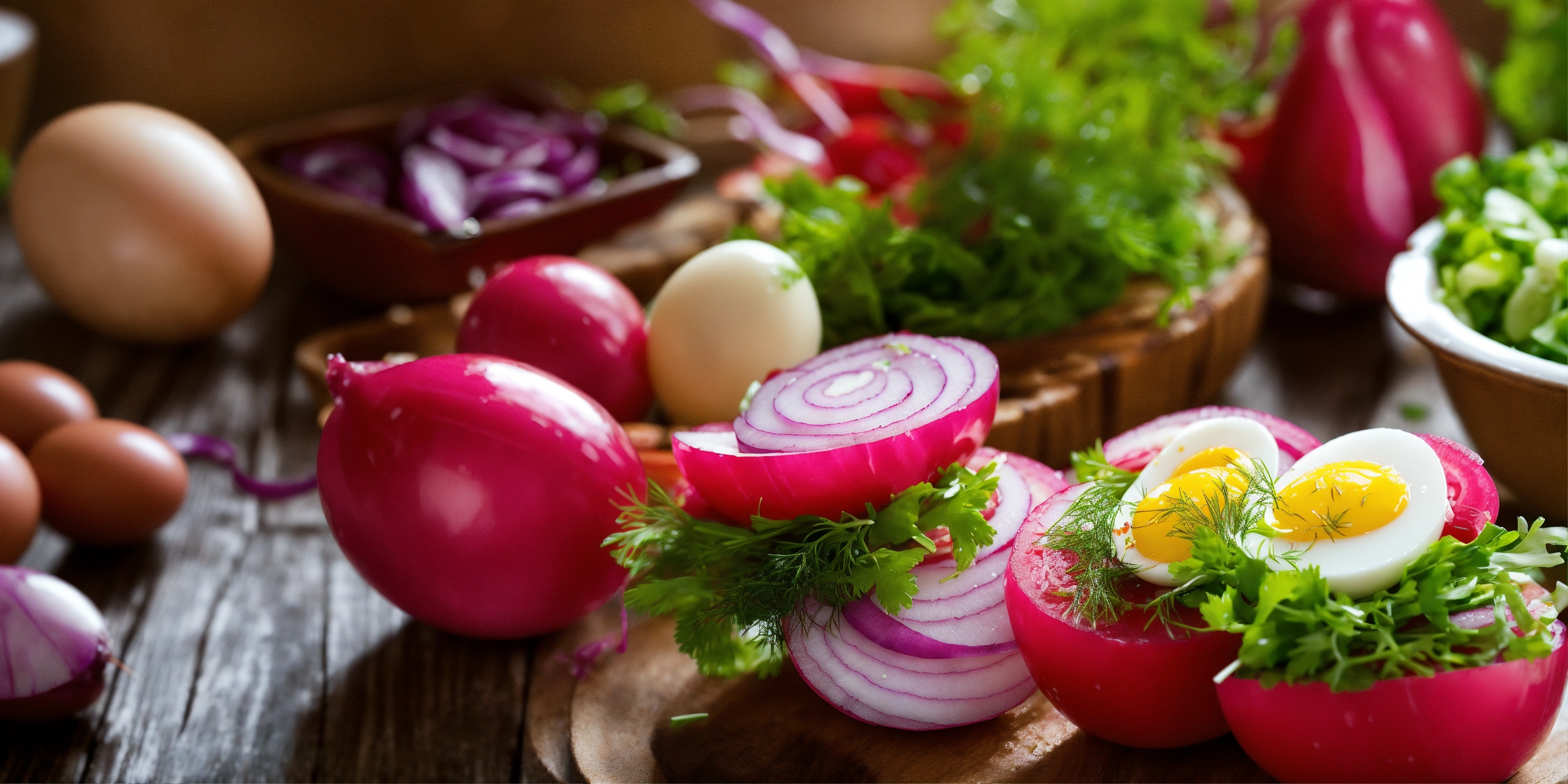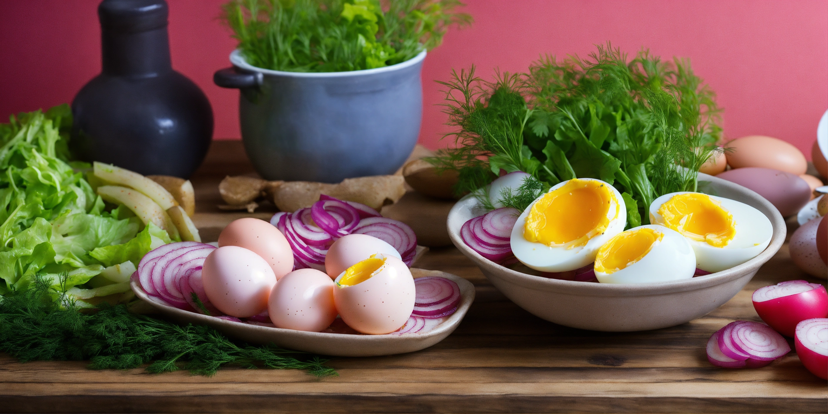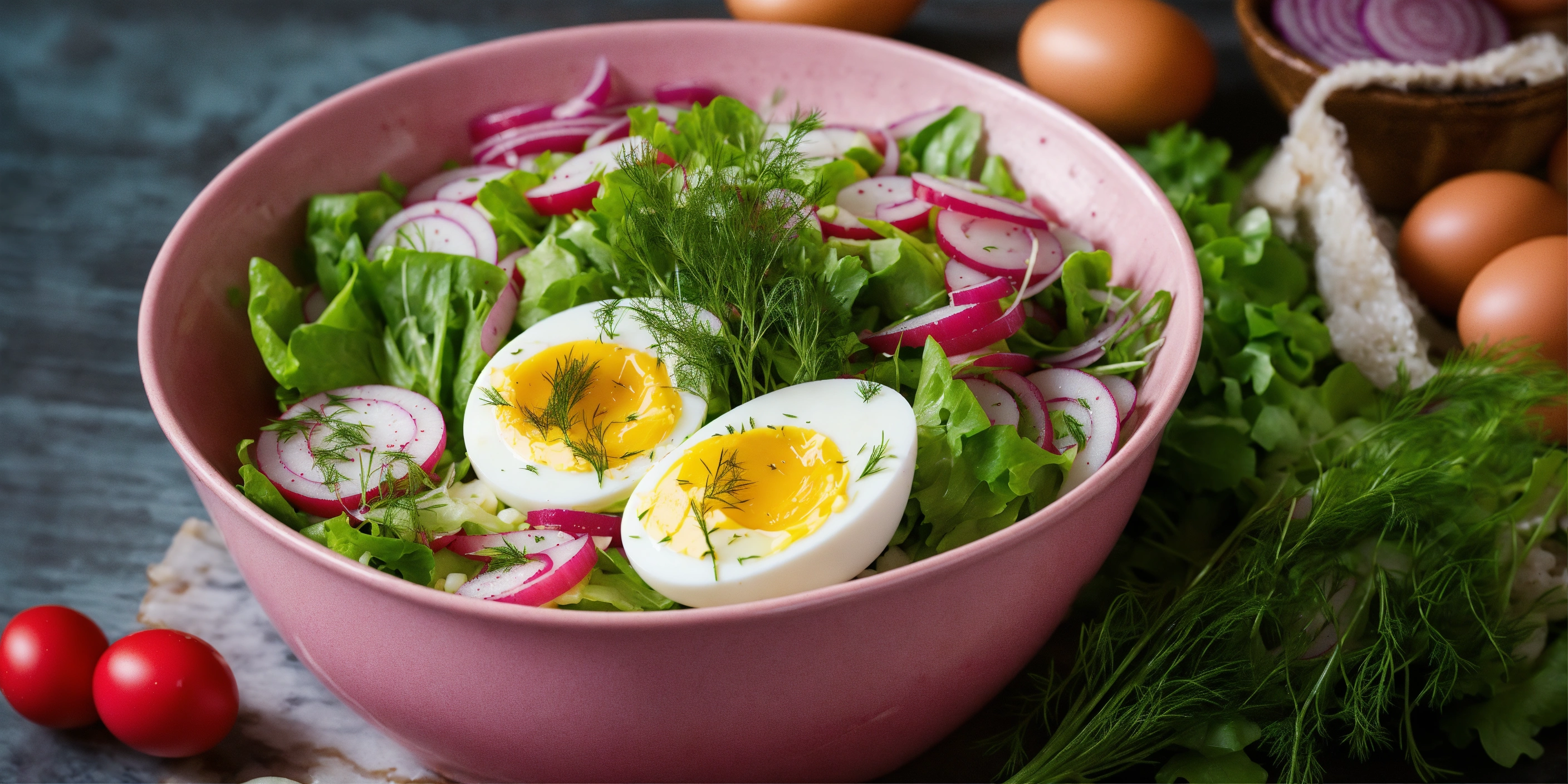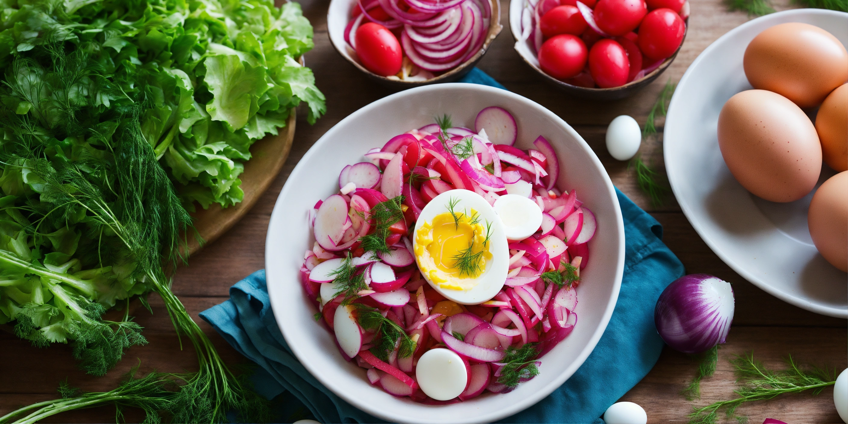 Woman in a pink swimming suit, radish, hard boiled eggs, red onion, dill, salad, ukrainian cuisine, hi tech kitchen