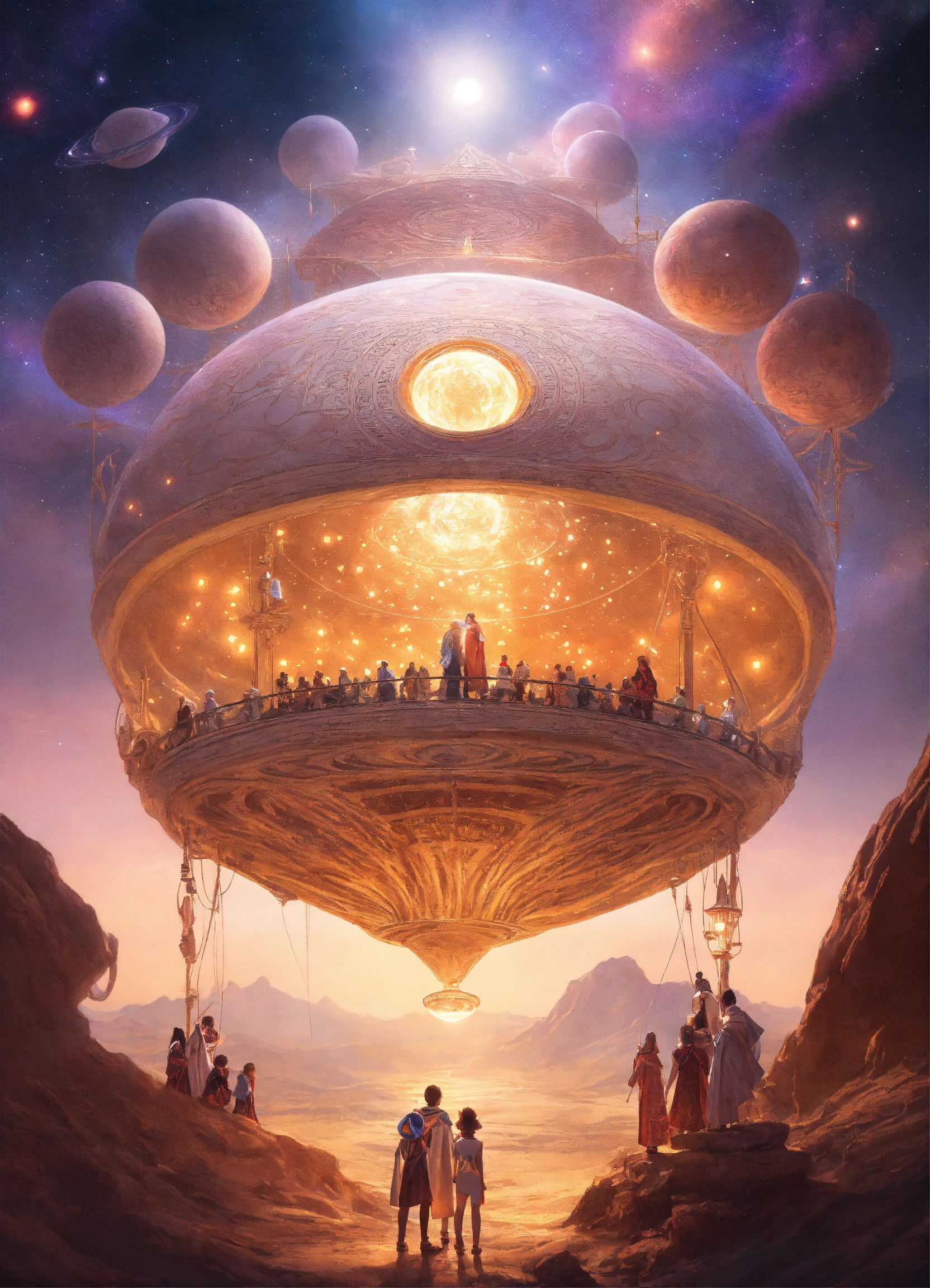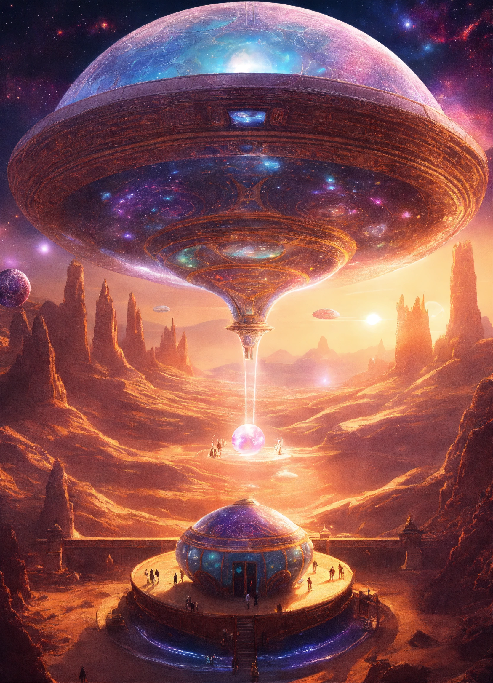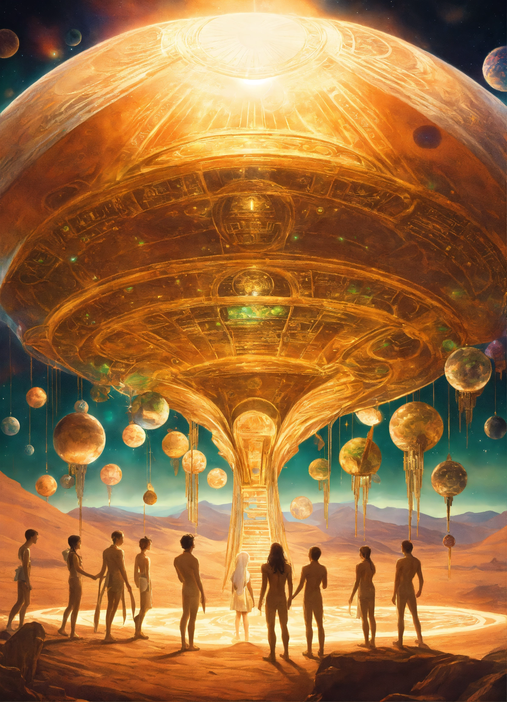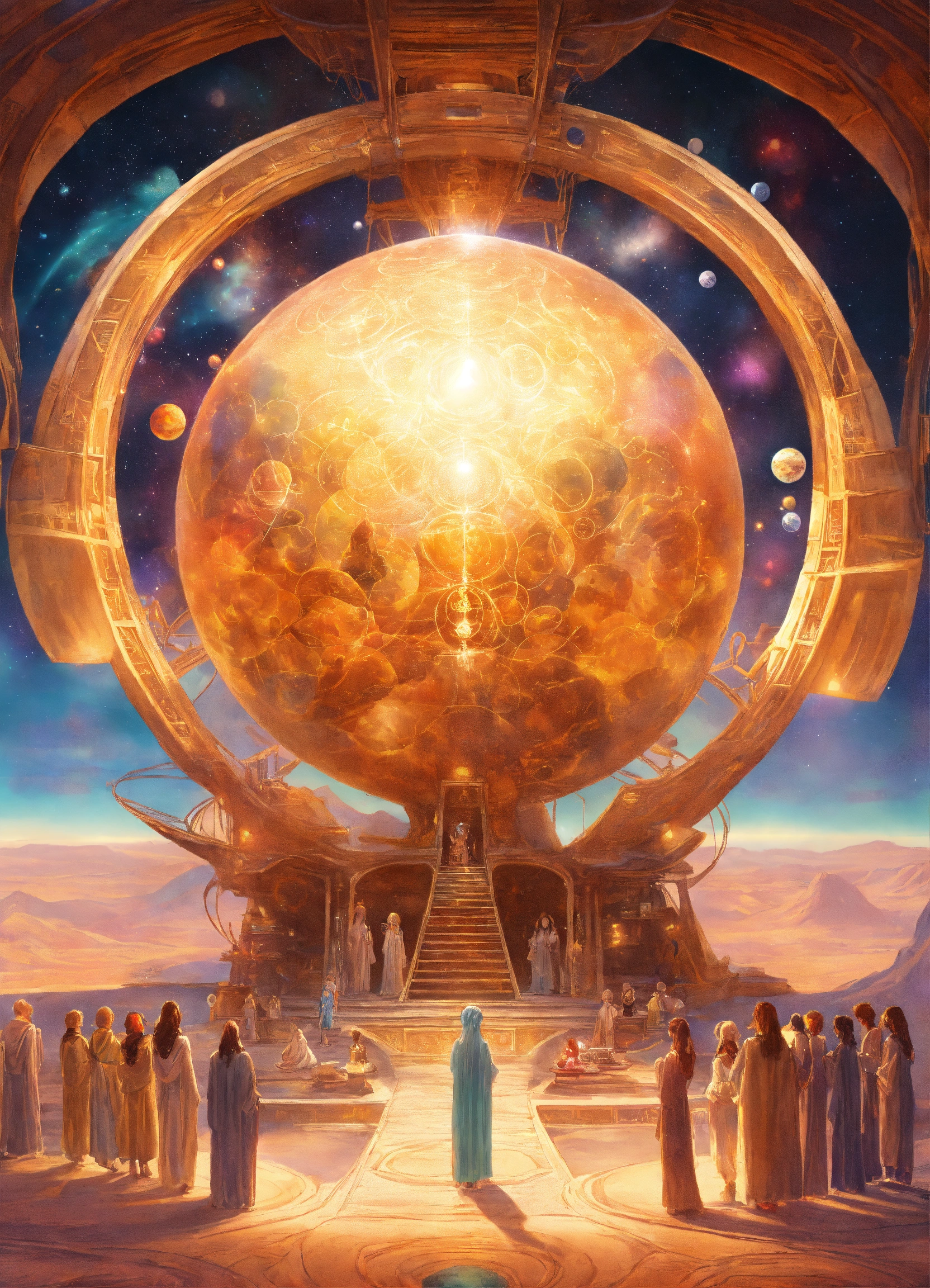 12 alien beings with a divine and loving expression gather inside a white extraterrestrial spiritual ship, overlooking a cosmic desert. there is abundant luminosity, galactic fantasy style. insert a sphere of light with sacred geometries in the center, with light codes moving around this fluid sphere.