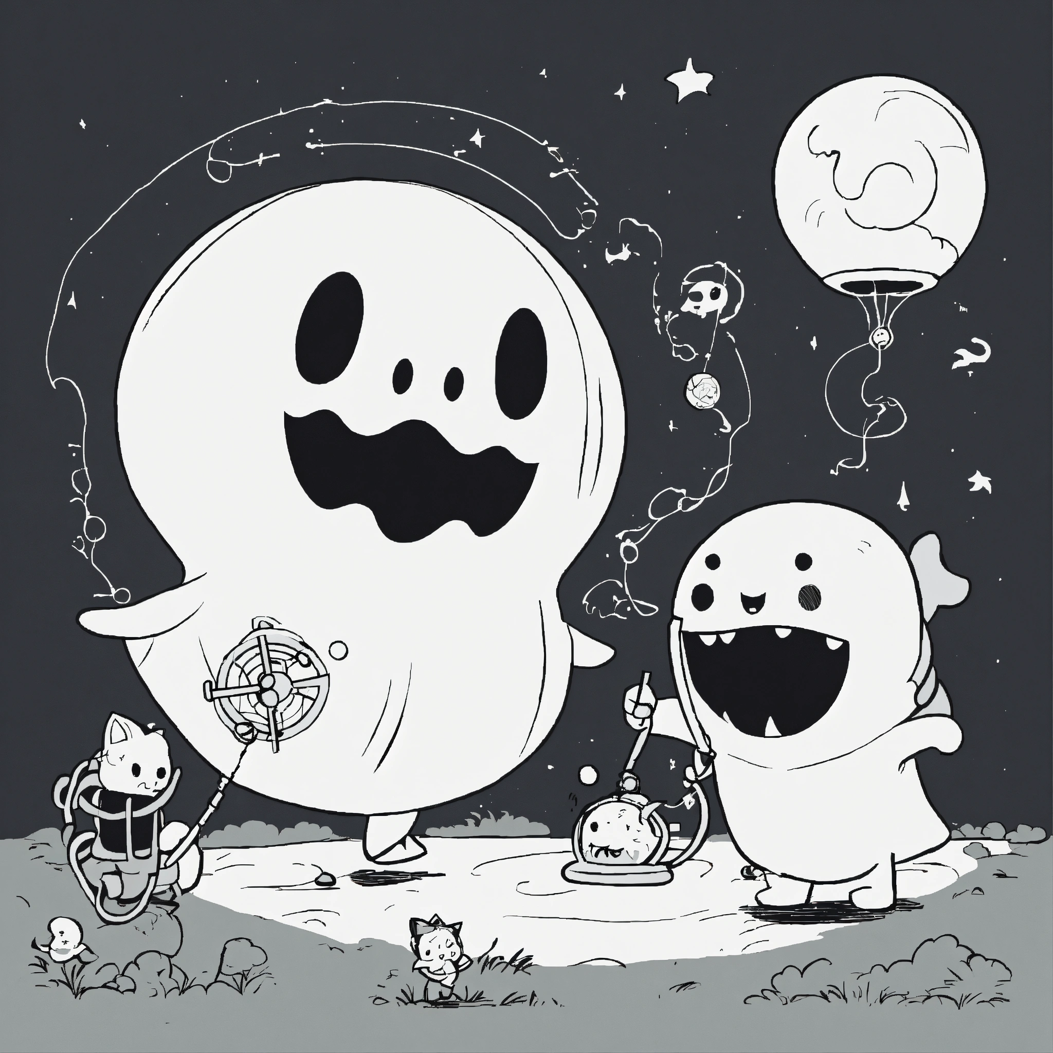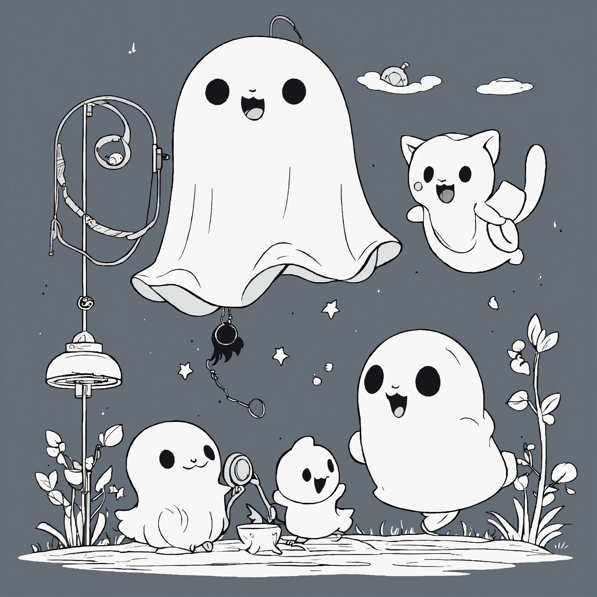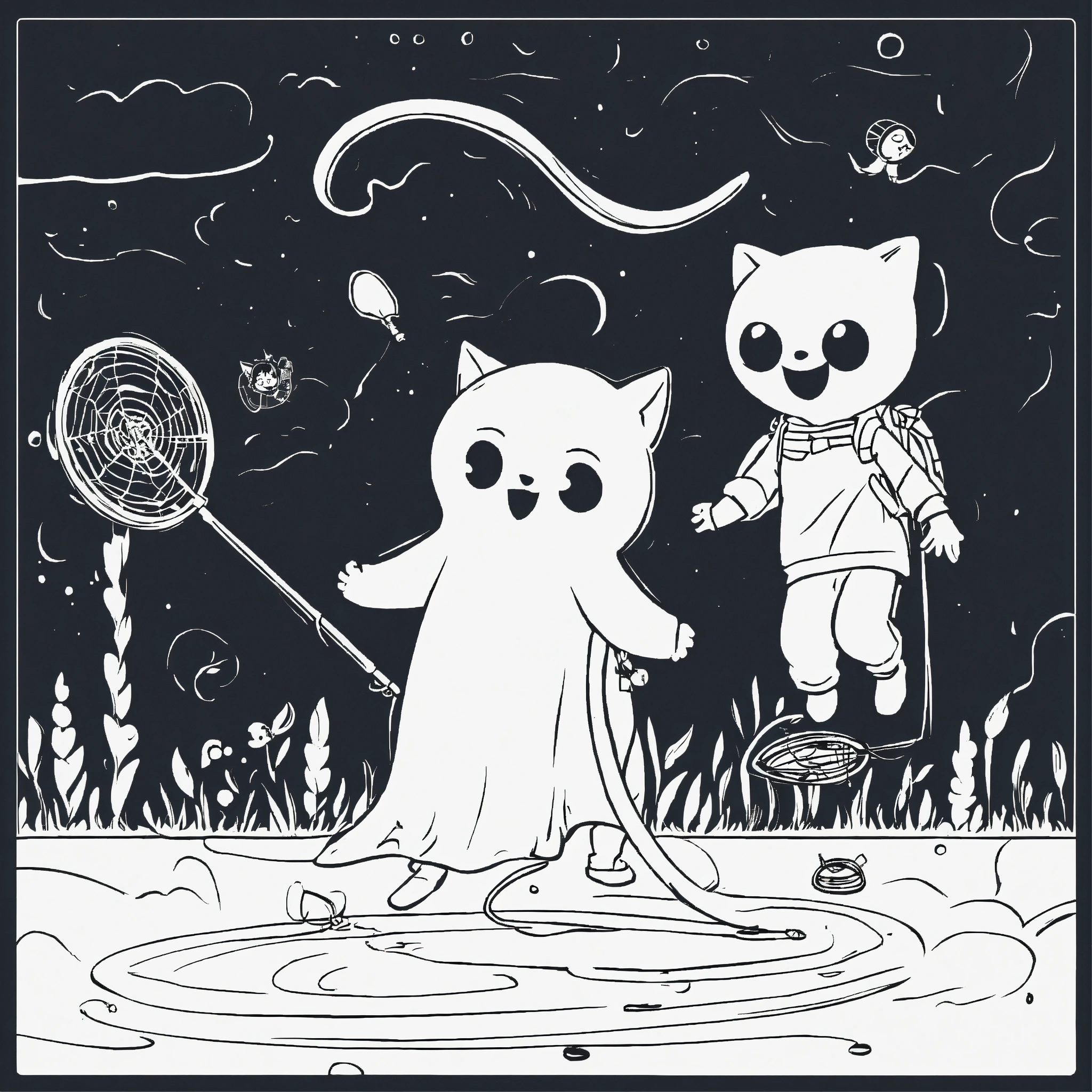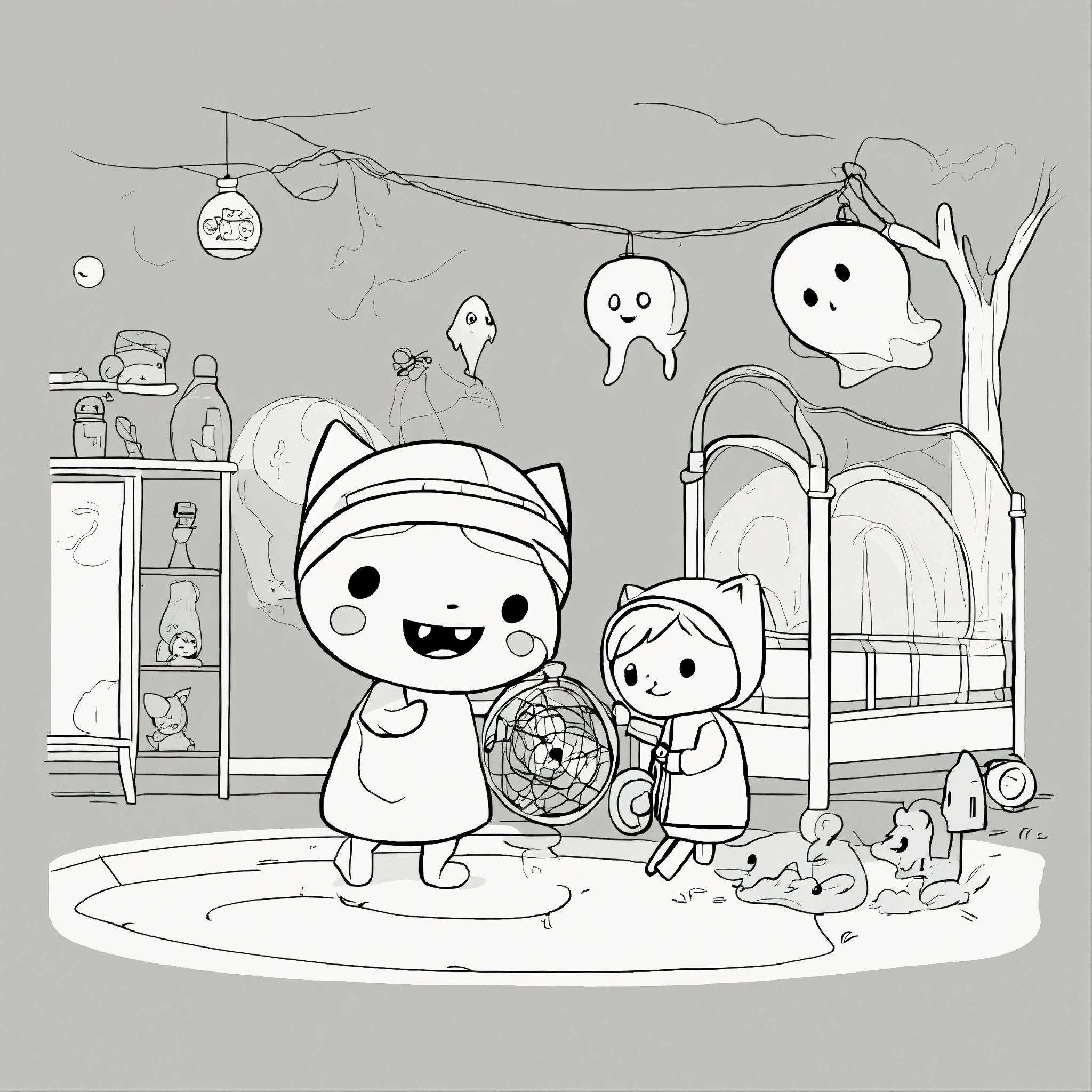 Cute catched ghosts children playing with a ghost catcher. for a toddler's, pixar style, simple outline and shapes, black and white coloring book, flat vector, white background, clean line art, studio ghibli studio