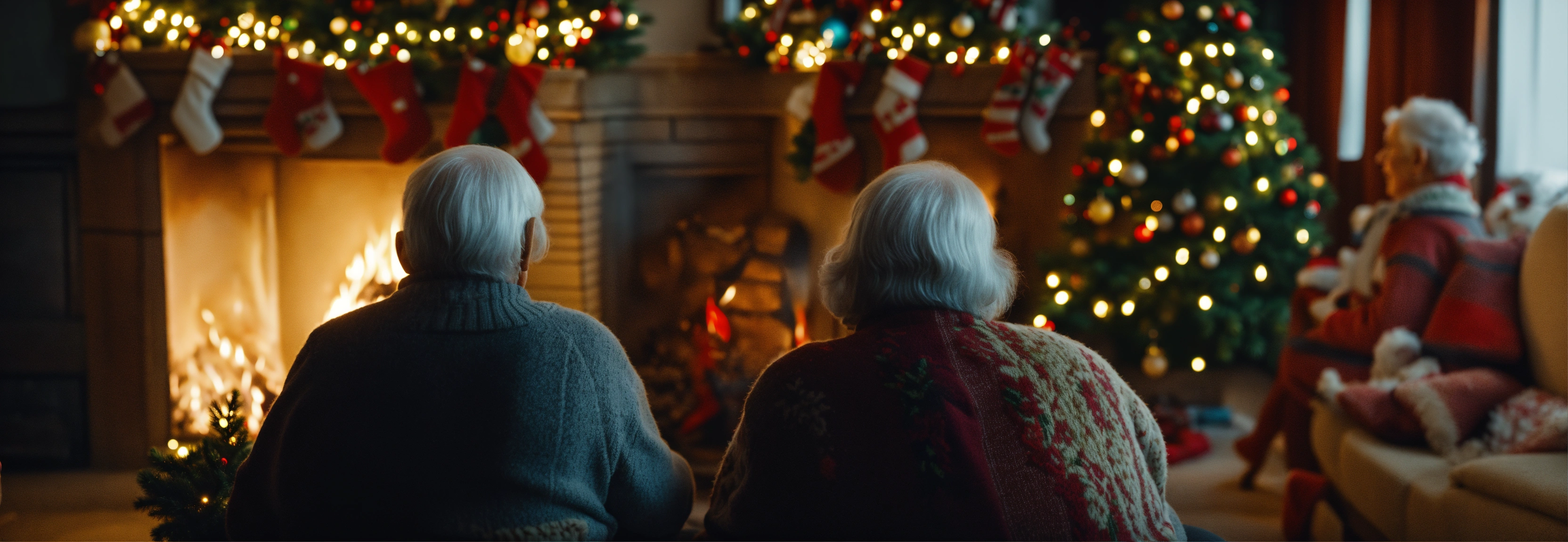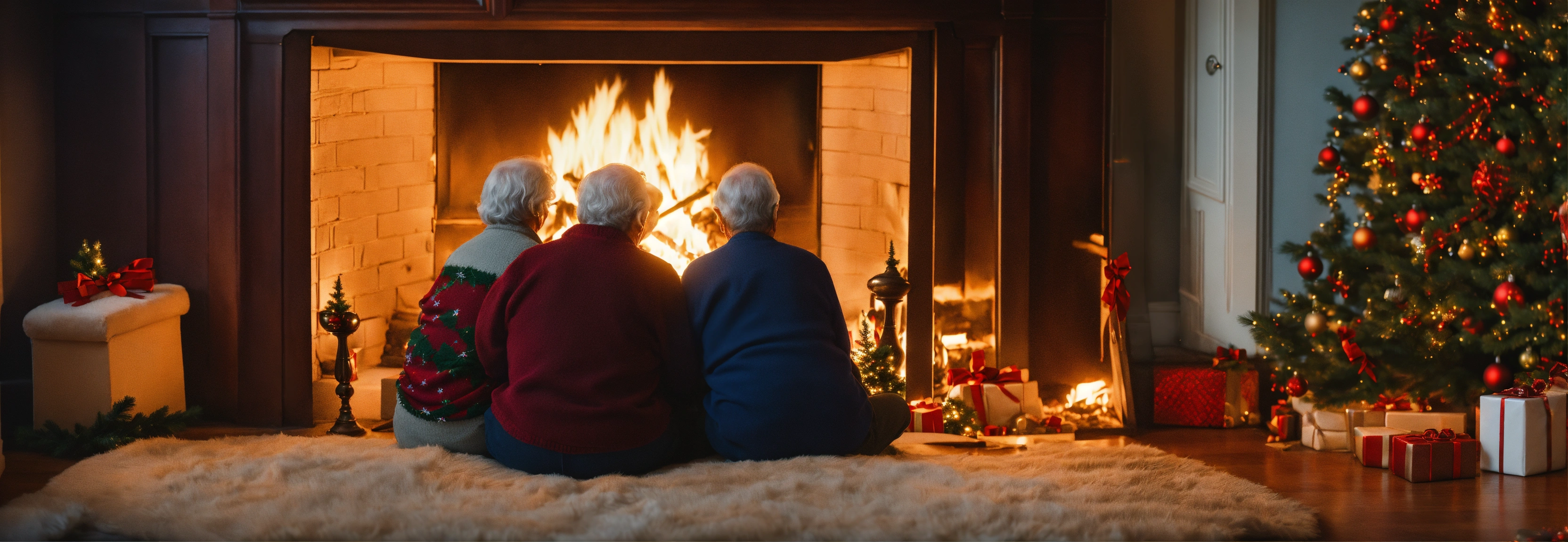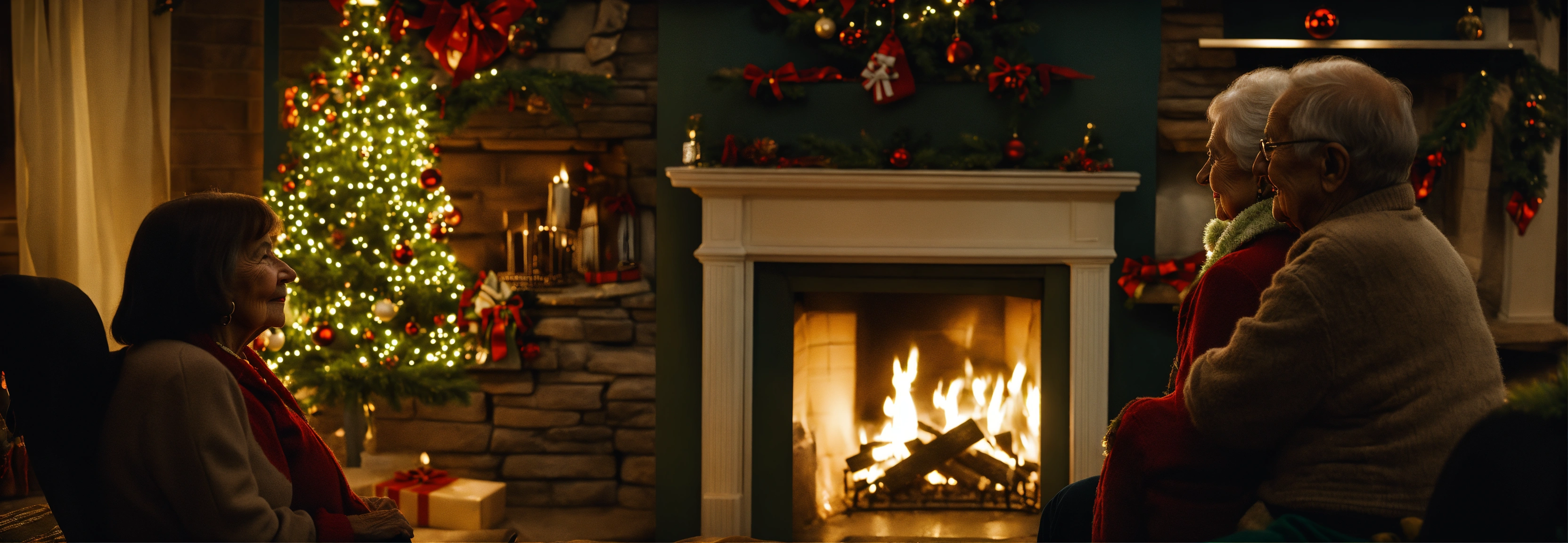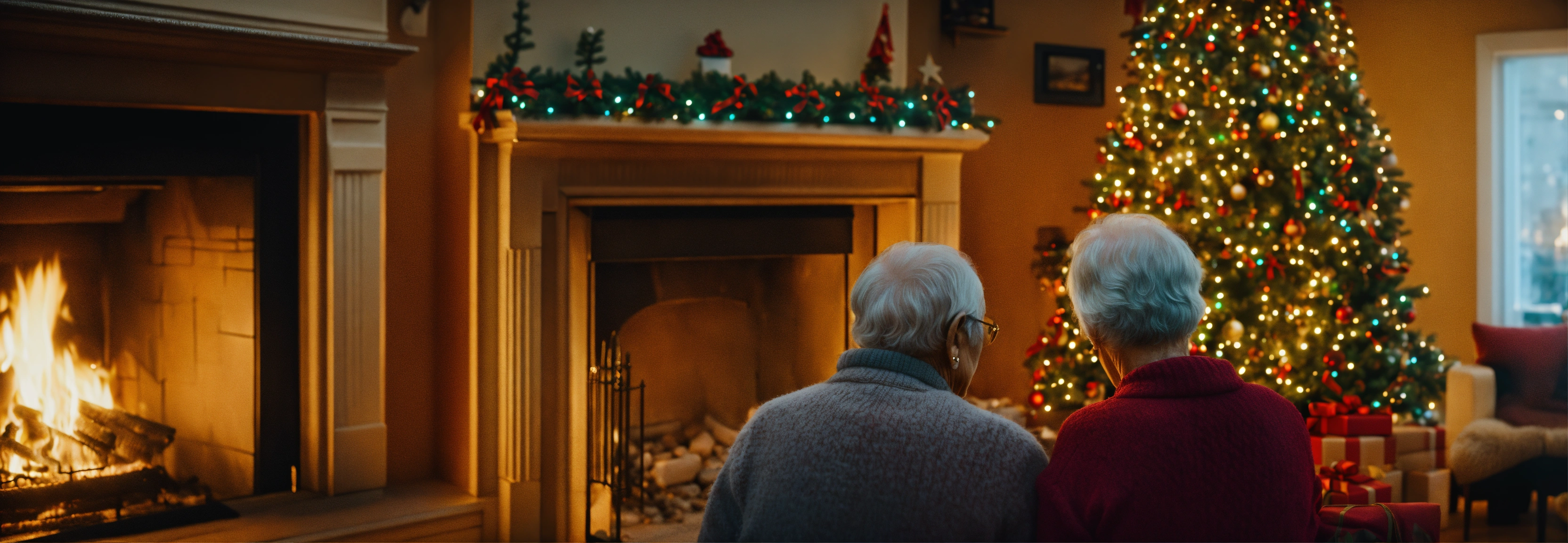 Back view of a two elderly people couple in front of a fireplace in her cozy house with christmas decoration and a christmass tree, high quality photo, cinematic shot, realistic, film grain, volumetric light, imax, photorealistic, hyperdetailed textures, sharp focus, studio photo