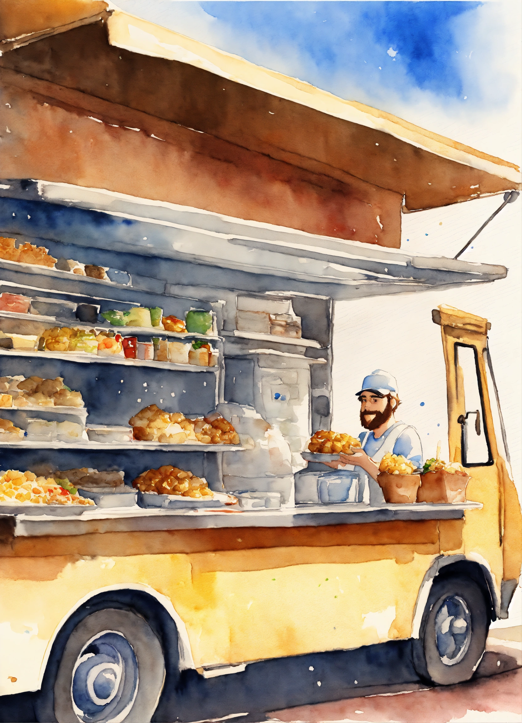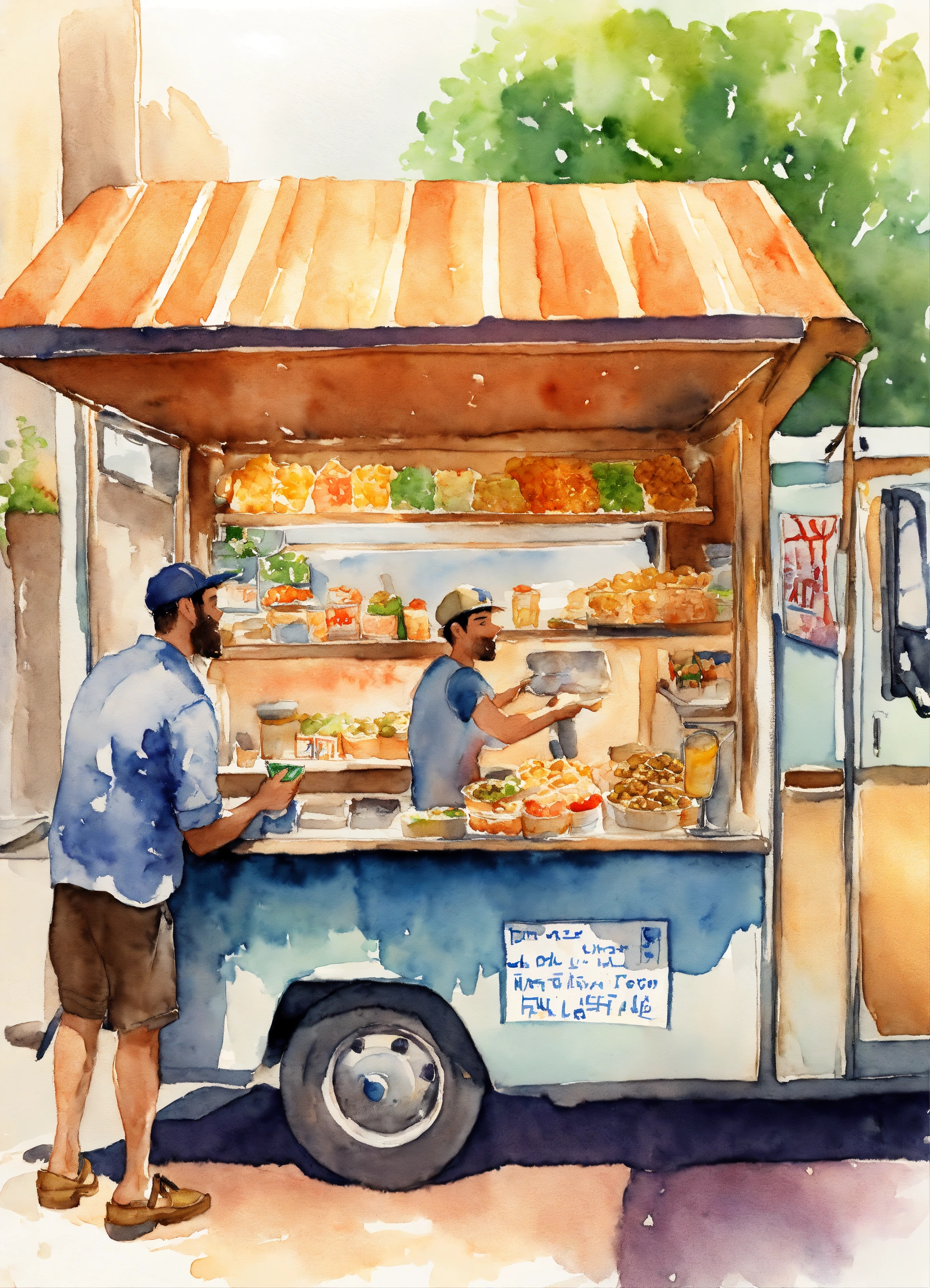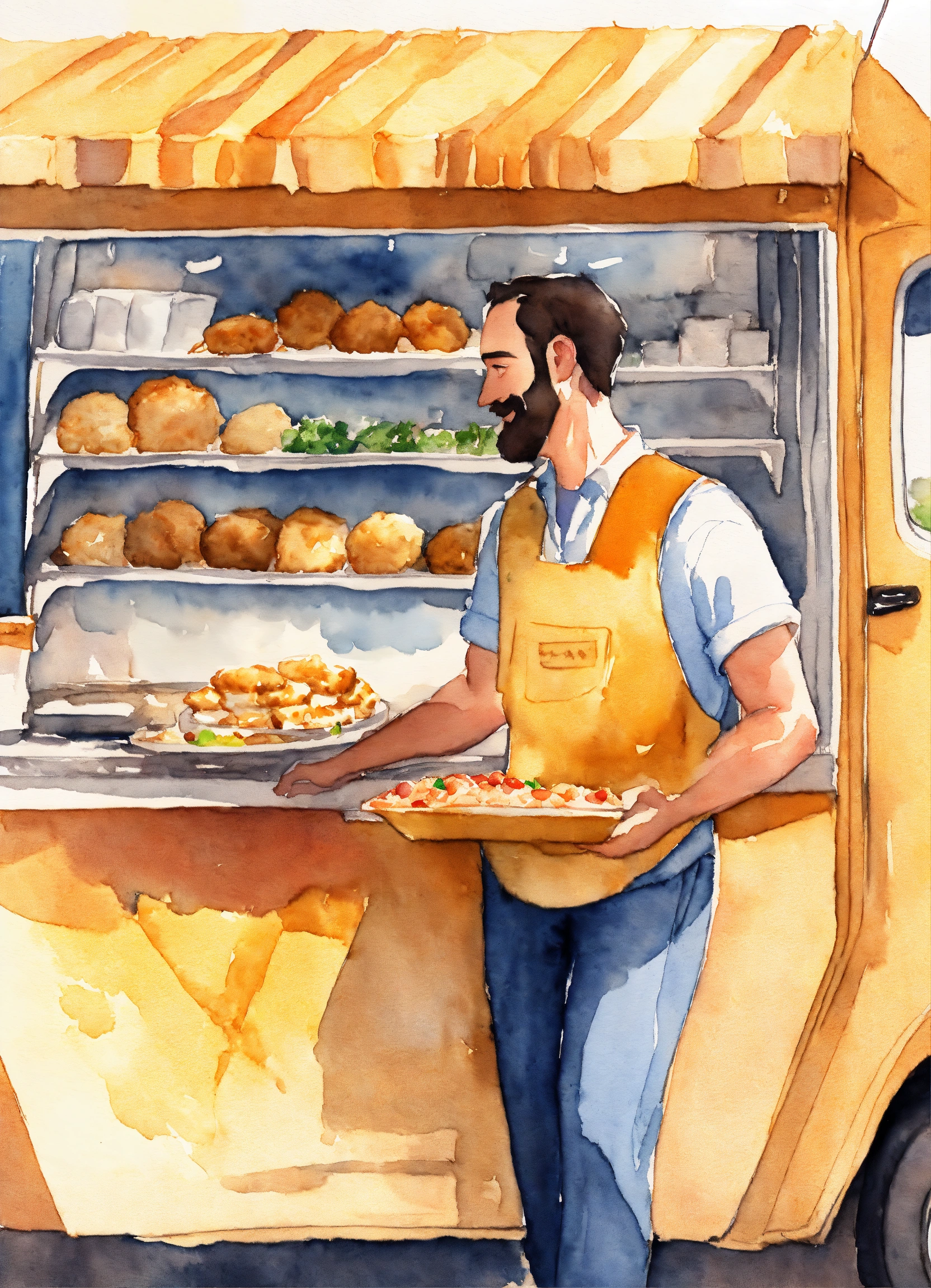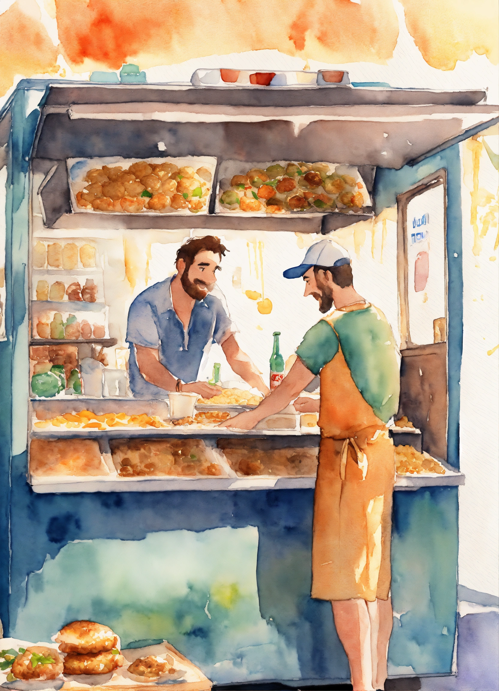 A watercolor pixar painting of an man inside his israeli food truck, serving customers with golden falafels, pixar animation style, watercolor