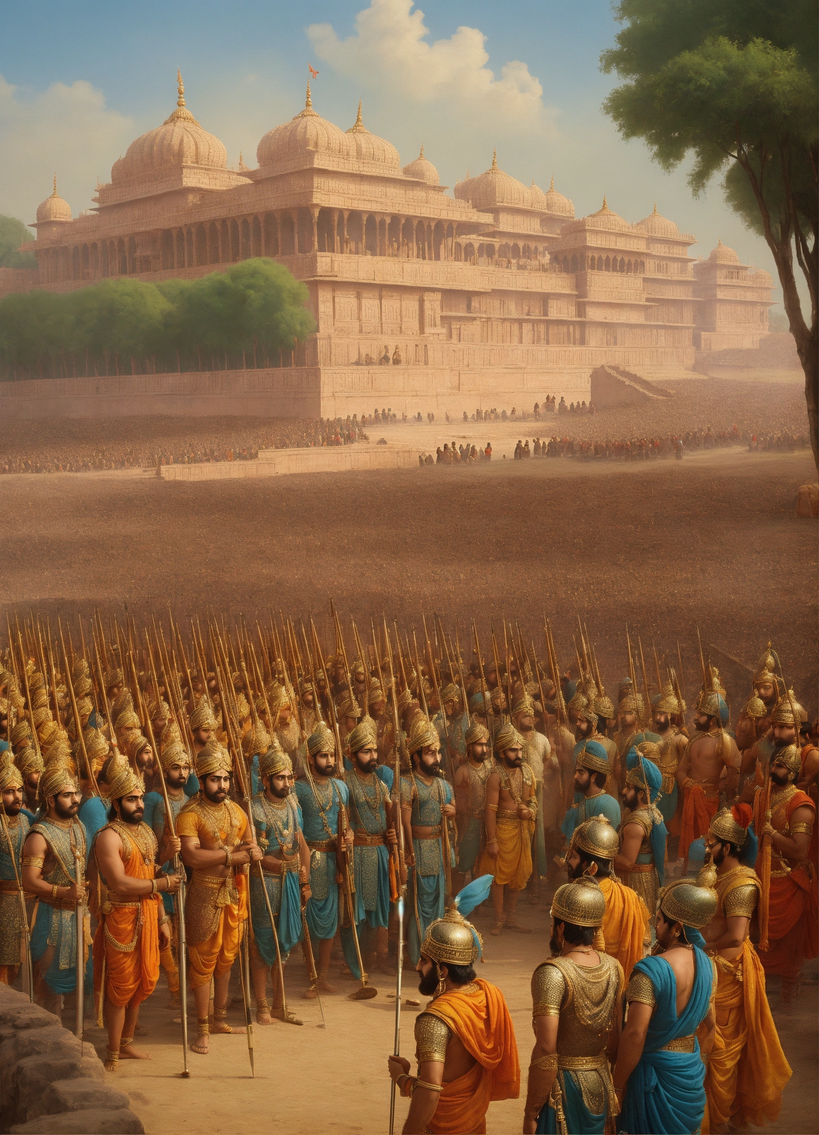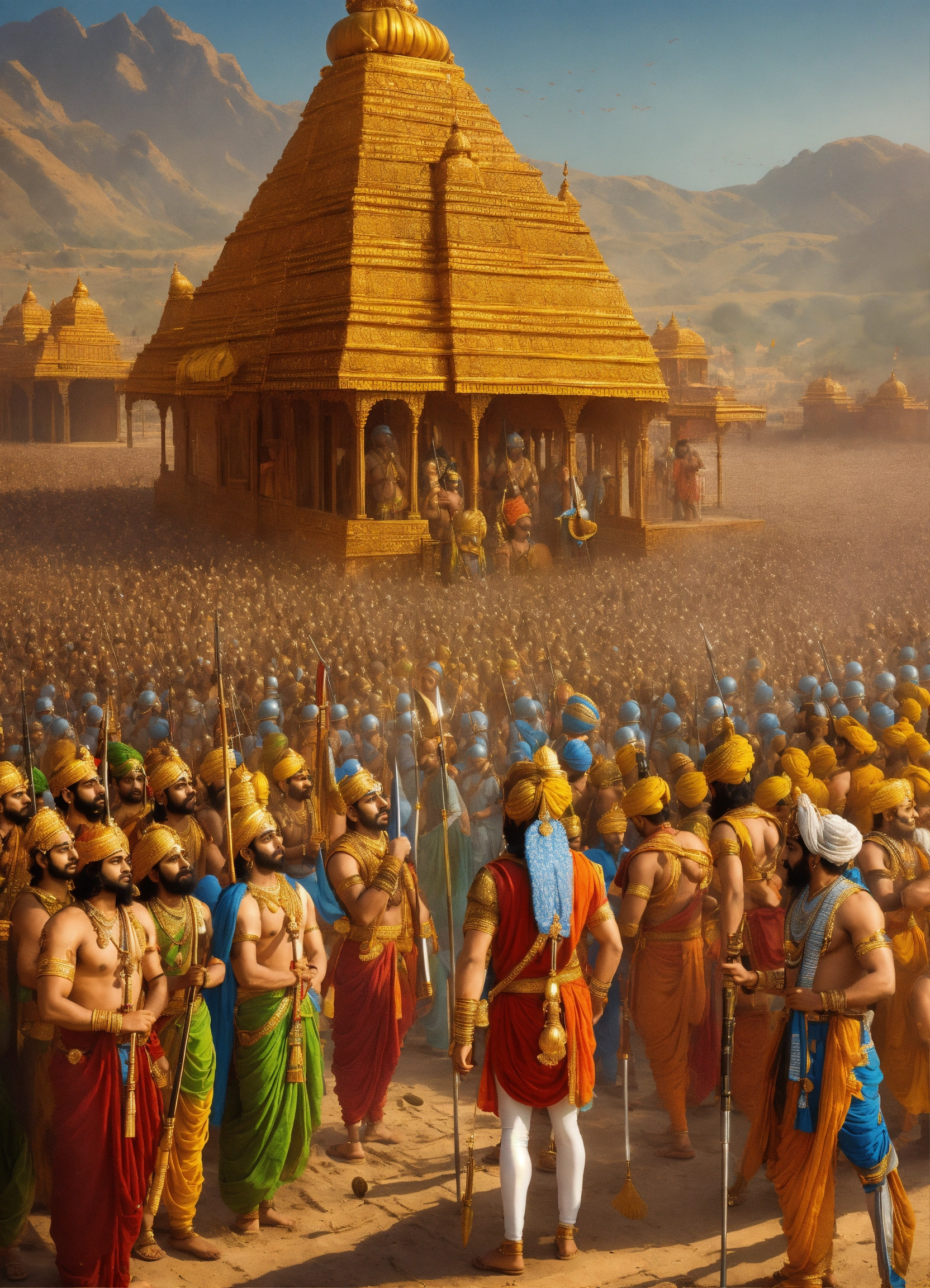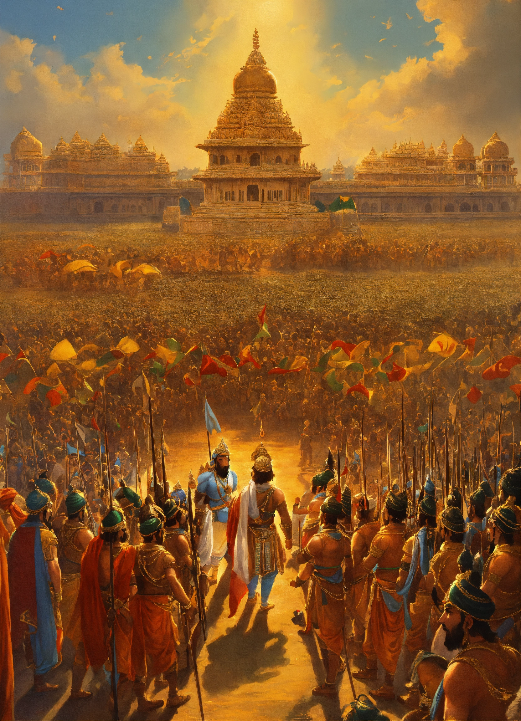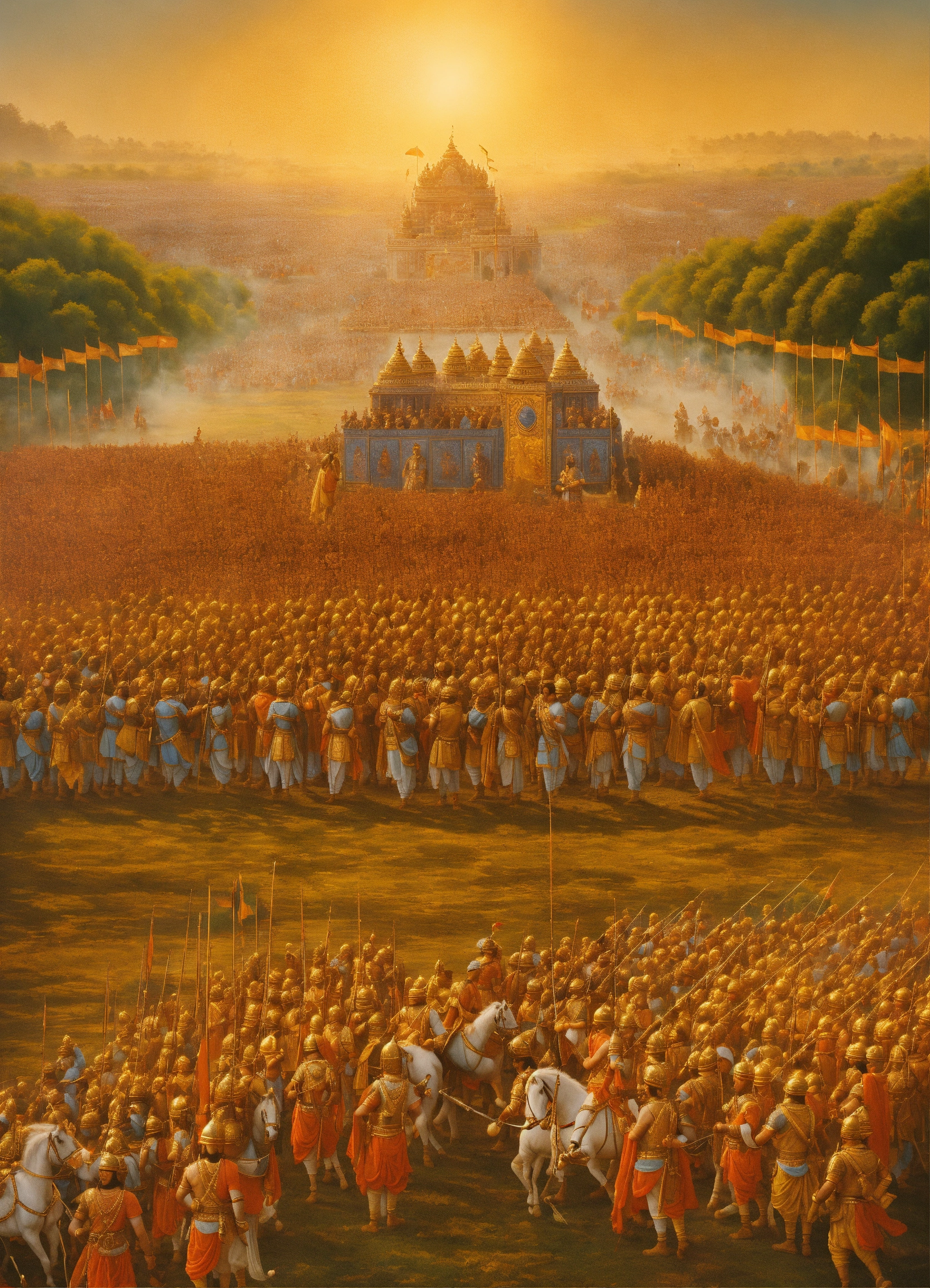 Huge army standing on the field of kurukshetra, lord krishna talking to arjun in front, in background all the army standing with their weapons