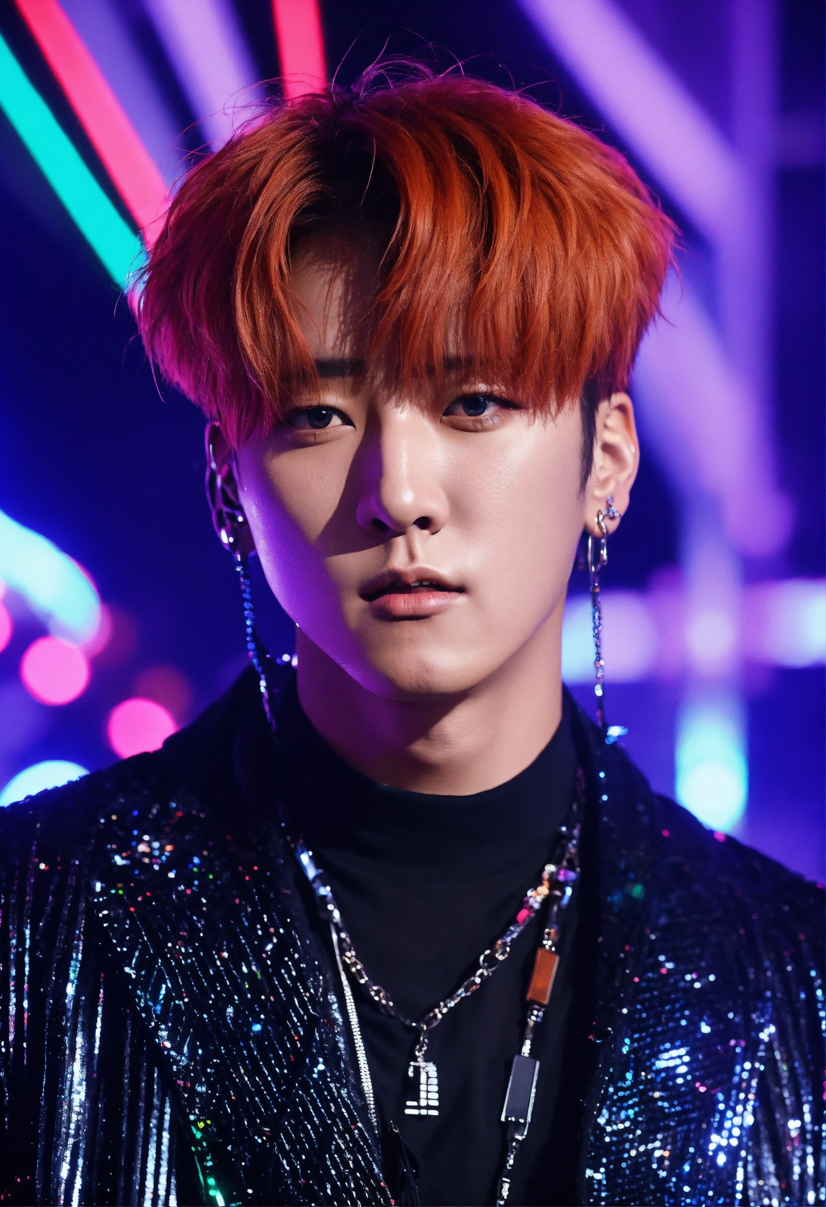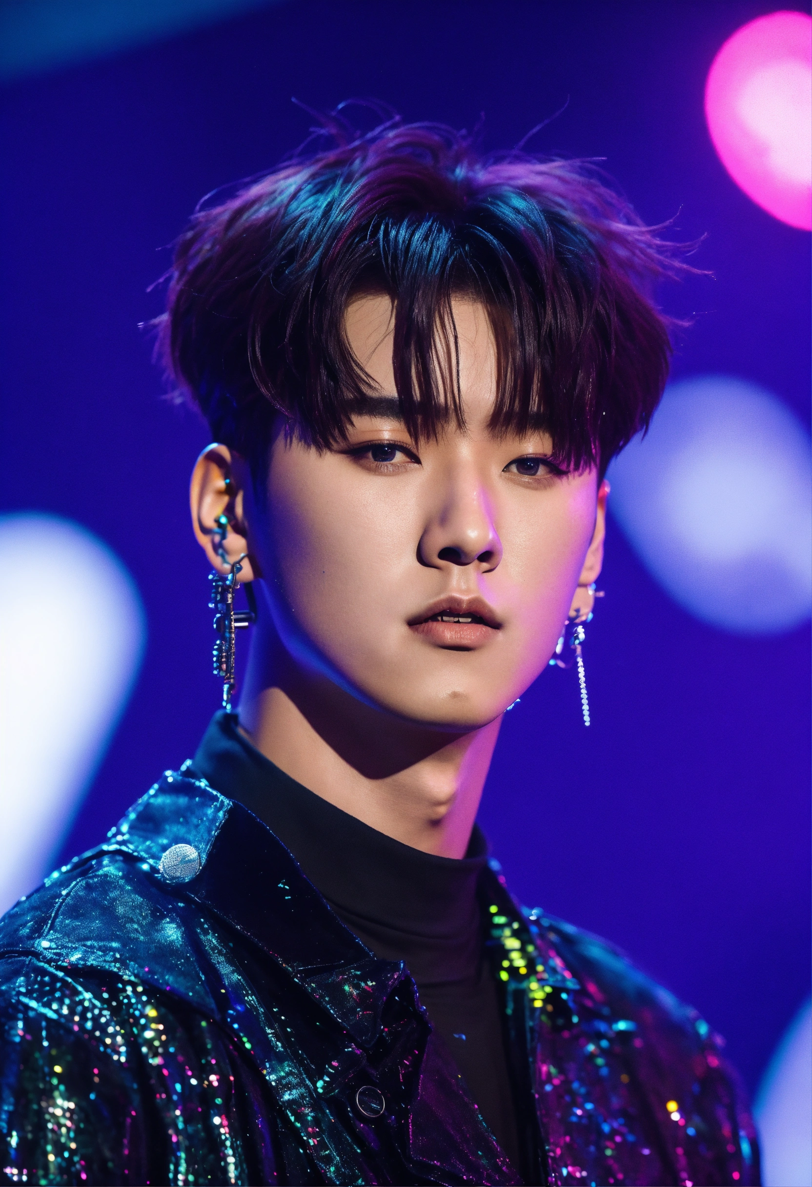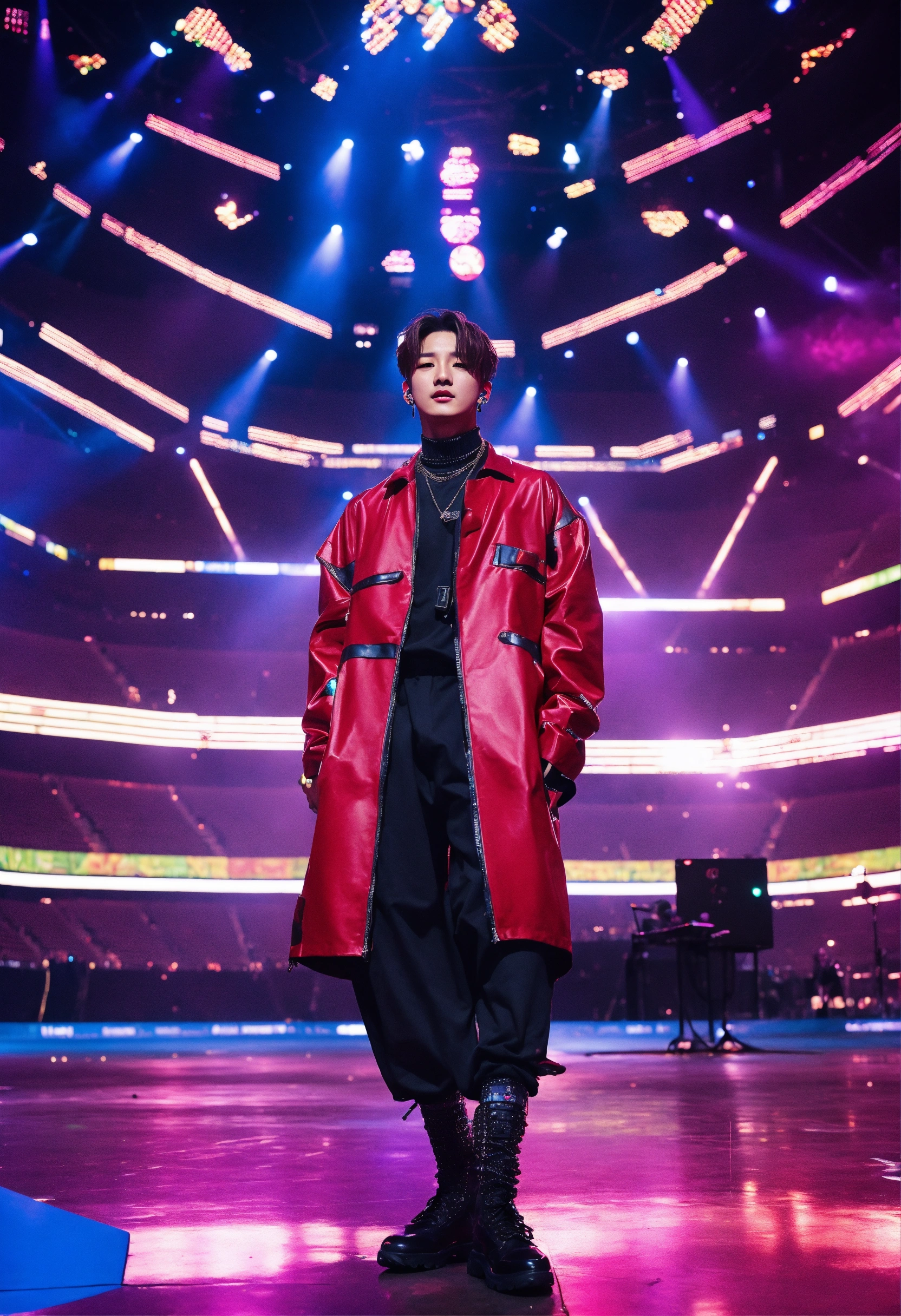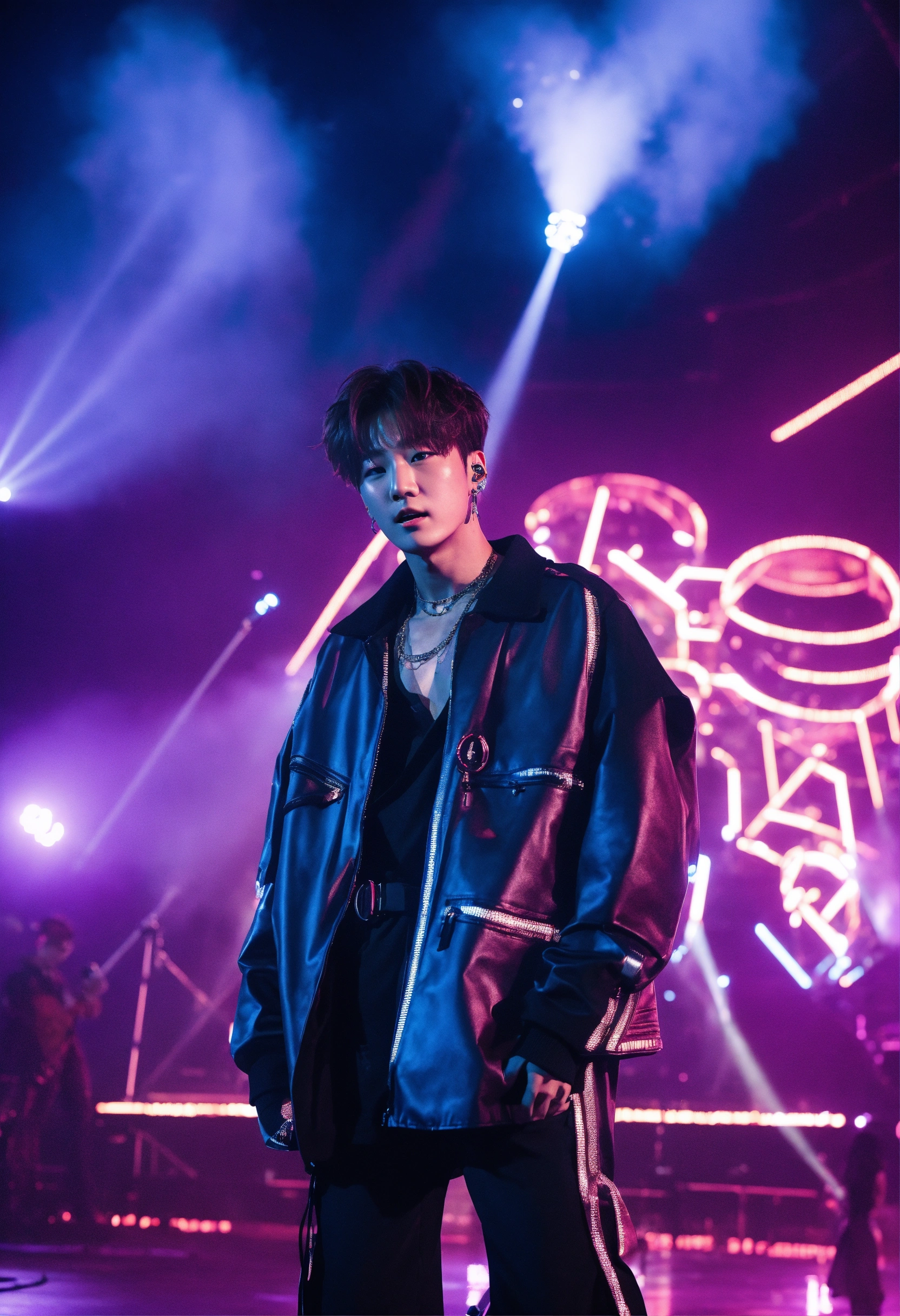 Singer jungkook gives a concert in the style of cyberpunk in futuristic stadium