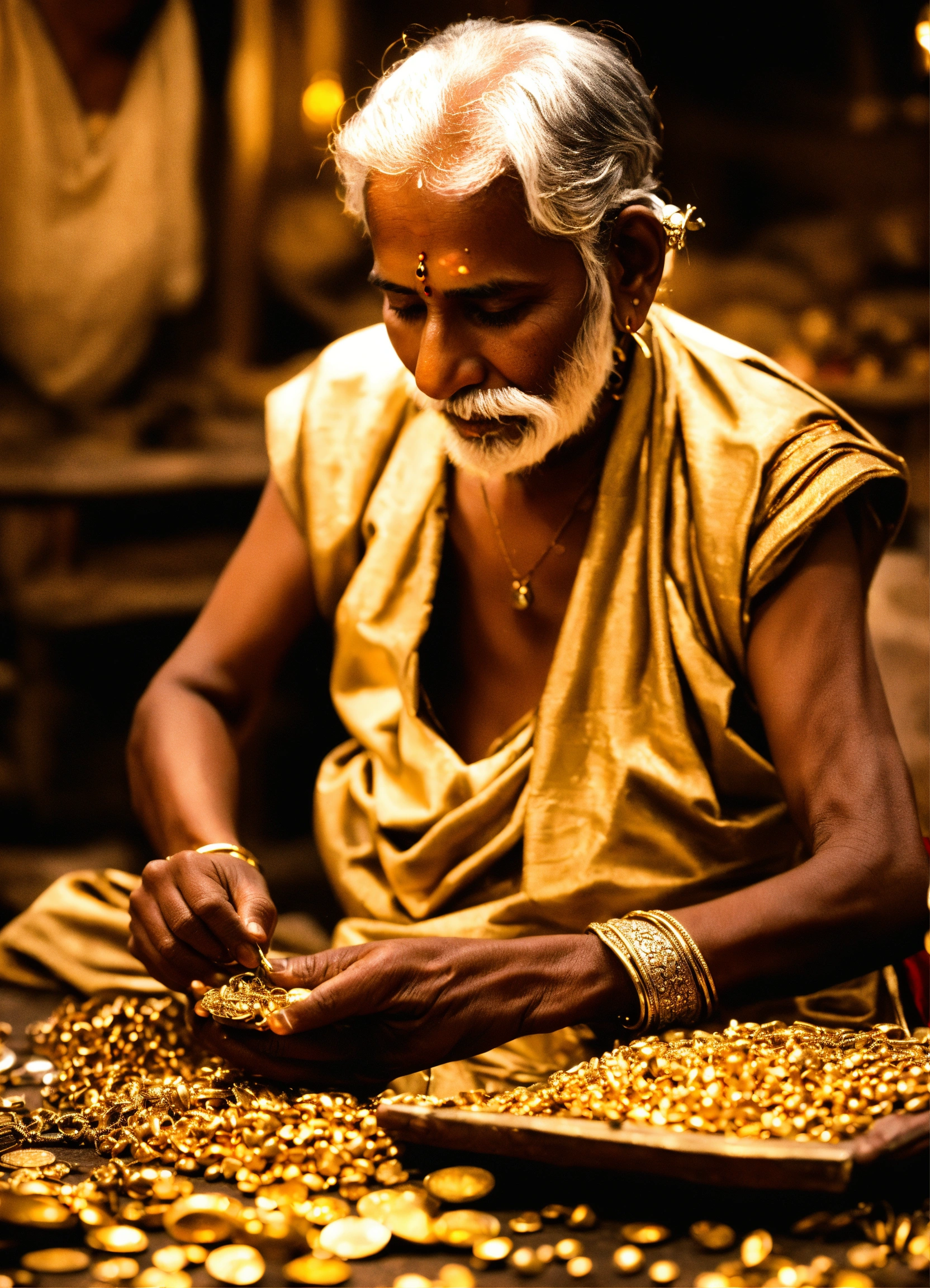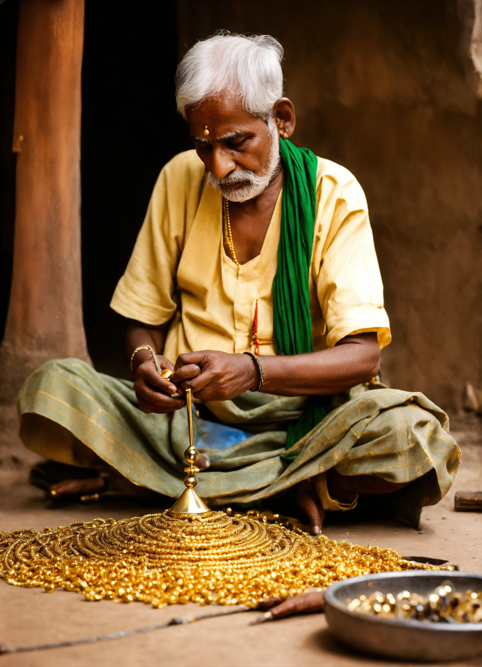 Old goldsmith of india working to make golden jewellery from medieval age
