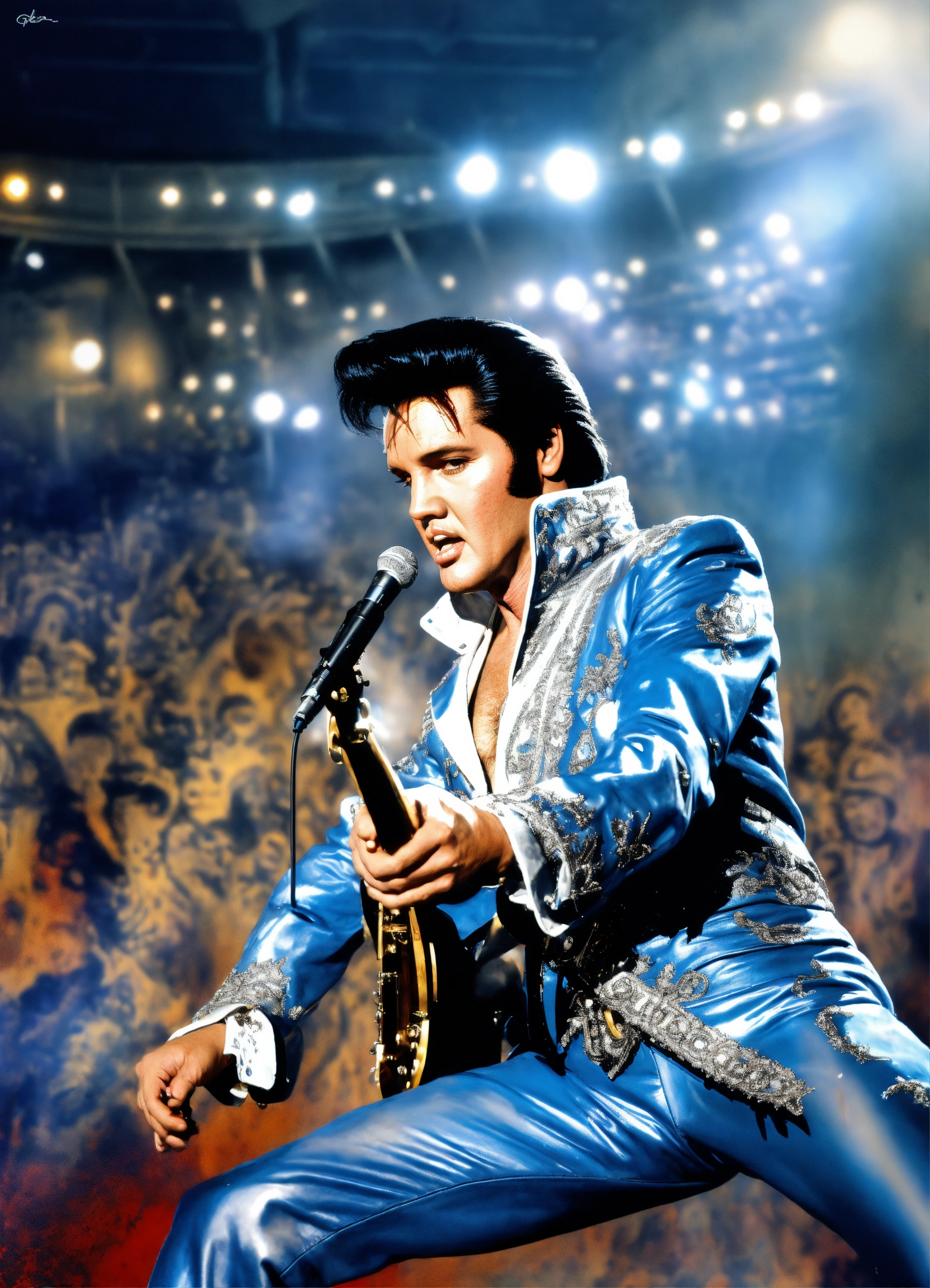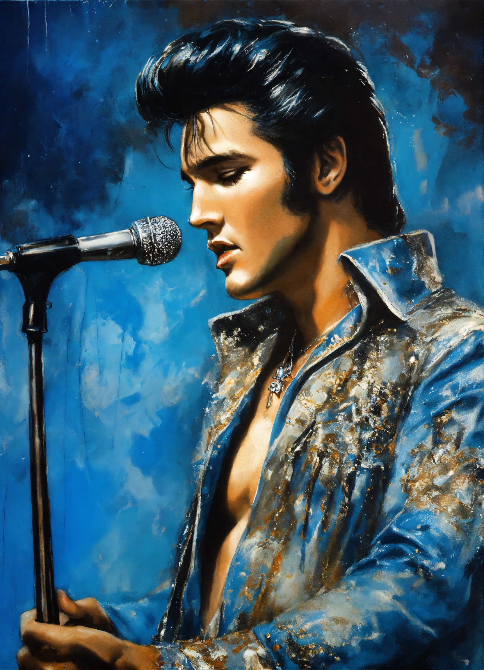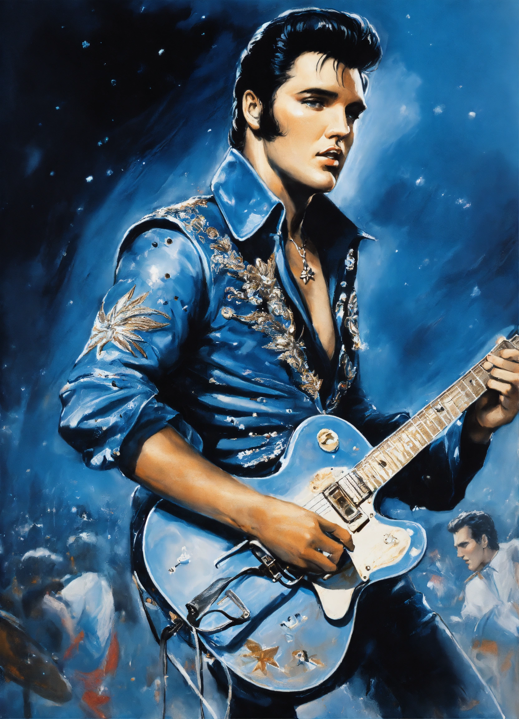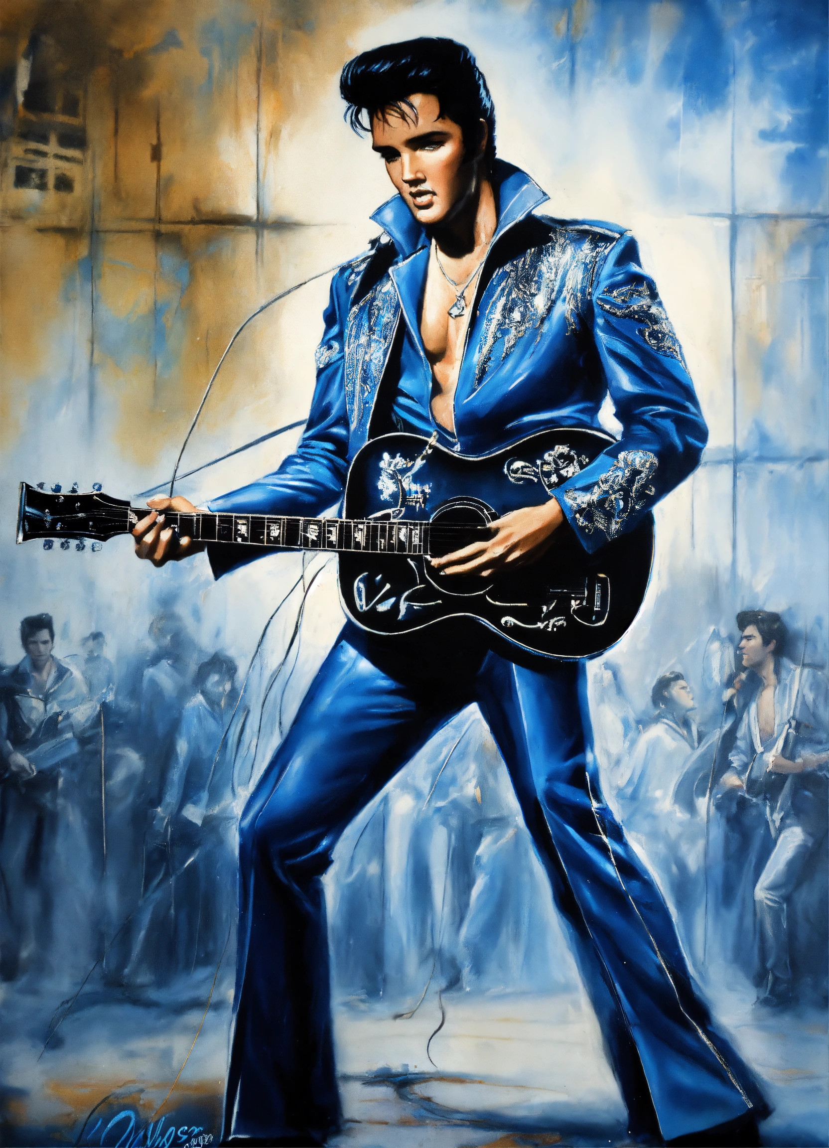 "elvis presley on stage a lot of graffiti in the background blue and silver in the style of luis royo"