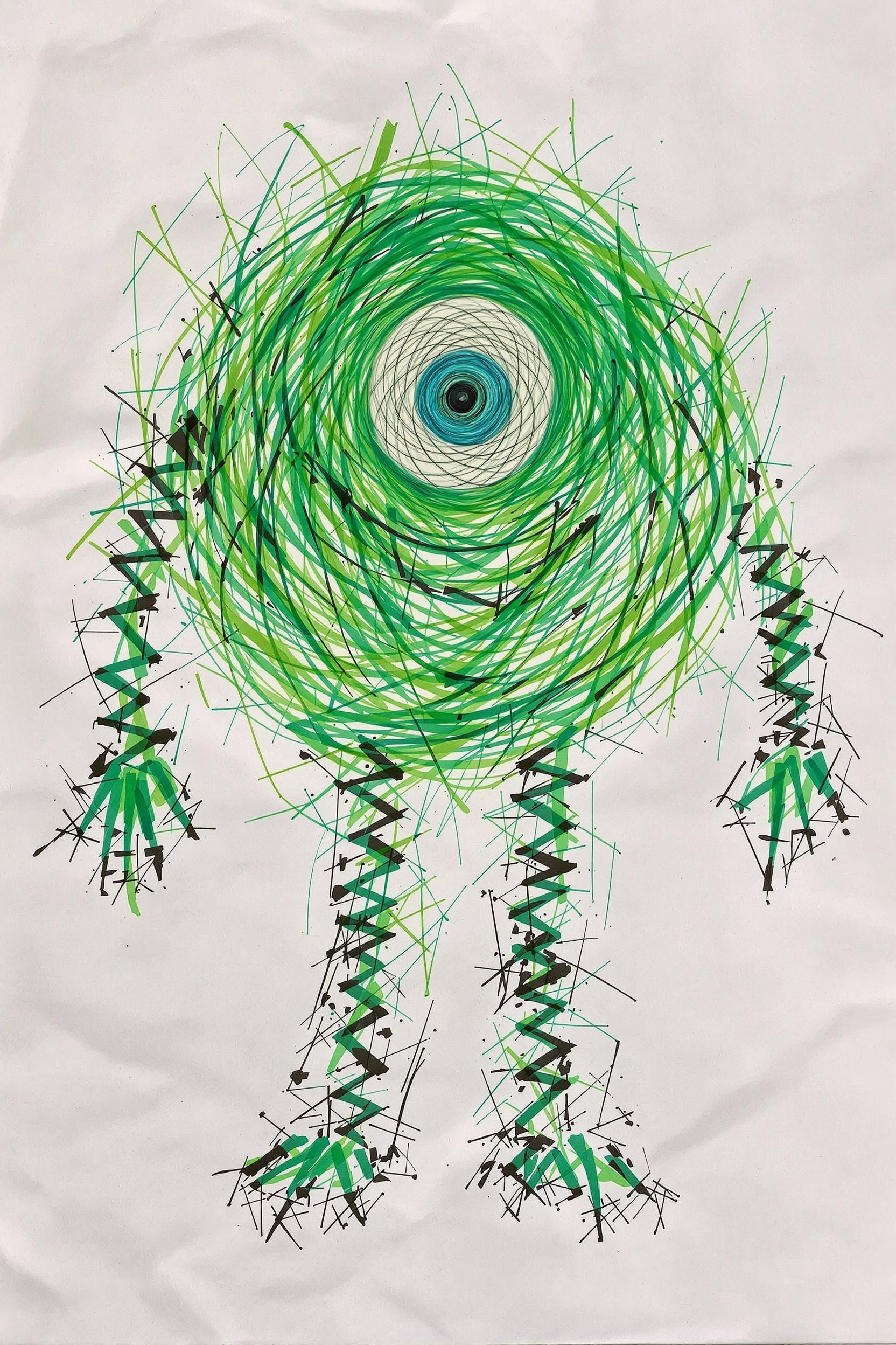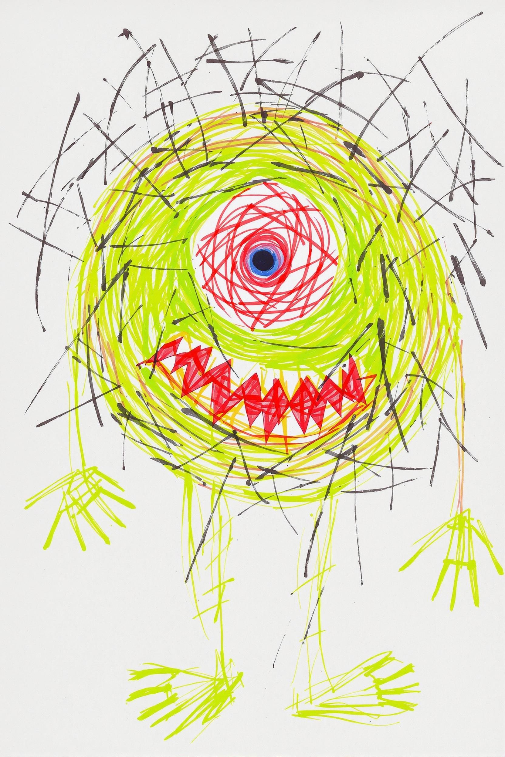 Scary chaotic scribbles of a nightmarish drawing of mike wazowski, done by a 3 year old on white construction paper.