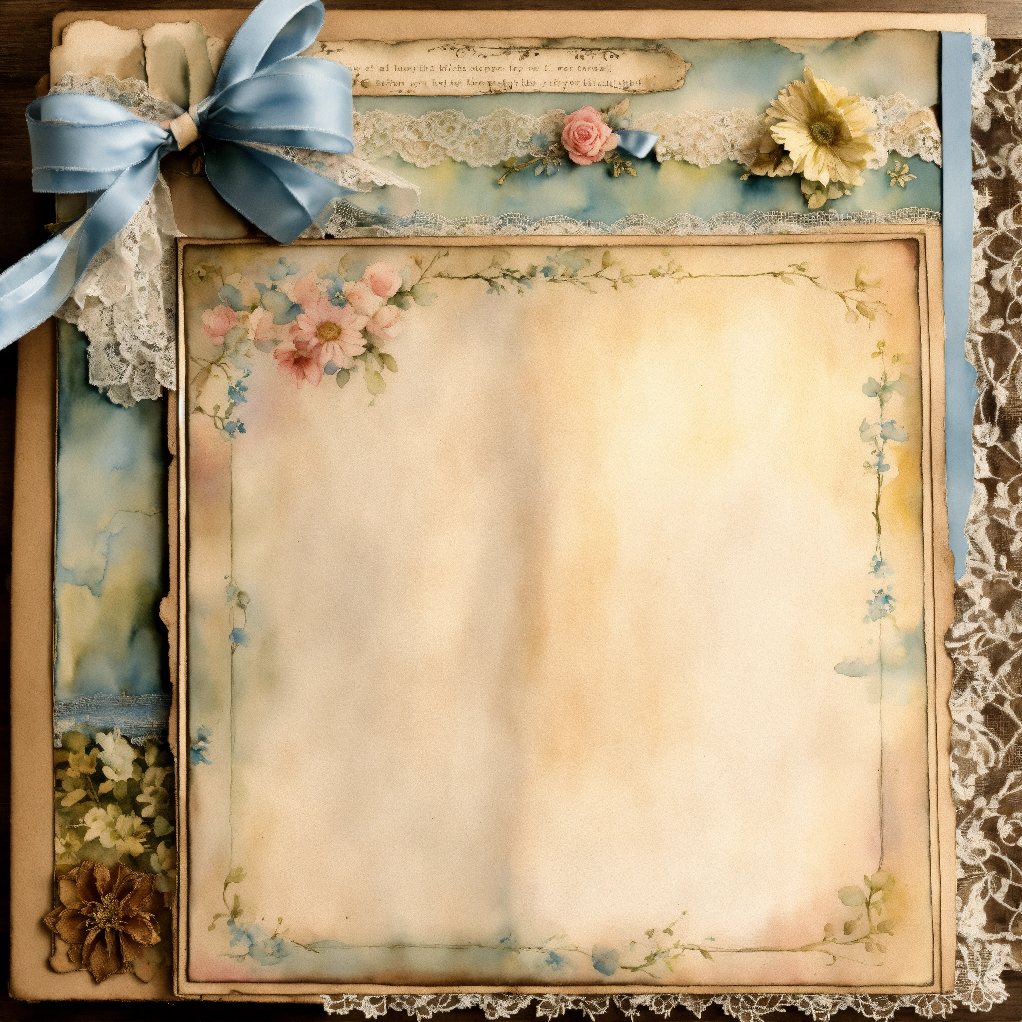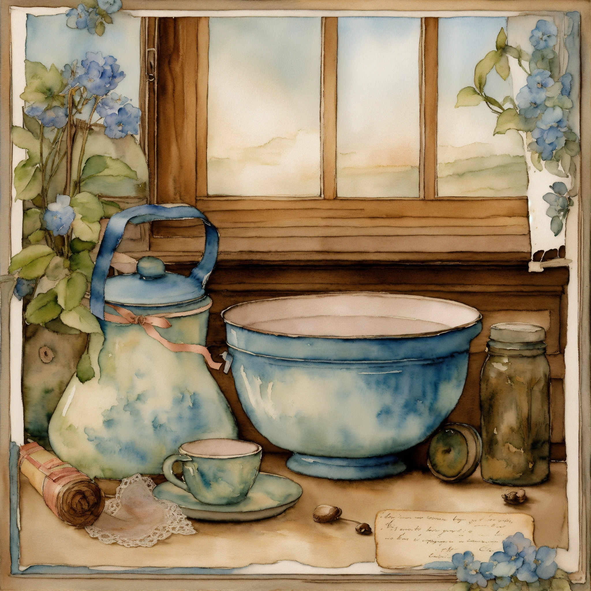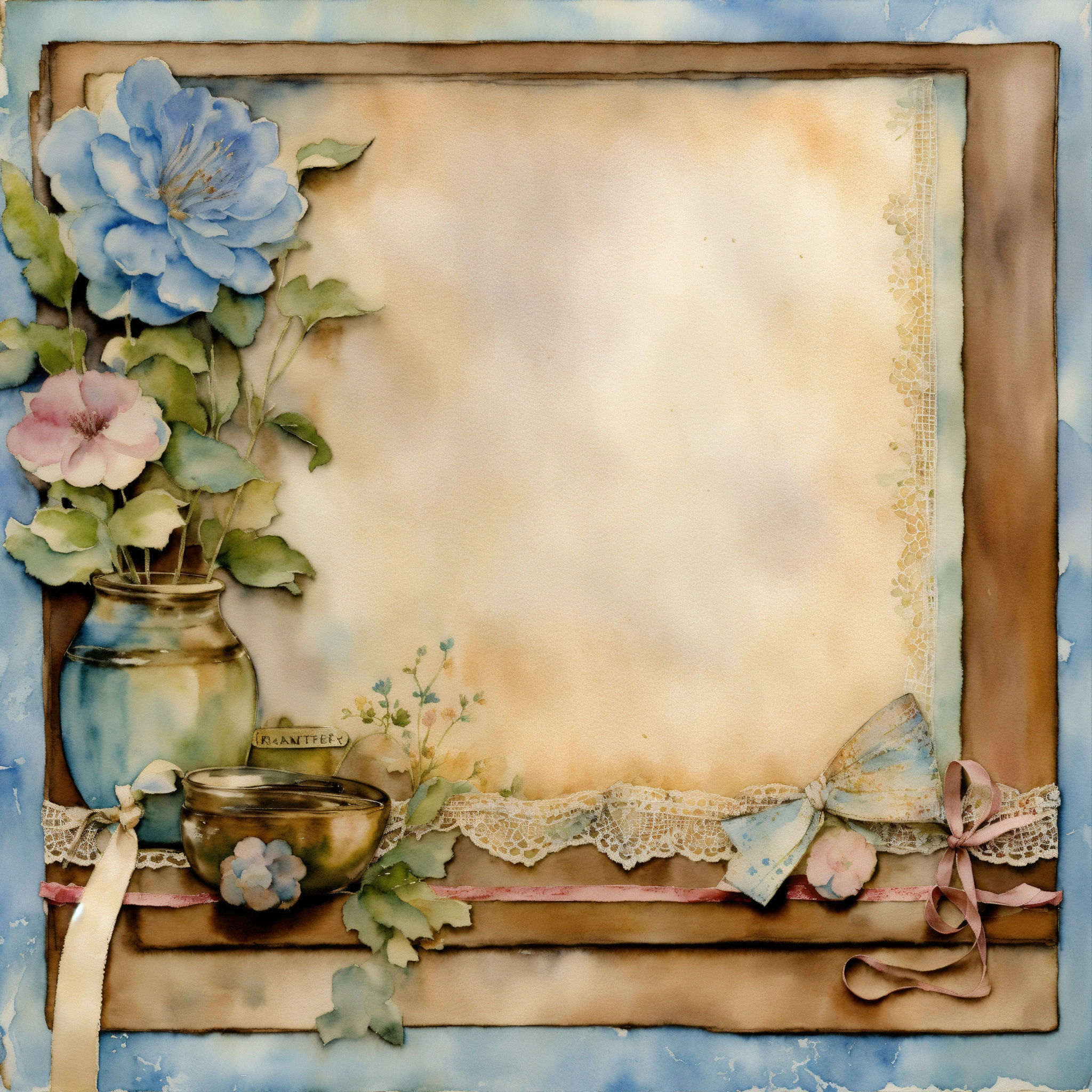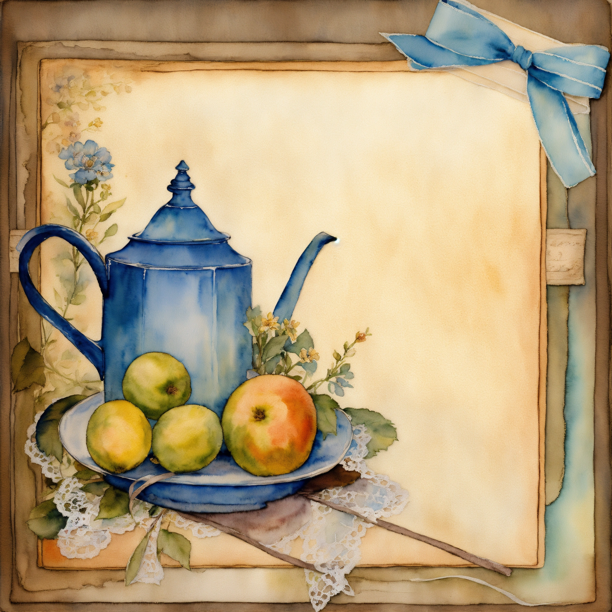 A scrapbook page, theme grandmas kitchen, watercolour painting with muted tones, a place for notes, sticky tape at the corner, lace edge, ribbon and staple, faded and aged, pastel blue tones, by cicely mary barker
