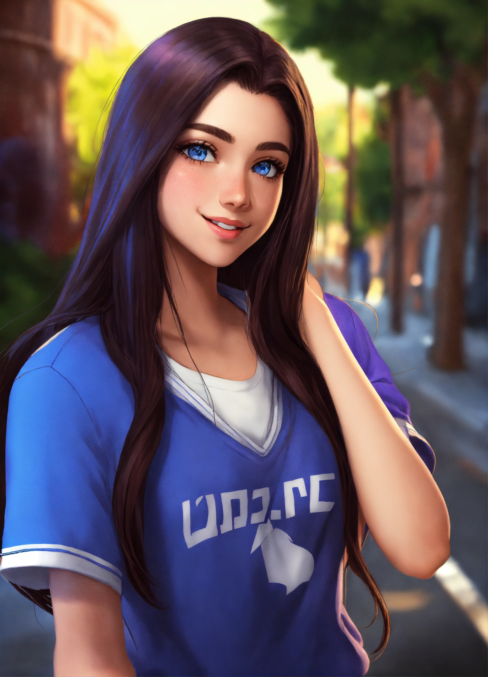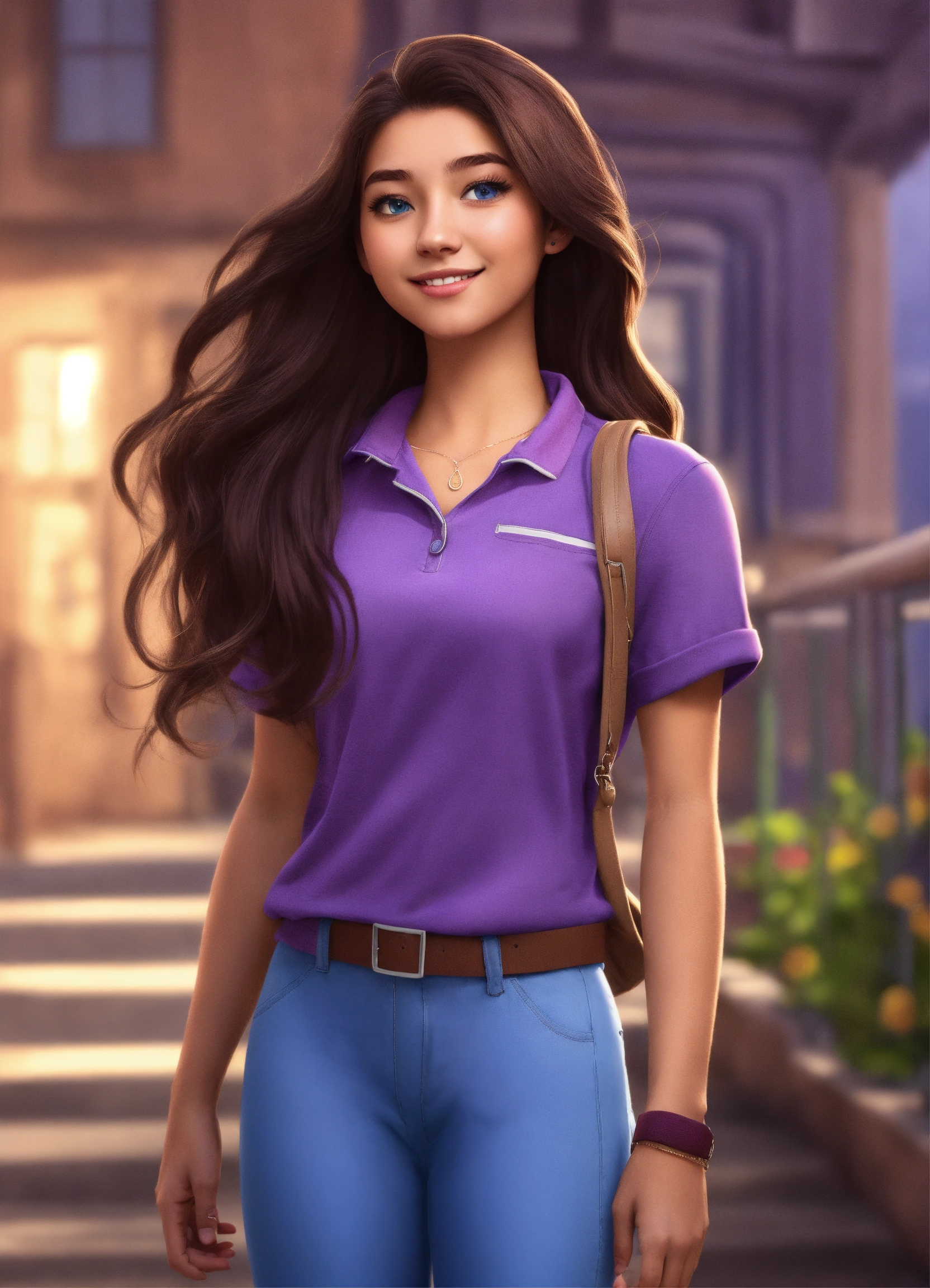 18-year-old female, light complexion, long dark brown hair, blue eyes, purple shirt, blue pants, white sneakers, animated, realistic, cartoon, happy